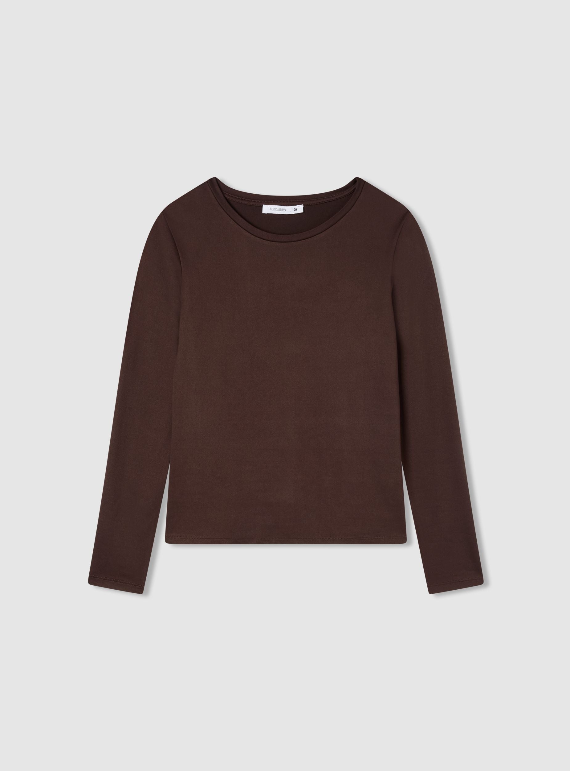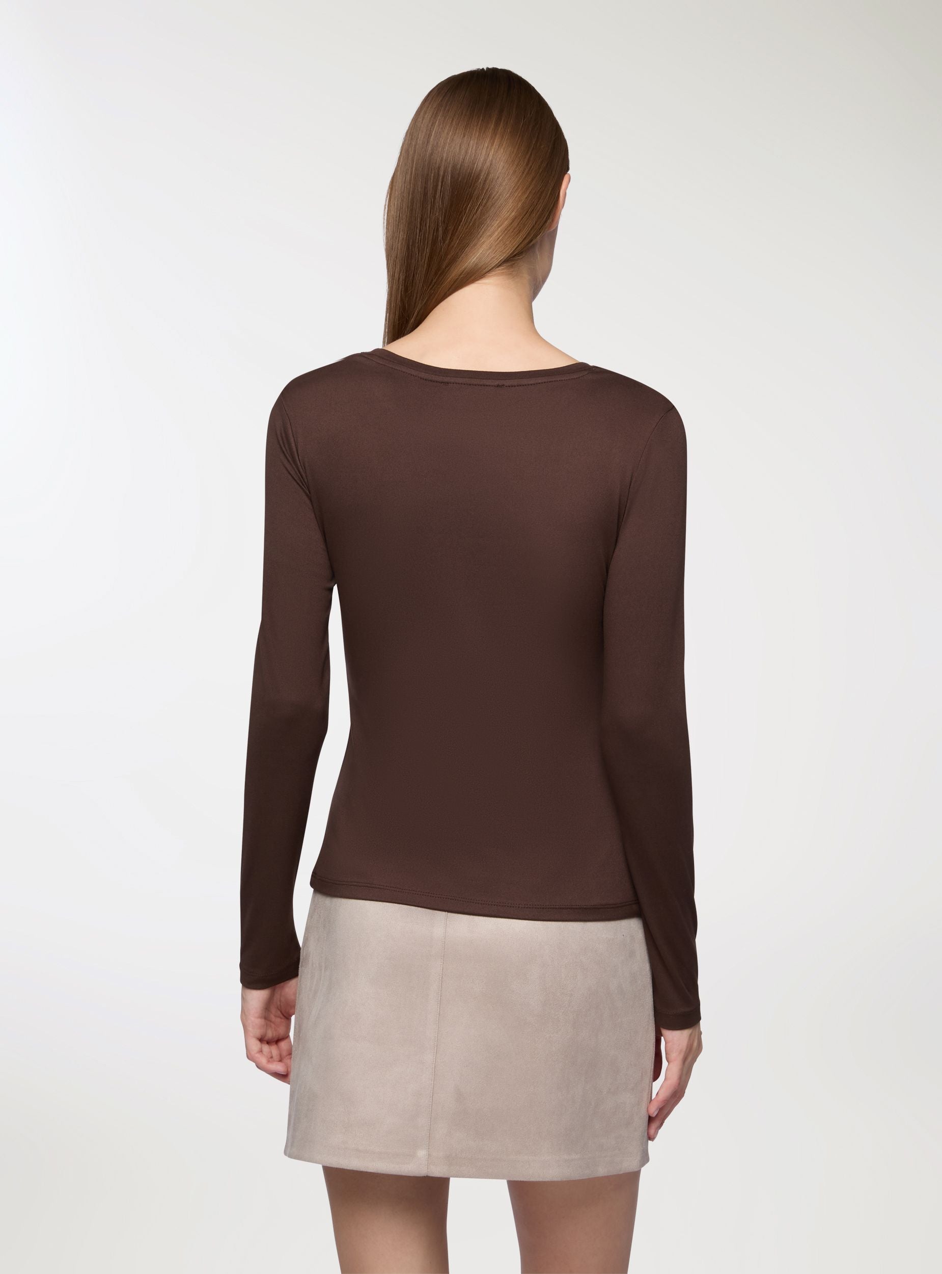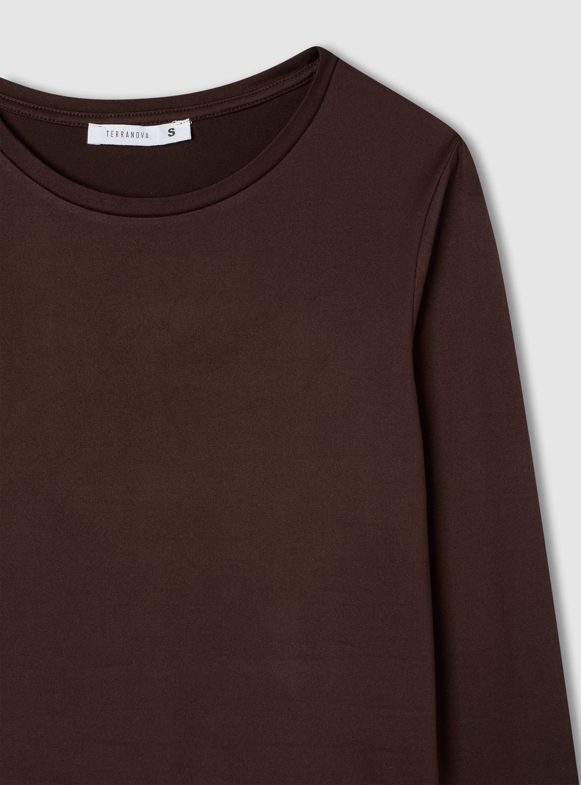 Женска основна блуза с дълги ръкави от еластична материя. Перфектна за всеки сезон, тази блуза е задължителен елемент в гардероба. Характеризира се с минималистичен дизайн и едноцветен цвят, с дълги ръкави и удобен кръгъл деколте. Еластичната материя осигурява плътно и комфортно прилягане, следвайки естествено линиите на тялото. Идеална за носене самостоятелно в ежедневни визии или като слой под якета, блейзери или кардигани през по-студените месеци, лесно се адаптира към всяка ситуация, от офиса до свободното време. Многофункционален елемент, който съчетава простота и практичност за винаги поддържан стил.Детайли