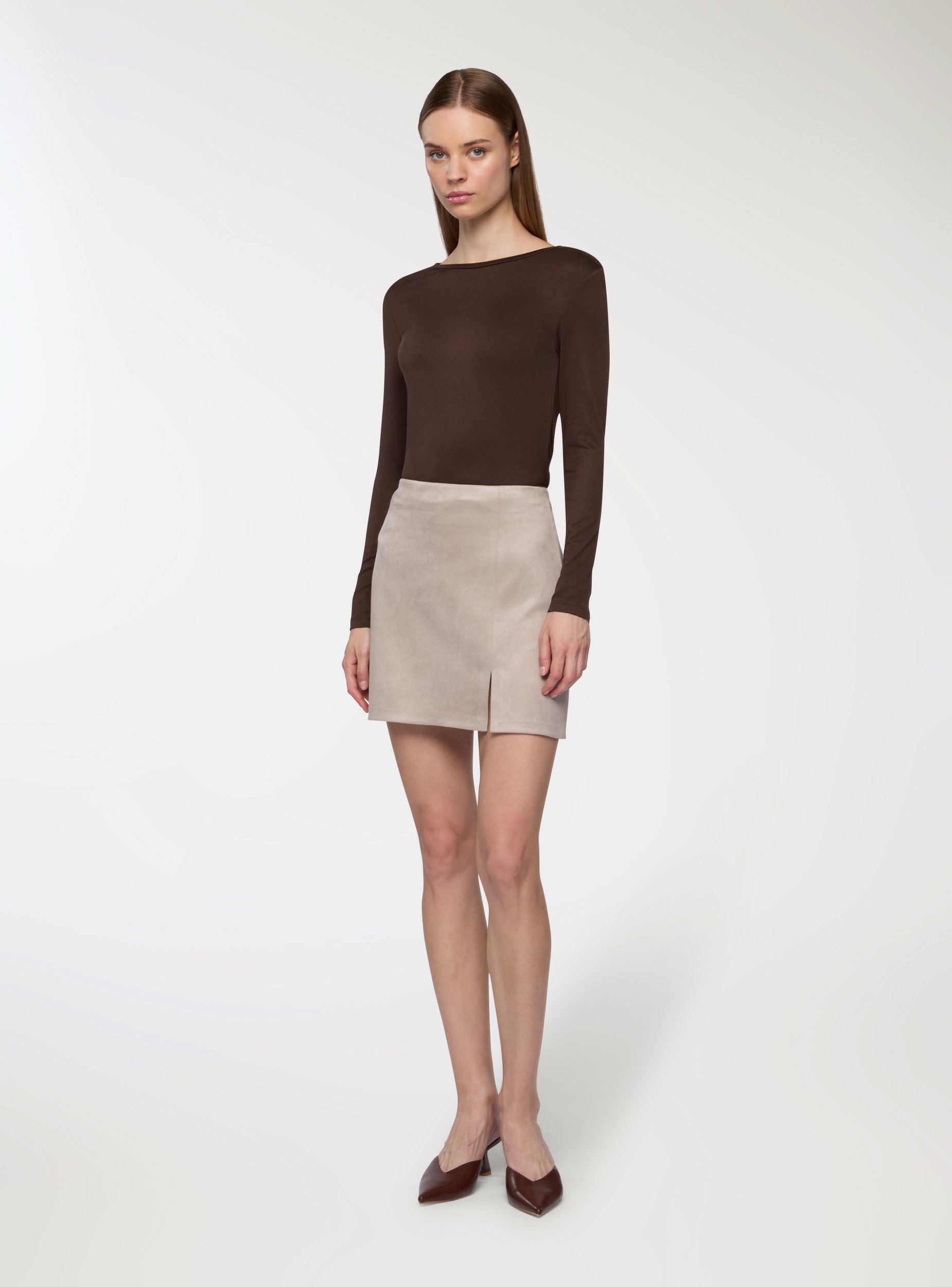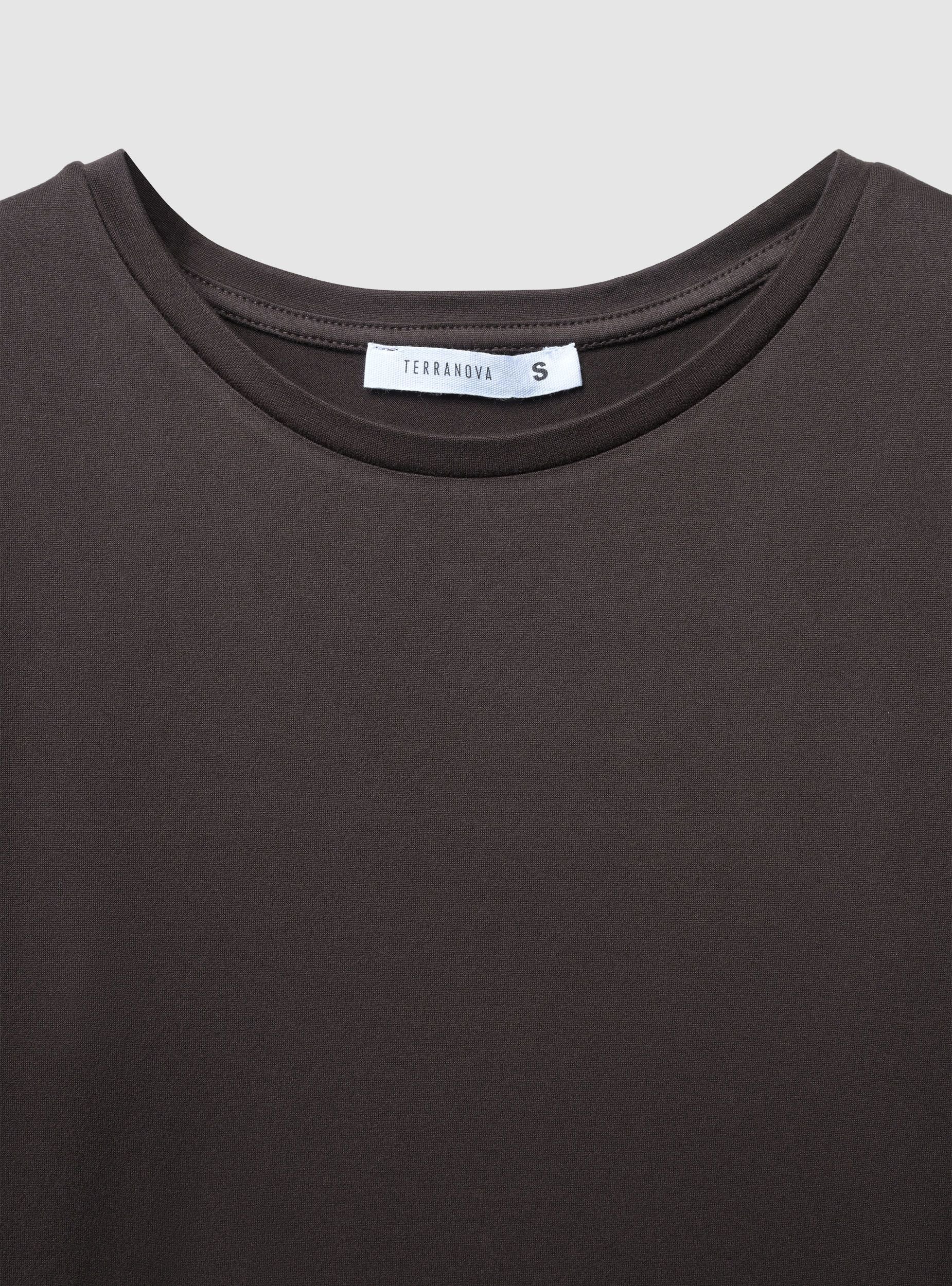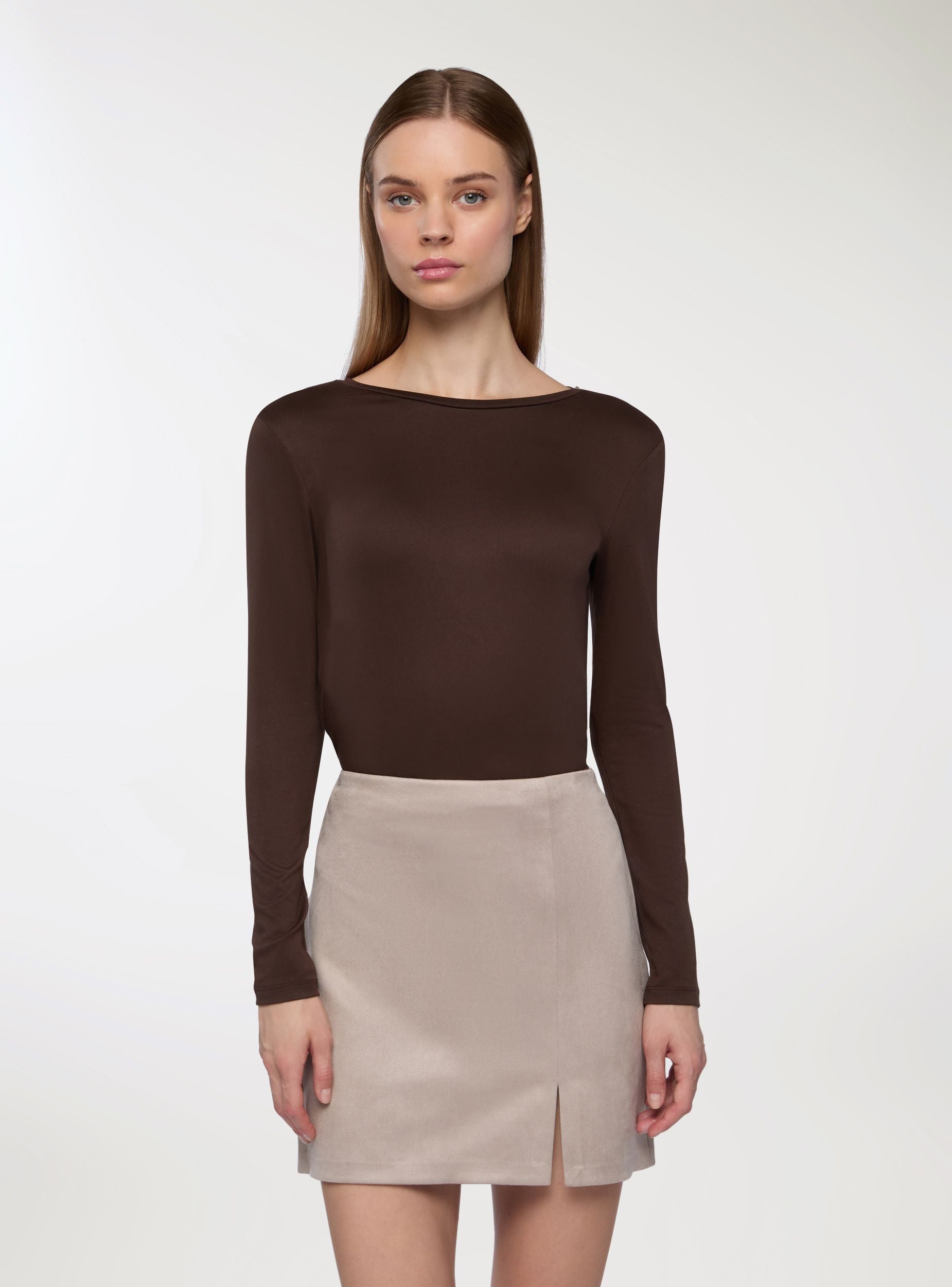 Женска основна блуза с дълги ръкави от еластична материя. Перфектна за всеки сезон, тази блуза е задължителен елемент в гардероба. Характеризира се с минималистичен дизайн и едноцветен цвят, с дълги ръкави и удобен кръгъл деколте. Еластичната материя осигурява плътно и комфортно прилягане, следвайки естествено линиите на тялото. Идеална за носене самостоятелно в ежедневни визии или като слой под якета, блейзери или кардигани през по-студените месеци, лесно се адаптира към всяка ситуация, от офиса до свободното време. Многофункционален елемент, който съчетава простота и практичност за винаги поддържан стил.Детайли