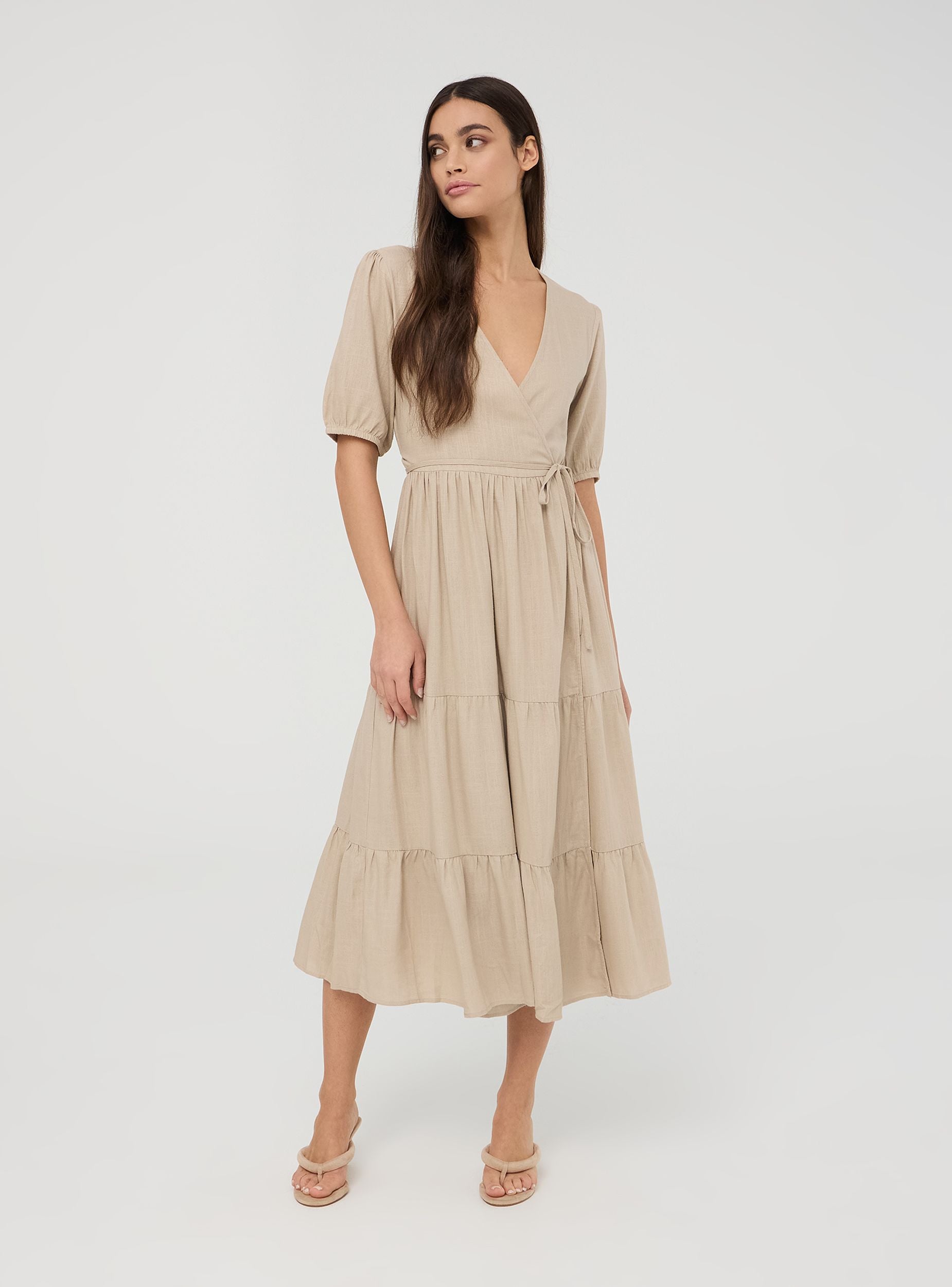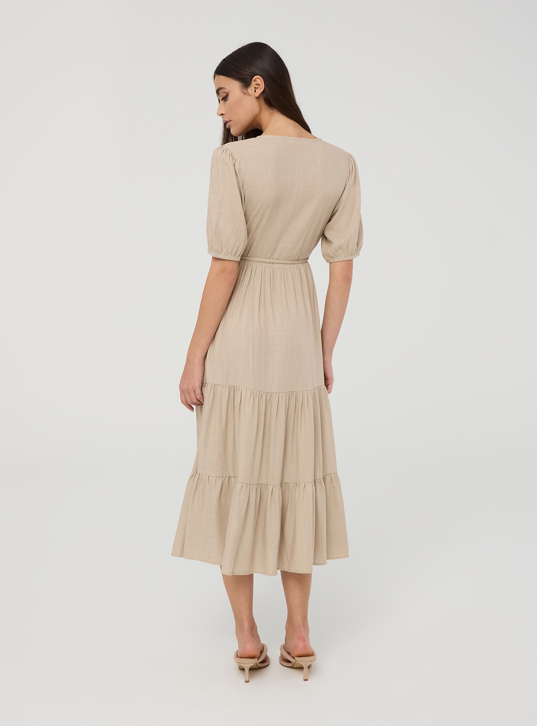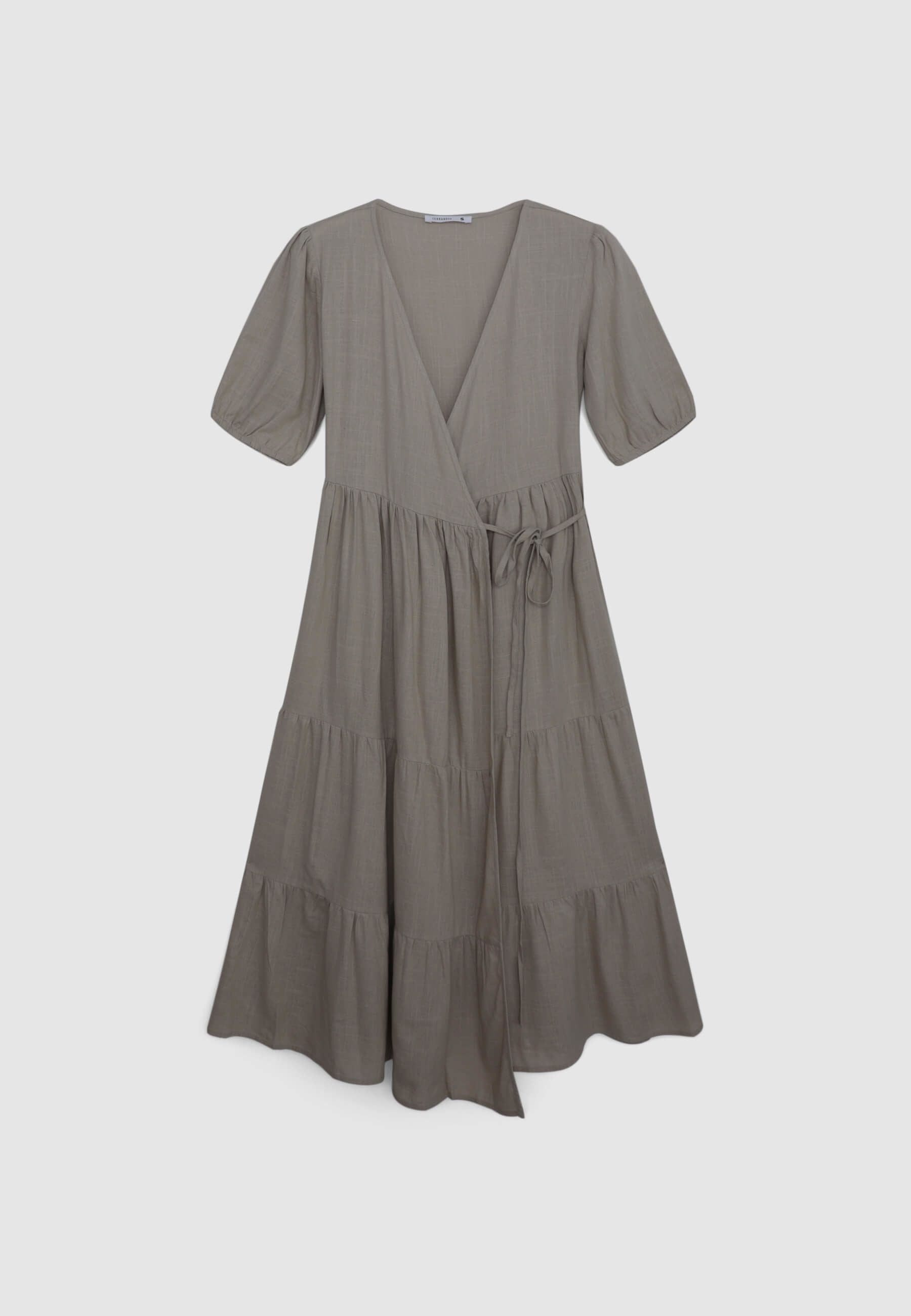 Дълга прегърната рокля с волани от смесен лен