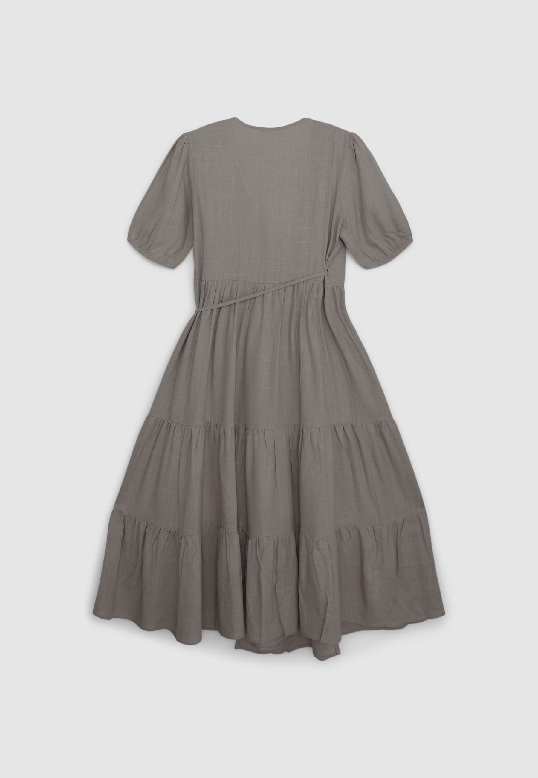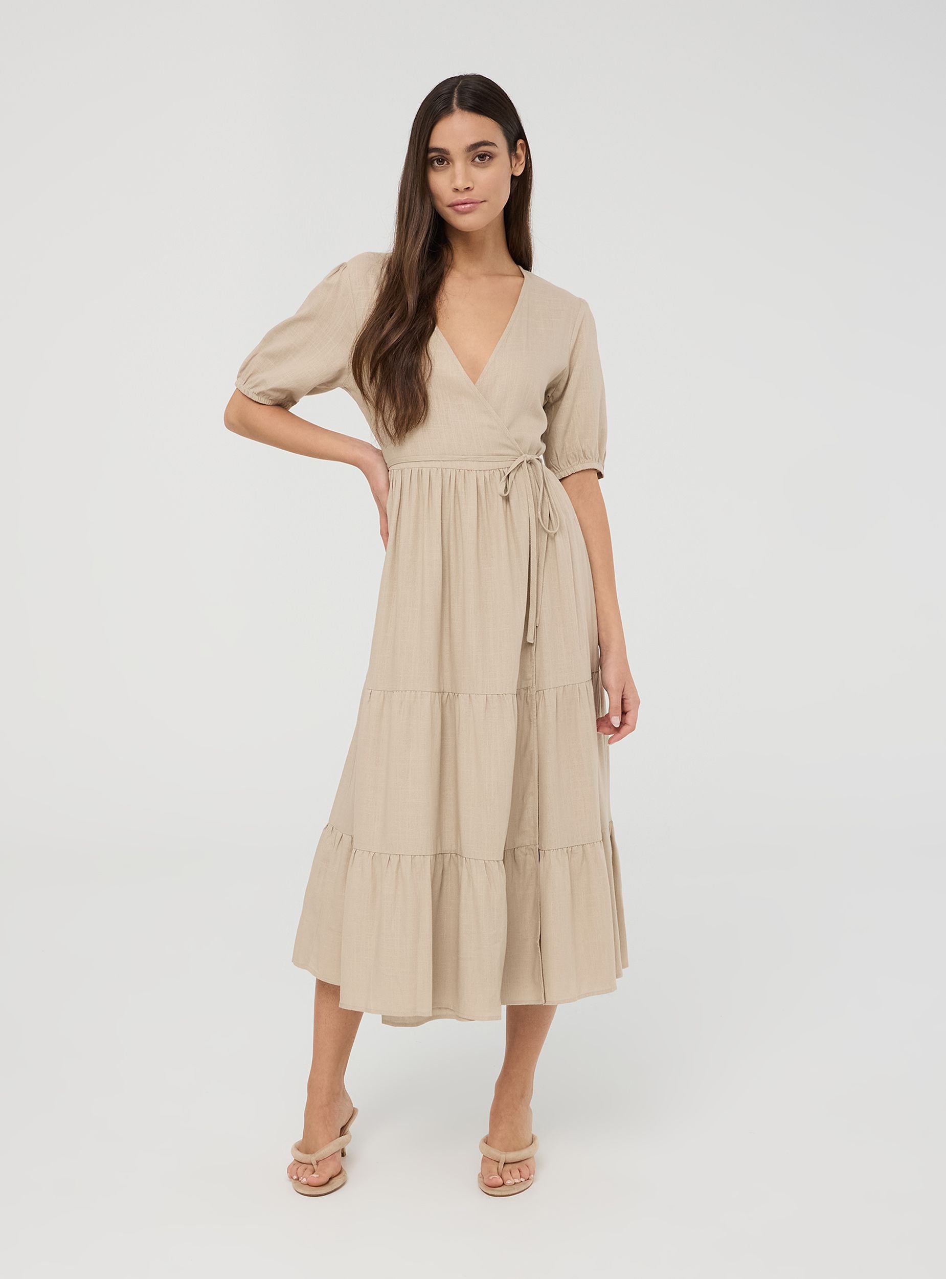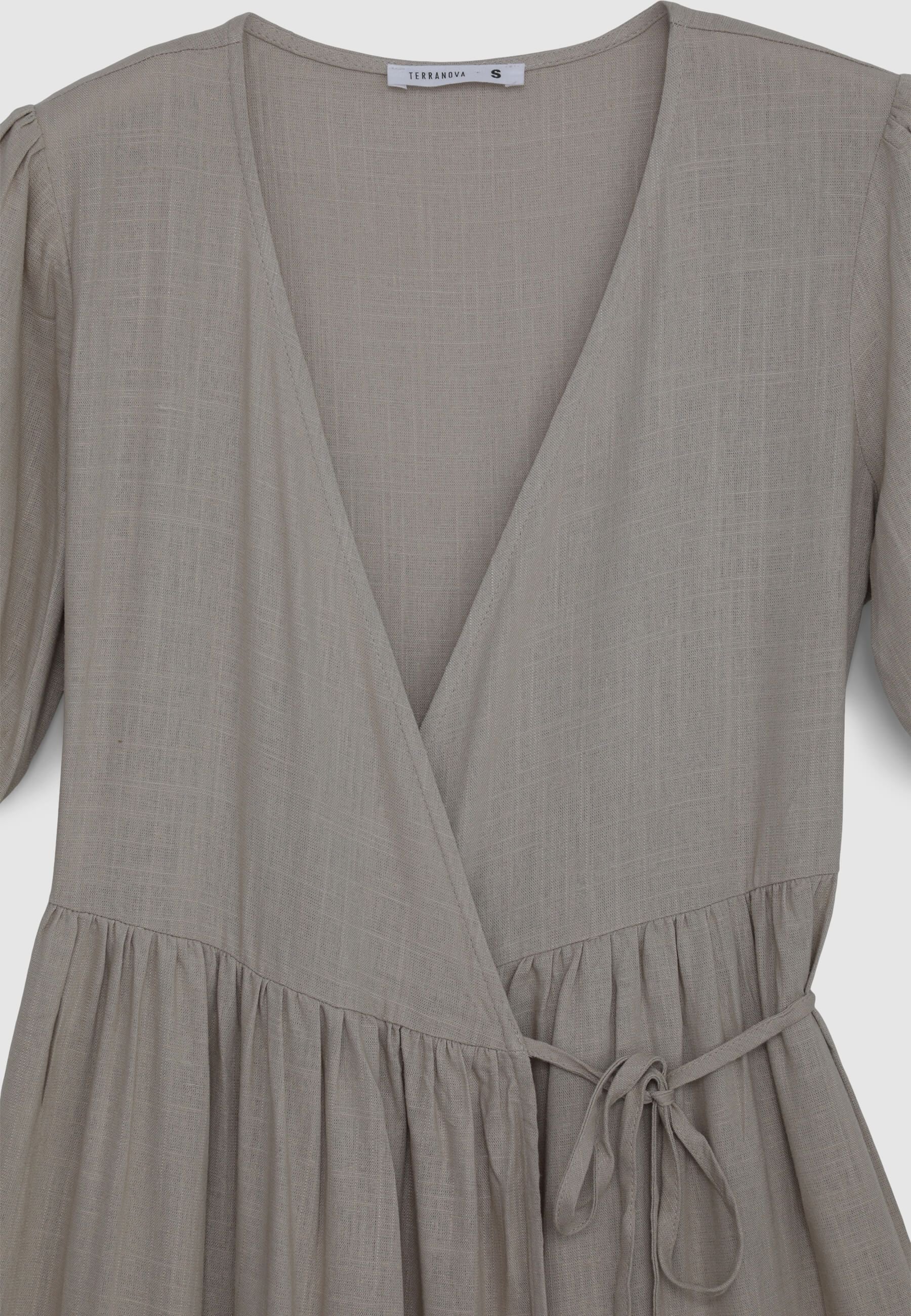 Дълга прегърната рокля с волани от смесен лен
