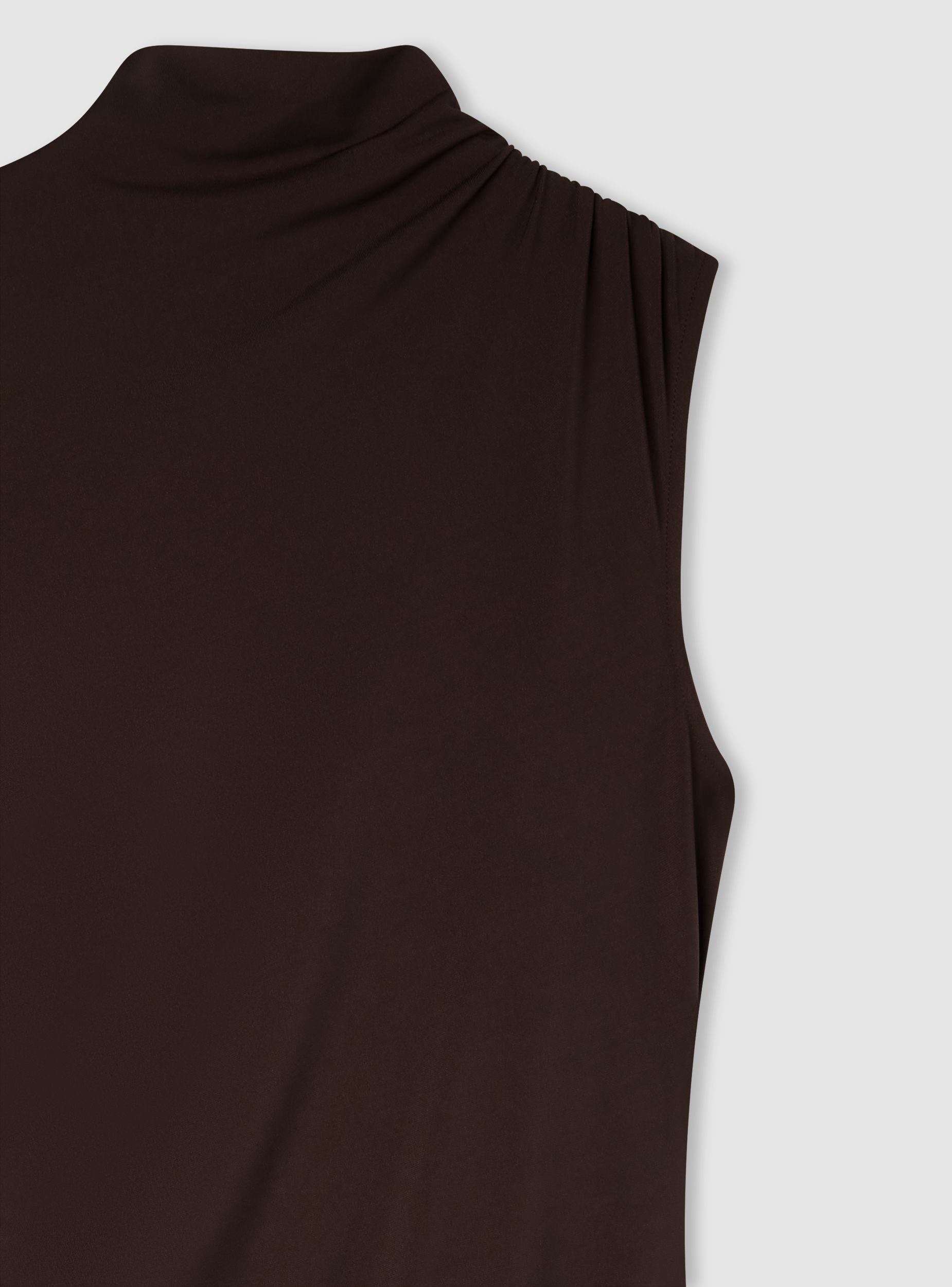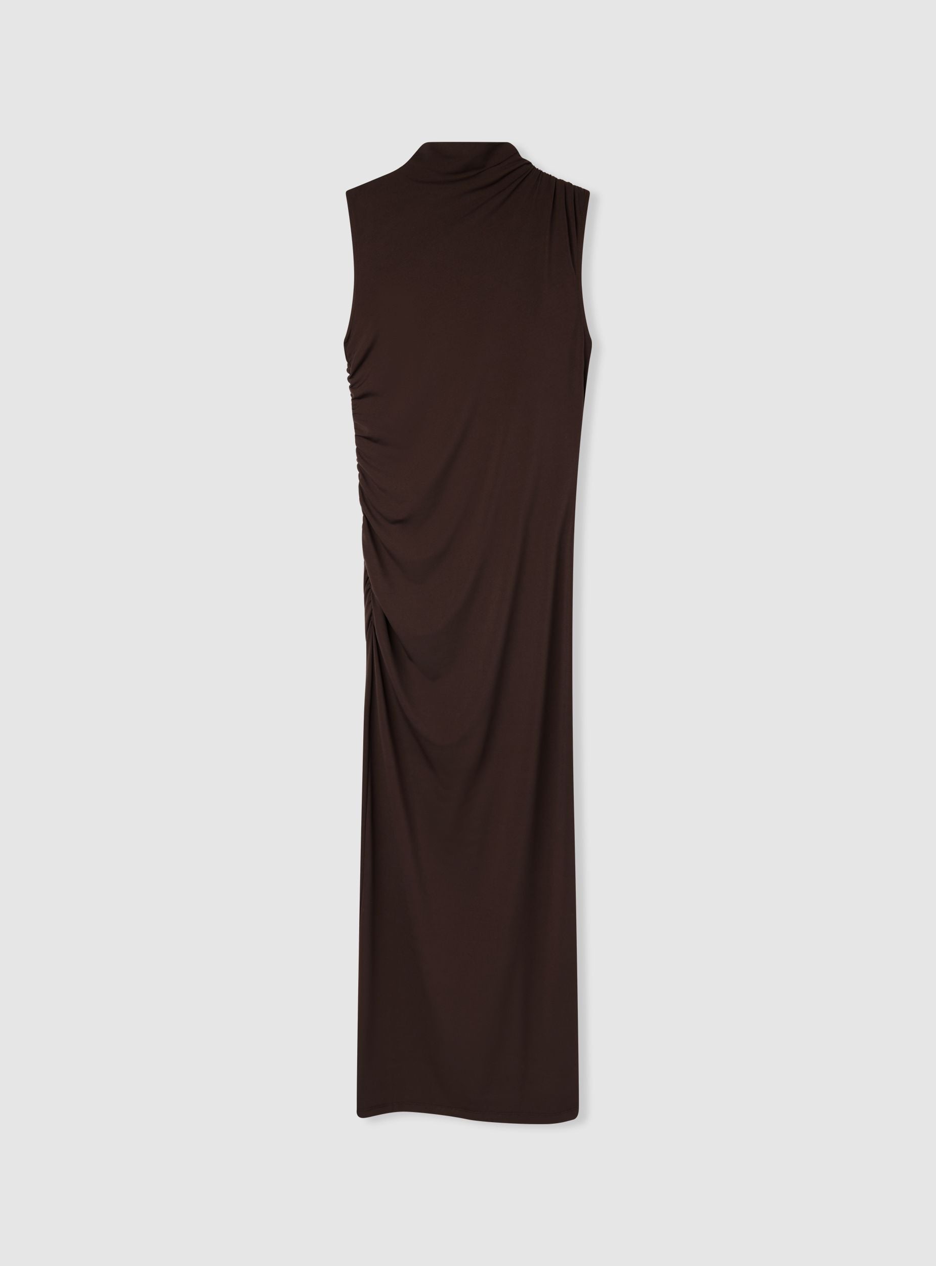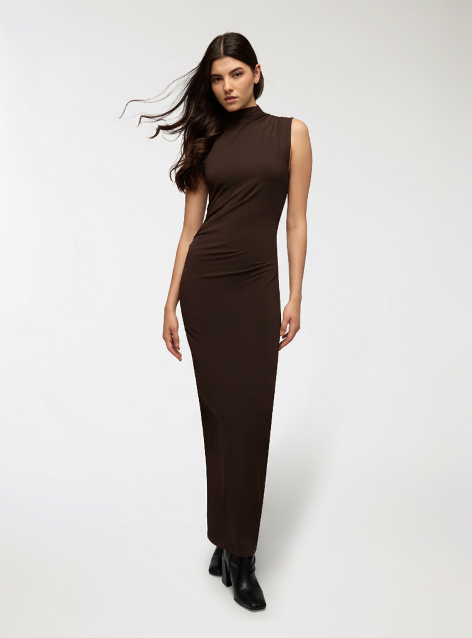 Дълга дамска рокля без ръкави, идеална за елегантни събития и специални вечери. Представя драпирана визия, която подчертава силуета, и висока яка, която добавя щрих на изисканост. Перфектна за съчетаване с обувки на ток за изискан и женствен вид. Прилепналата кройка и модерният дизайн я правят универсален избор за официални поводи.