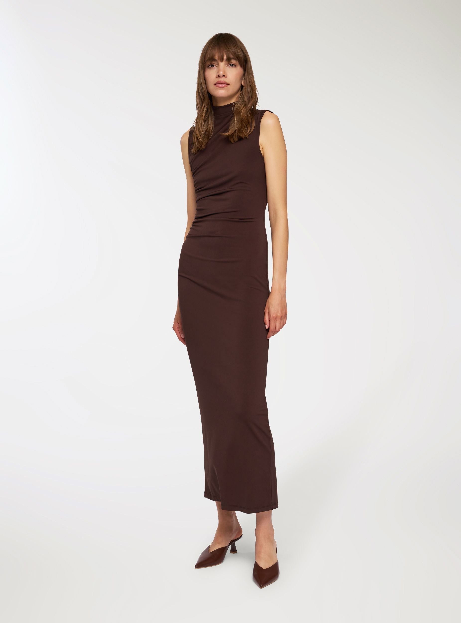 Дълга рокля с драпиране и висока яка