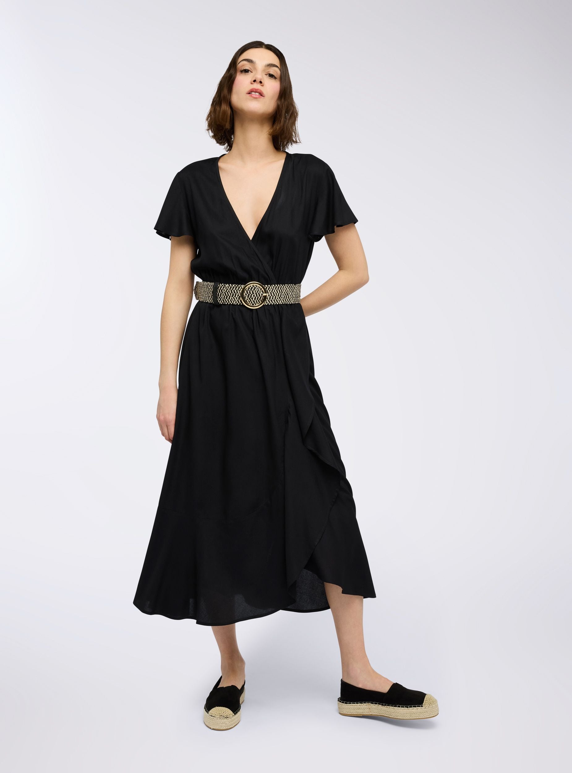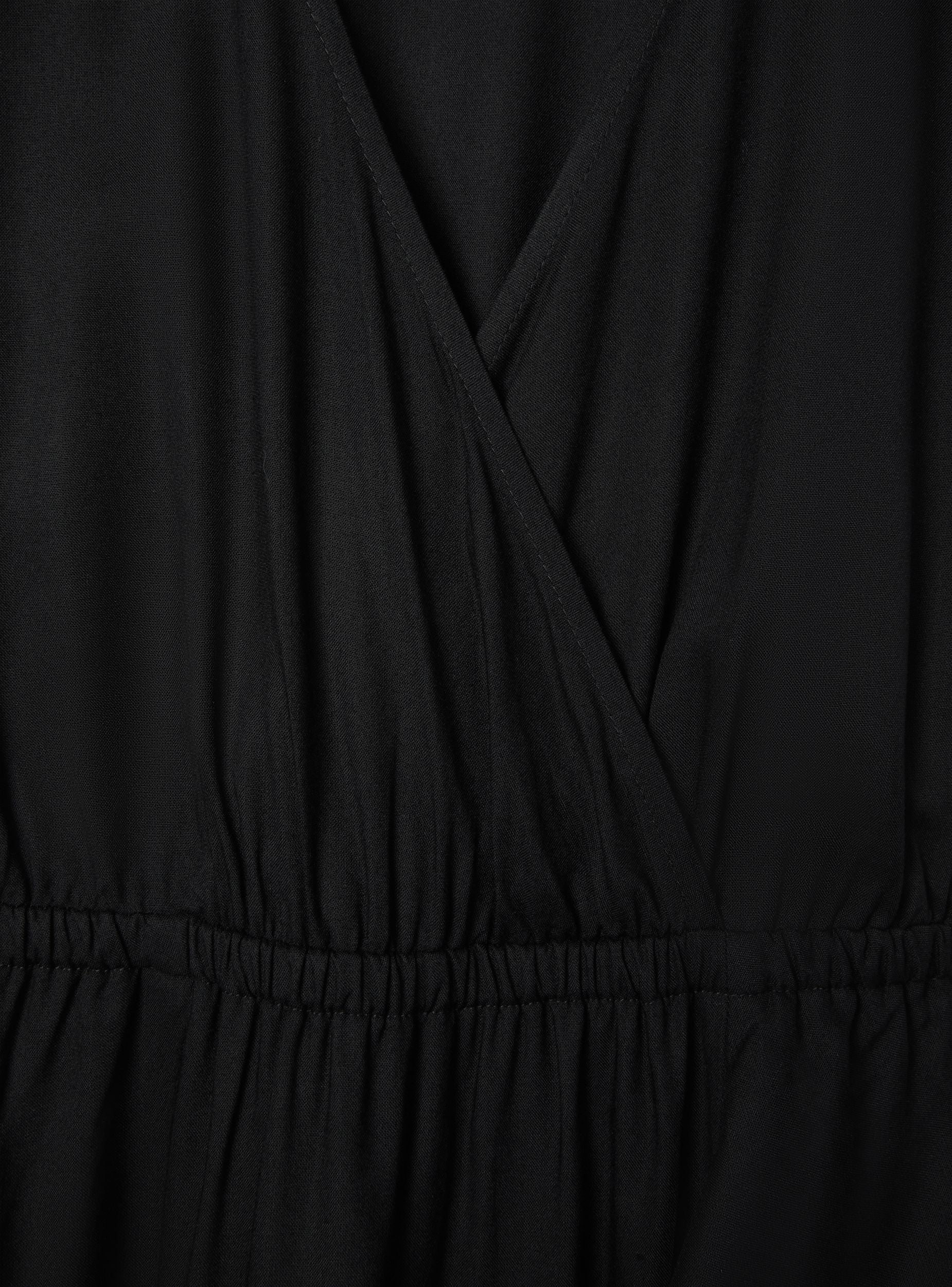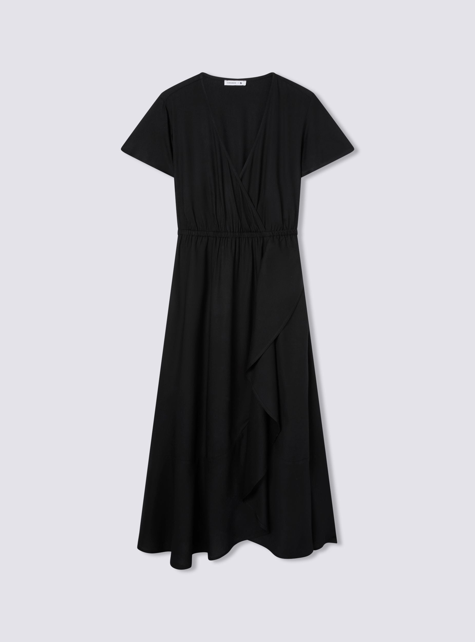 Дълга и елегантна дамска рокля, перфектна за церемонии, аперитиви или летни разходки. Роклята с обвивка обгръща силуета с женственост, докато едноцветният цвят я прави универсална и изискана. Дълбокото деколте подчертава бюста, а късите ръкави добавят нотка лекота. Идеална с ниски сандали за ежедневен вид или с токчета и аксесоари за специален случай.Детайли