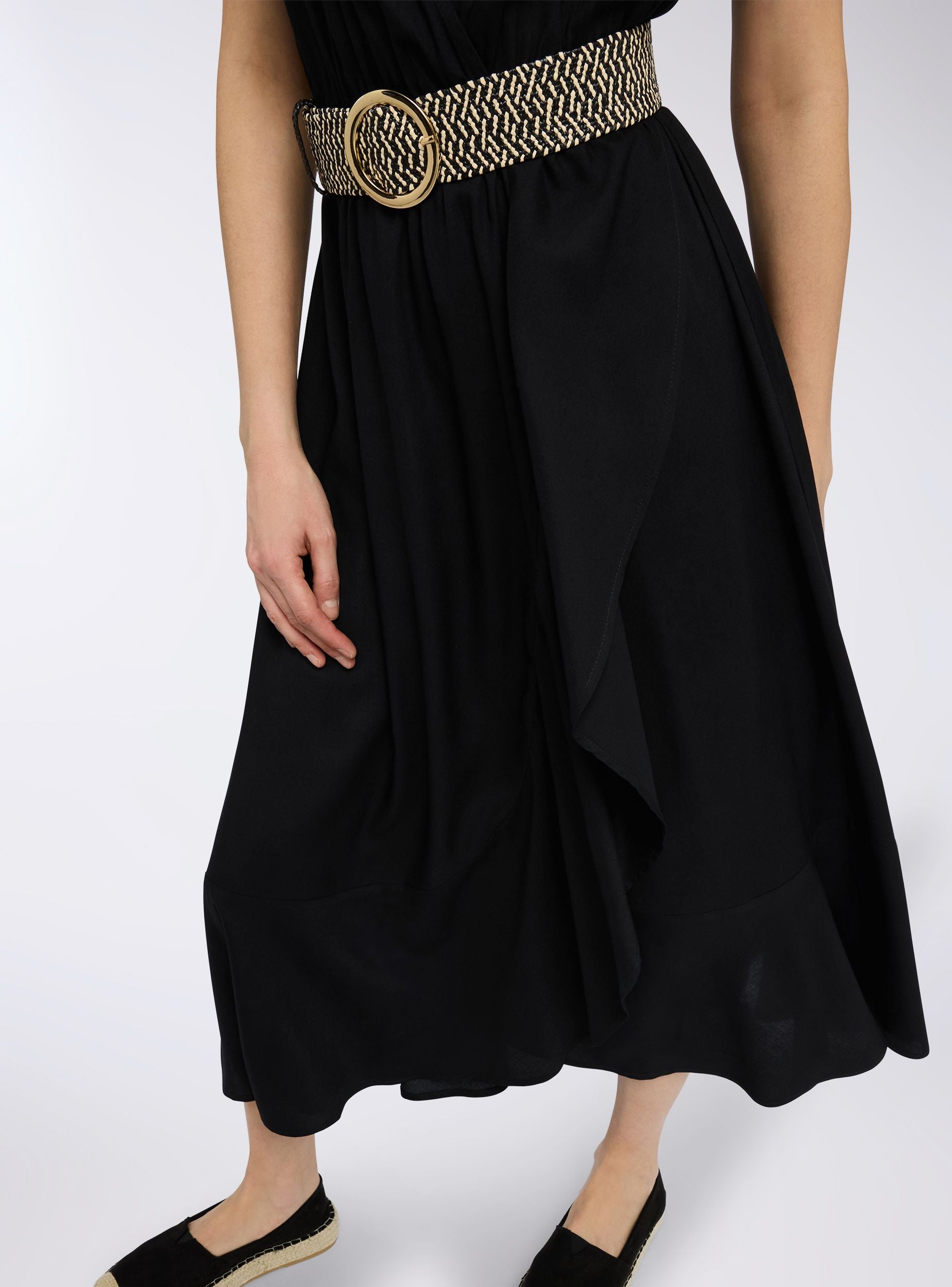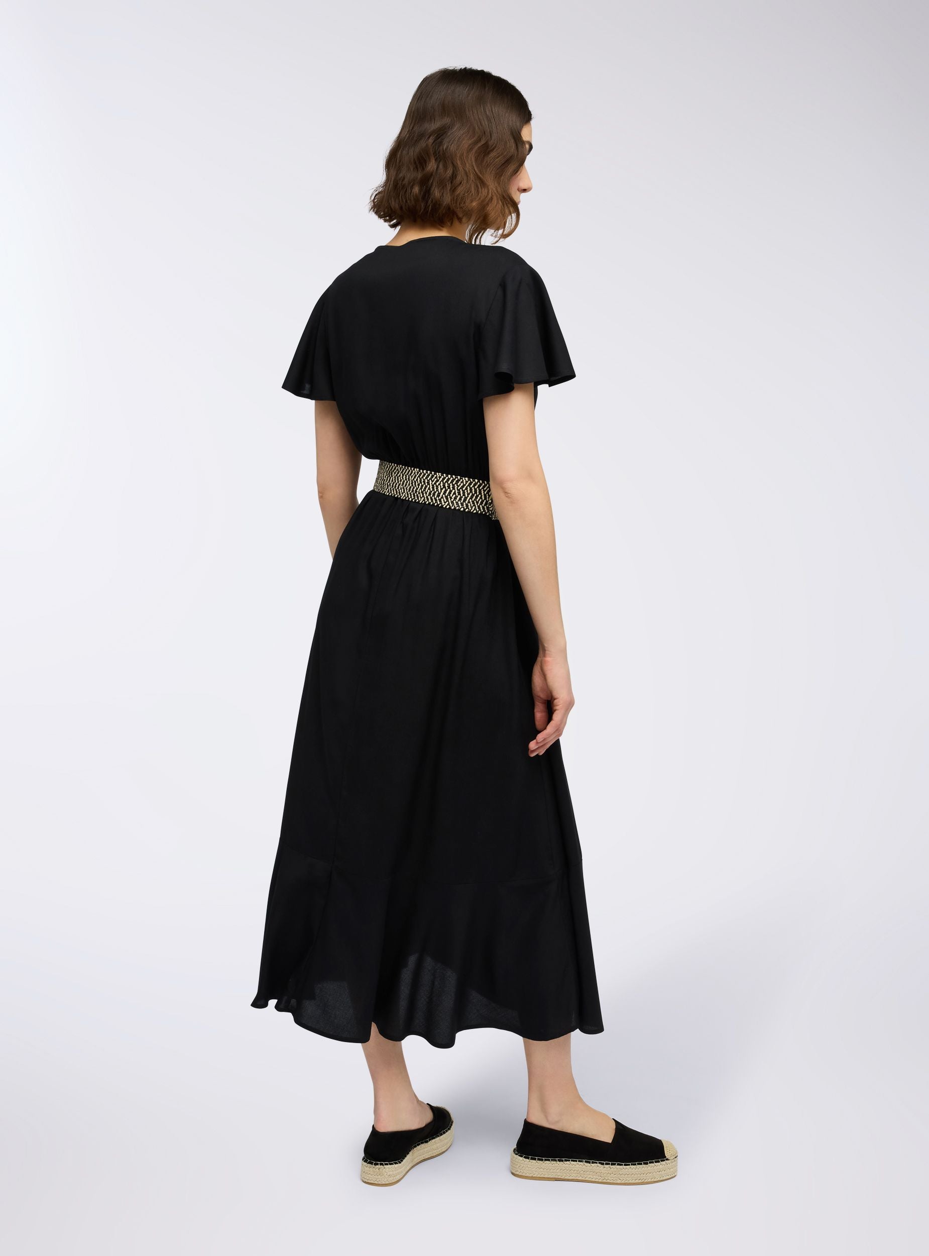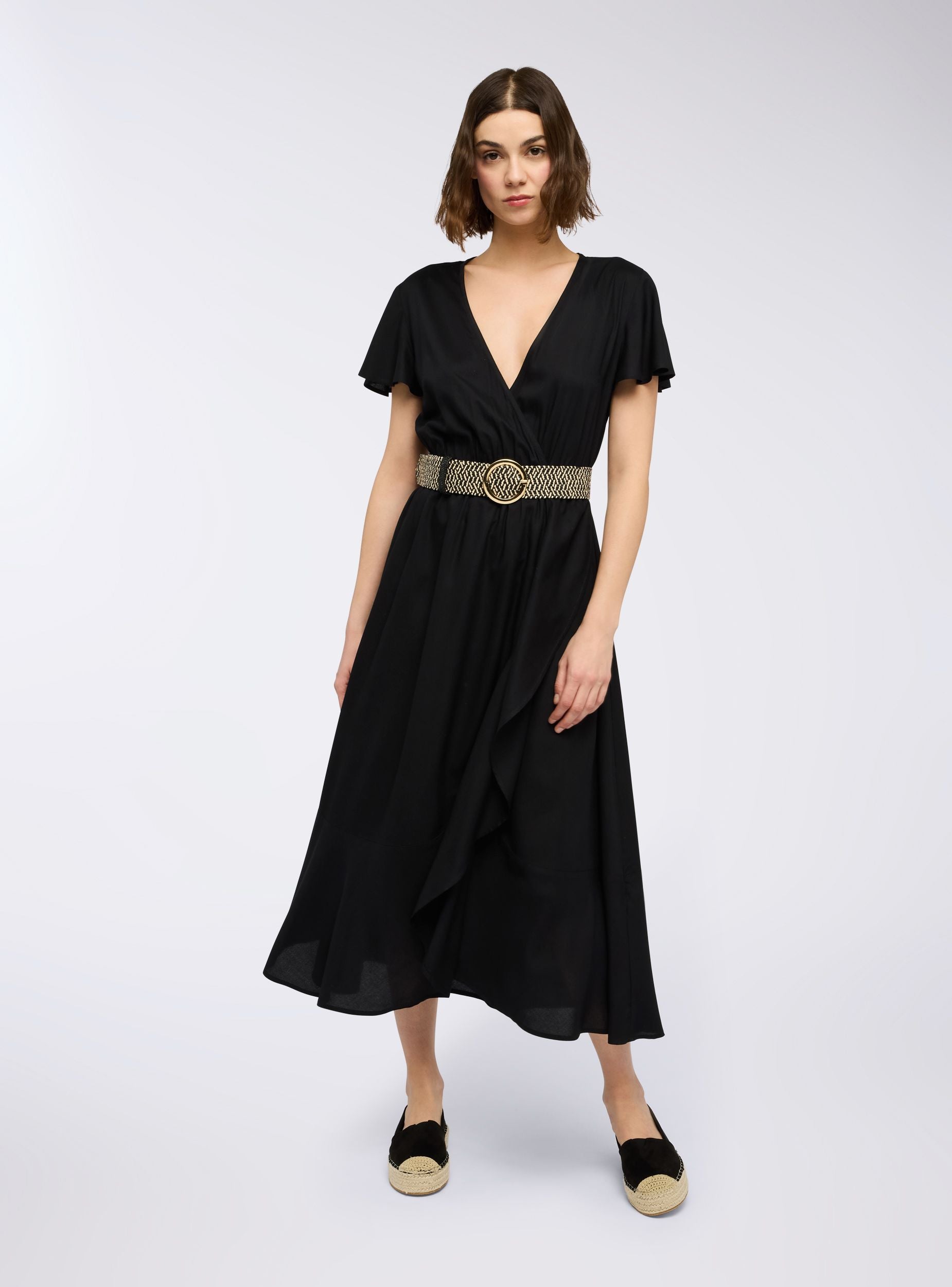 Дълга и елегантна дамска рокля, перфектна за церемонии, аперитиви или летни разходки. Роклята с обвивка обгръща силуета с женственост, докато едноцветният цвят я прави универсална и изискана. Дълбокото деколте подчертава бюста, а късите ръкави добавят нотка лекота. Идеална с ниски сандали за ежедневен вид или с токчета и аксесоари за специален случай.Детайли