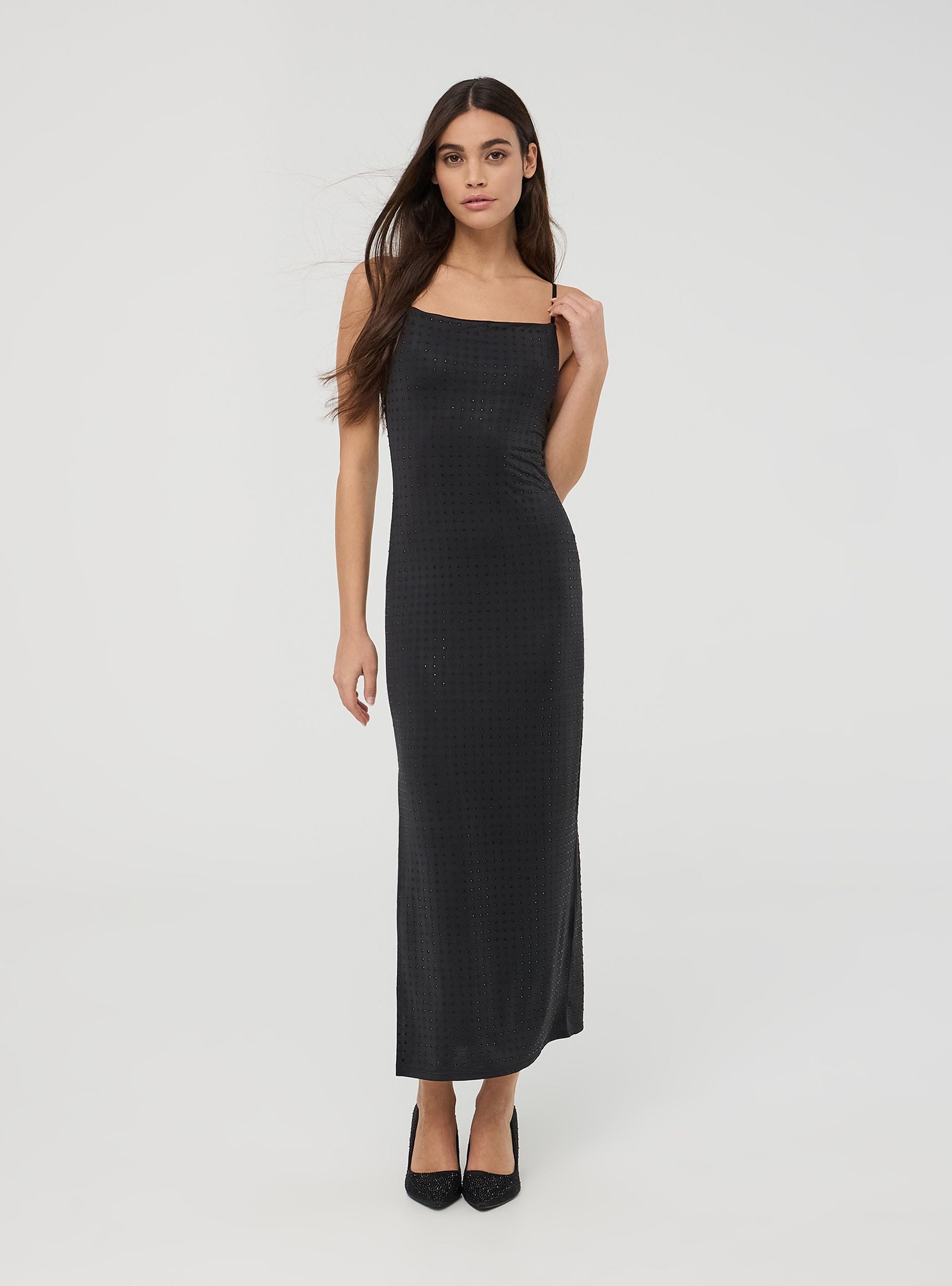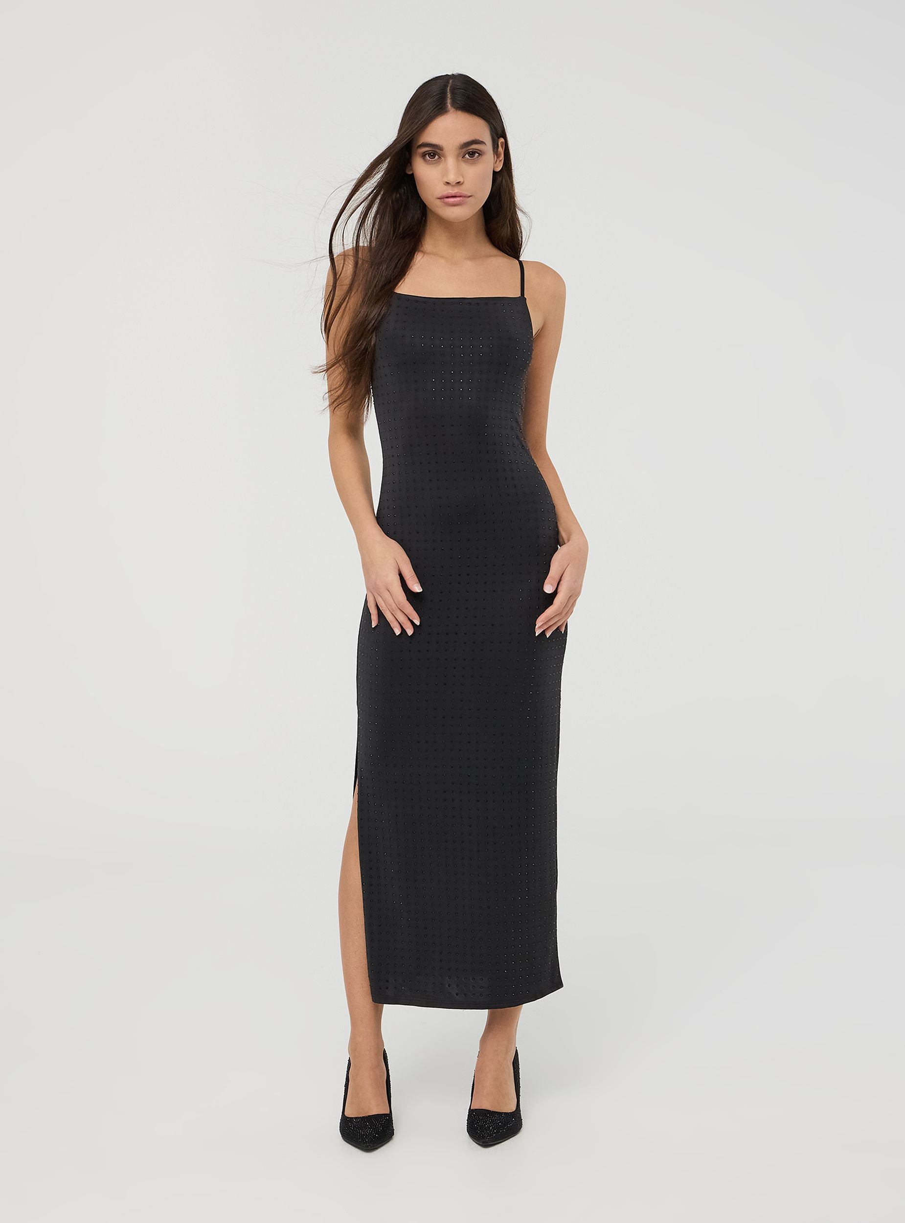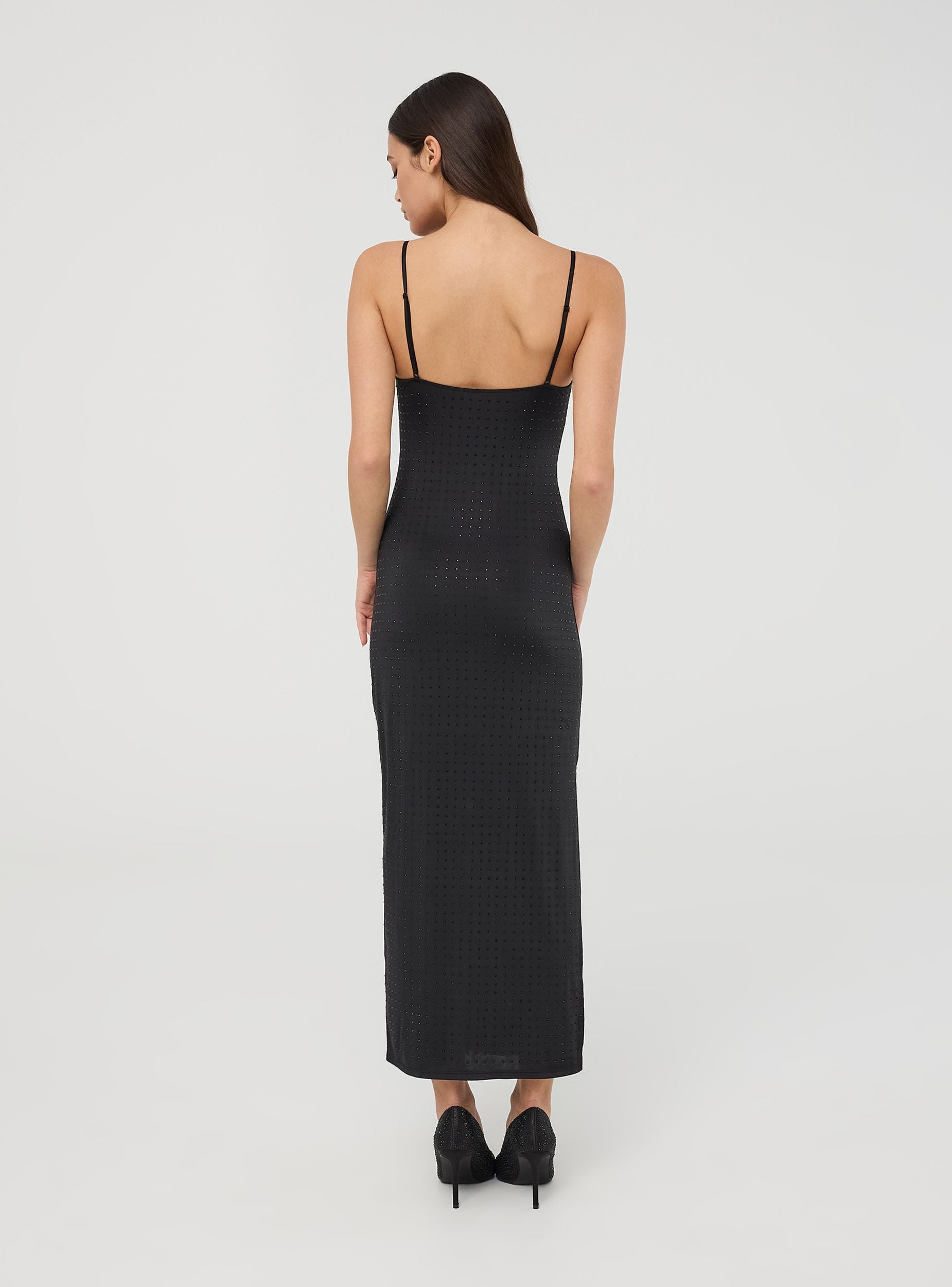 Дълга и сложна дамска рокля, характеризираща се с едноцветен нюанс, украсен с камъни по цялата повърхност, за модерен и светъл вид. Тънките регулируеми презрамки осигуряват перфектно прилягане, докато правият кройка нежно следва фигурата. Отстрани се отваря елегантен разрез, който добавя нотка на сексуалност, без да компрометира изискаността на роклята. Идеална за специални вечери или формални събития, този артикул съчетава елегантност и съвременност, осигурявайки стил, който привлича вниманието с класа.