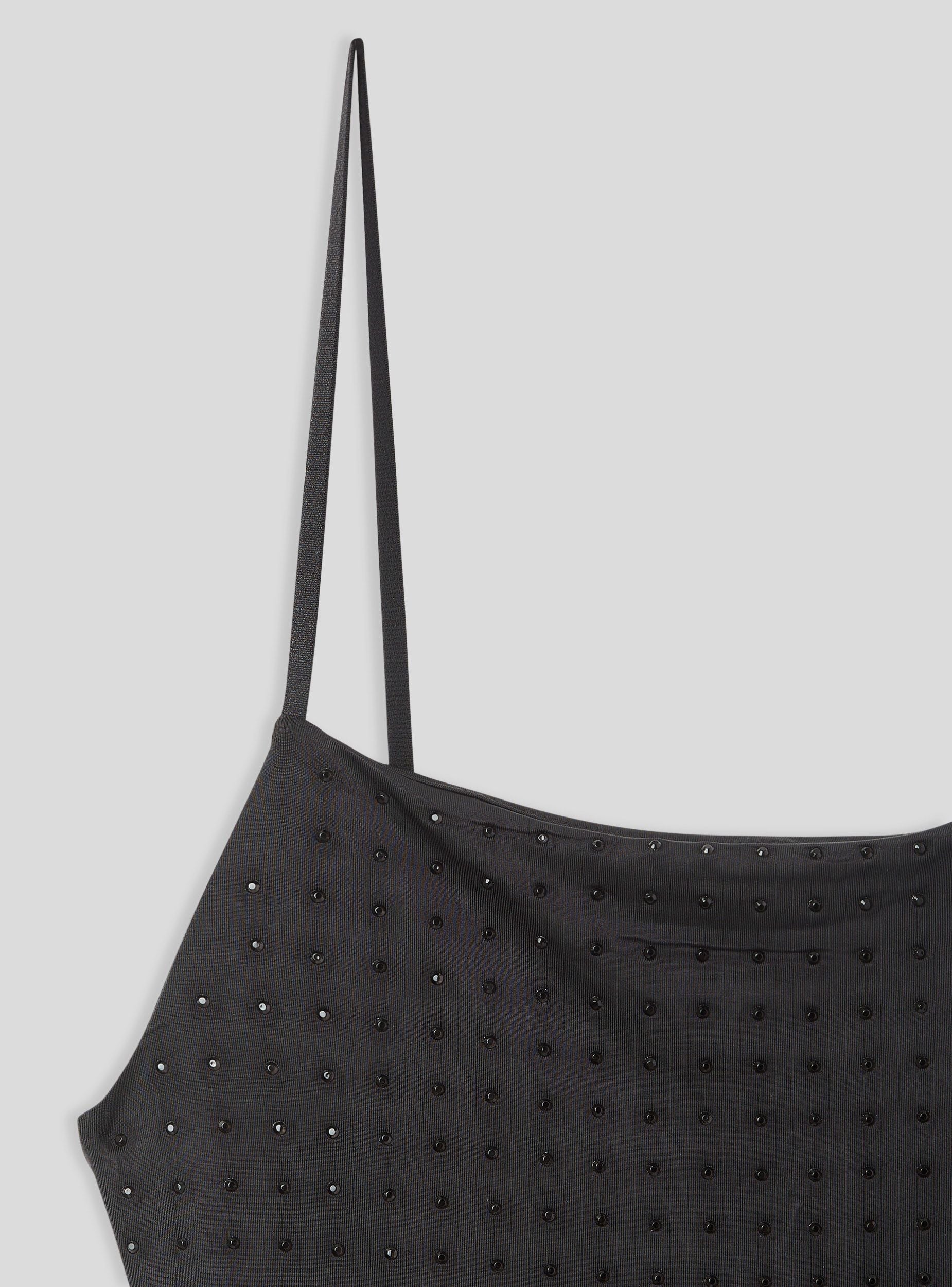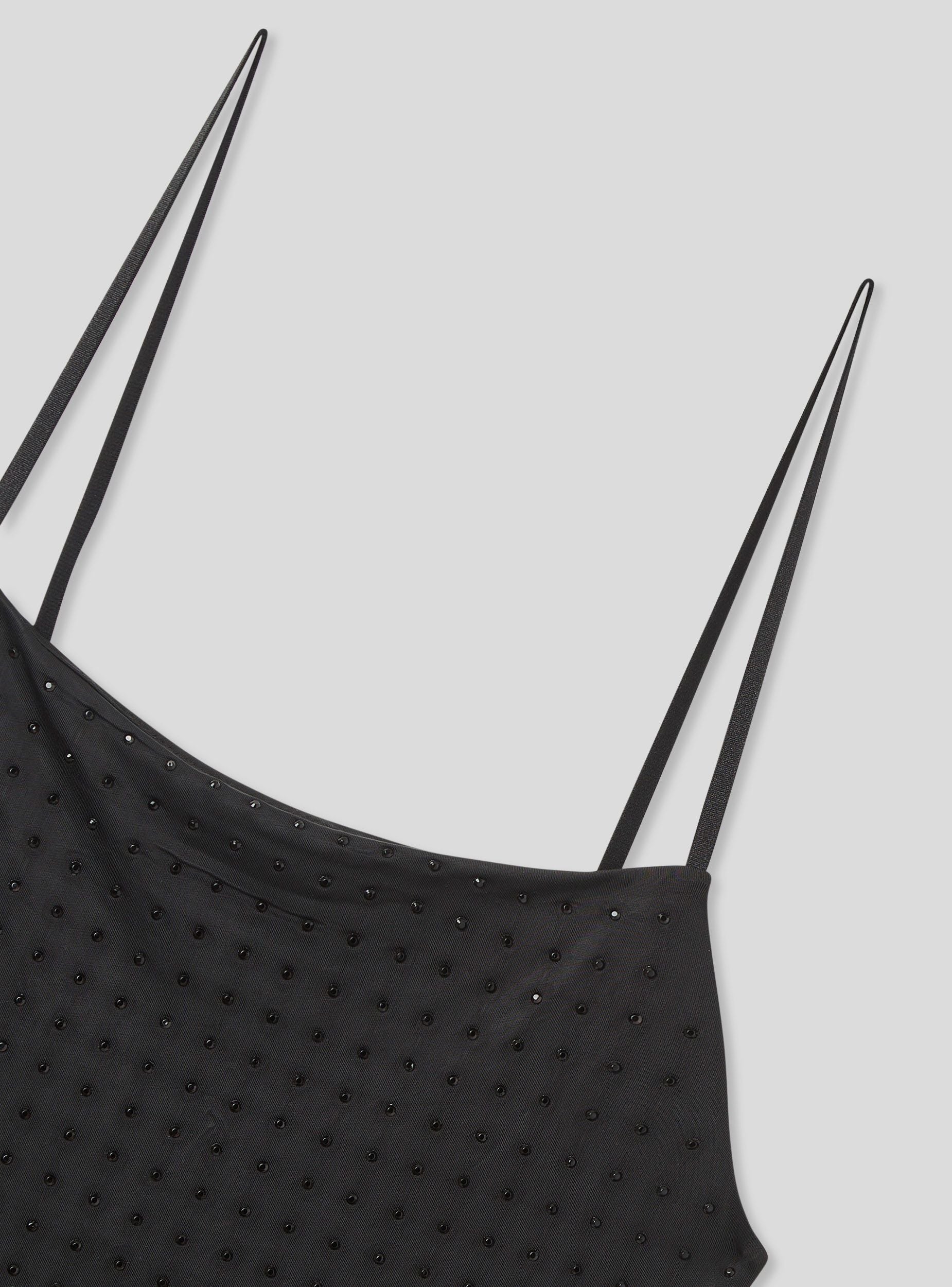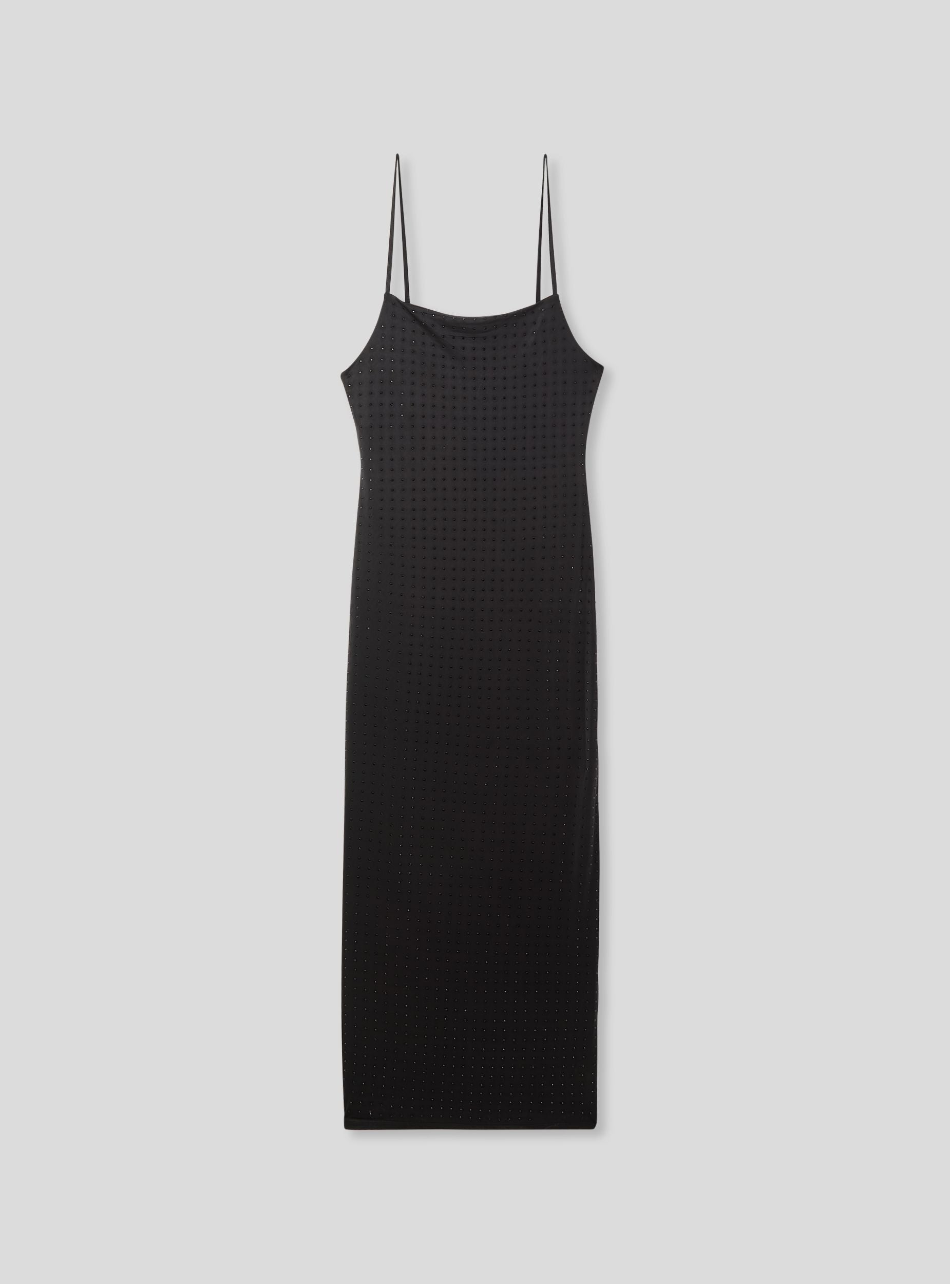 Дълга и сложна дамска рокля, характеризираща се с едноцветен нюанс, украсен с камъни по цялата повърхност, за модерен и светъл вид. Тънките регулируеми презрамки осигуряват перфектно прилягане, докато правият кройка нежно следва фигурата. Отстрани се отваря елегантен разрез, който добавя нотка на сексуалност, без да компрометира изискаността на роклята. Идеална за специални вечери или формални събития, този артикул съчетава елегантност и съвременност, осигурявайки стил, който привлича вниманието с класа.