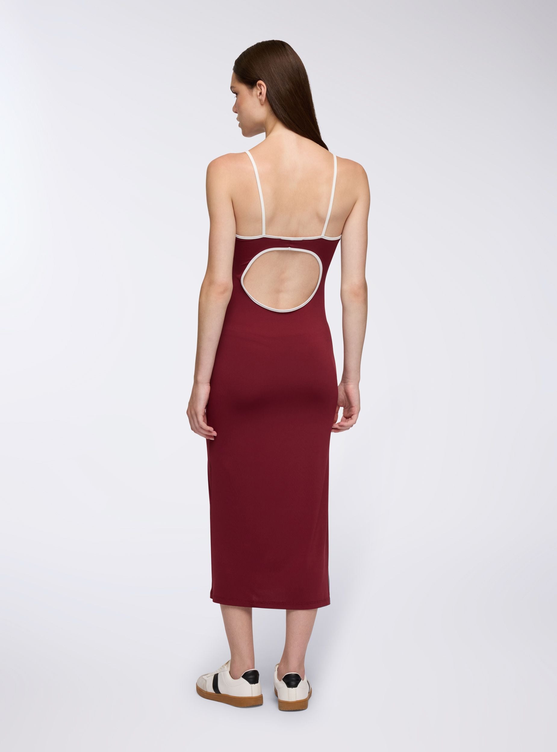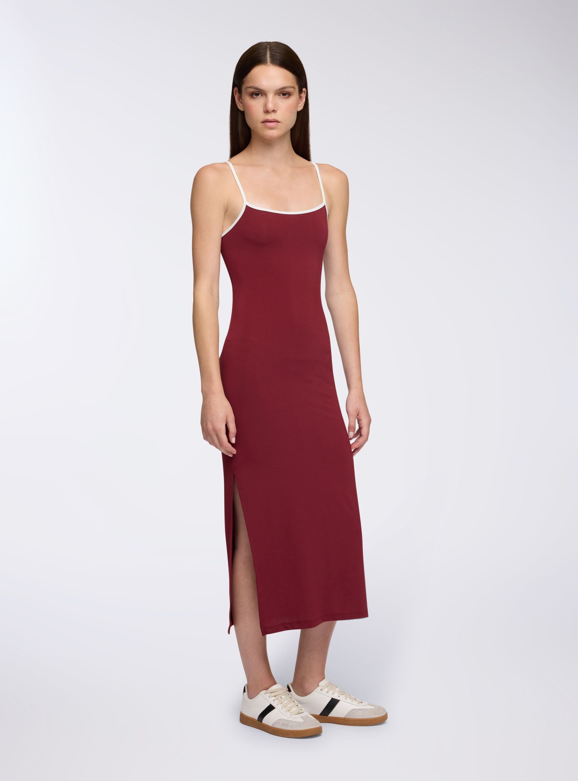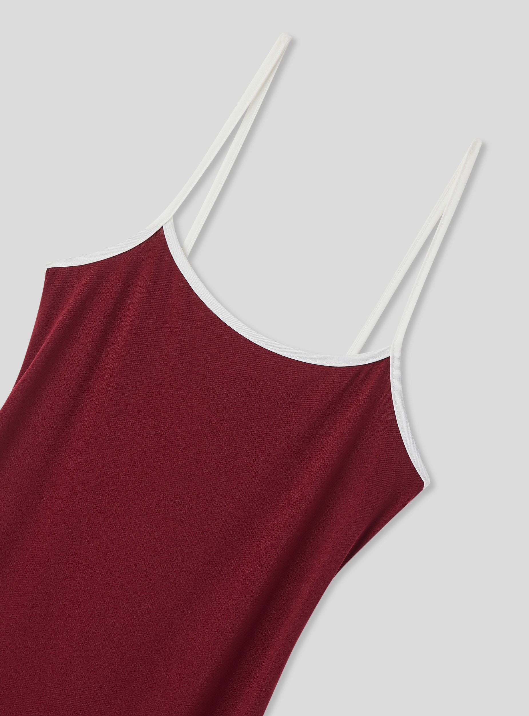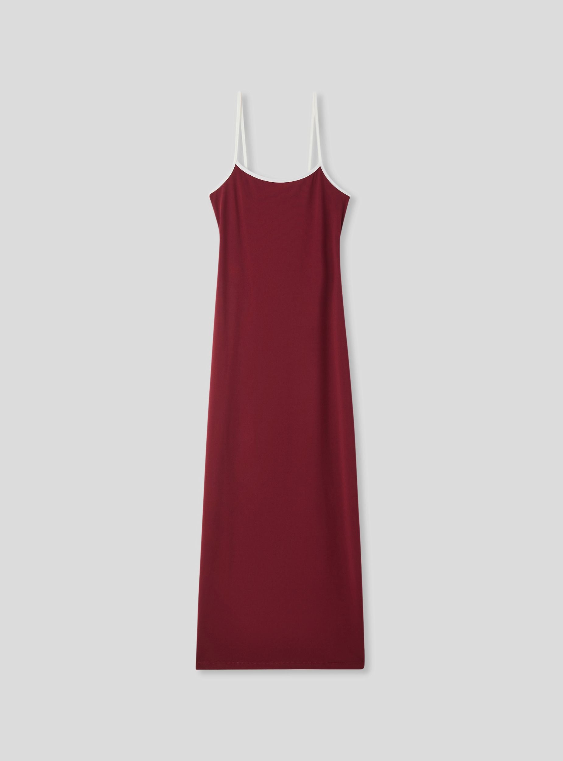 Дълга дамска рокля с тънки презрамки, идеална за елегантни поводи и летни вечери. Простият и изискан силует я прави перфектна за съчетаване с сандали или високи токчета. Единичен цвят с презрамки и контрастен кант. Минималистичният дизайн и прилепналият, еластичен кройка подчертават силуета.Детайли