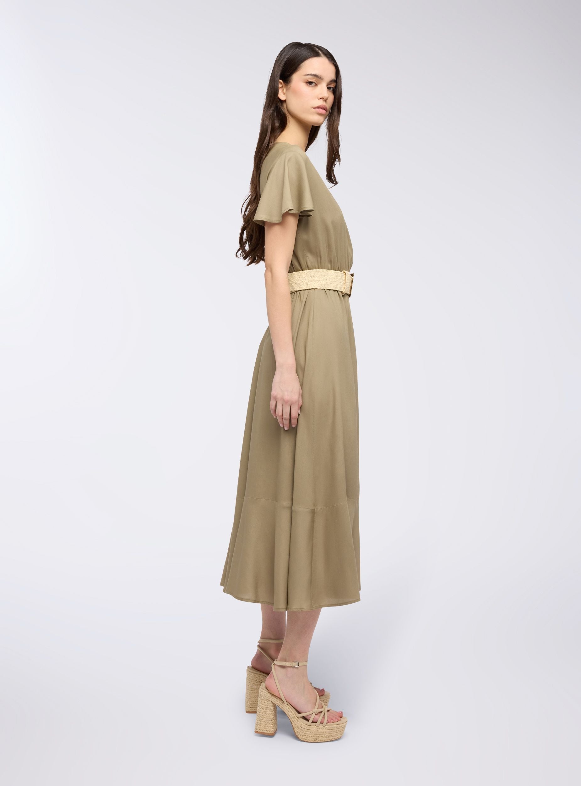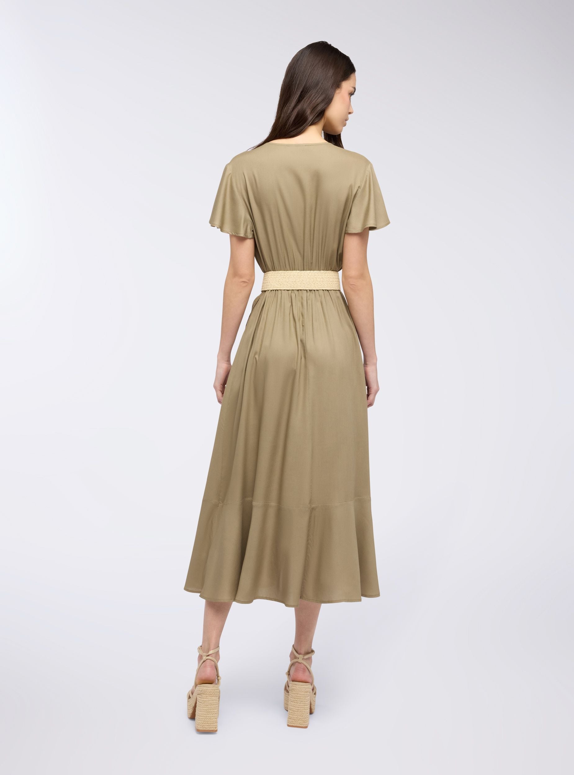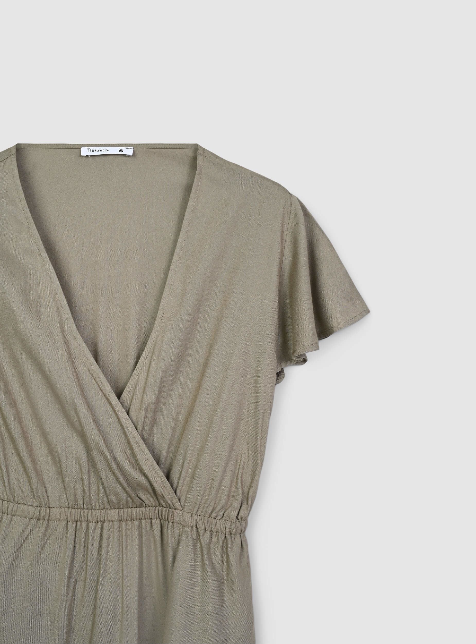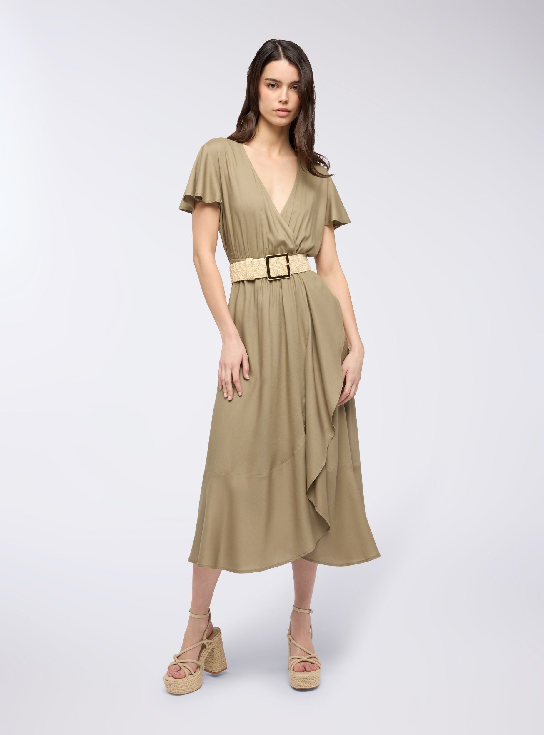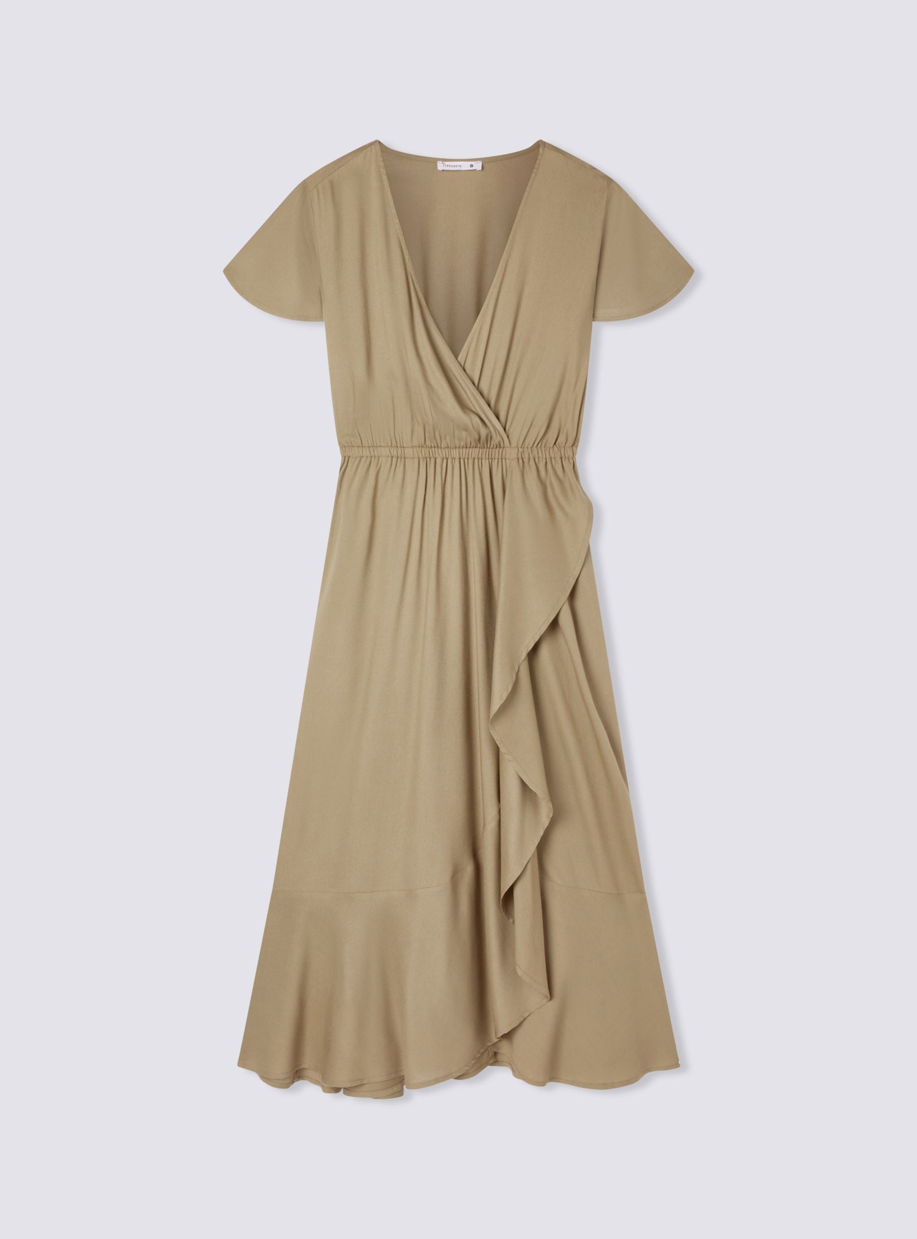Дълга и елегантна дамска рокля, перфектна за церемонии, аперитиви или летни разходки. Роклята с обвивка обгръща силуета с женственост, докато едноцветният цвят я прави универсална и изискана. Дълбокото деколте подчертава бюста, а късите ръкави добавят нотка лекота. Идеална е с ниски сандали за ежедневен вид или с токчета и аксесоари за специален случай.
