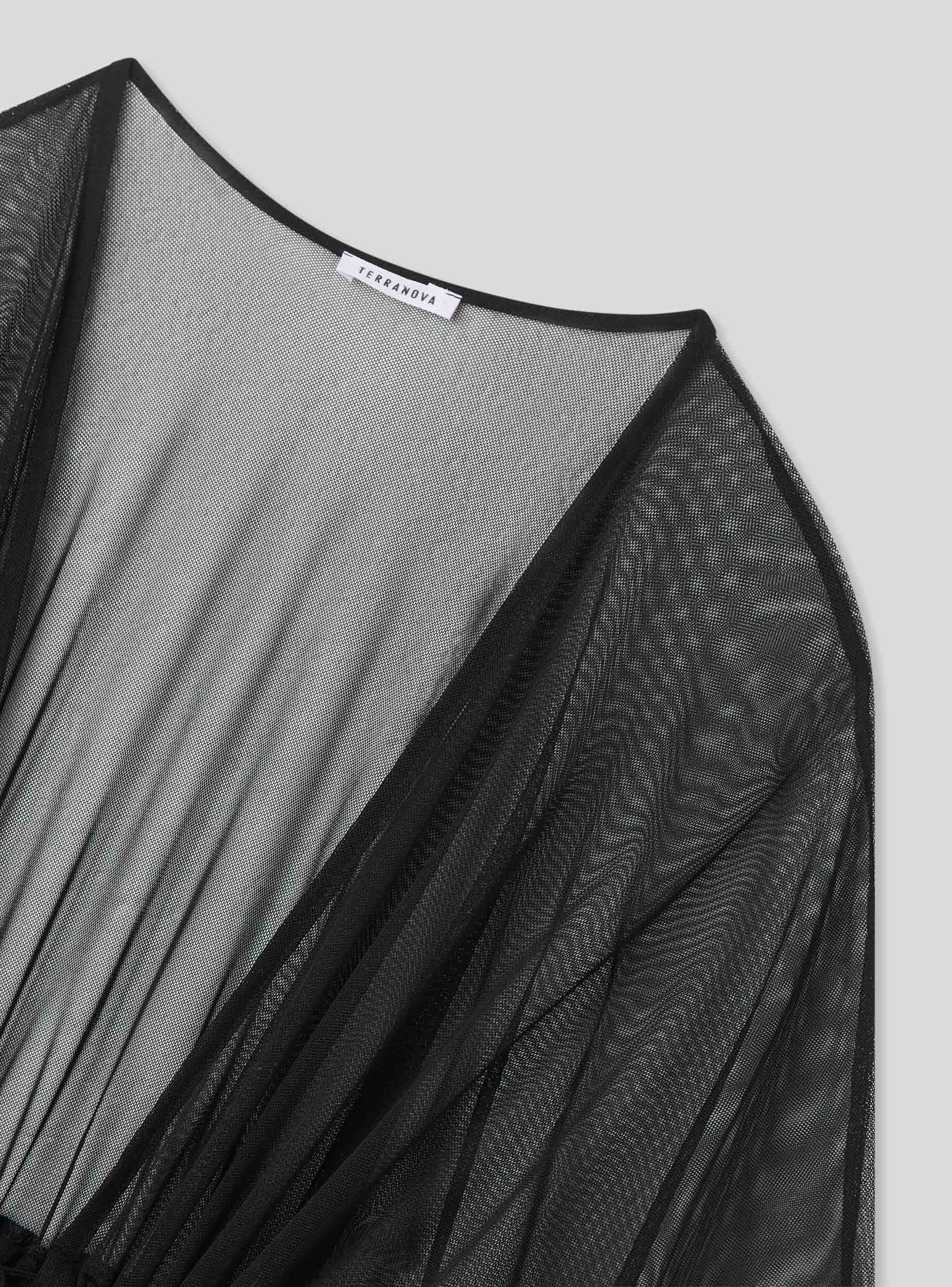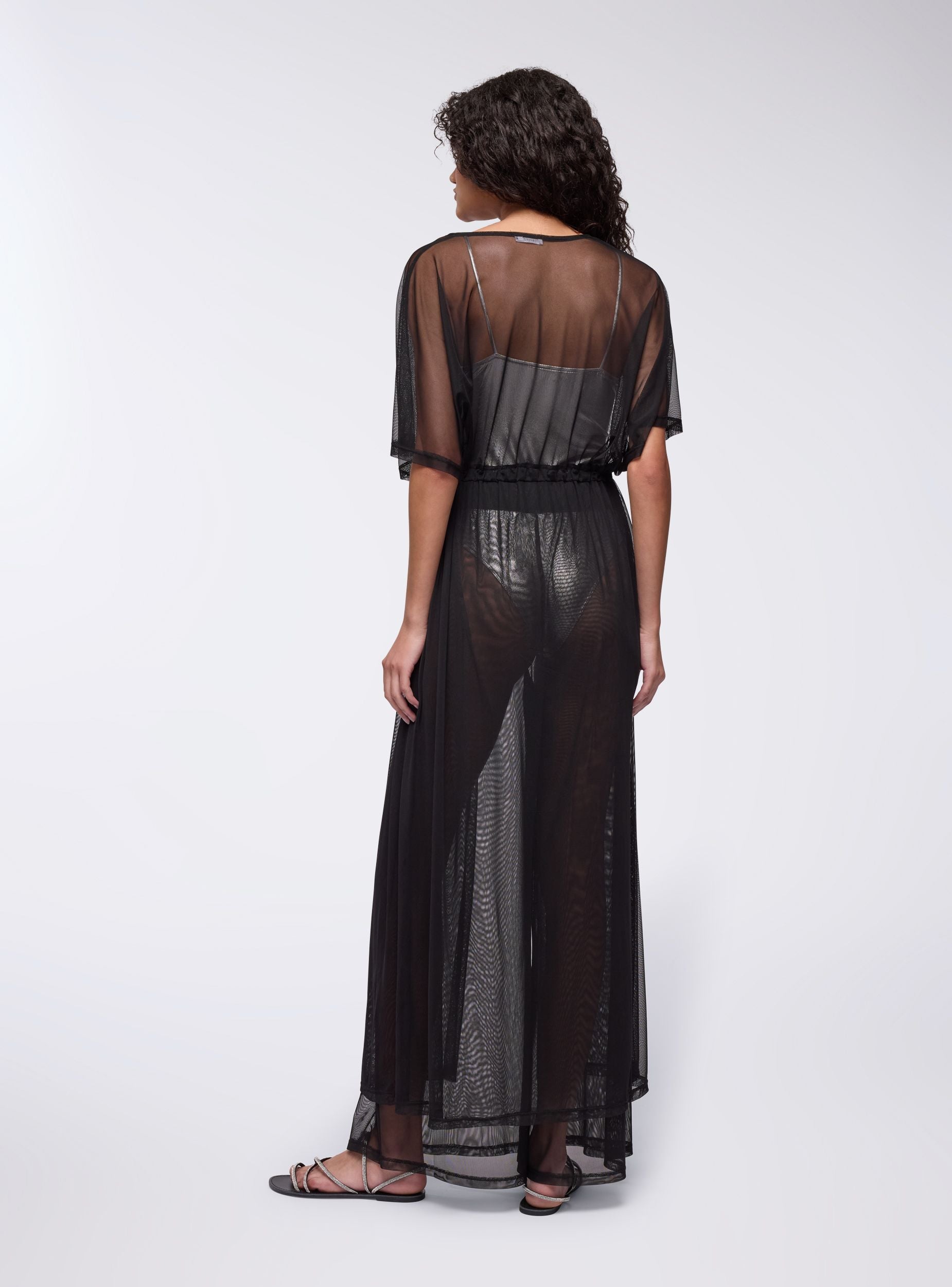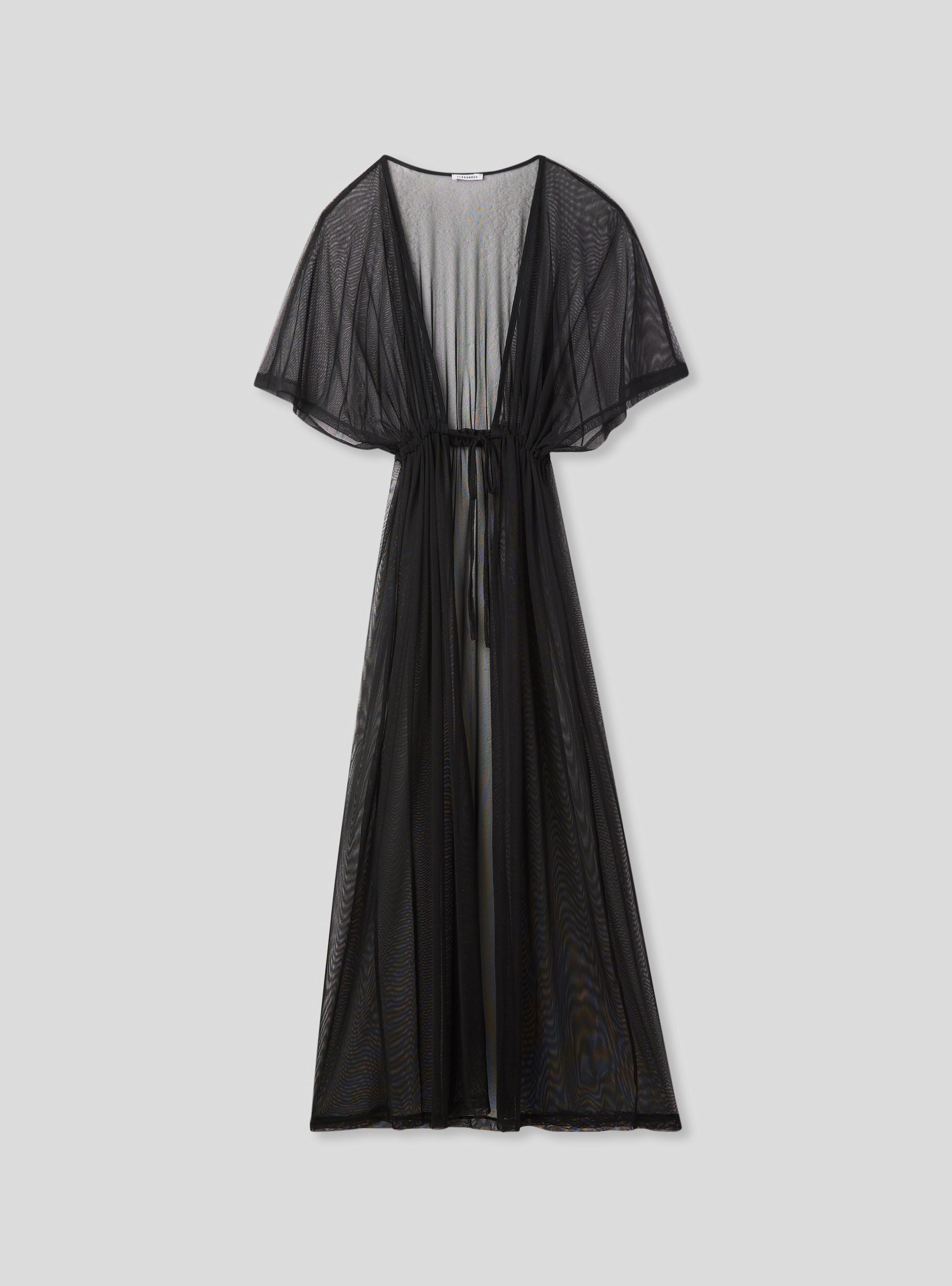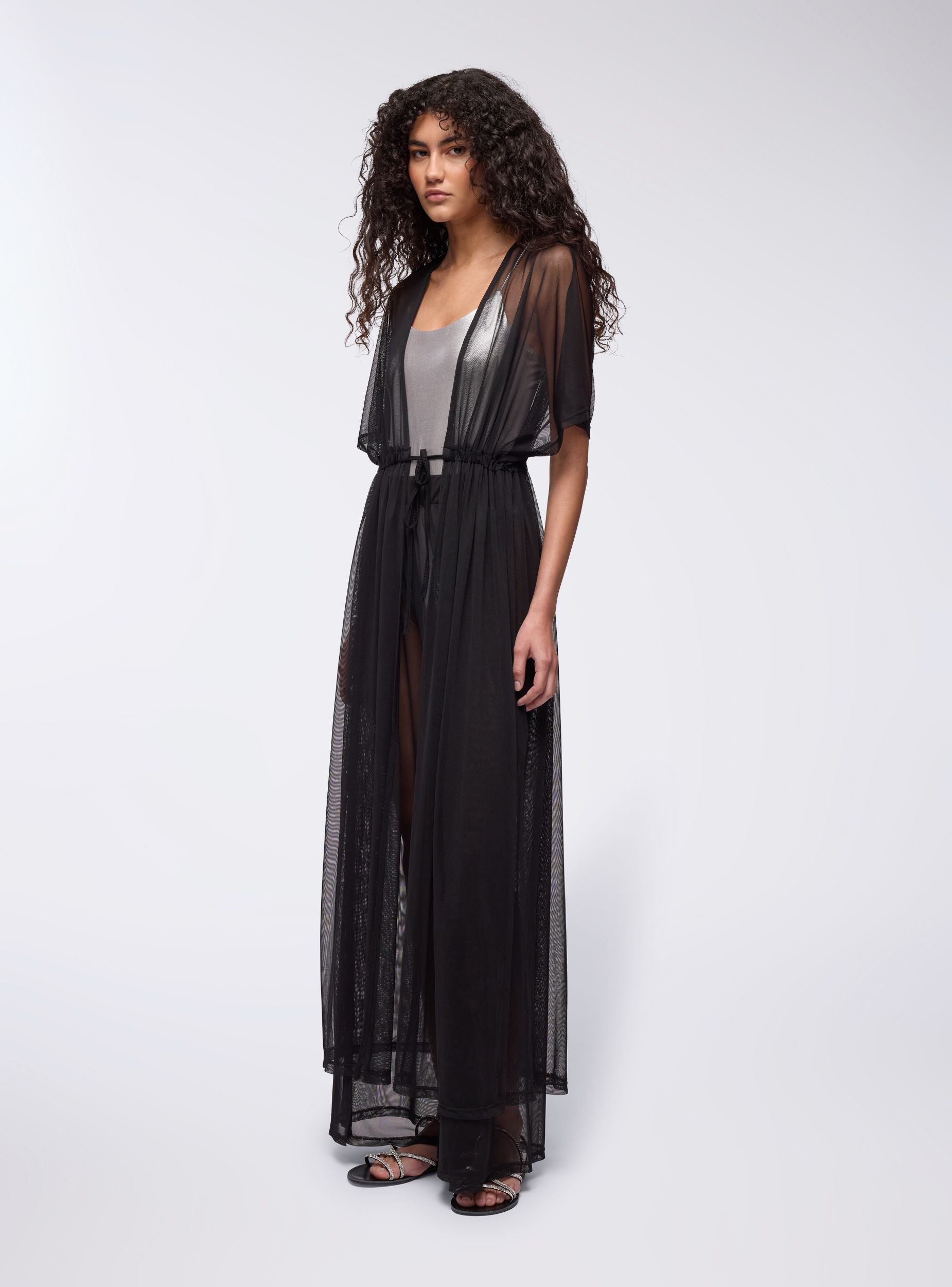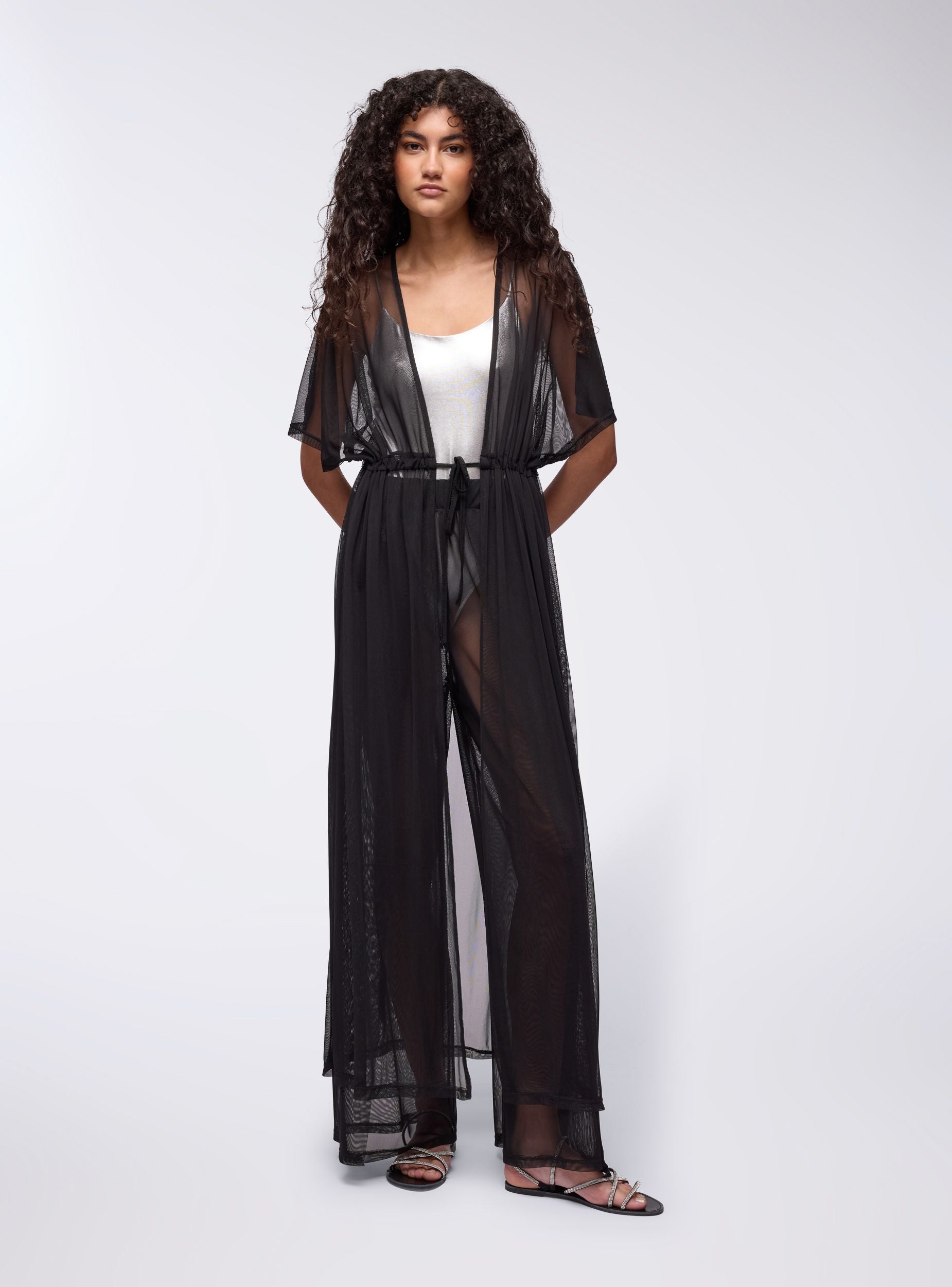 Дълго дамско къфтанче, перфектно за носене над бански костюм за елегантен и женствен плажен вид. Полупрозрачният дизайн с широки ръкави и свободен силует придава лекота и движение. Талията е подчертанa с регулируема връзка. Идеално за басейн, море или аперитив при залез с сандали и очила.