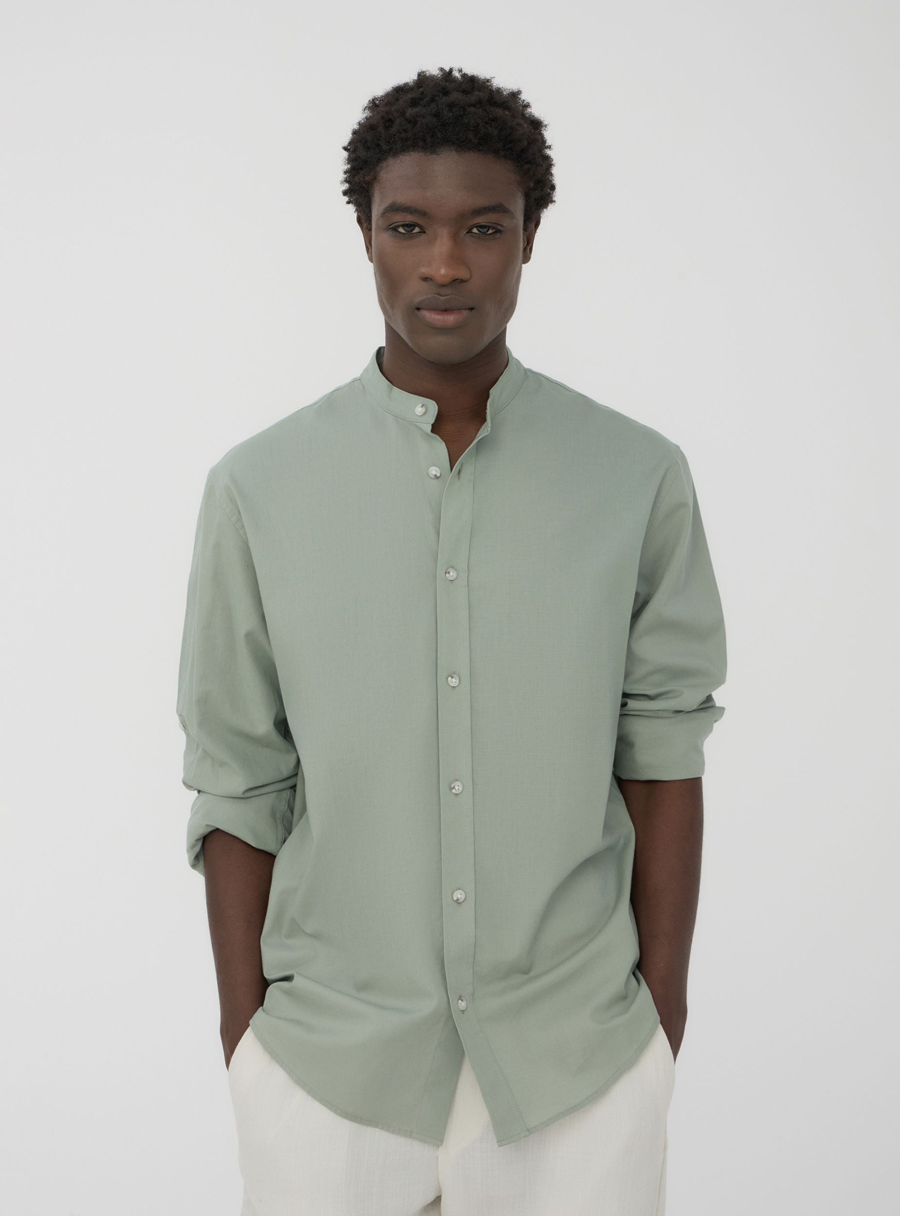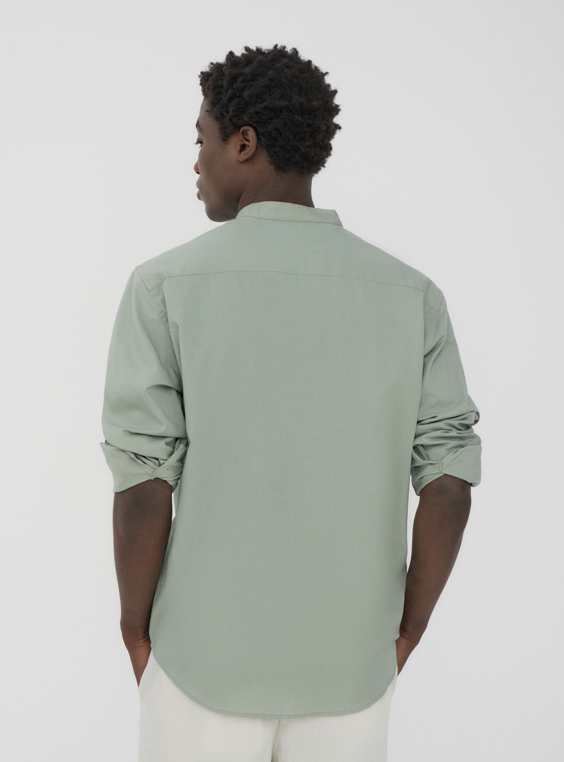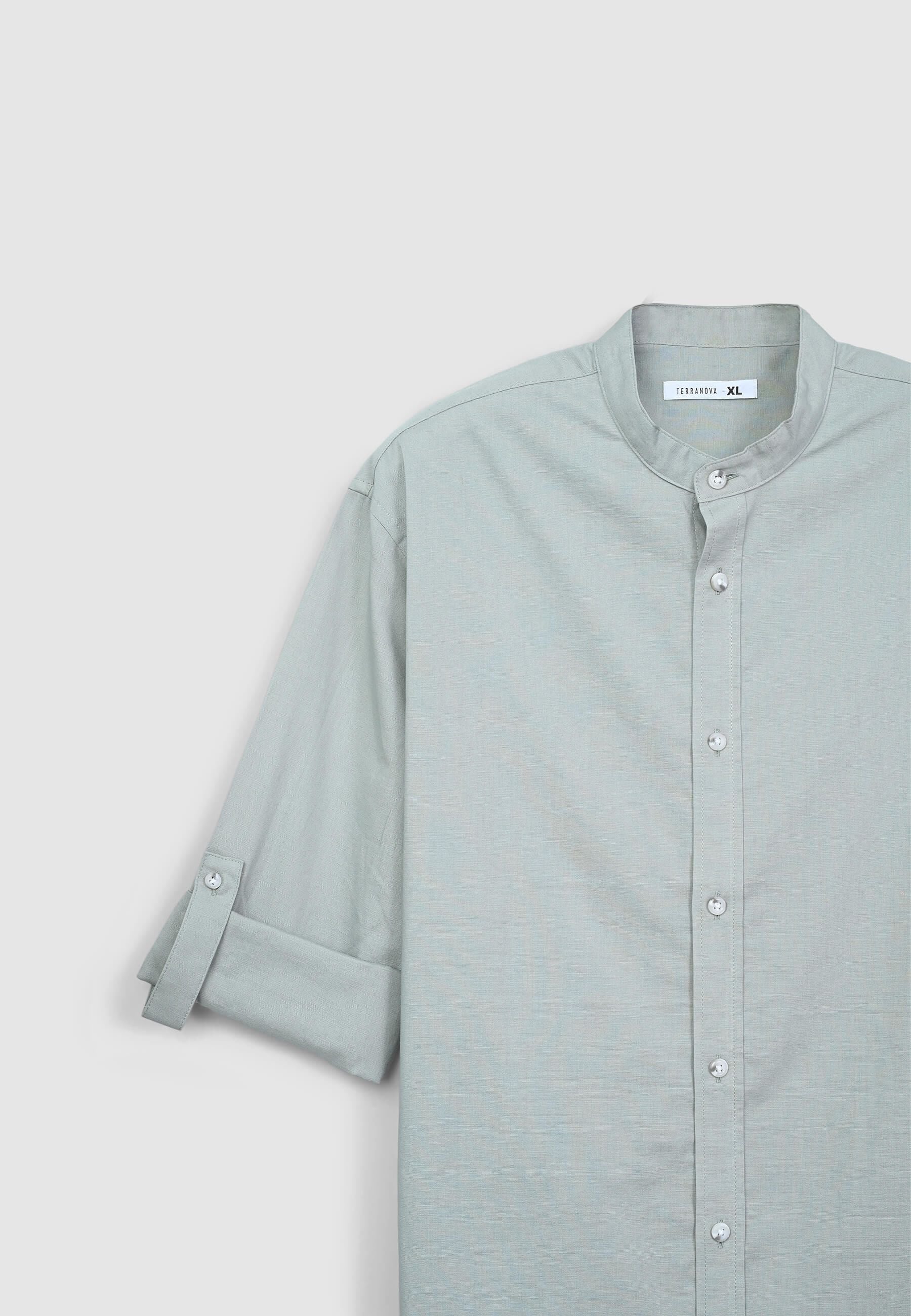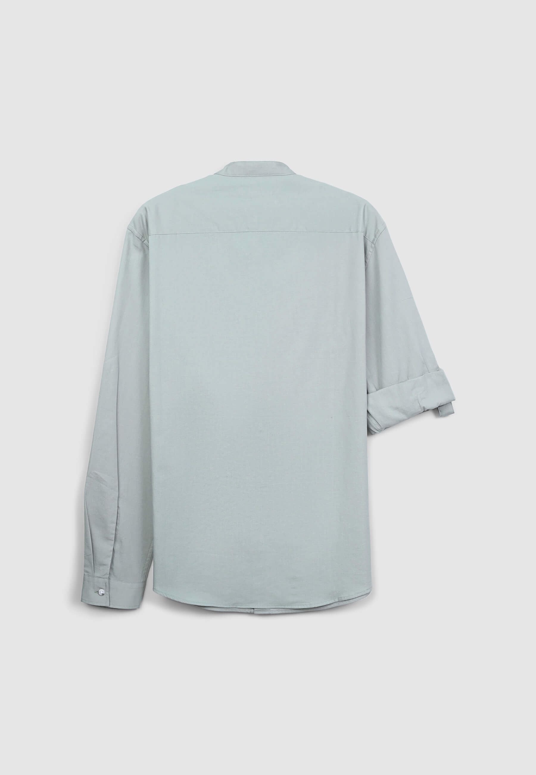 Мъжка риза от смесен лен, перфектна за летните дни благодарение на лекотата и дишащите си свойства. Този модел се отличава с корейския си яка, детайл, който придава модерен акцент на дизайна. Дългите ръкави са завършени с регулируеми маншети, а предната закопчалка с копчета добавя практичност и стил. Идеална за небрежен, но внимателен вид, подходяща за множество поводи.Детайли
