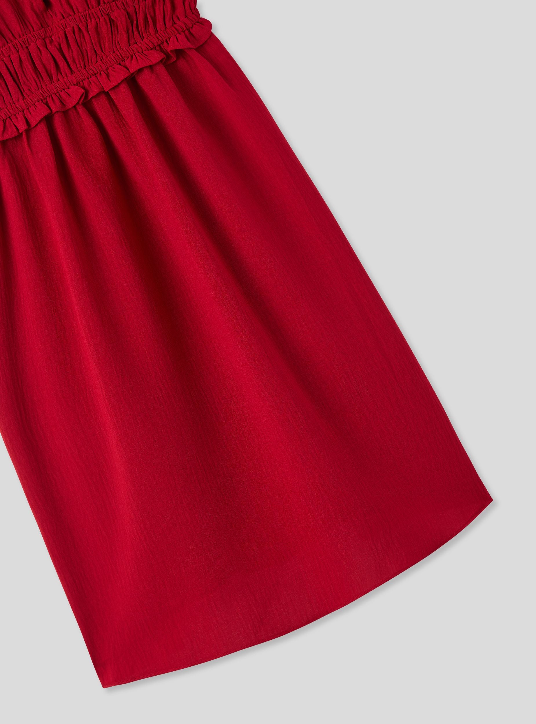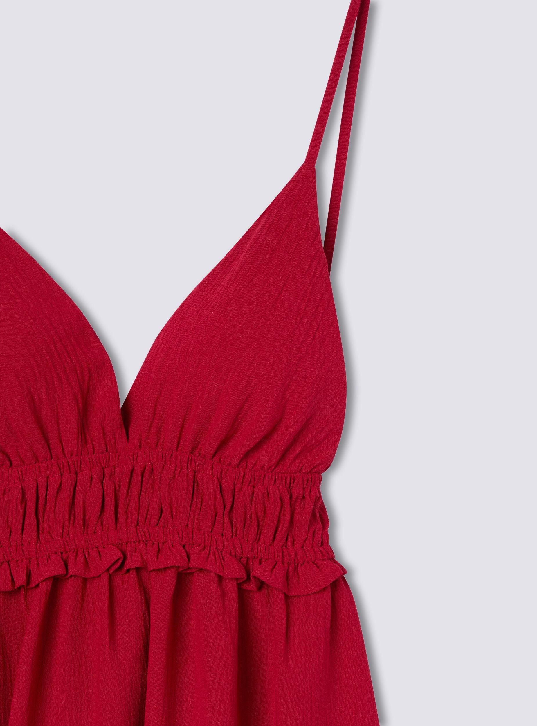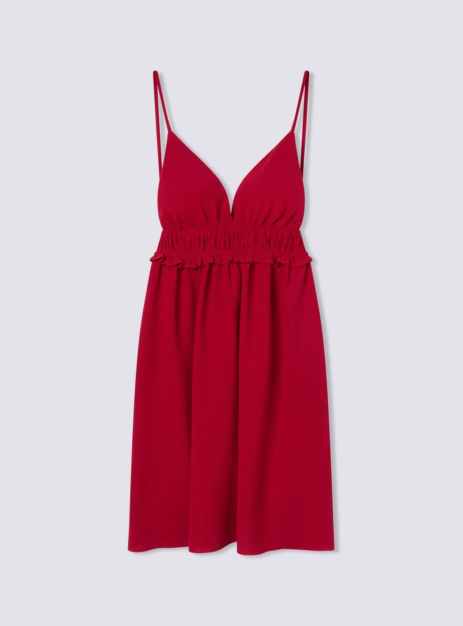 Дамска рокля с едноцветен дизайн, с къса силует и характеризираща се с модерен и женствен стил. Моделът разполага с тънки регулируеми презрамки, които позволяват персонализирано прилягане. Горната част е обогатена с вътрешни чашки, които предлагат подкрепа, докато деликатното набръчкване под бюста добавя изисканост, подчертавайки фигурата. Полата пада нежно, създавайки лек и ефирен ефект, идеален за летен и неформален вид. Перфектна за тези, които търсят универсален артикул, съчетаващ елегантност и комфорт.