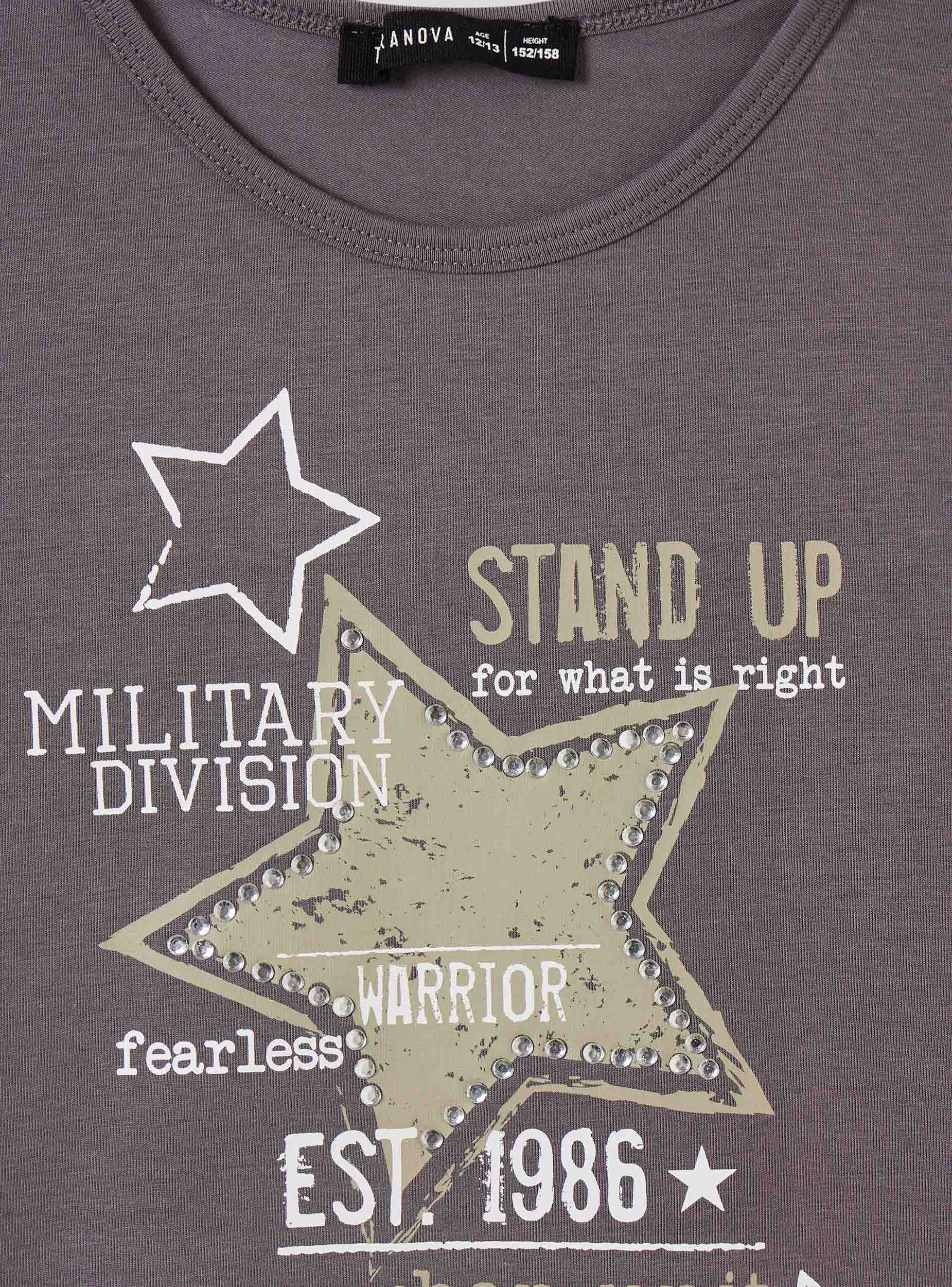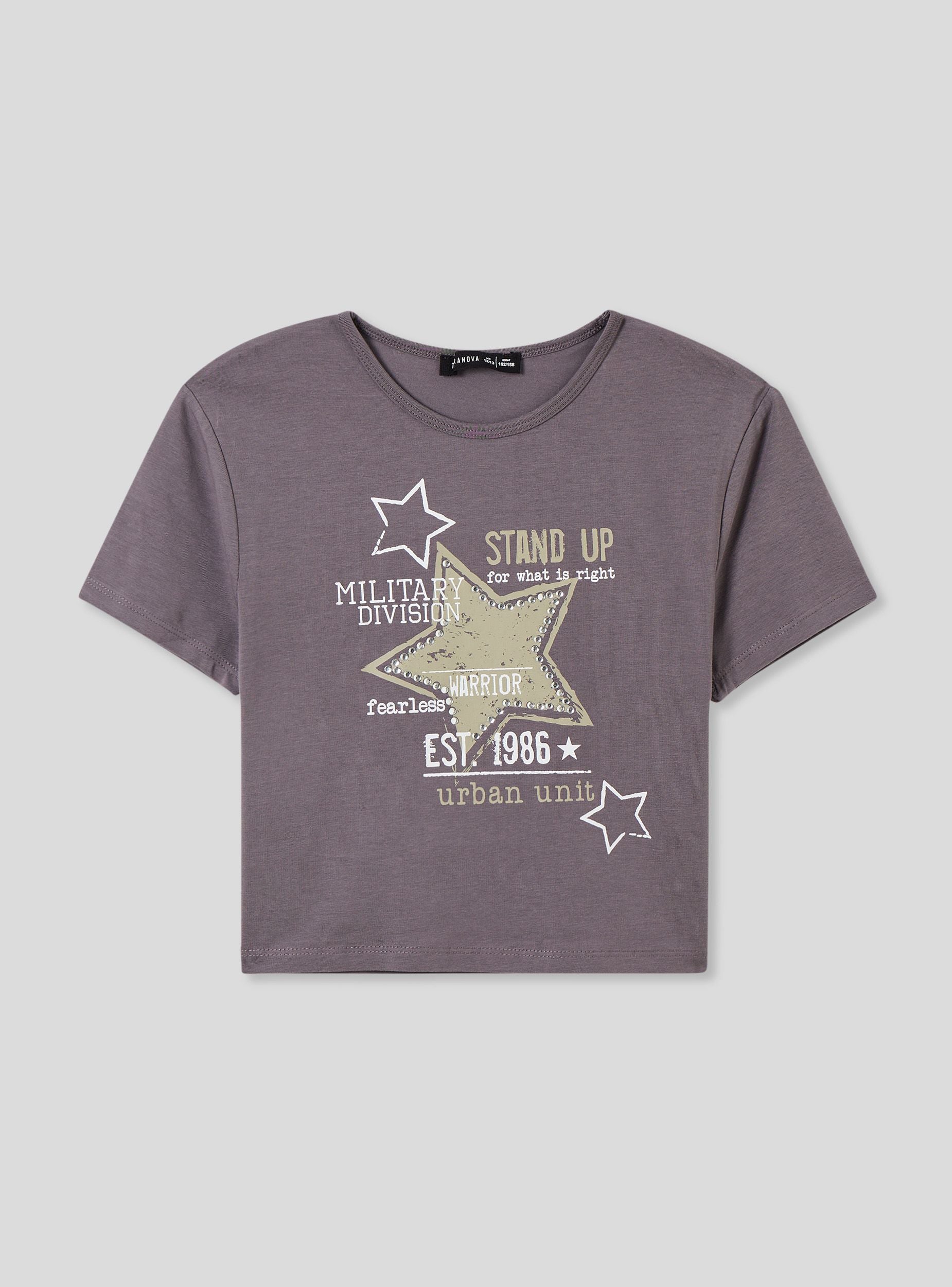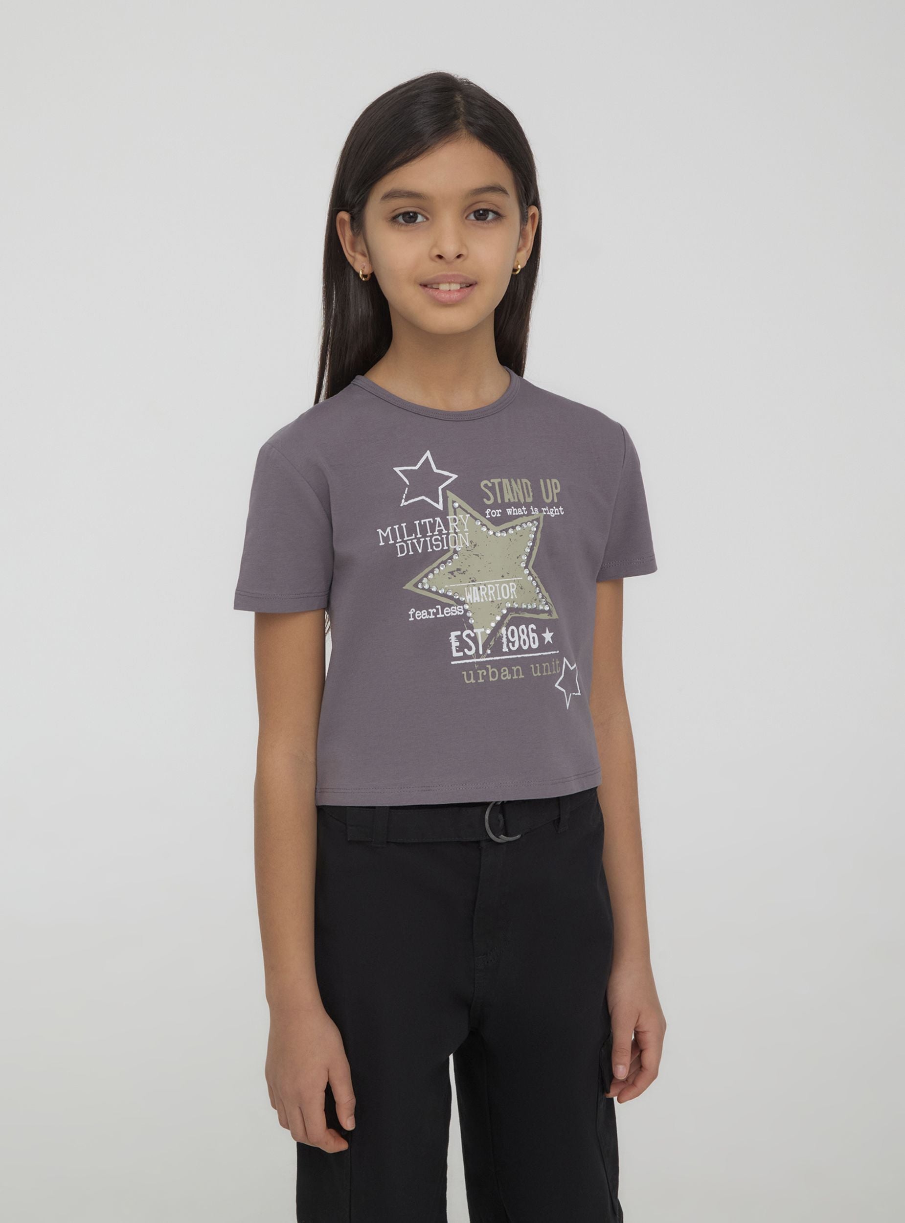 Идеална детска тениска за урбан и оригинален вид, перфектна за свободното време и ежедневните дейности. С къси ръкави и кръгло деколте, тя се отличава с военен принт, обогатен с надписи, звезди и блестящи детайли от страз. Кроп дизайнът придава модерен акцент на изделието.Детайли