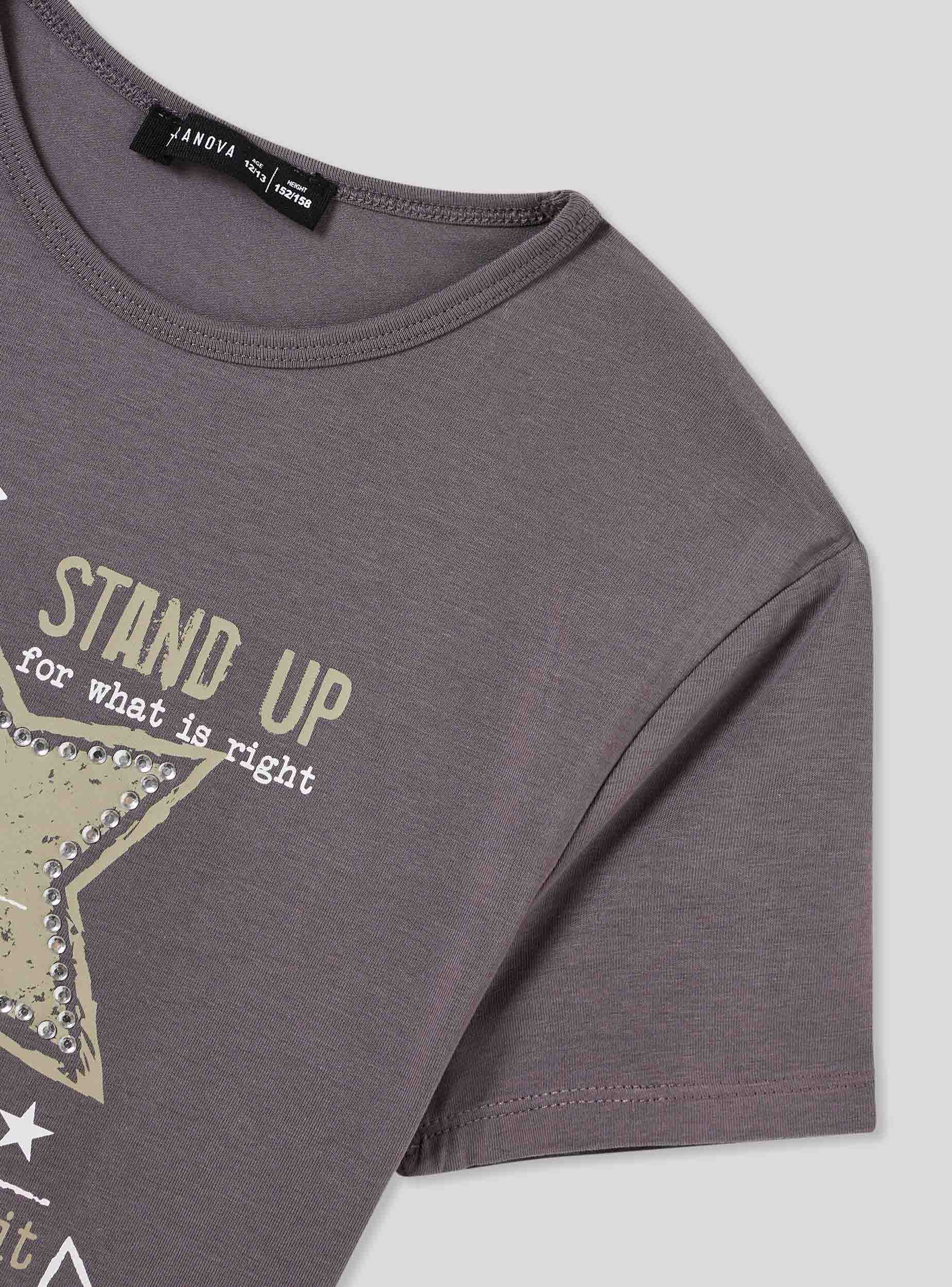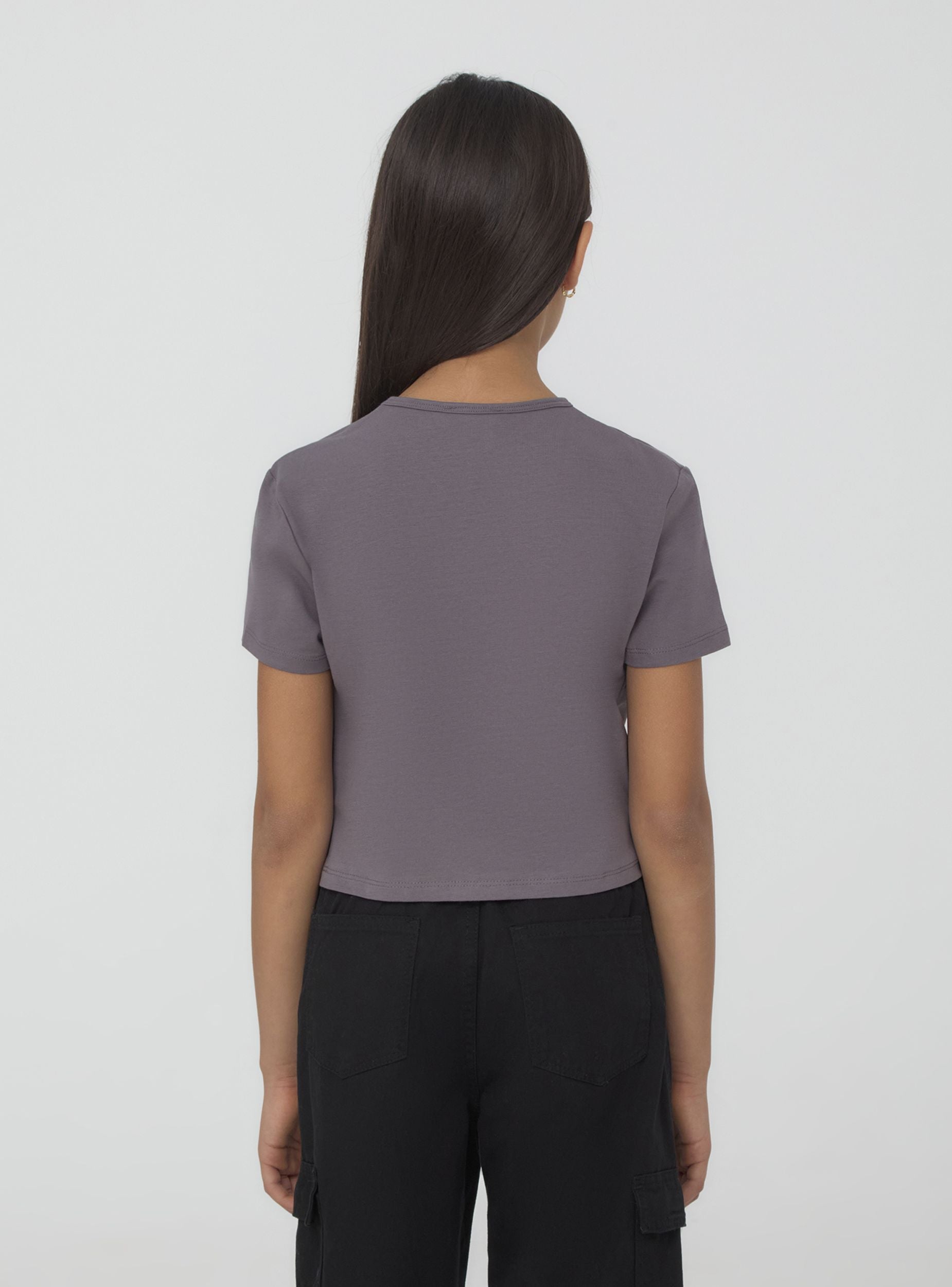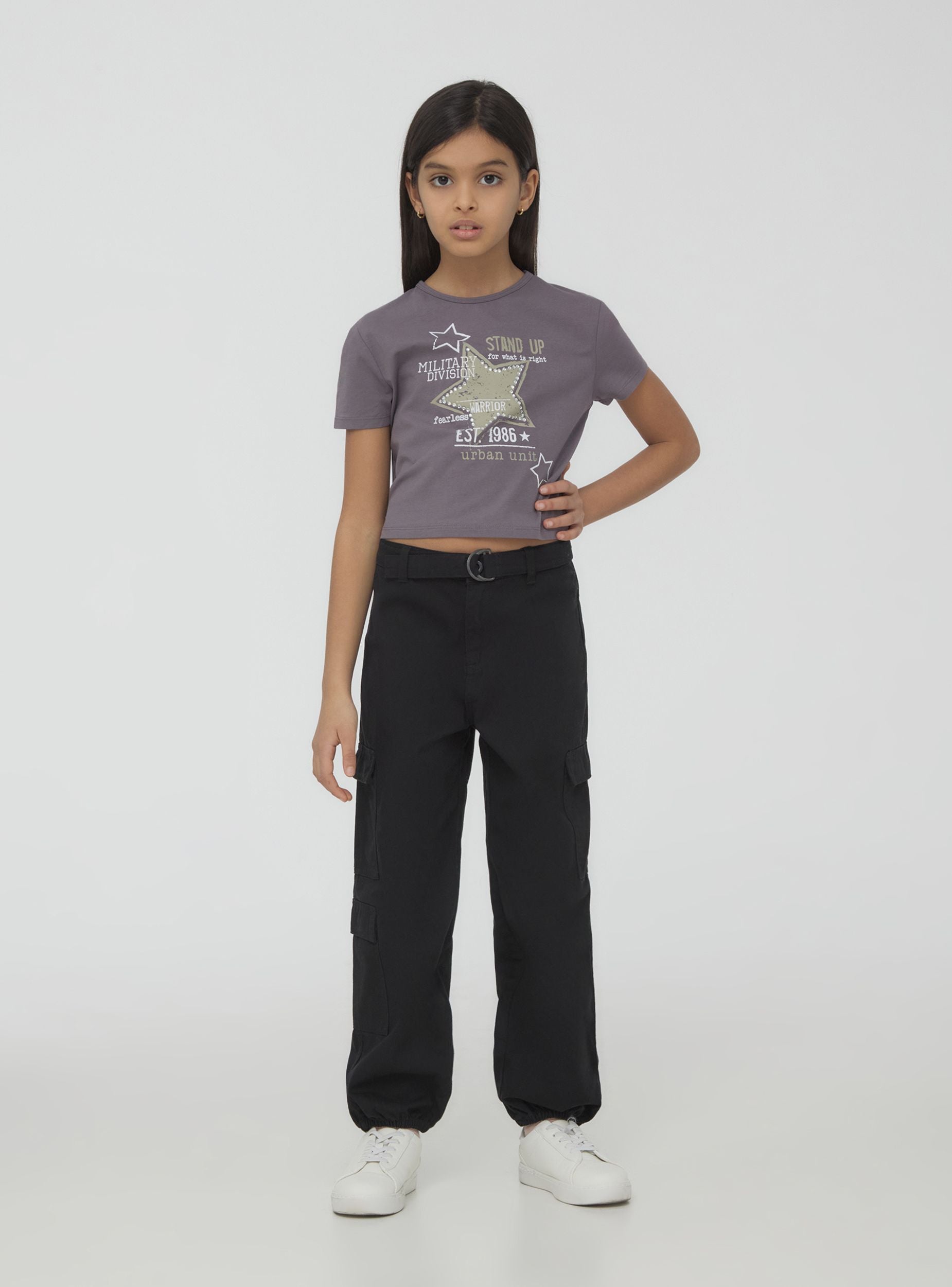 Идеална детска тениска за урбан и оригинален вид, перфектна за свободното време и ежедневните дейности. С къси ръкави и кръгло деколте, тя се отличава с военен принт, обогатен с надписи, звезди и блестящи детайли от страз. Кроп дизайнът придава модерен акцент на изделието.Детайли
