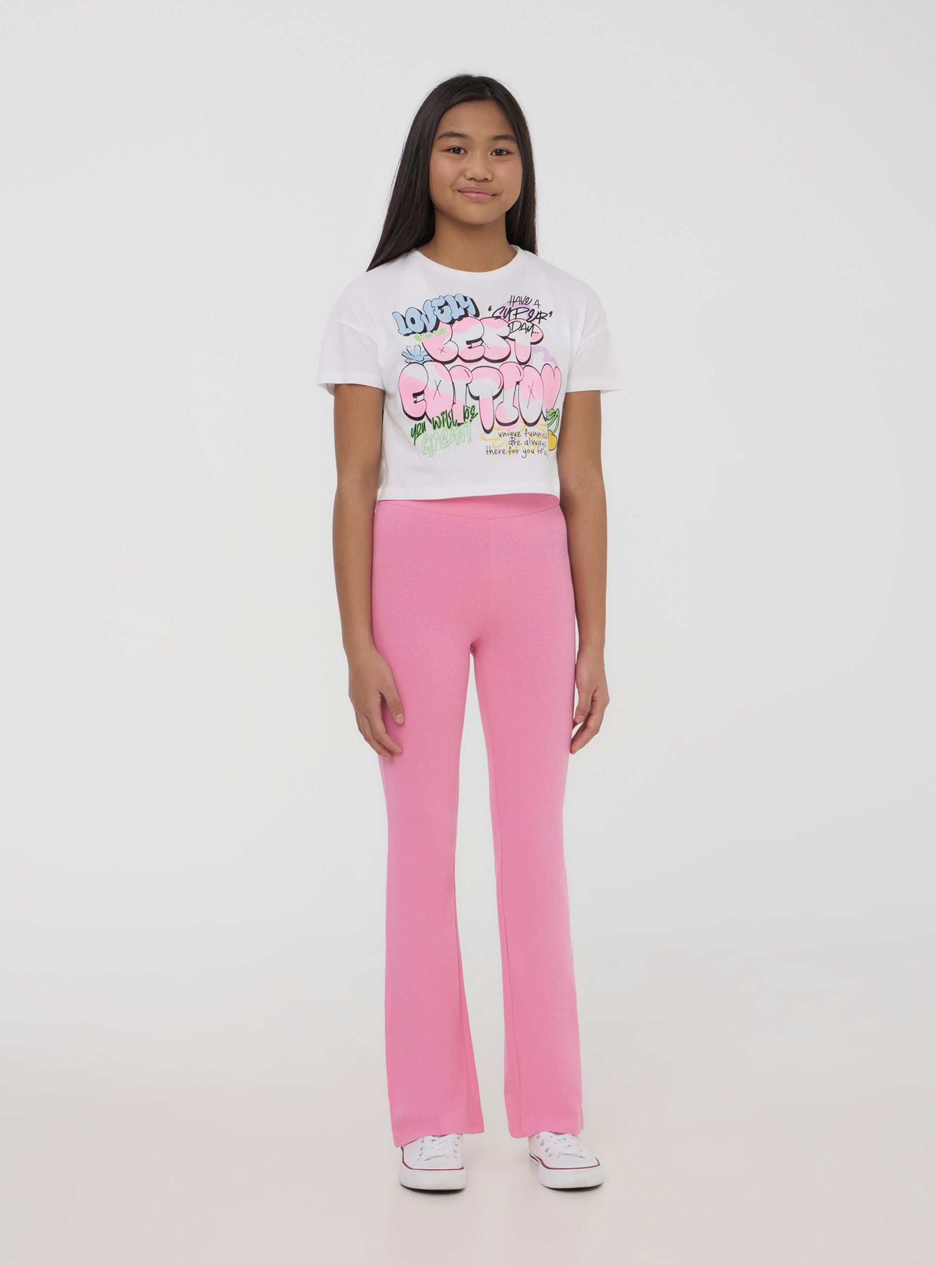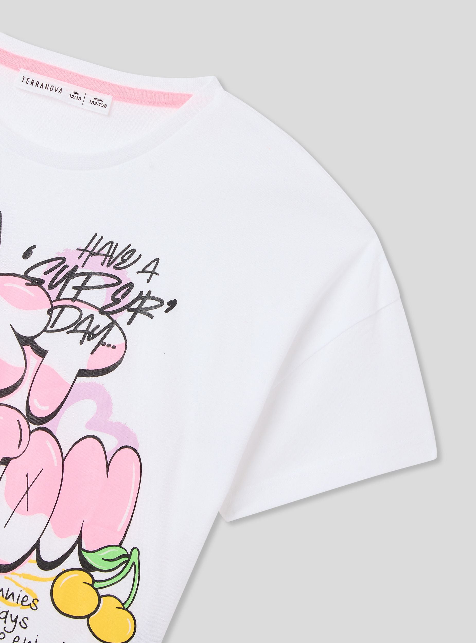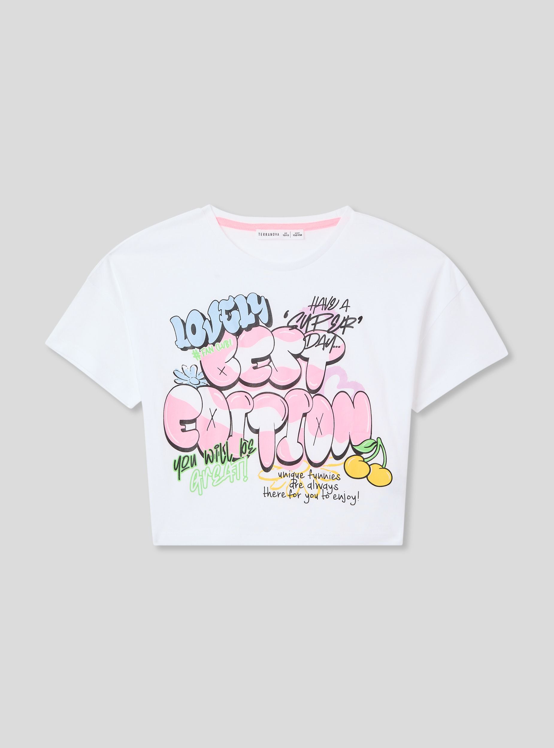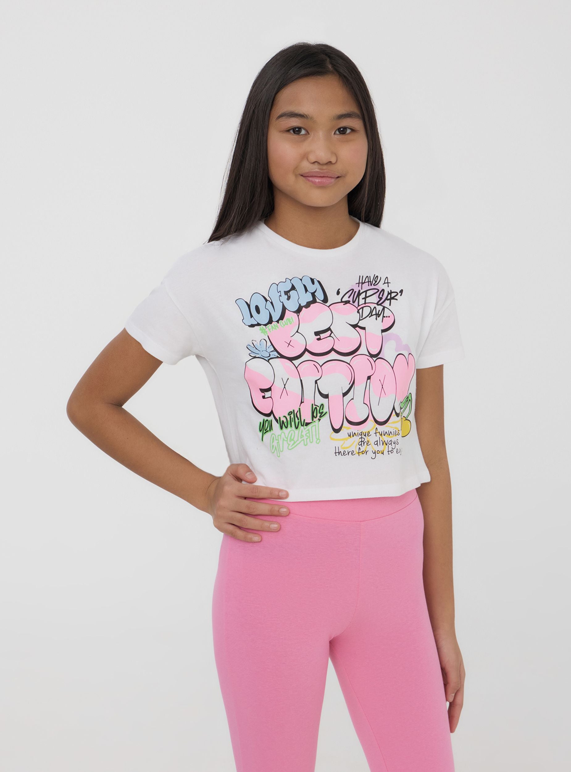 Тениска за момичета с къс дизайн, перфектна за небрежен и модерен вид. Разполага с ярък графити печат, който добавя градски и креативен акцент на изделието. Моделът е завършен с класически кръгъл врат и къси ръкави, предлагащи удобна и универсална кройка. Идеална за по-топлите дни, тази тениска лесно се съчетава с дънки или шорти за свеж и забавен аутфит.Детайли