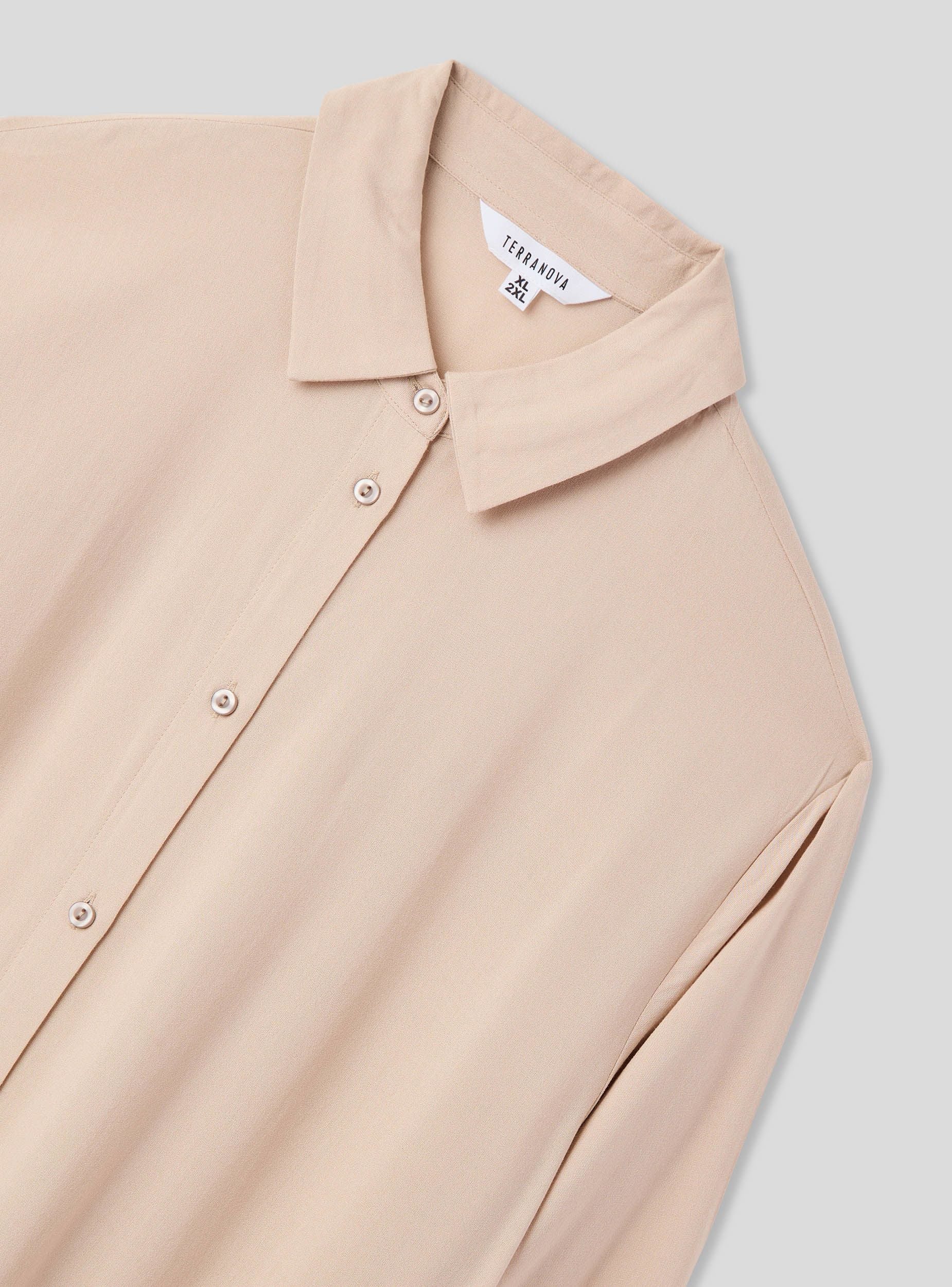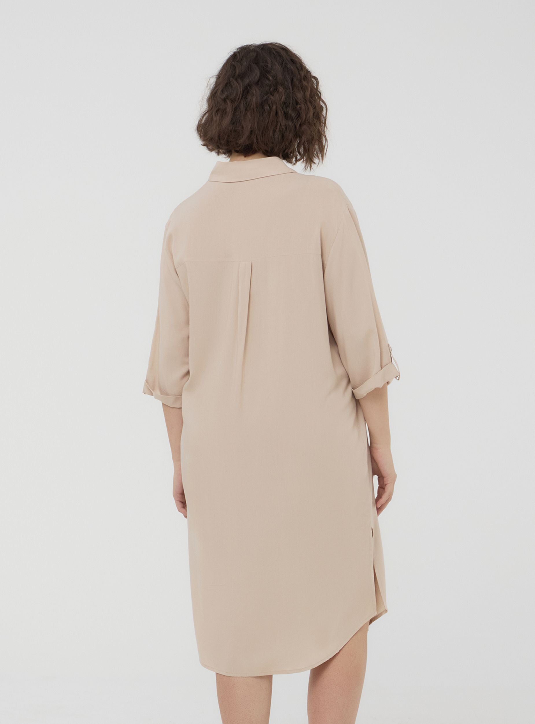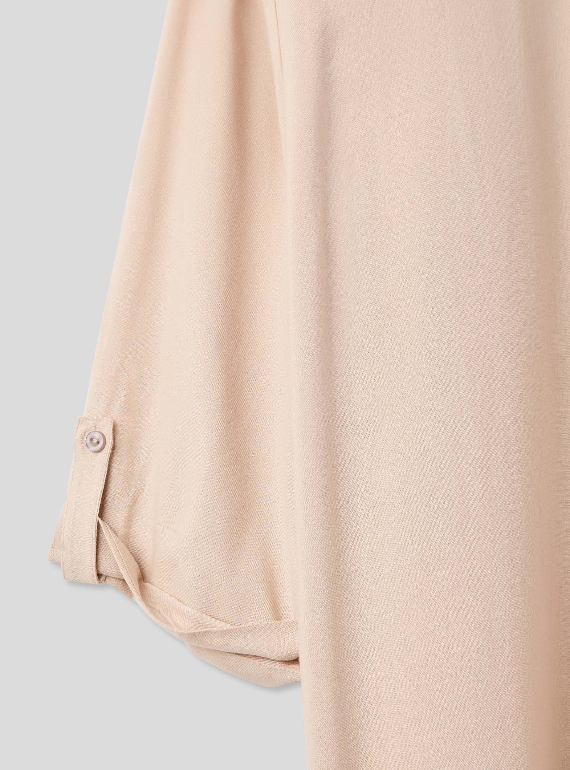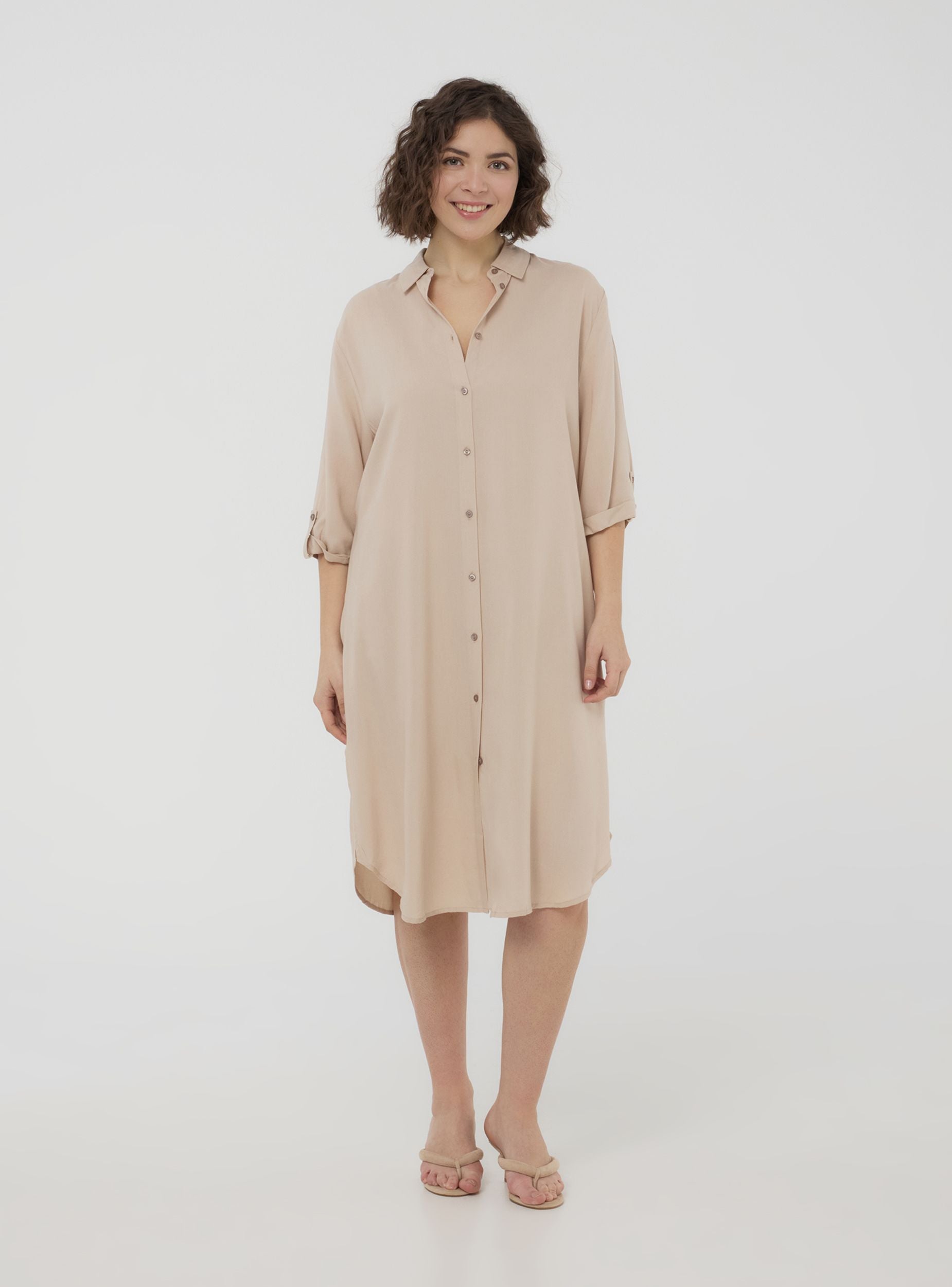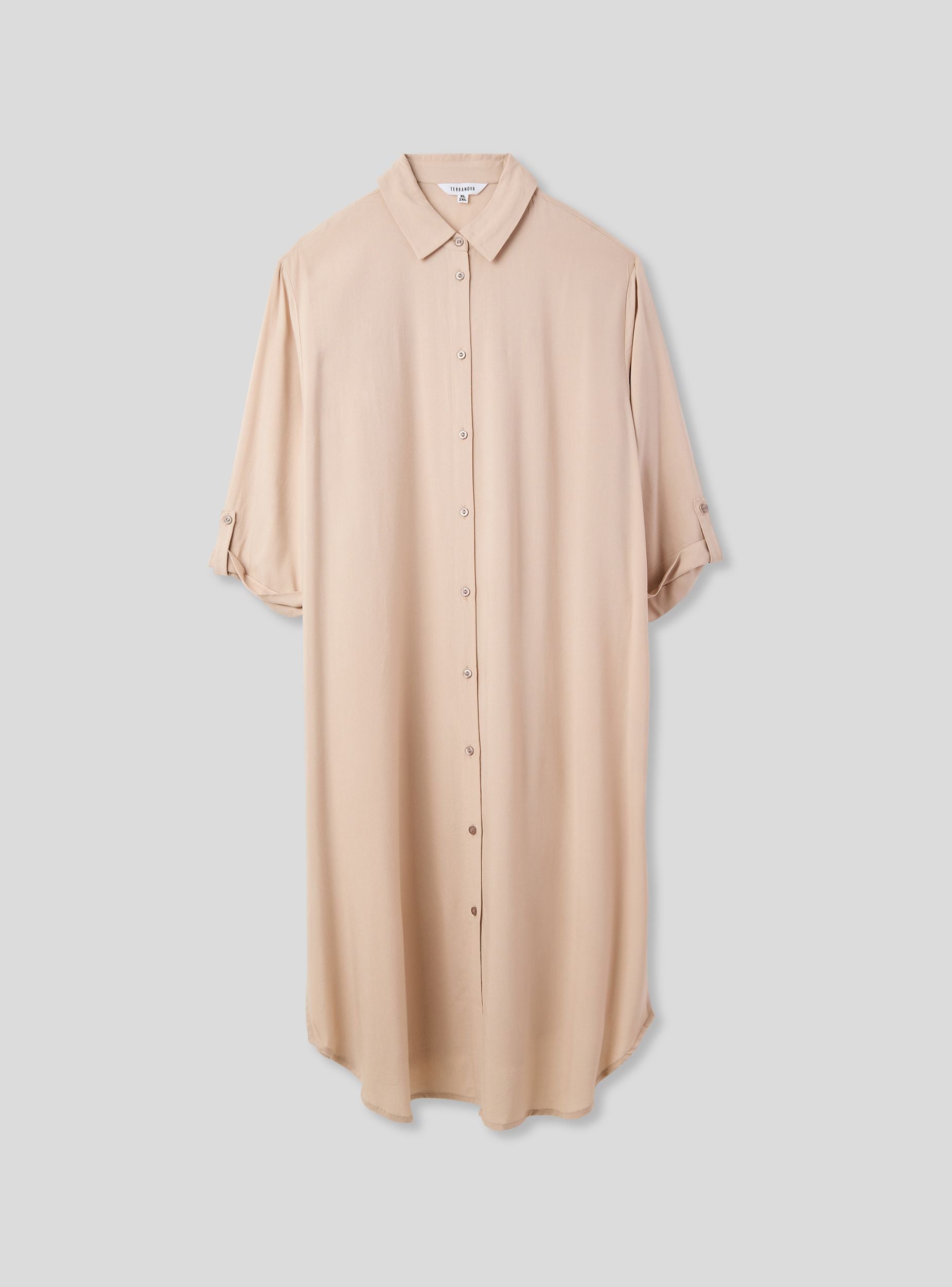 Макси дамска риза, характеризираща се с едноцветен дизайн, перфектна за ежедневен, но елегантен вид. Разполага с предна закопчалка с копчета, която преминава по цялата дължина на дрехата, добавяйки функционален и декоративен акцент. Ръкавите са с средна дължина за оптимален комфорт и универсален стил. Яката и широкият кройка придават небрежен вид, докато макси дължината добавя елегантност и покритие, правейки я идеална за различни поводи.Детайли