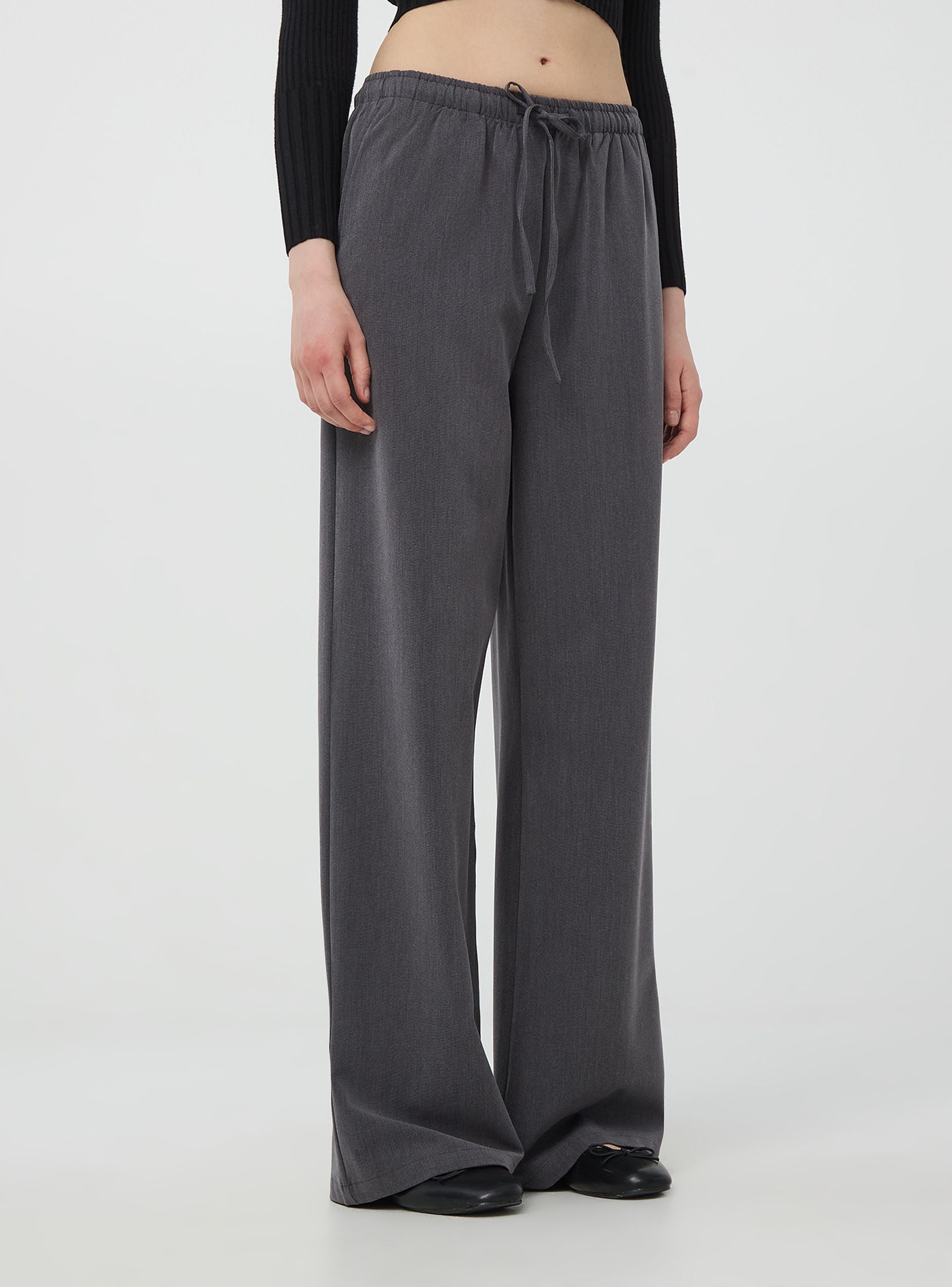 Панталони с широки крачоли с връзка от материя меланж