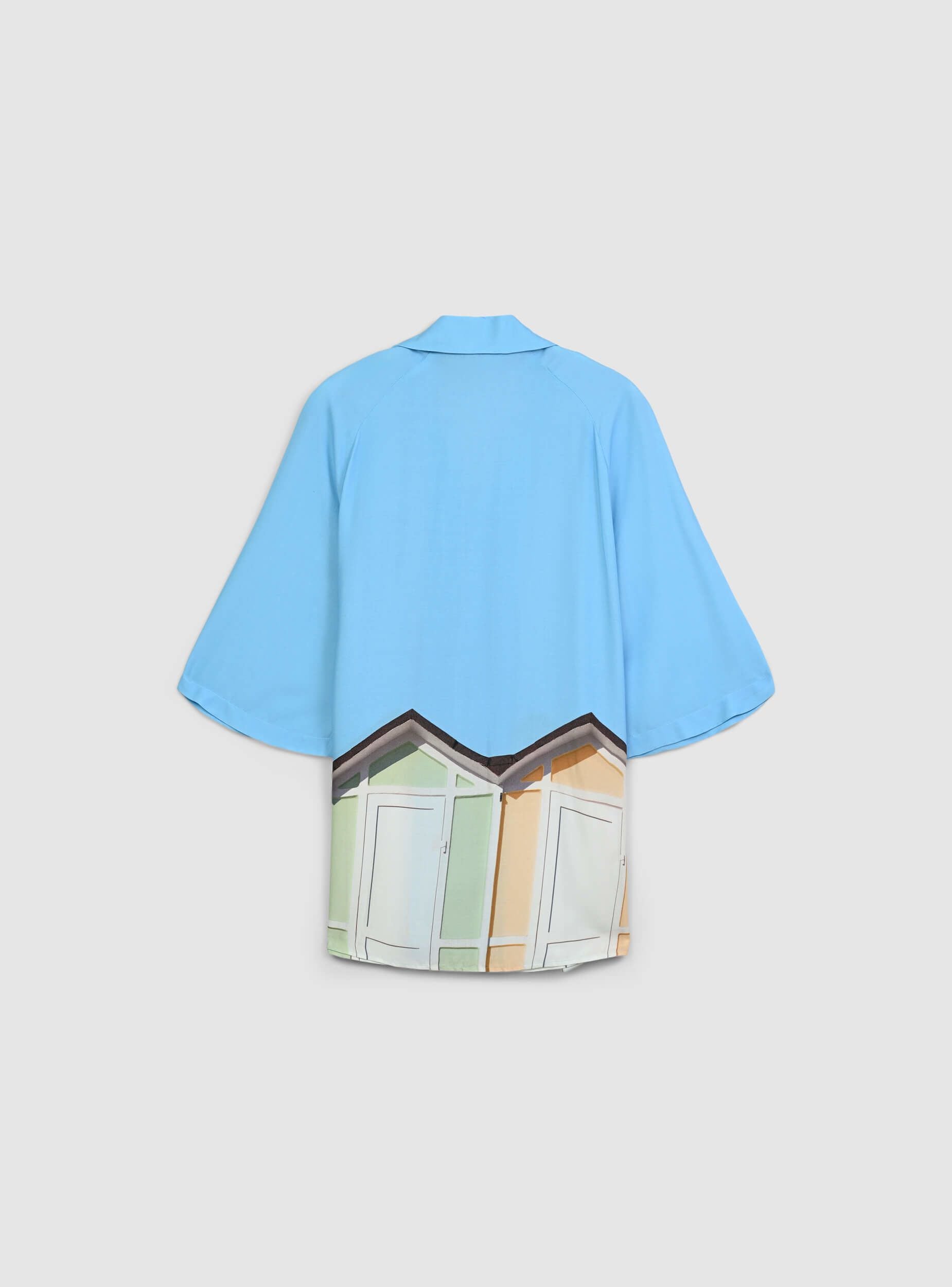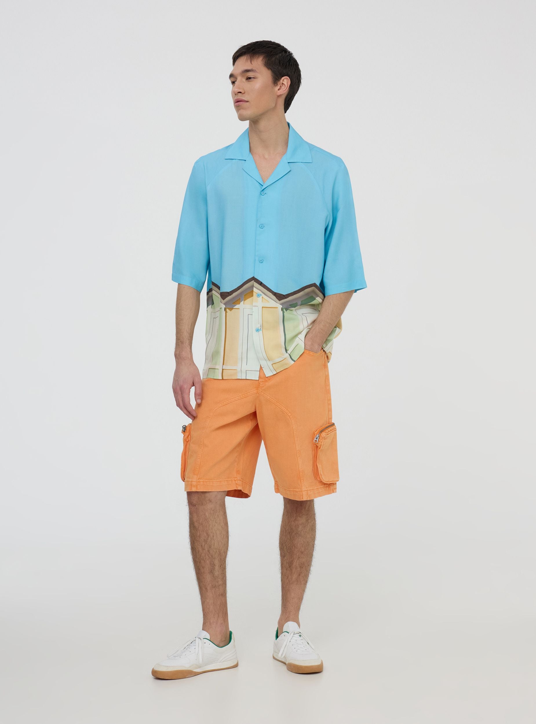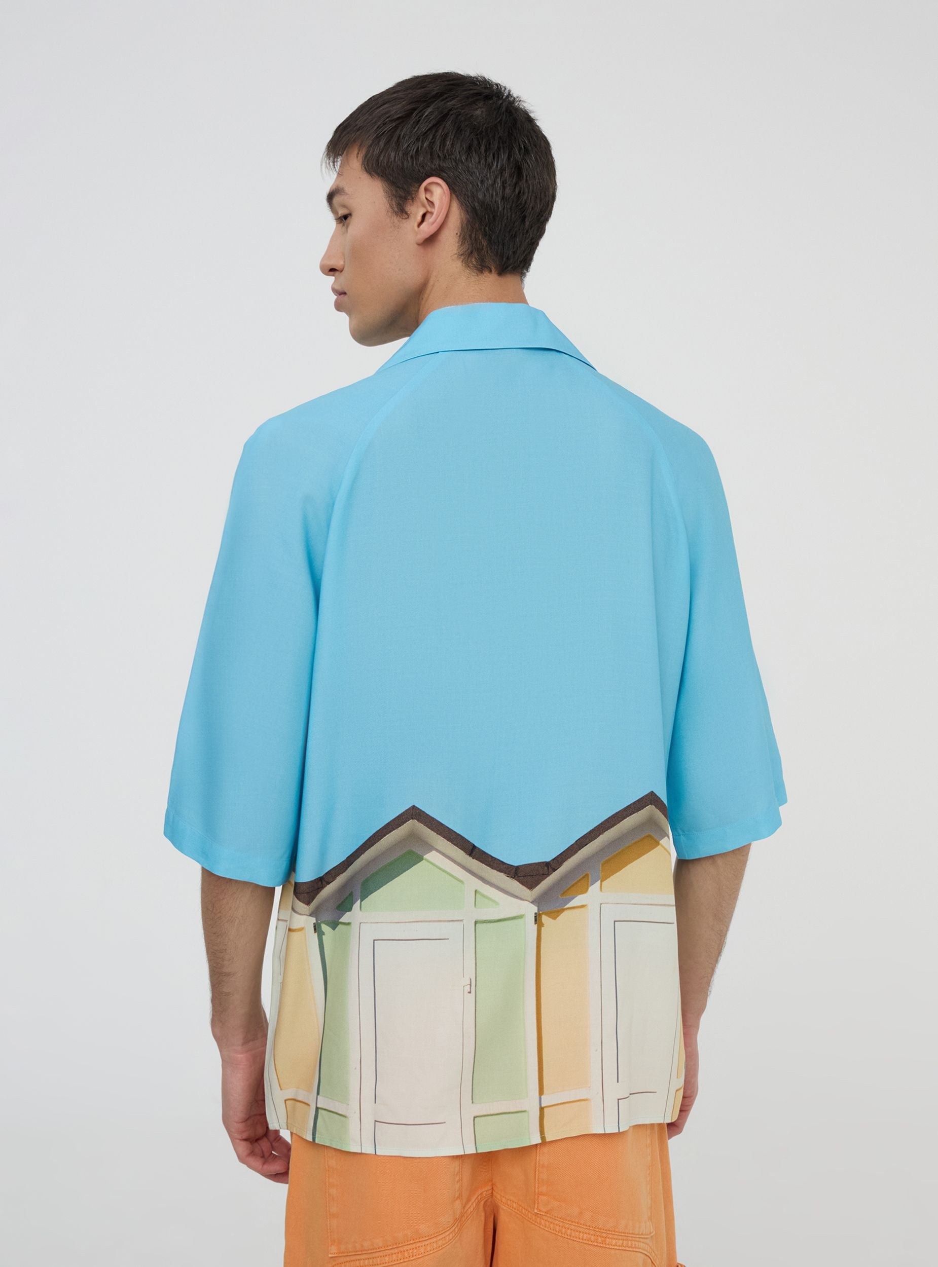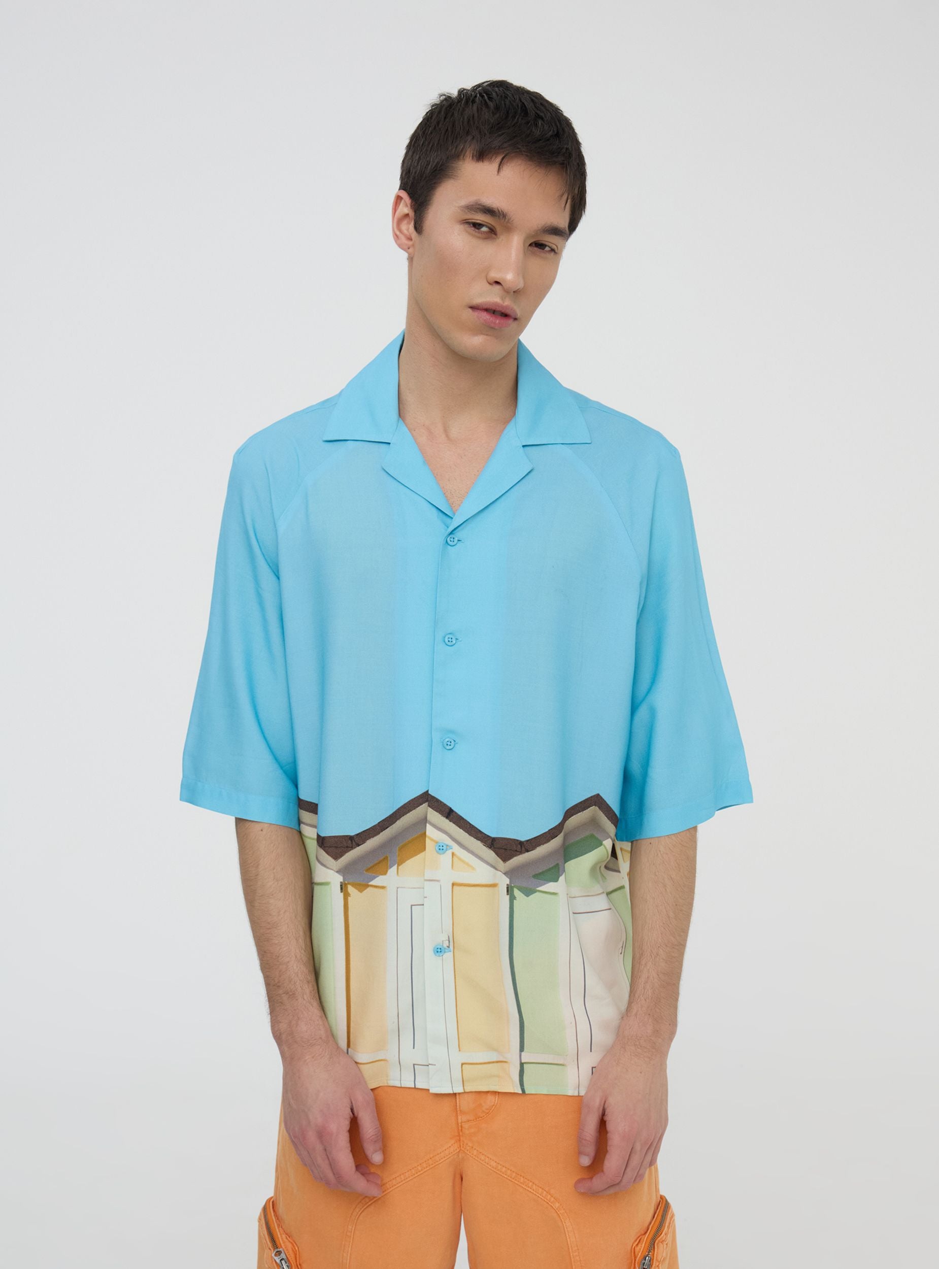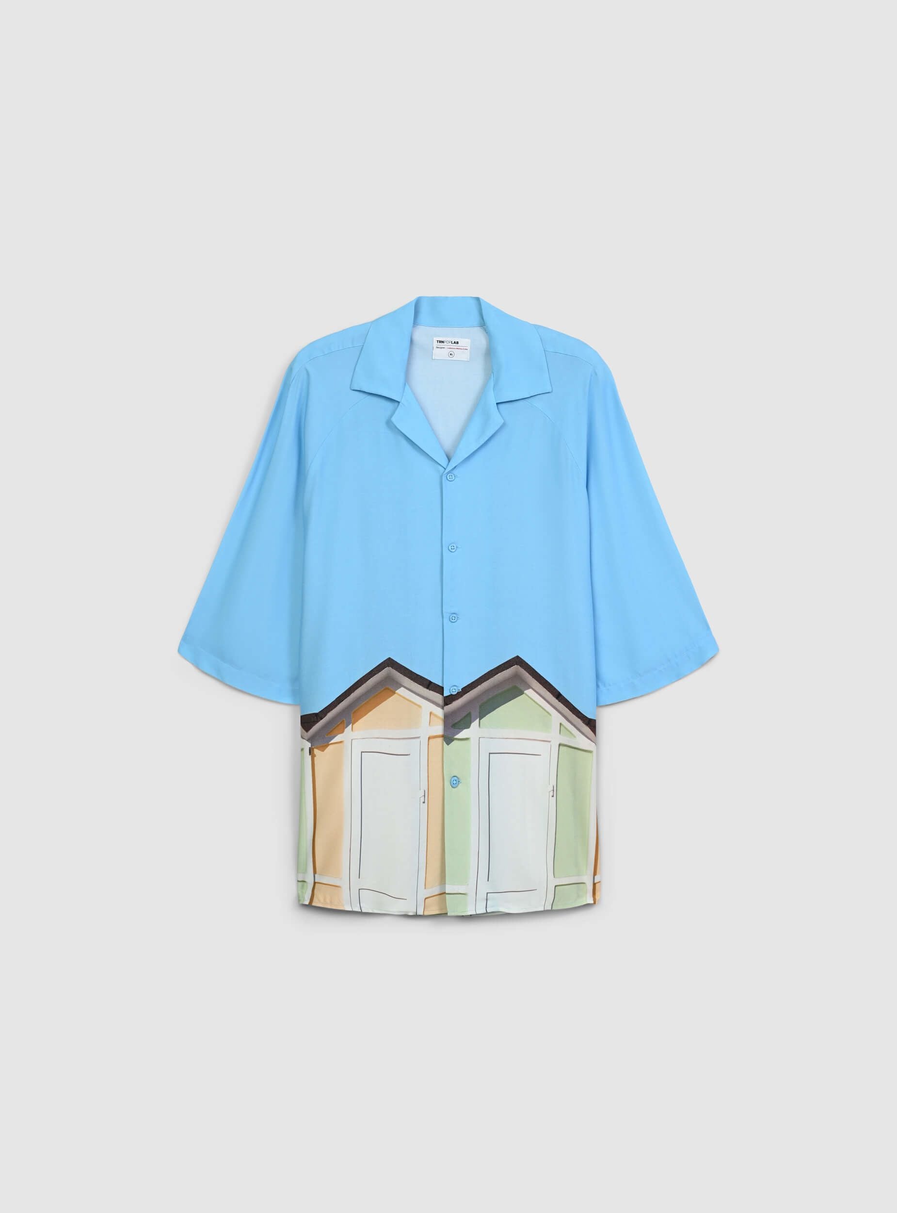 Мъжка риза с боулинг кройка, перфектна за тези, които обичат оригинален и релаксиран вид. Късите ръкави предлагат свежест, докато закопчаването с копчета добавя практичен и универсален детайл. Печатът с плажни кабини придава живо усещане и напомня за лятната атмосфера. Идеална за носене с бермуди или леки панталони, е перфектен избор за дни на открито или разходки по крайбрежието. Тази статия е част от проекта TRNPOPLAB, създаден в сътрудничество с NABA Милано. Студентите по моден дизайн създадоха колекции, вдъхновени от най-готините тенденции в момента. И сега ще видят своите творения да оживяват и да достигат директно до вашите ръце!