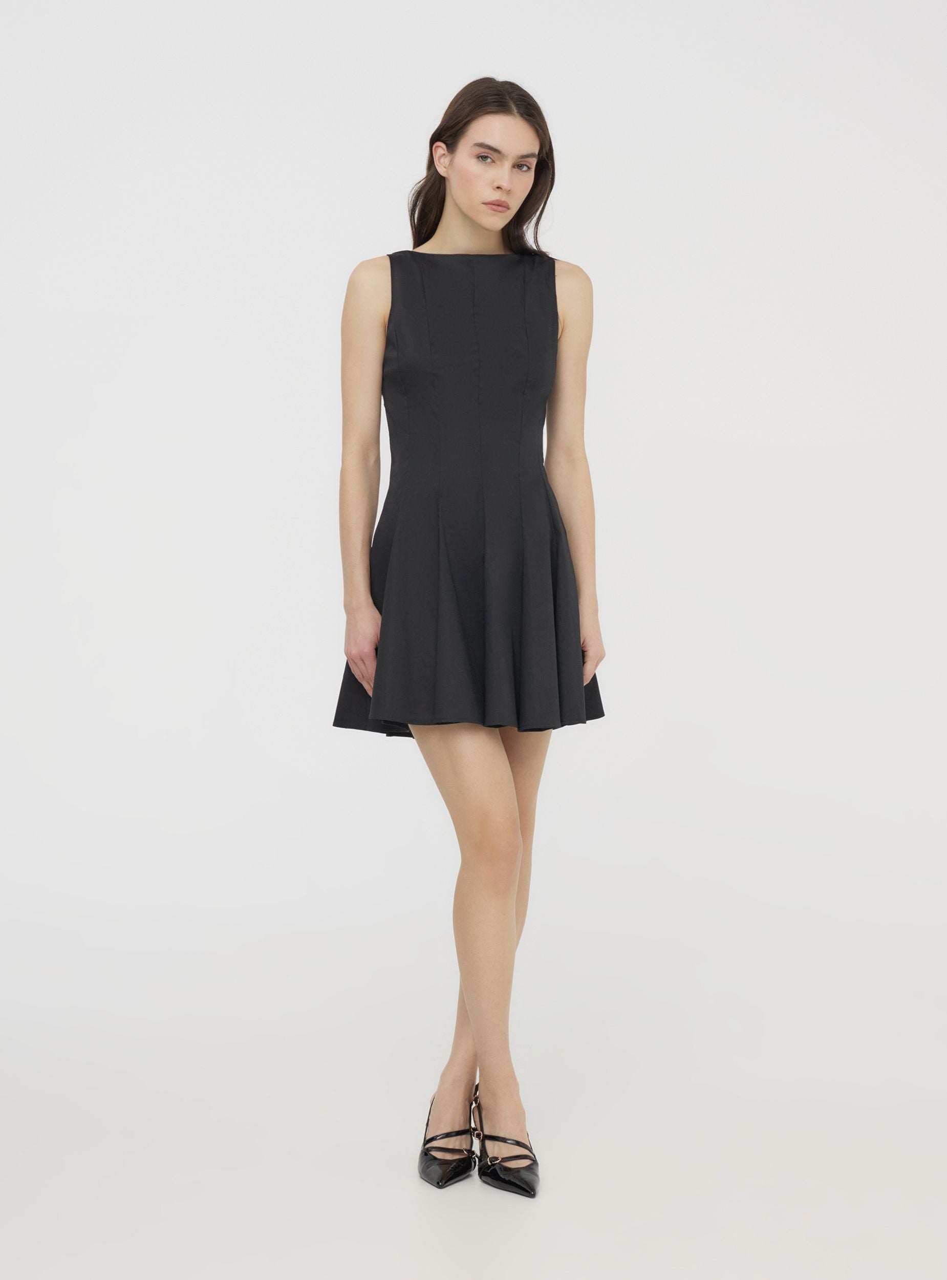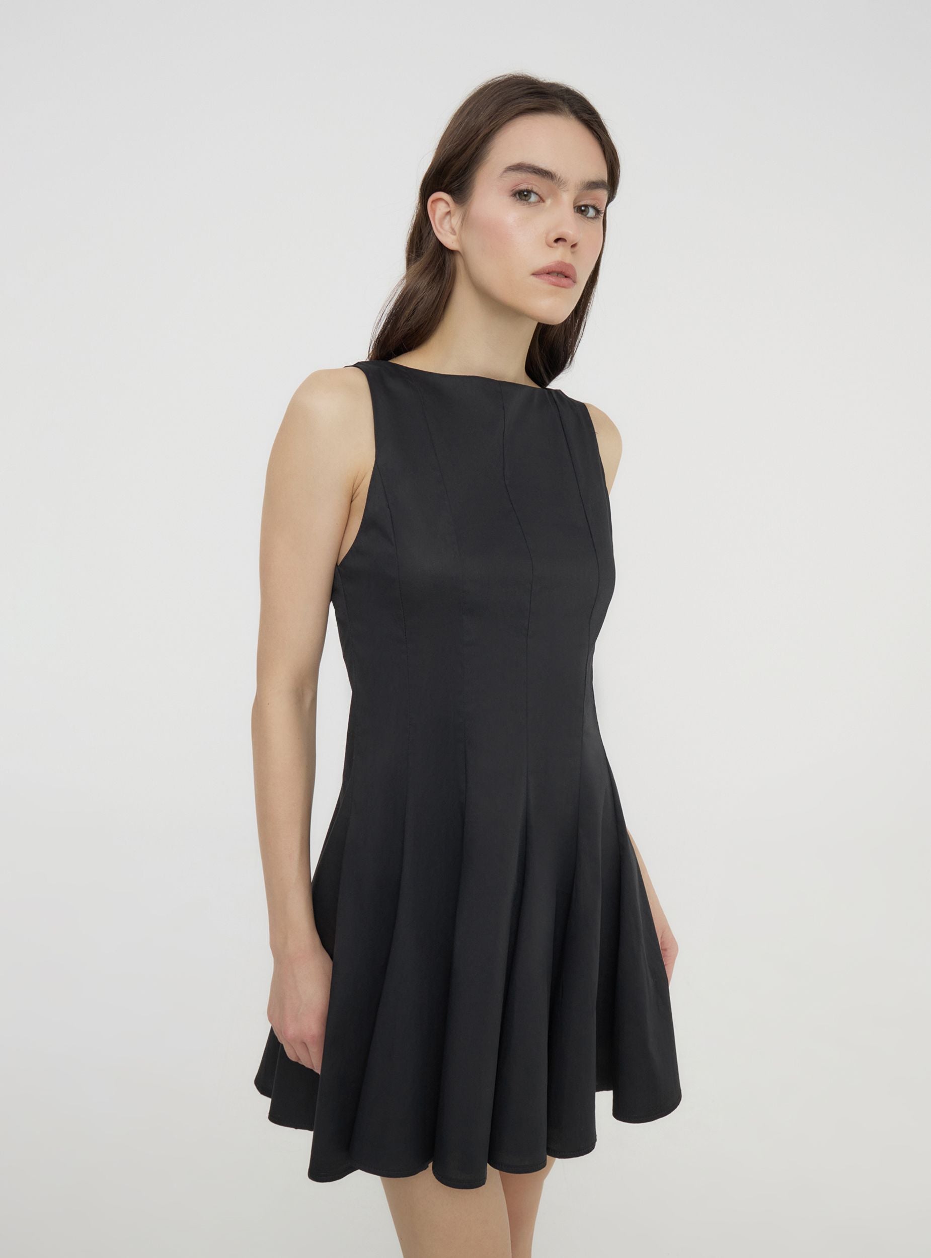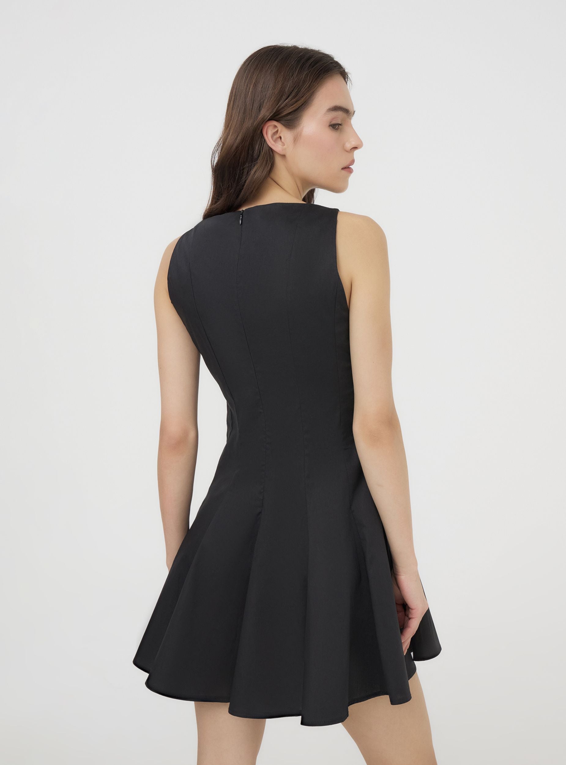 Къса рокля без ръкави за жени, перфектна за вечерни събития, коктейли или летни дни. Едноцветният цвят я прави изключително универсална, лесна за комбиниране с елегантни сандали или маратонки за по-небрежен вид. Закопчаването с цип отзад осигурява перфектно прилягане, докато разкроената кройка на полата добавя обем и динамика, създавайки плавен ефект, който подчертава силуета с елегантност.Детайли