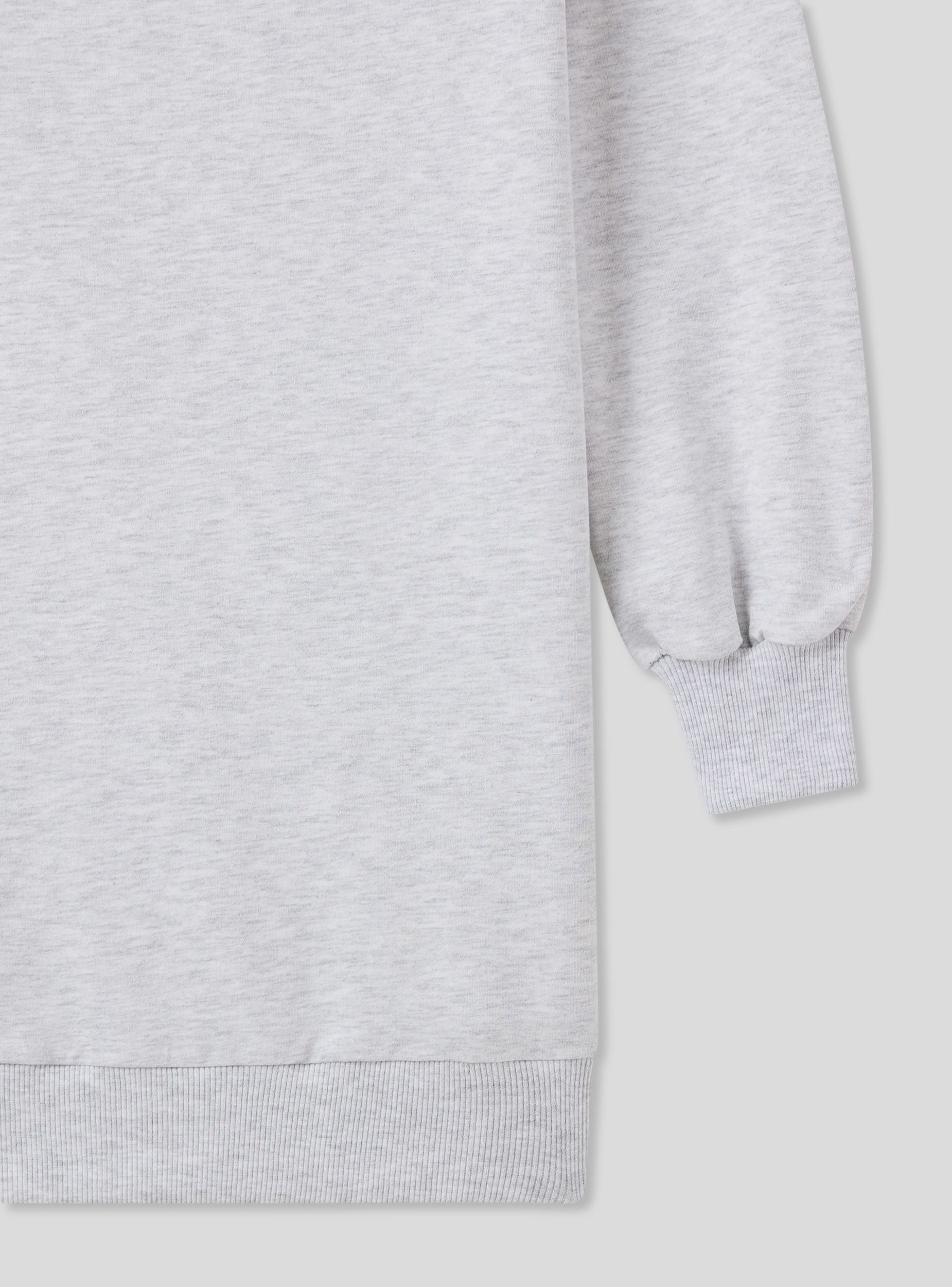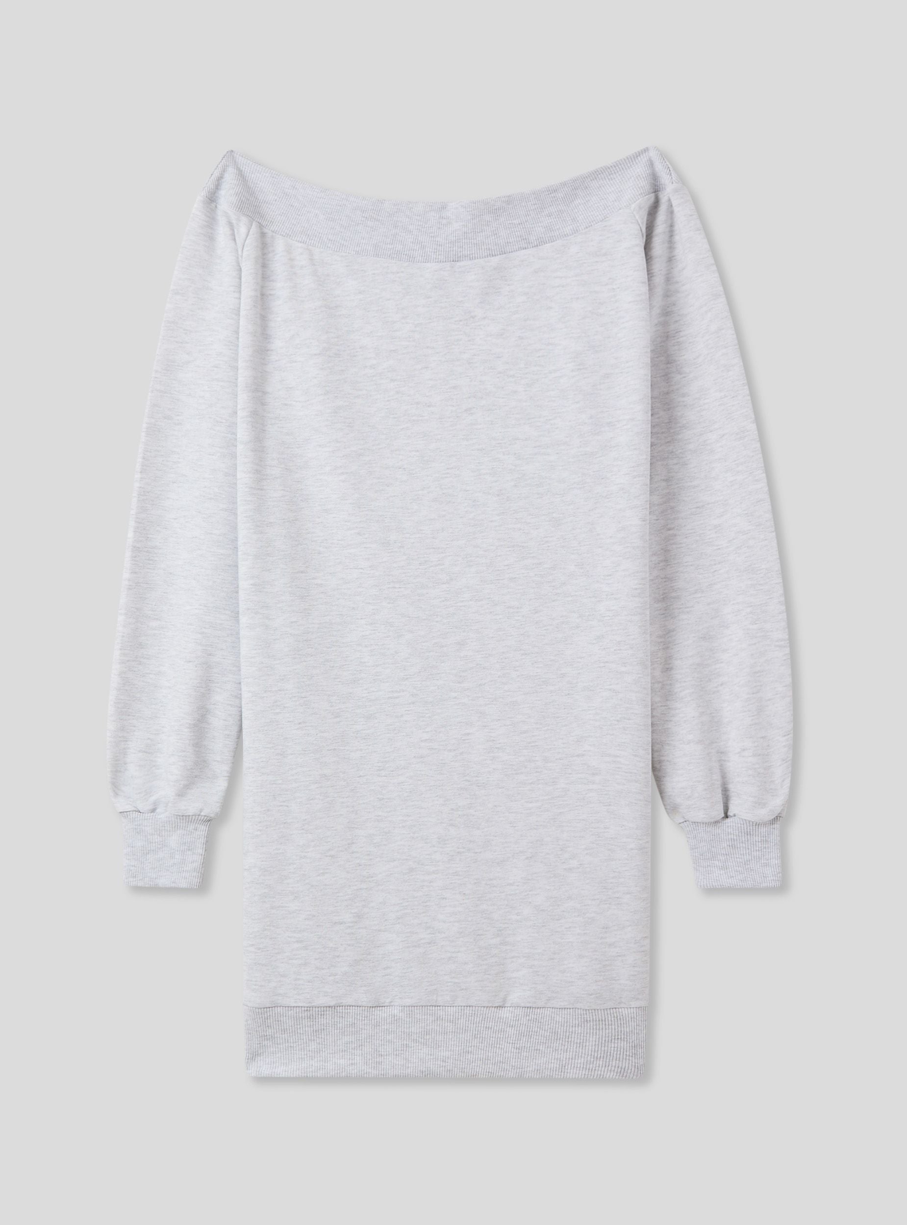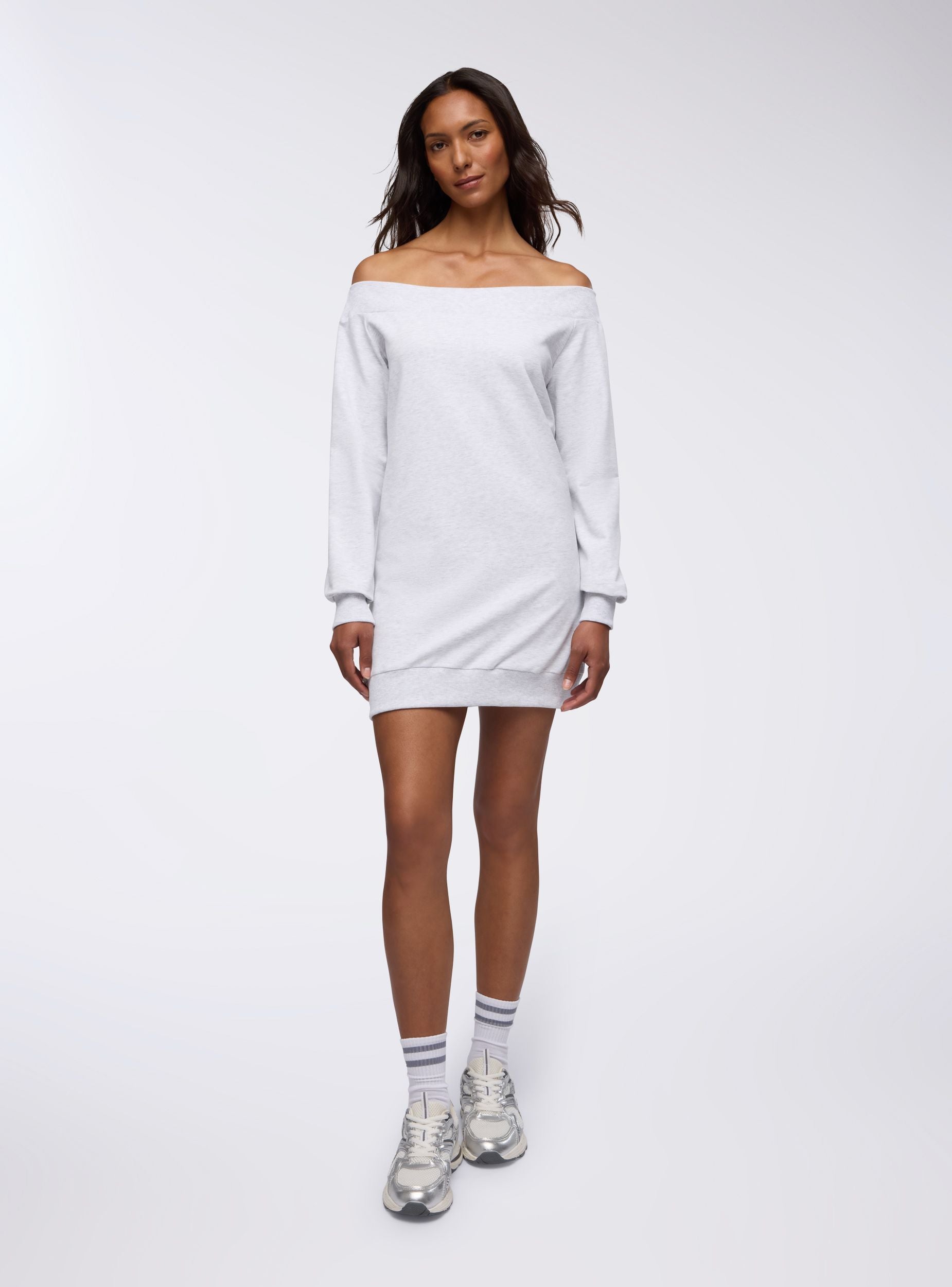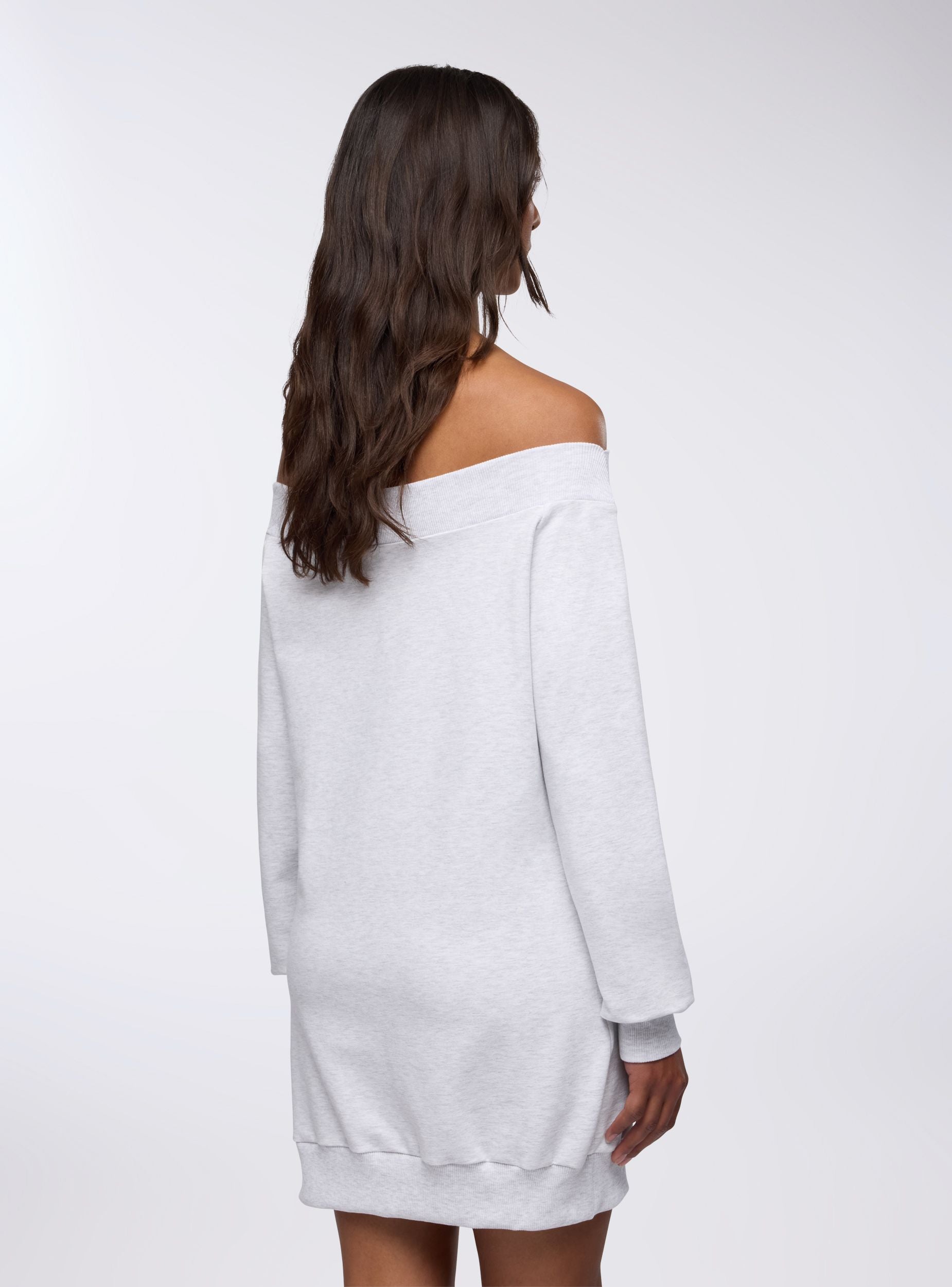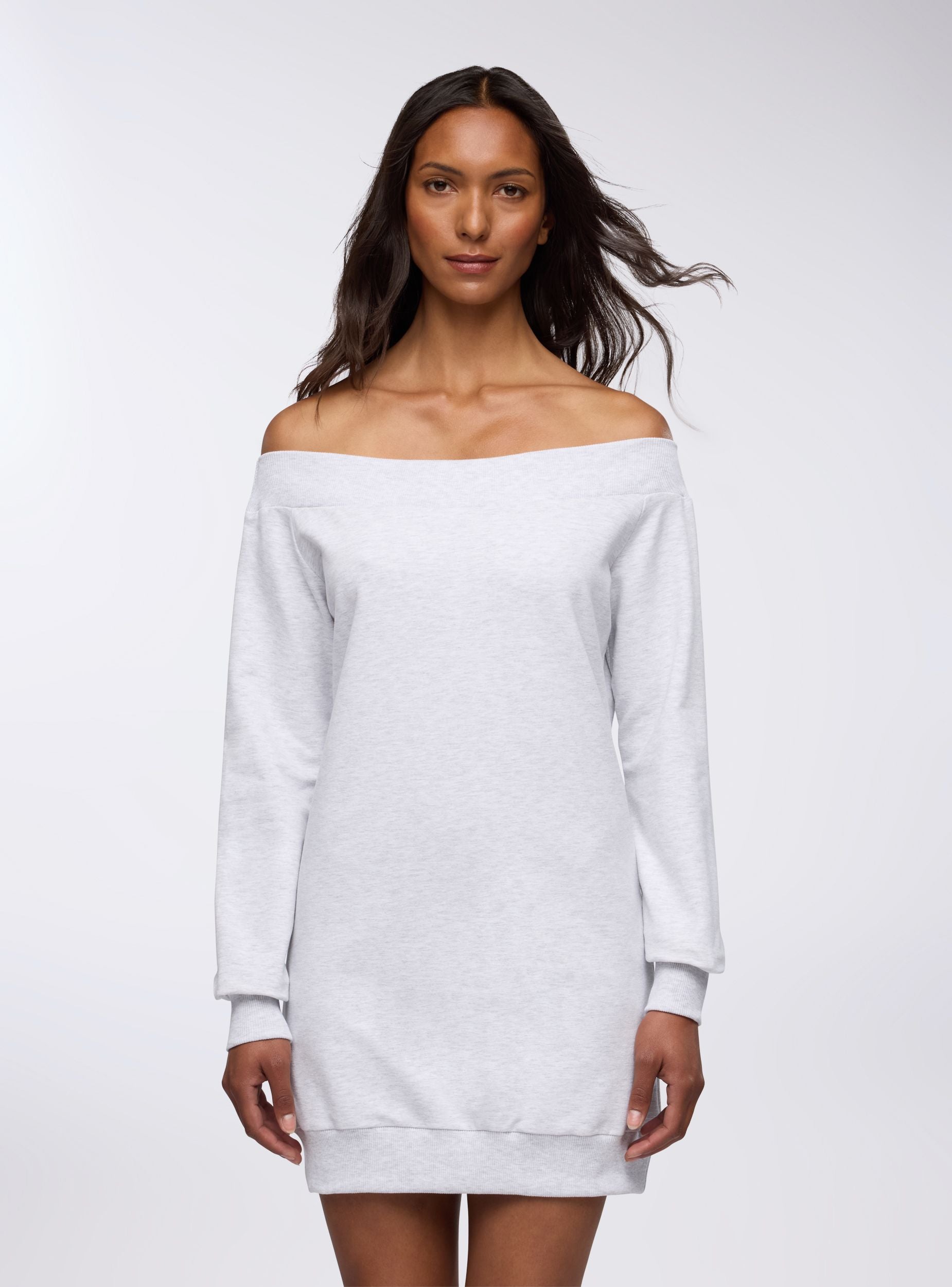 Дамска суичър рокля с неформален и съвременен силует, идеална за свободното време и по-хладните дни. Дизайнът в един цвят с дълги ръкави и открити рамене добавя нотка оригиналност, правейки я перфектна за градски и модерен вид. Лесно се съчетава със спортни обувки за спортен аутфит или с ботуши за по-смел и модерен акцент.Детайли