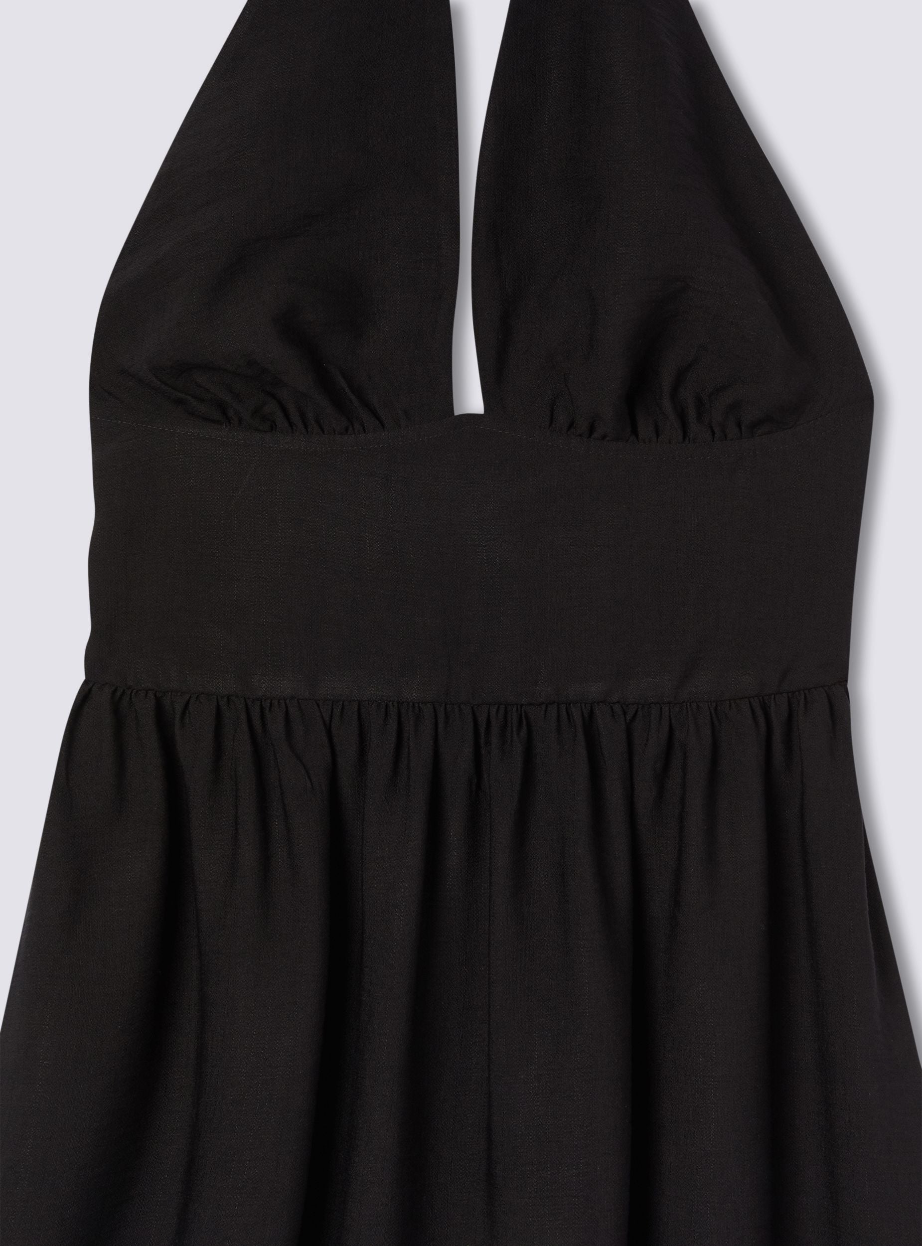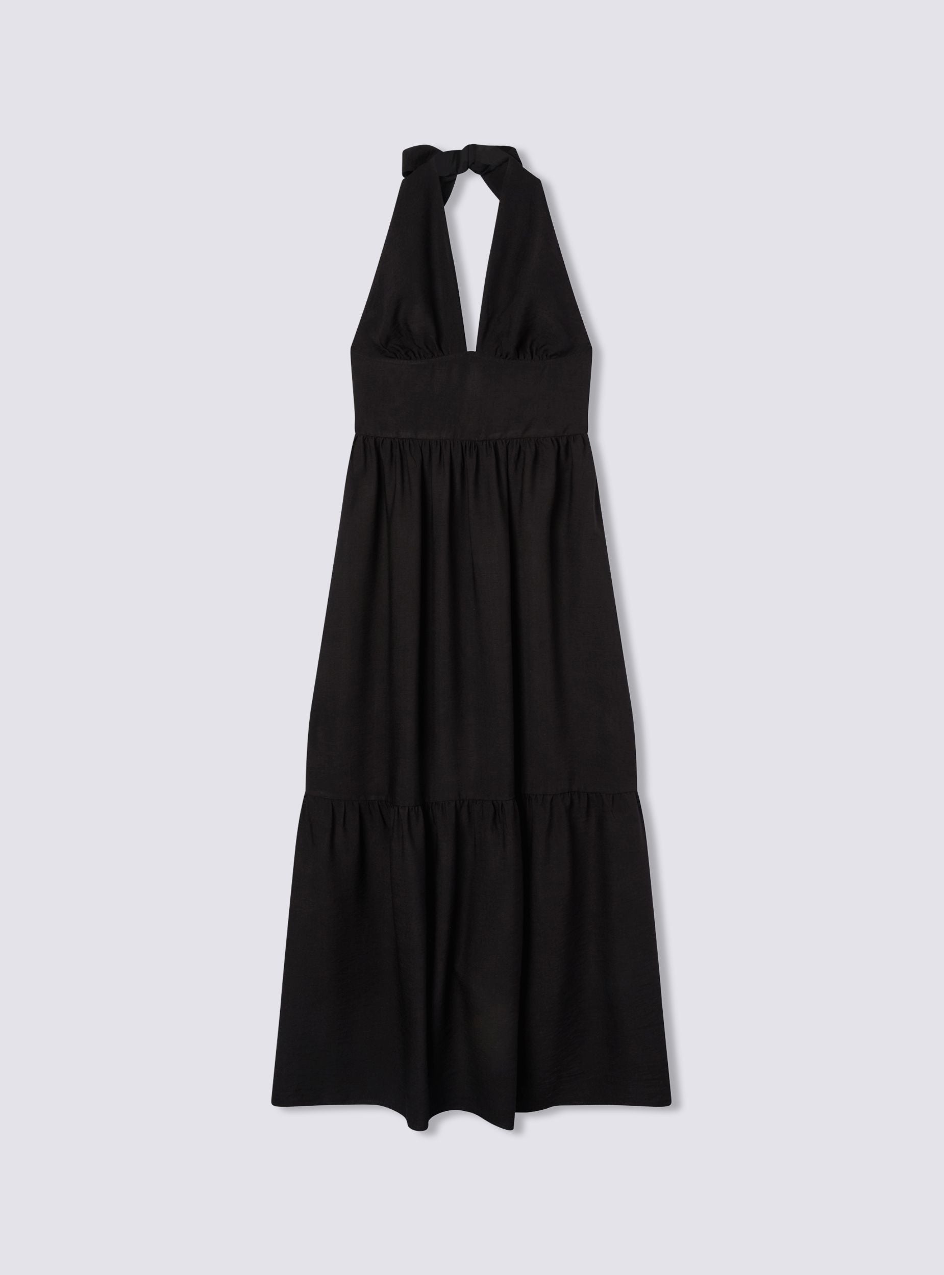 Дълга и елегантна дамска рокля, перфектна за специални поводи или летни вечери. Дизайнът с V-образно деколте подчертава женствеността, докато връзката на врата придава изисканост. Едноцветният нюанс я прави лесна за комбиниране, идеална с бижутерски сандали за изтънчен вид или с лека якна за по-шикозен акцент. Тъканта с ефект на лен добавя свежест и лекота.Детайли