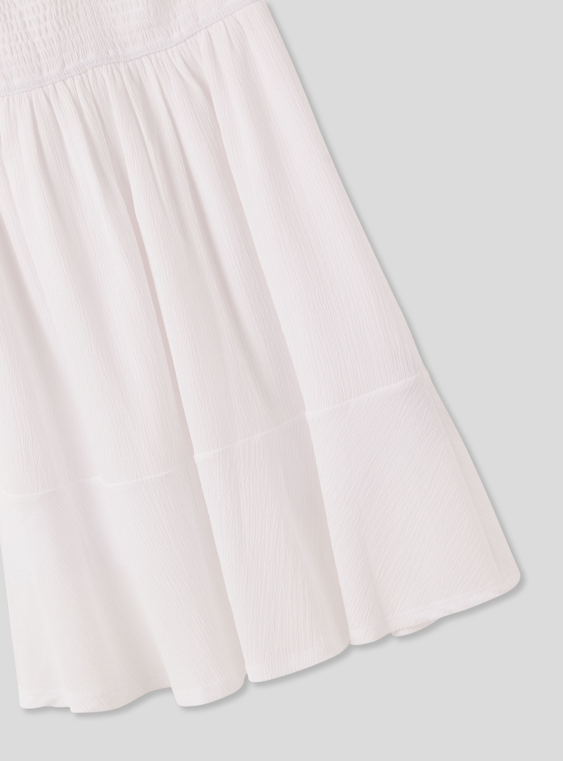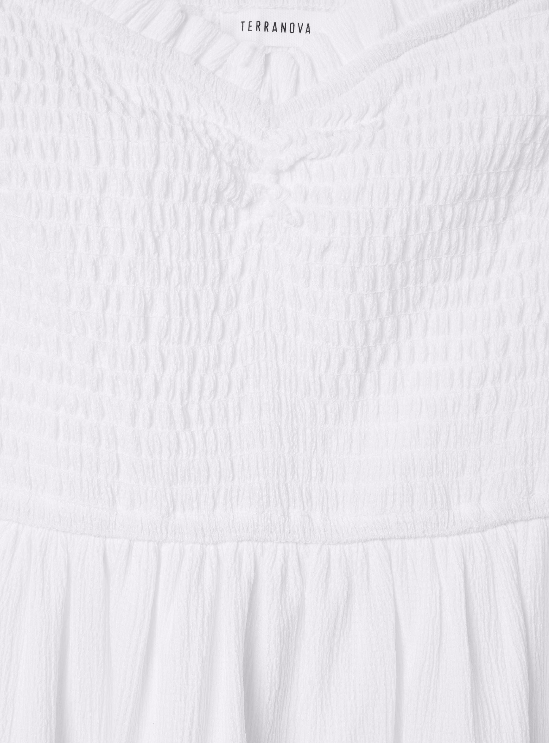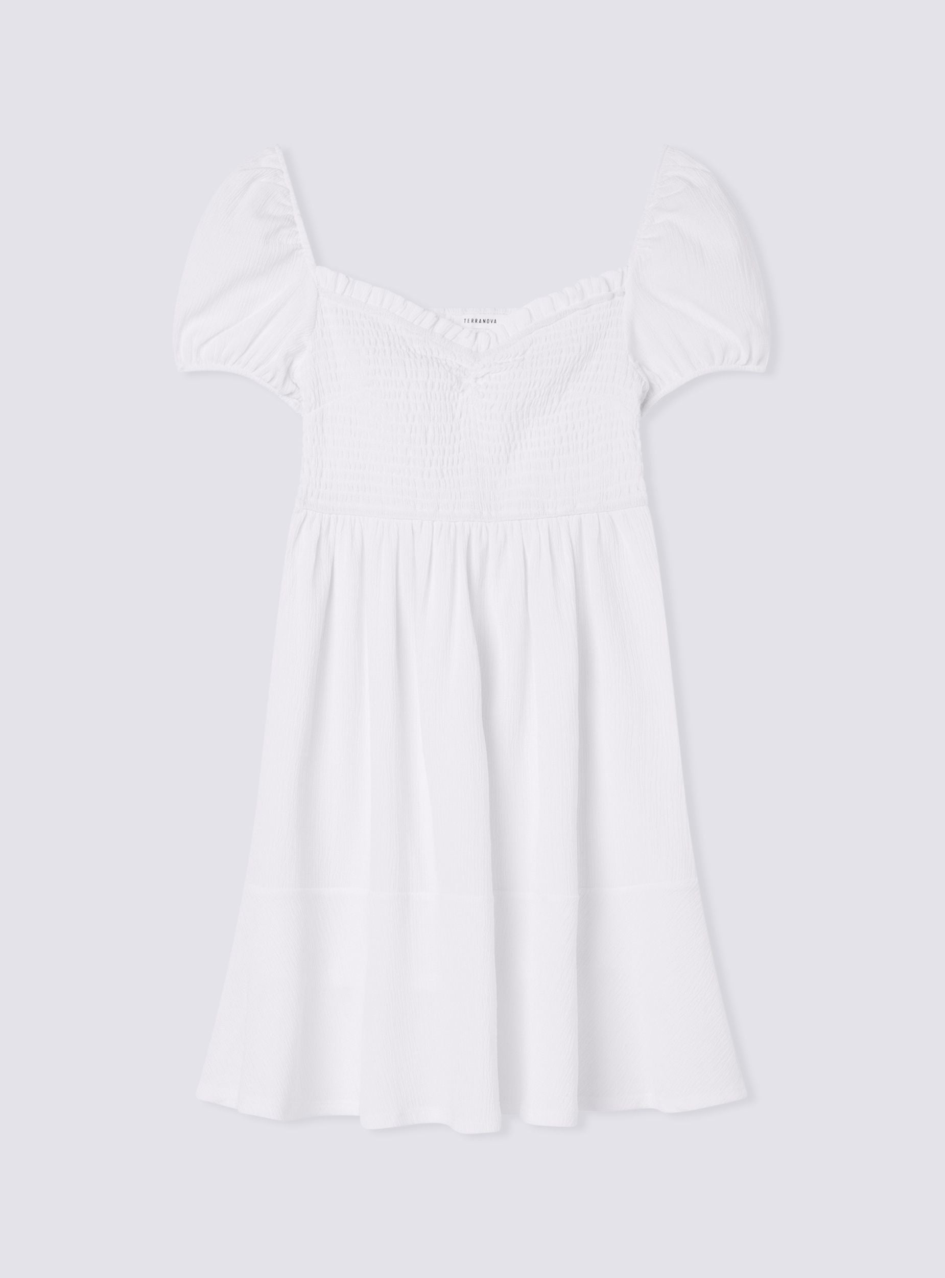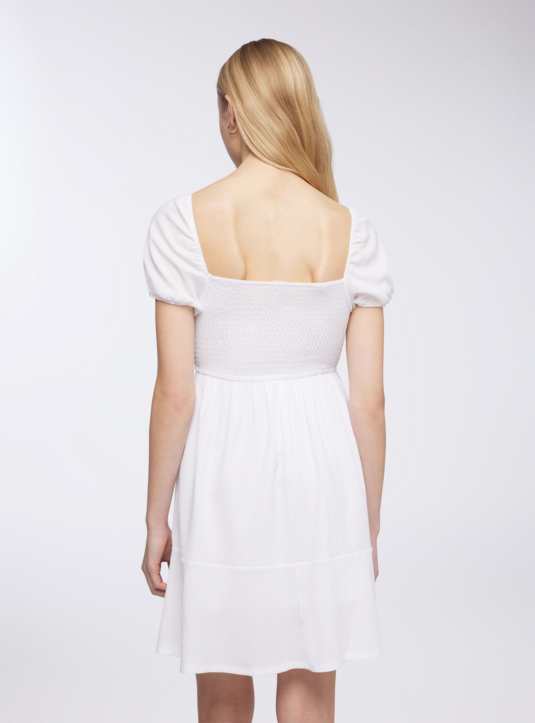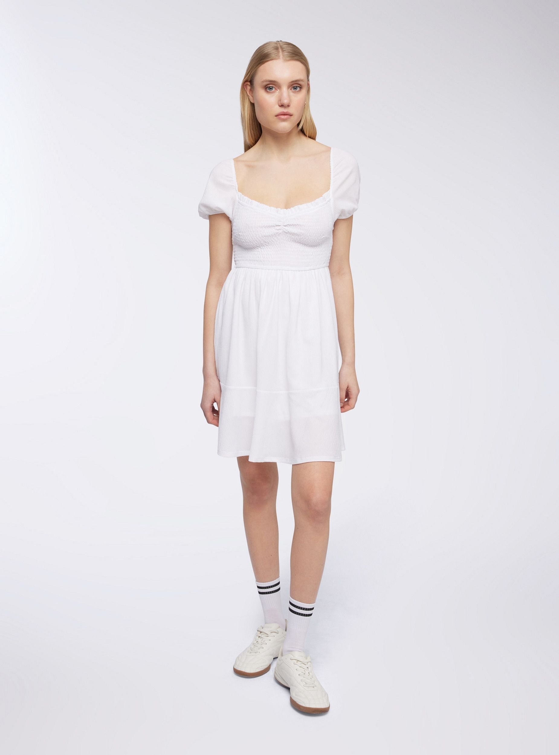 Къса дамска рокля в едноцветен цвят, характеризираща се с елегантен смокинг, който обгръща бюста, осигурявайки прилепване и комфорт. Късите ръкави добавят женствен и романтичен щрих към дизайна, придавайки леко обемно въздействие, което подчертава фигурата. Долната част на роклята има мека и разкроена пола, идеална за създаване на движение и лекота. Перфектна за небрежен и свеж вид, тази рокля съчетава простота и стил, което я прави подходяща за различни летни поводи благодарение на своята универсалност и комфорт.