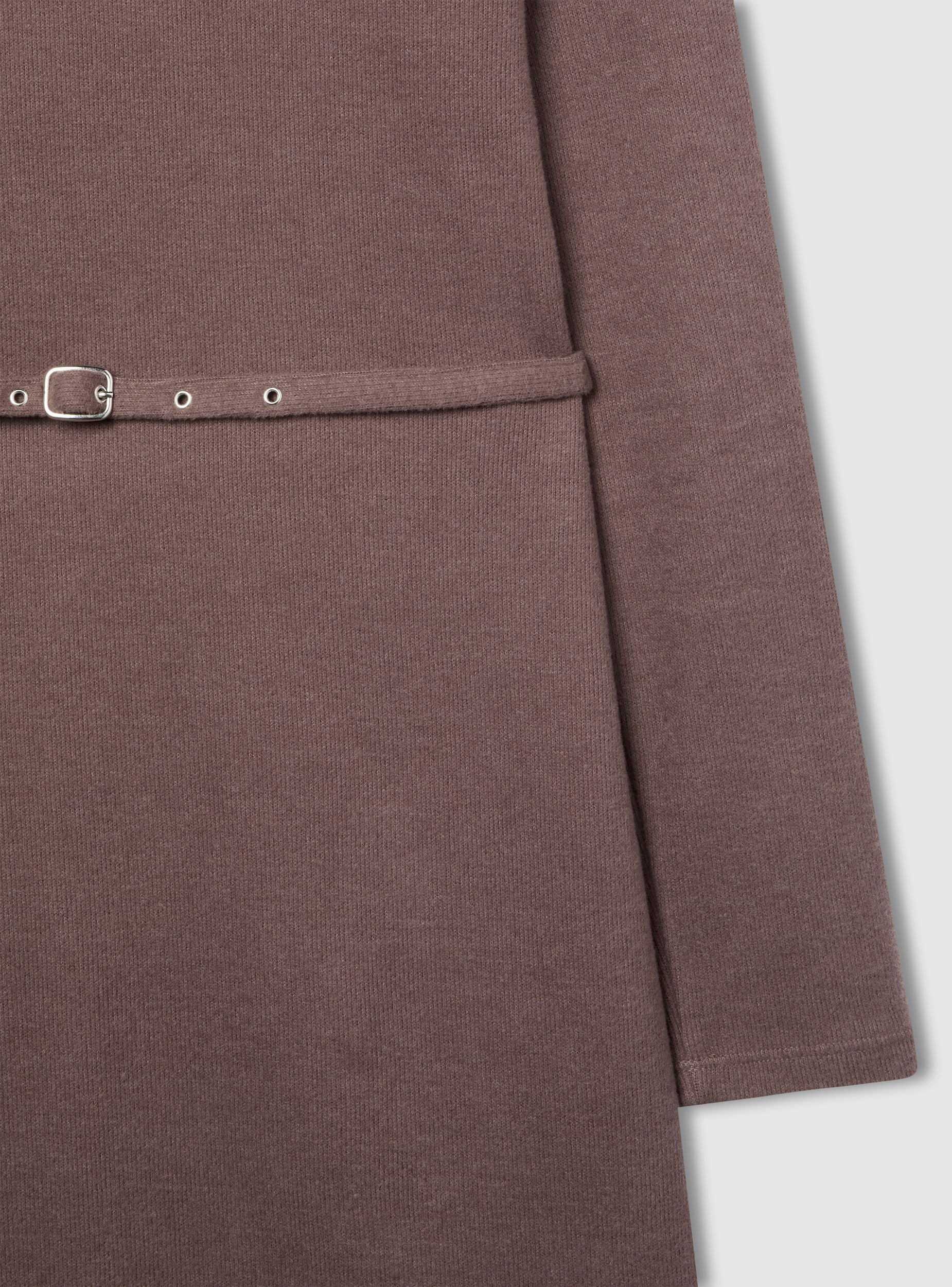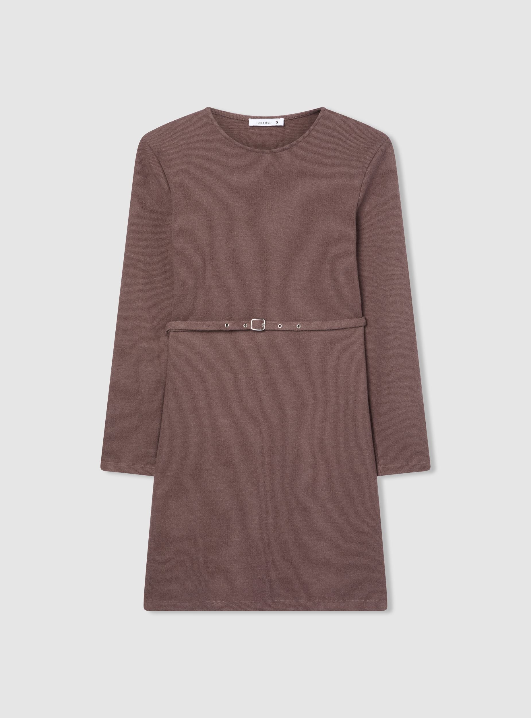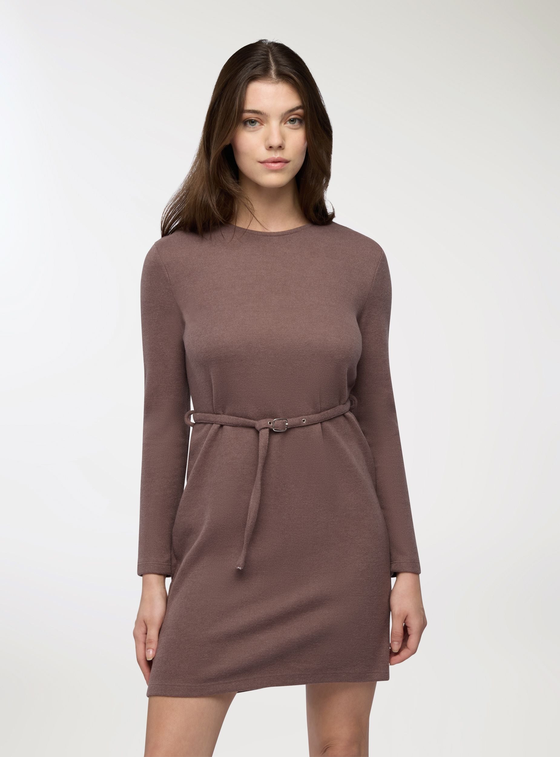 Дамска рокля в едноцветен дизайн, идеална за офиса и свободното време. Редовно прилягане с дължина над коляното, изчистена кръгла яка и дълги ръкави. Тънка коланче с катарама на талията за оформяне на силуета. Лесна за съчетаване с боти или кецове. Перфектна под палто или късо яке през междинните сезони. Едноцветен, изчистен и универсален дизайн, без джобове и с права линия.Детайли