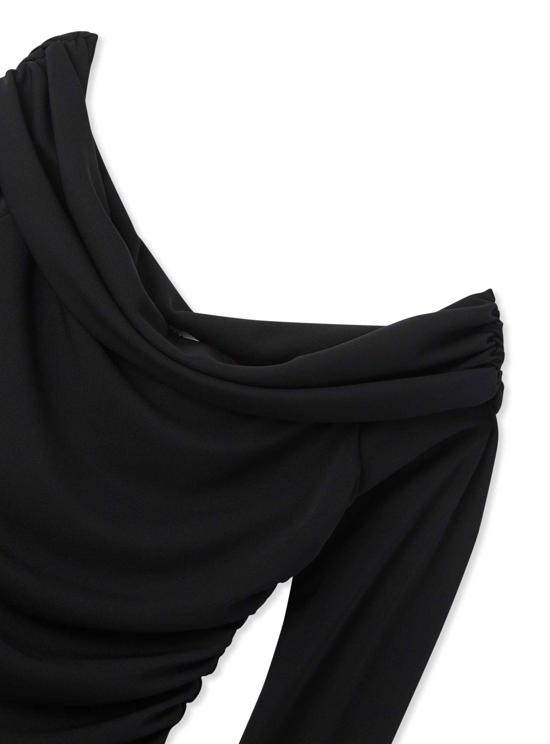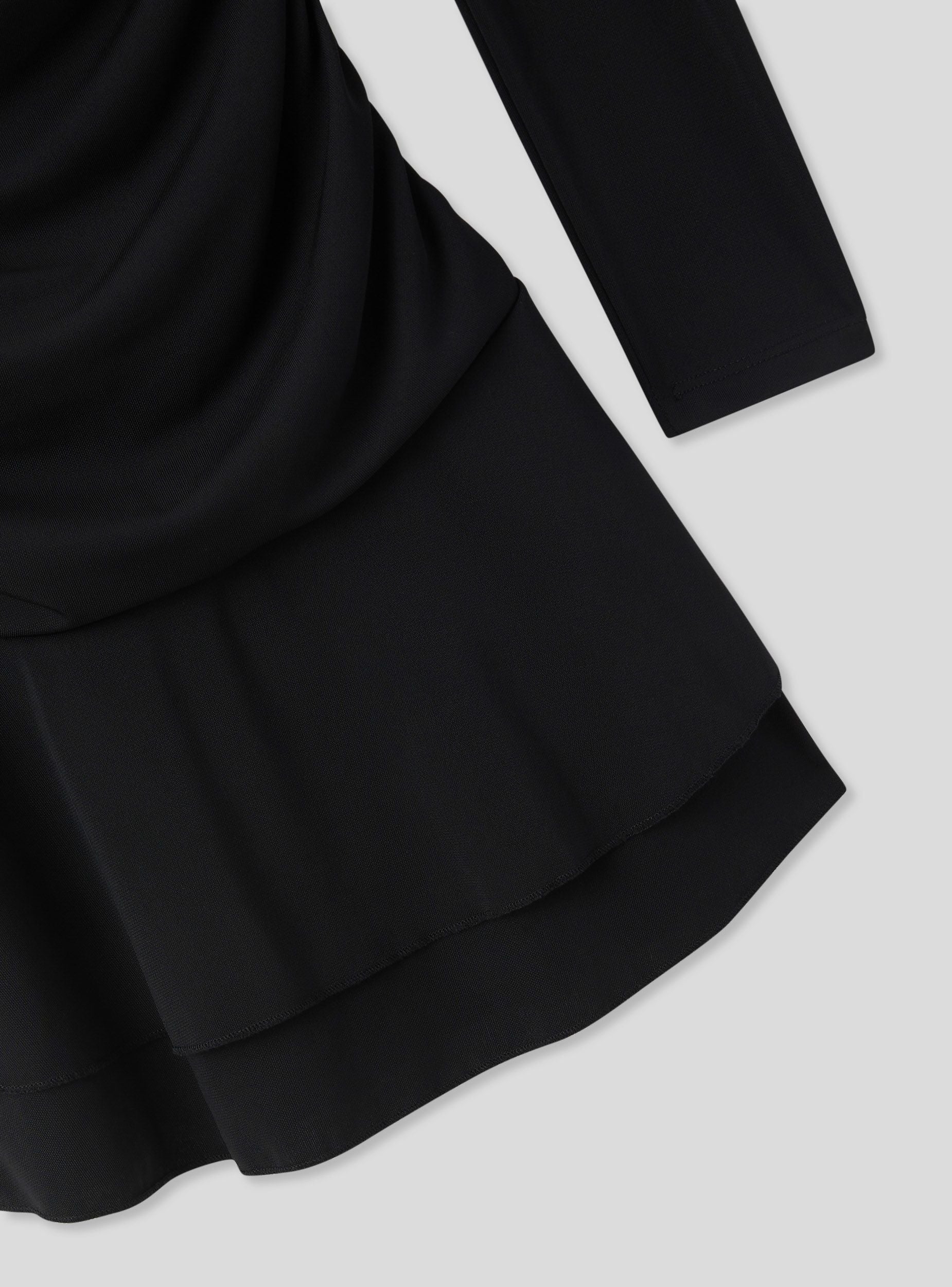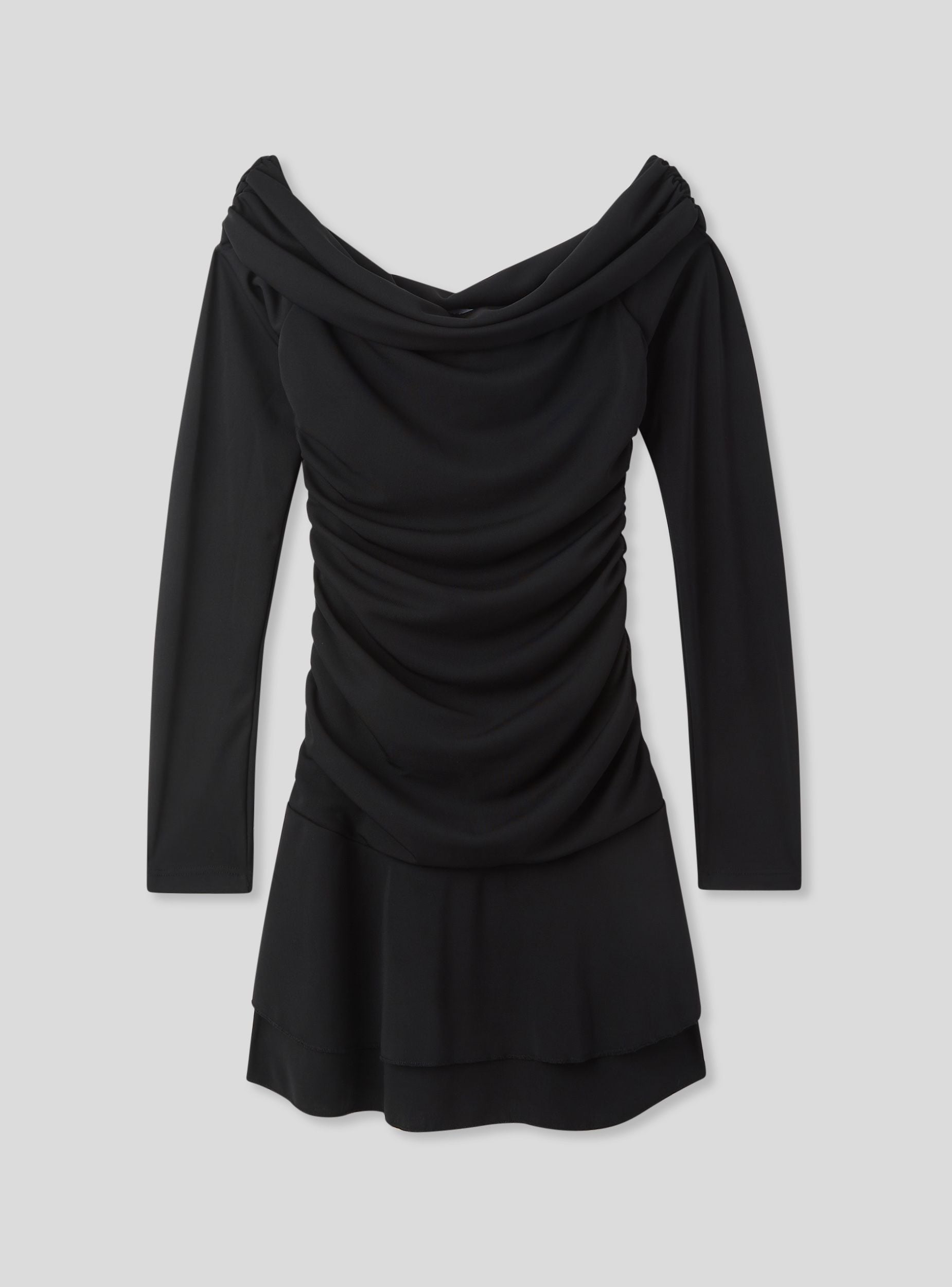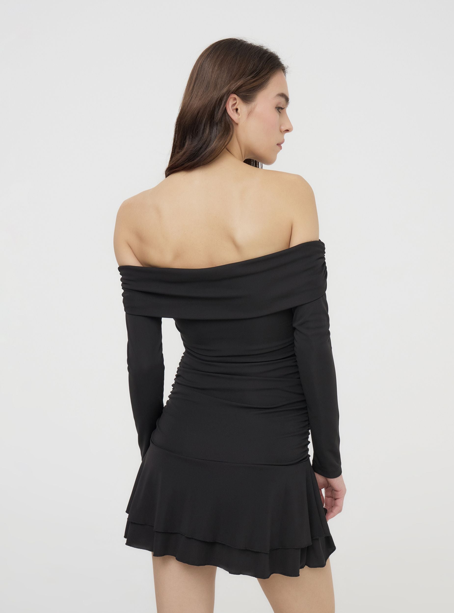 Къса рокля за жени с привлекателен силует, идеална за специални вечери, романтични вечери или гламурни събития. Дизайнът в един цвят подчертава силуета, докато откритите рамене добавят елегантен акцент. Прищипванията по бюста подчертават формите, създавайки обгръщащ ефект. Дългите ръкави придават елегантност, а воланът на полата добавя движение. Перфектна с токчета и блестящи аксесоари.