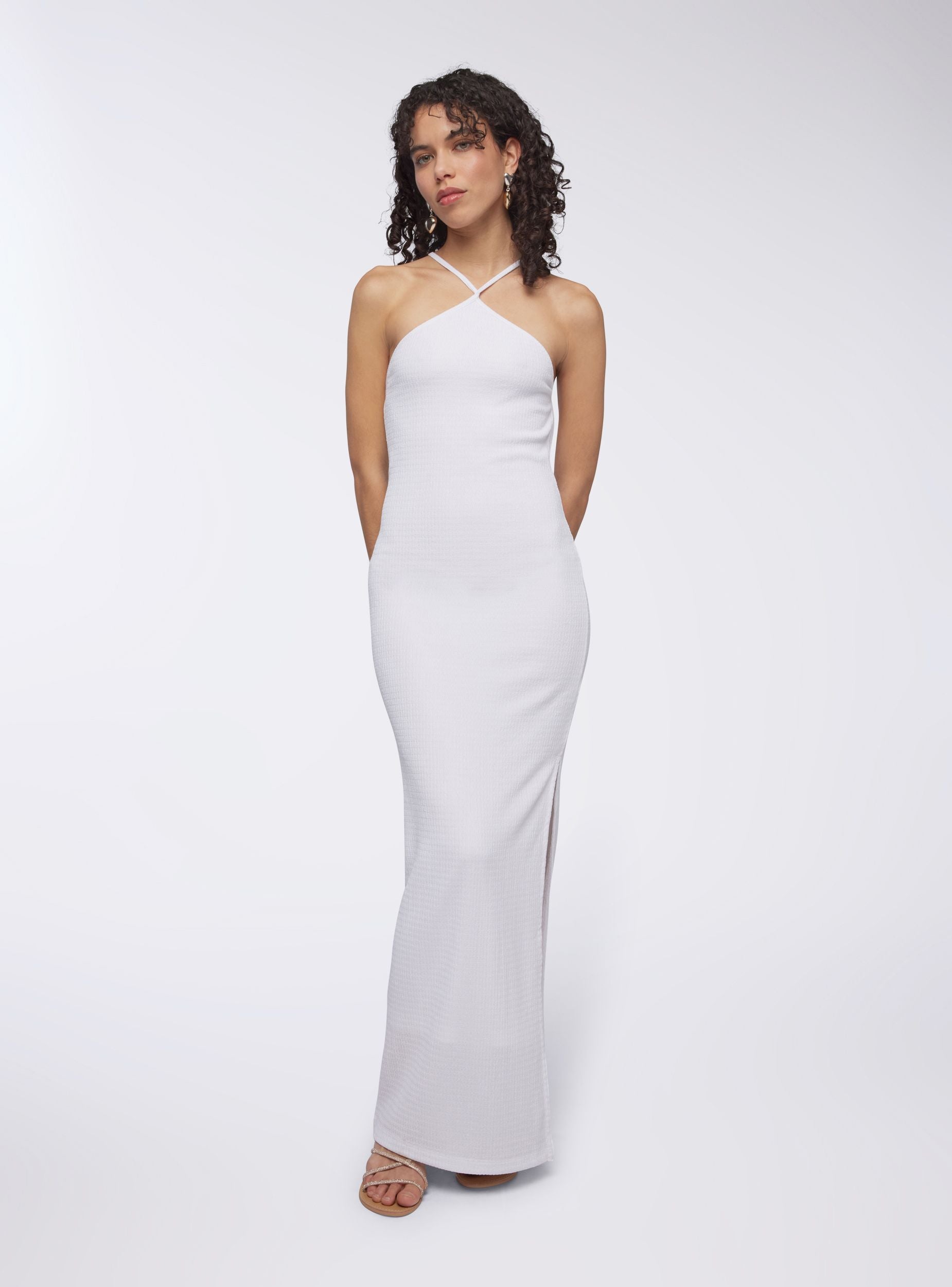 Дълга рокля за жени с халтер, характеризираща се със sofisticiran i modern stil. Нейната прилепнала силует подчертава формите, докато тъканта с ефект на набръчкване придава динамичност и оригиналност. Задължителен елемент за тези, които обичат да се отличават, идеален за специален повод или за елегантен вечерен вид. Тази рокля в един цвят предлага безвременен чар, комбинирайки стил и комфорт в едно елегантно решение.Детайли