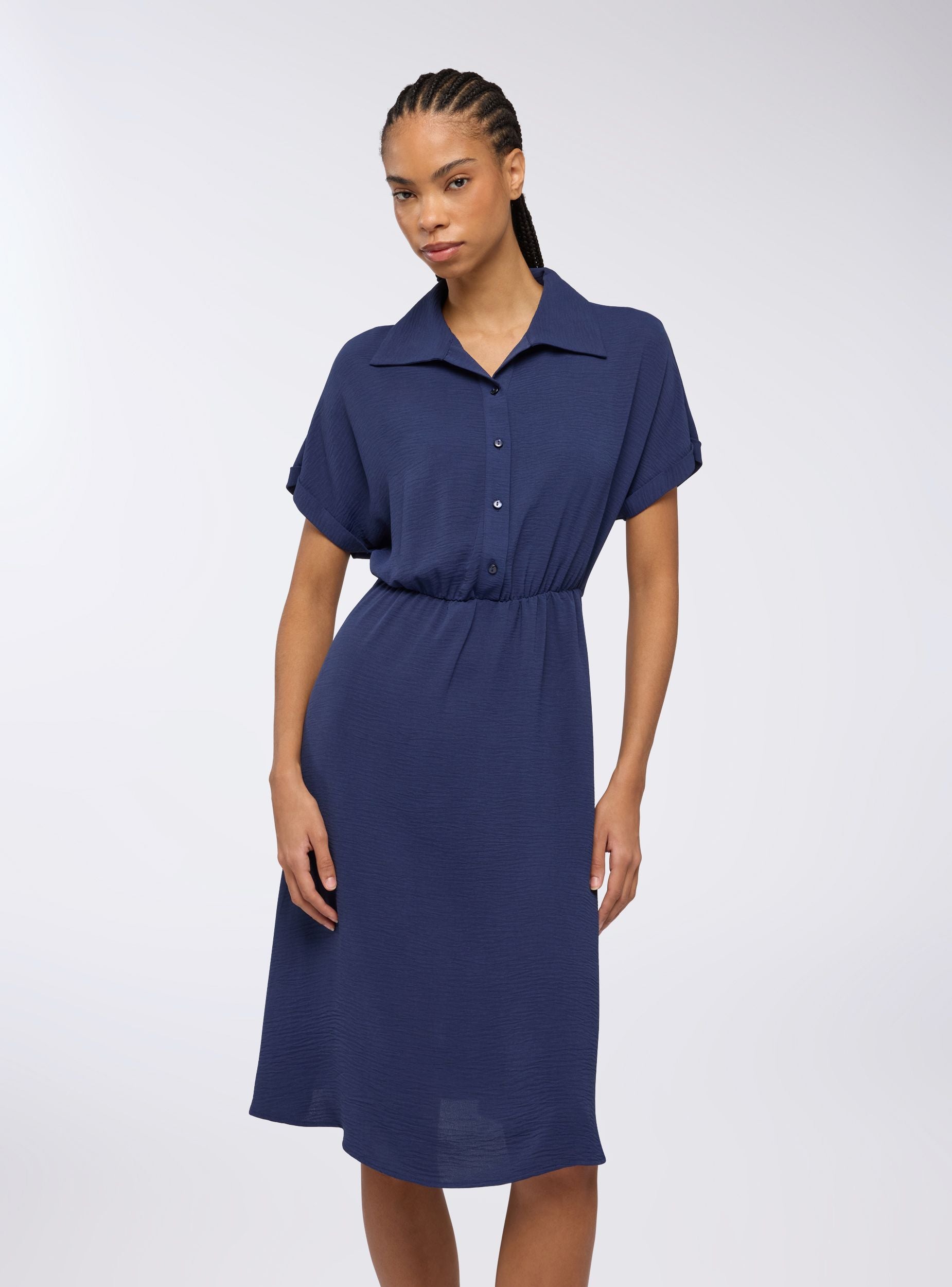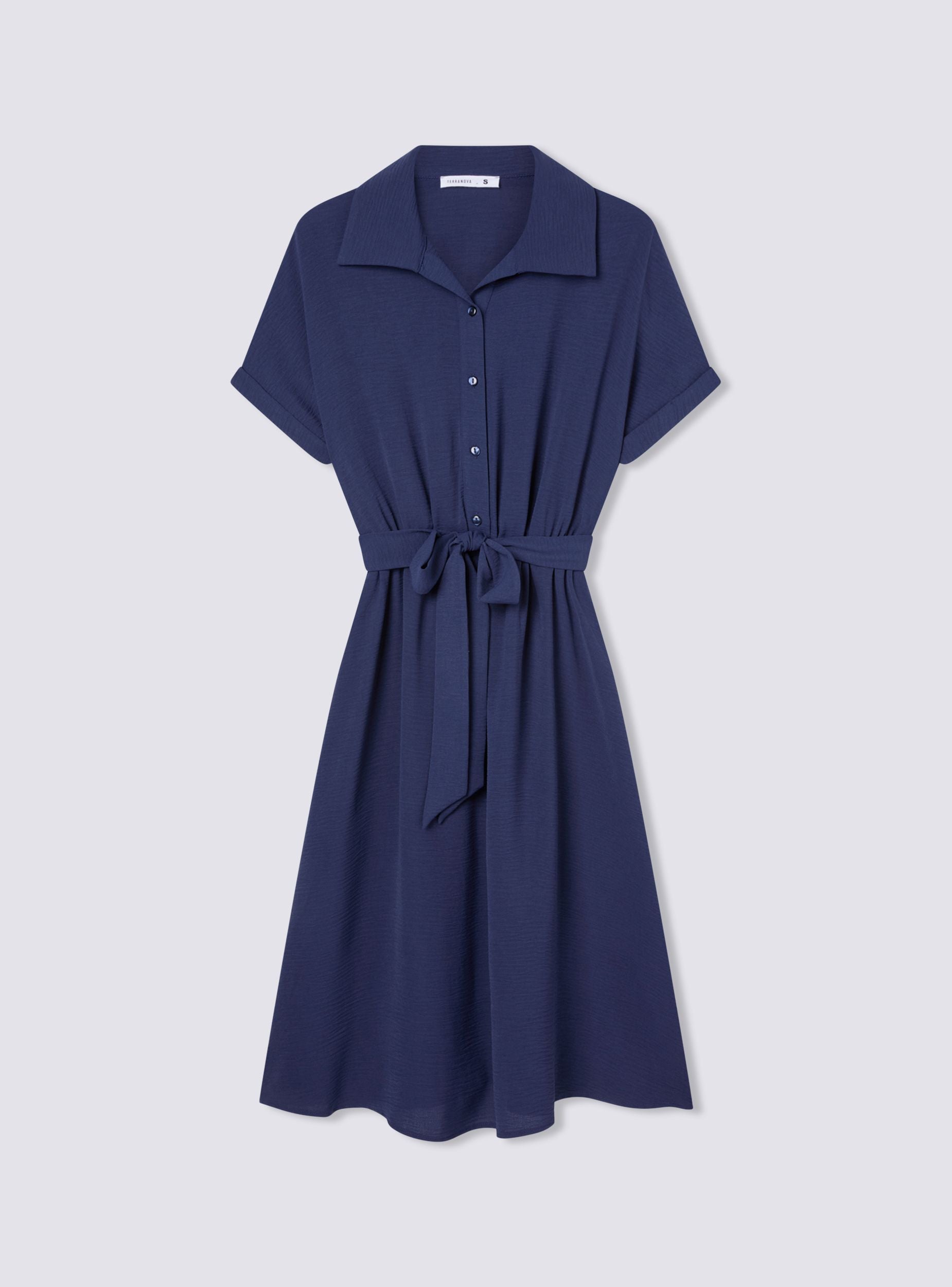 Дълга дамска рокля в едноцветен цвят, характеризираща се с неформален и универсален дизайн. Късите ръкави придават свеж и неофициален вид, докато коланът в талията позволява елегантно оформяне на силуета. Яката с ръб и предната закопчалка с копчета добавят елегантен и практичен акцент. Перфектна за ден, изпълнен с комфорт, без да се жертва стилът, тази рокля е идеална за множество поводи, лесно се адаптира към различни аксесоари за винаги подреден и изтънчен вид.