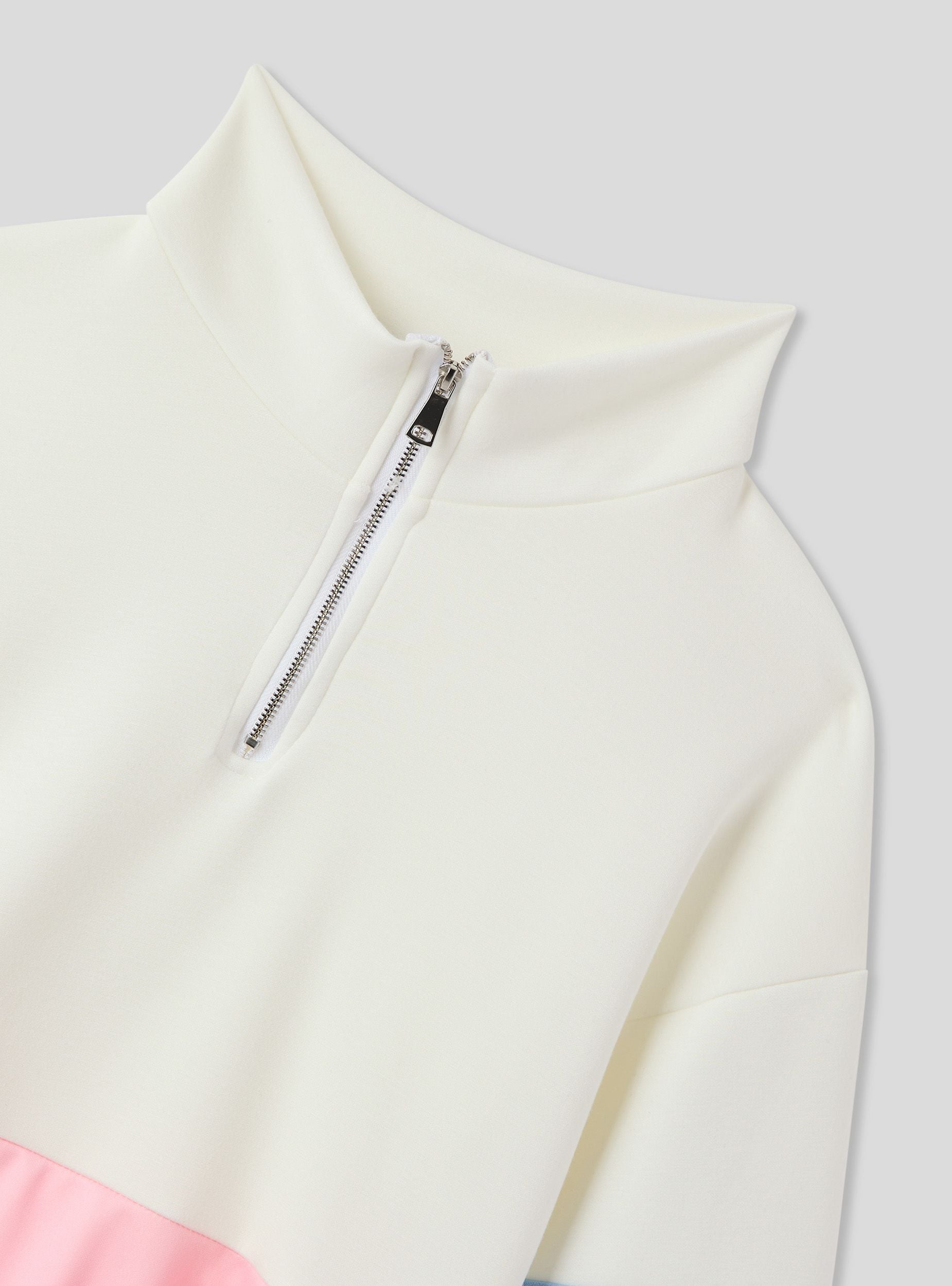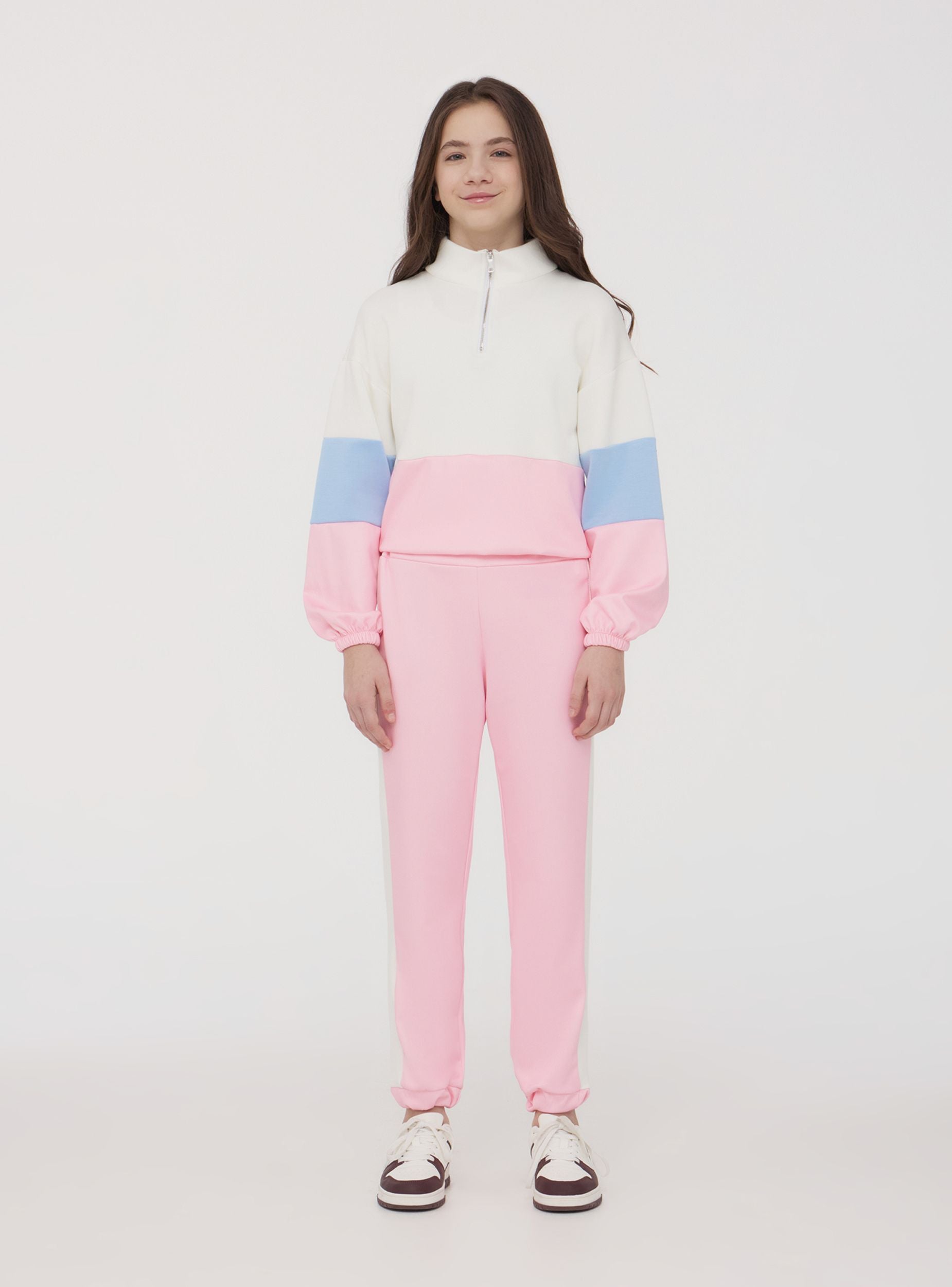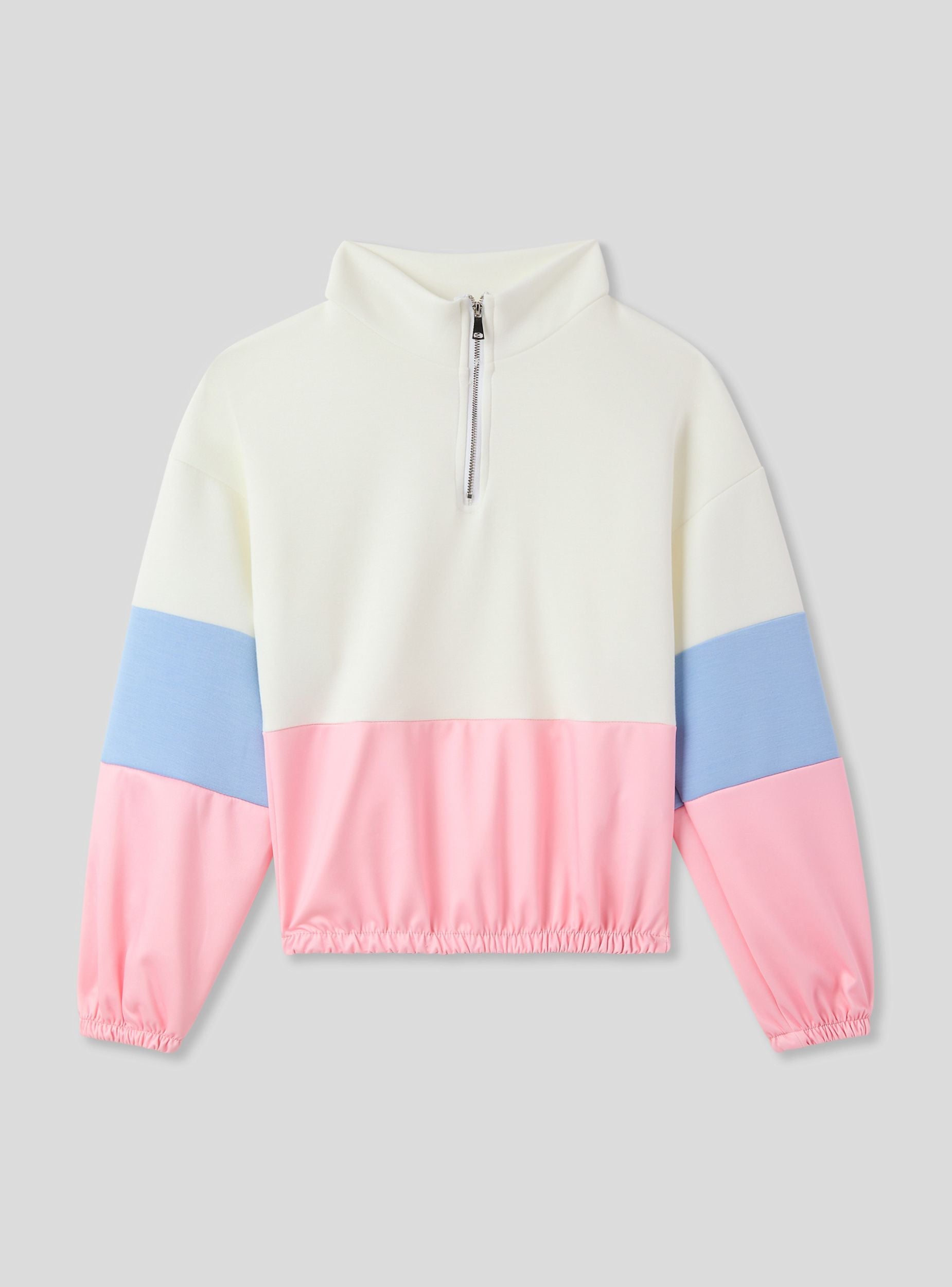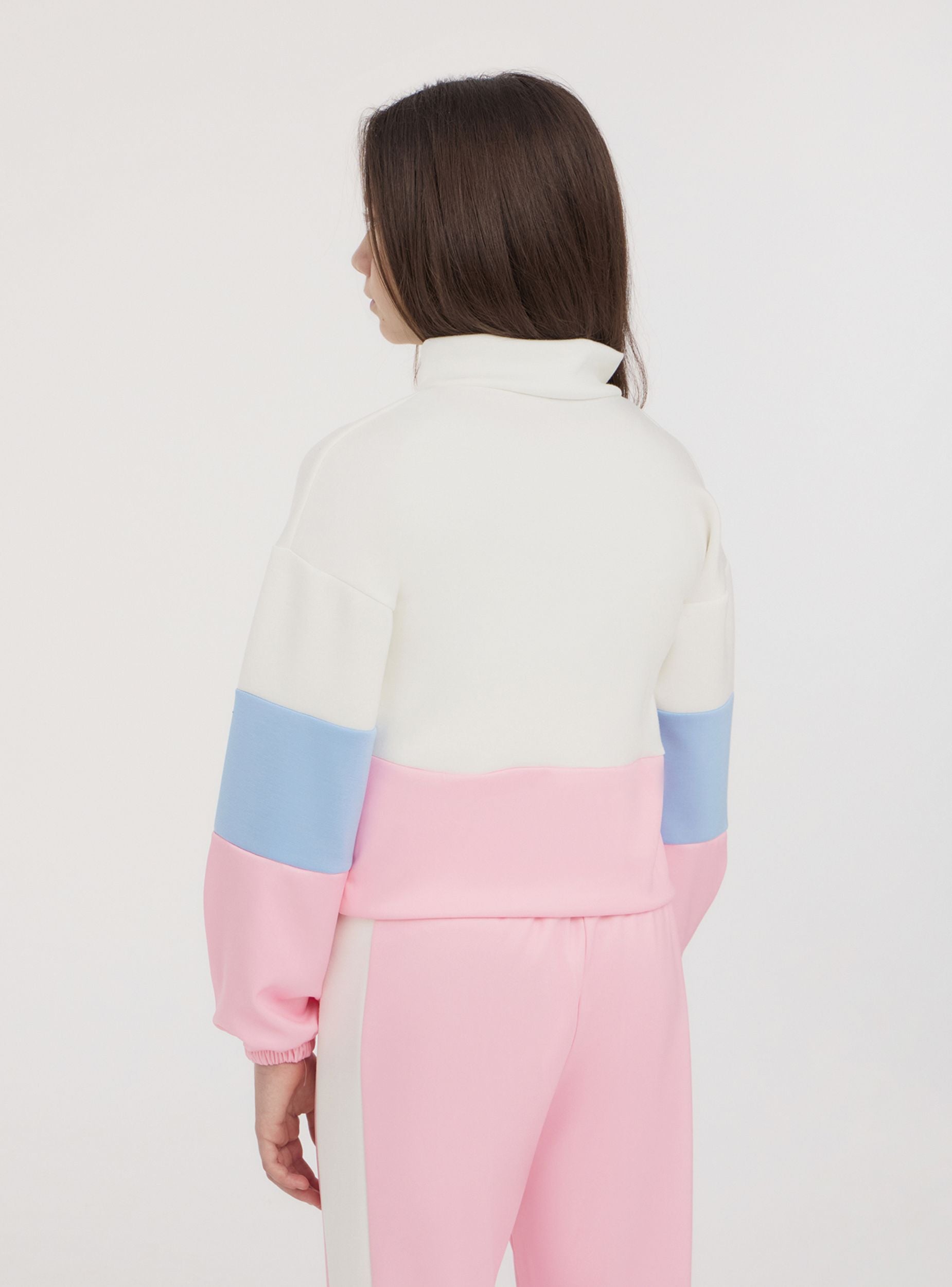 Детска спортна и модна блуза, перфектна за по-хладните дни с комфорт и оригиналност. Дизайнът с дълги ръкави, висока яка и цип придава динамичен вид. Моделът с блок цветове добавя модерен акцент, идеален за съчетаване с дънки или легинги за небрежен и модерен вид.Детайли
