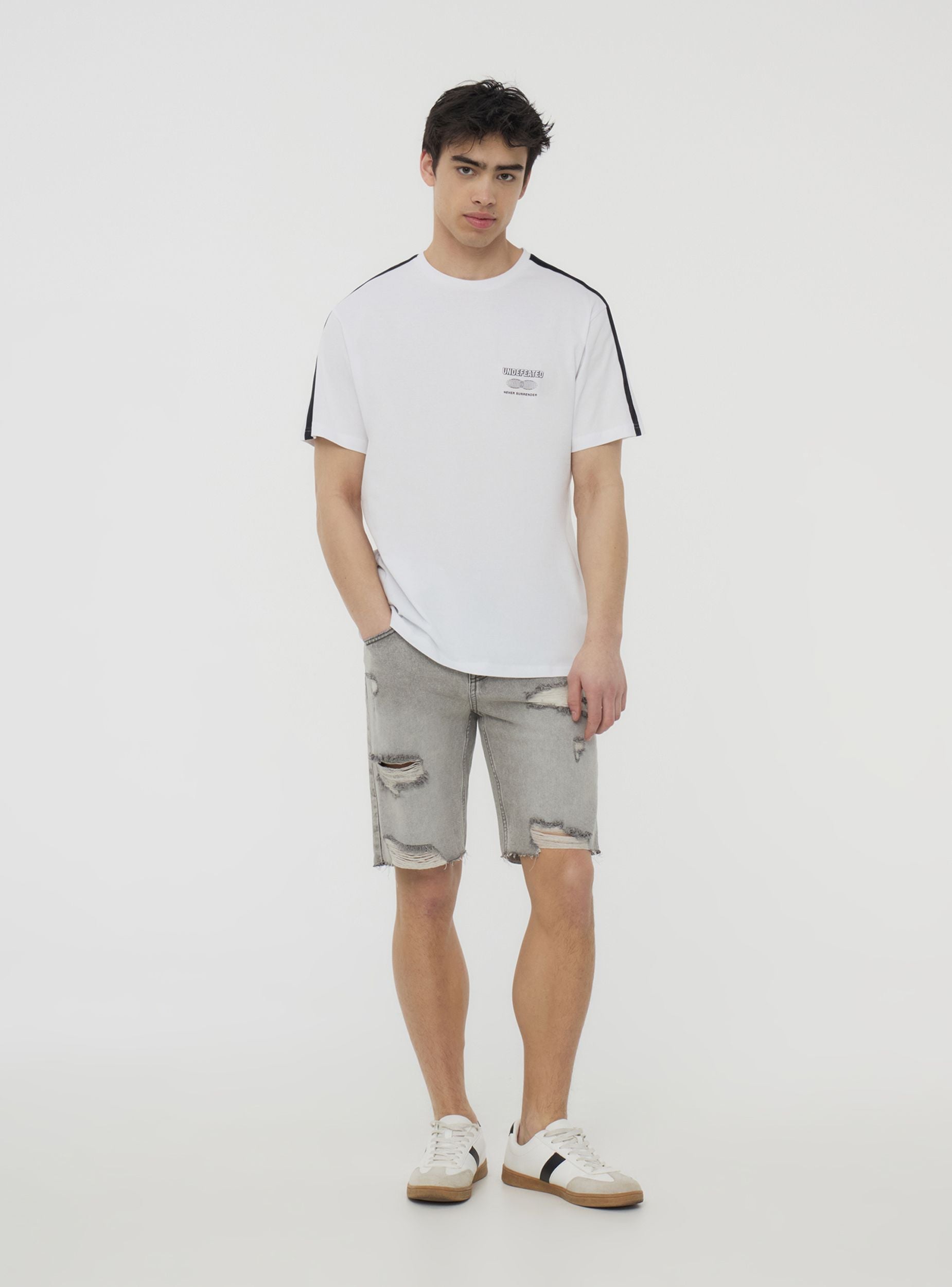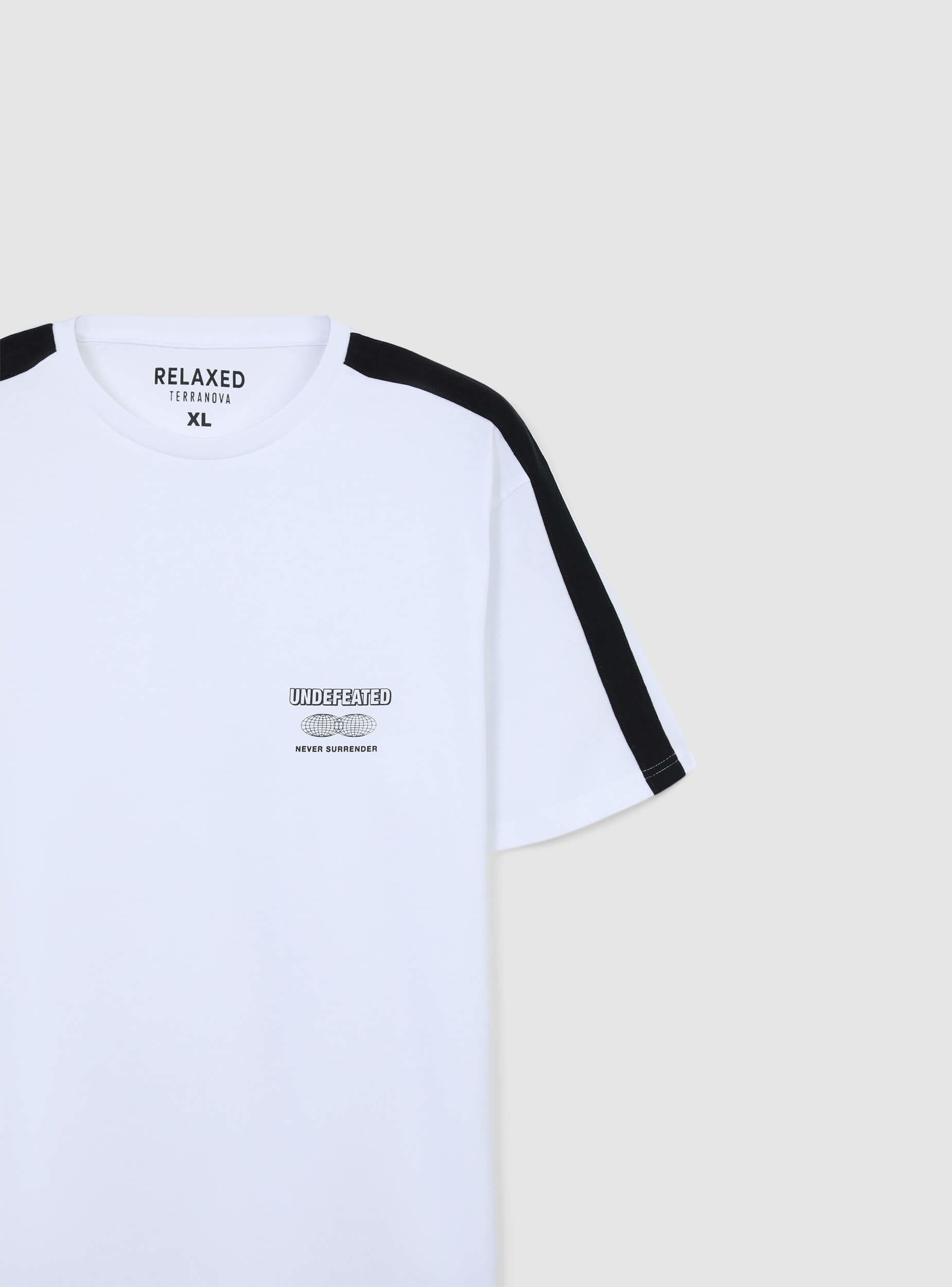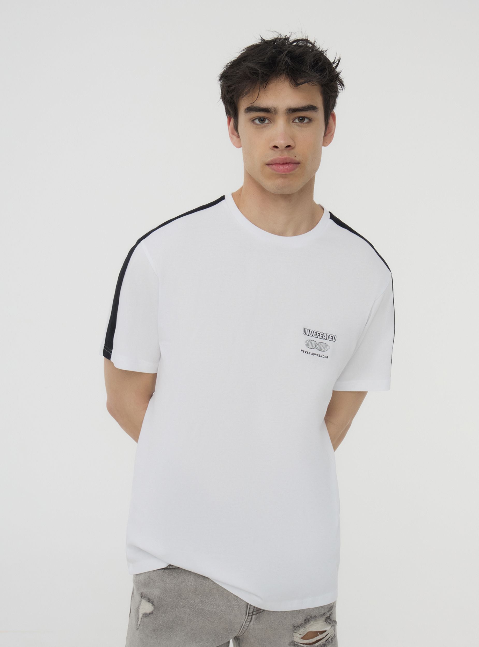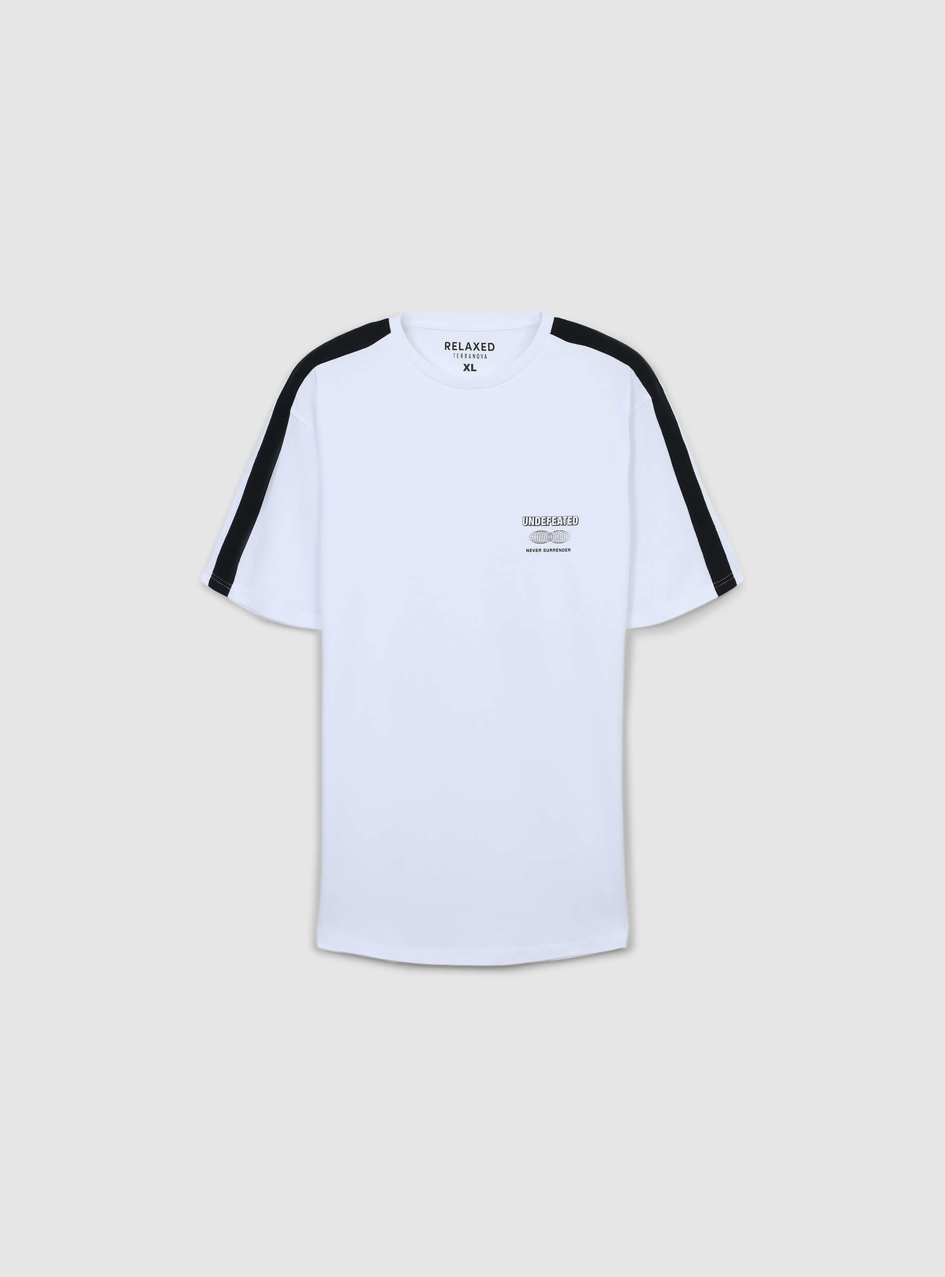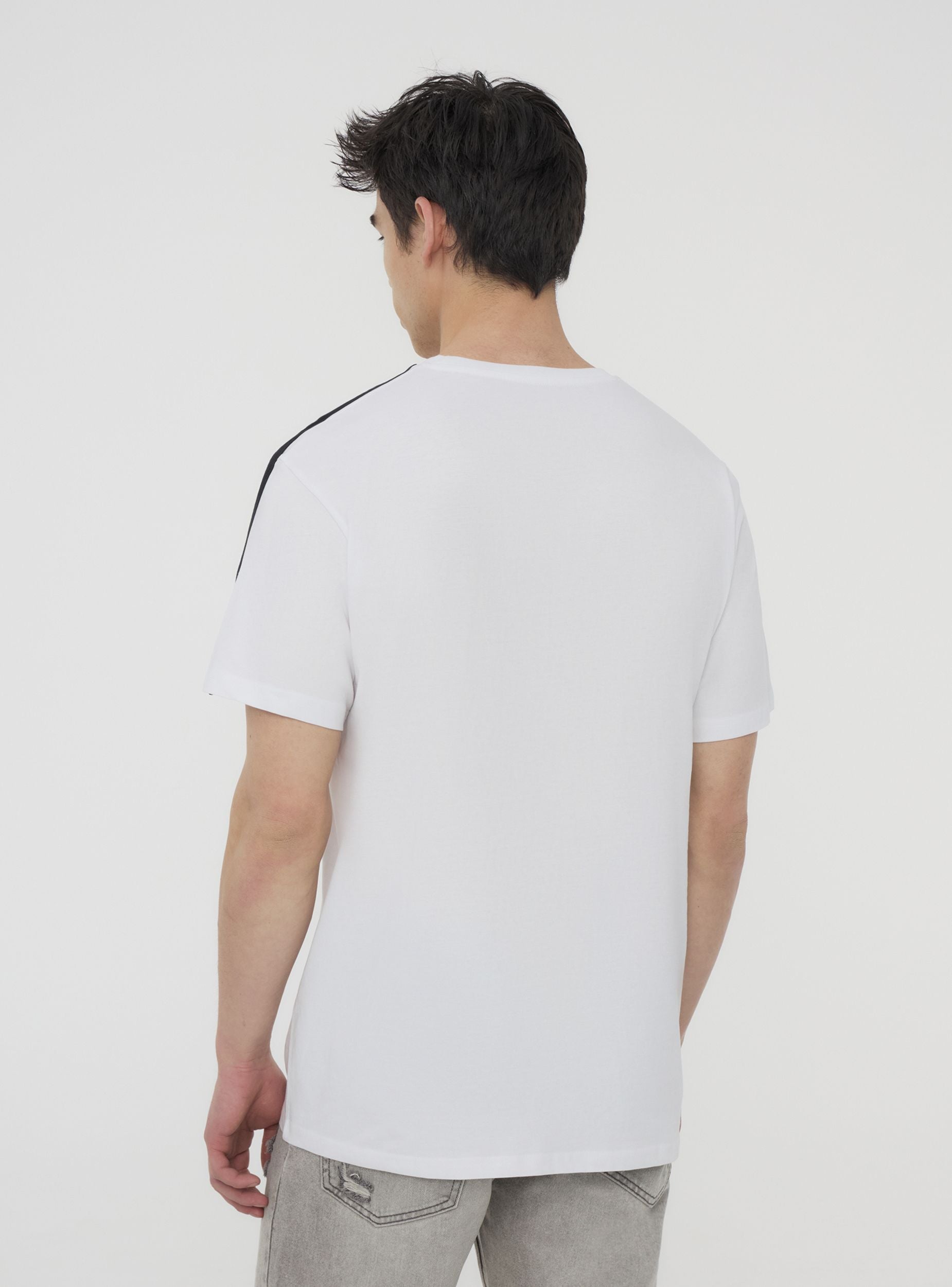 Мъжка тениска с едноцветен дизайн и контрастни ленти на раменете, къси ръкави и кръгло деколте. Минималистичният дизайн с малък принт на гърдите я прави перфектна за неформален и спортен вид. Идеална за свободното време или модни градски аутфити. Лесно се съчетава с дънки, джогъри или шорти, осигурявайки универсален и динамичен стил, подходящ за всякакъв повод.Детайли