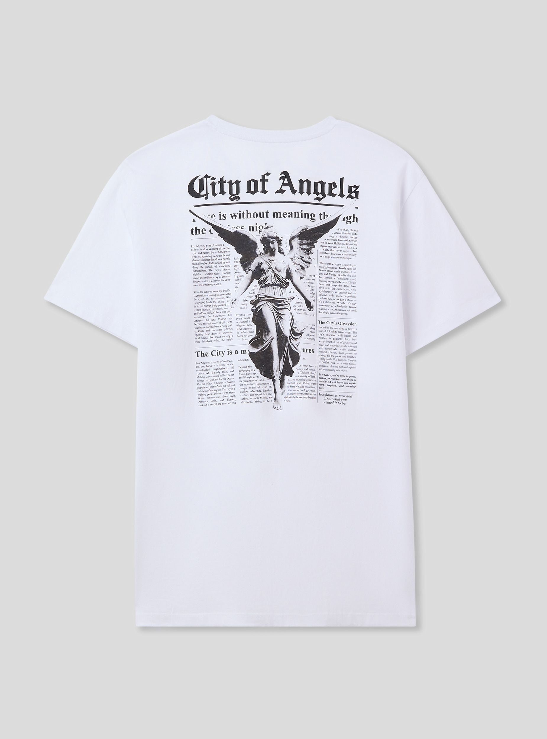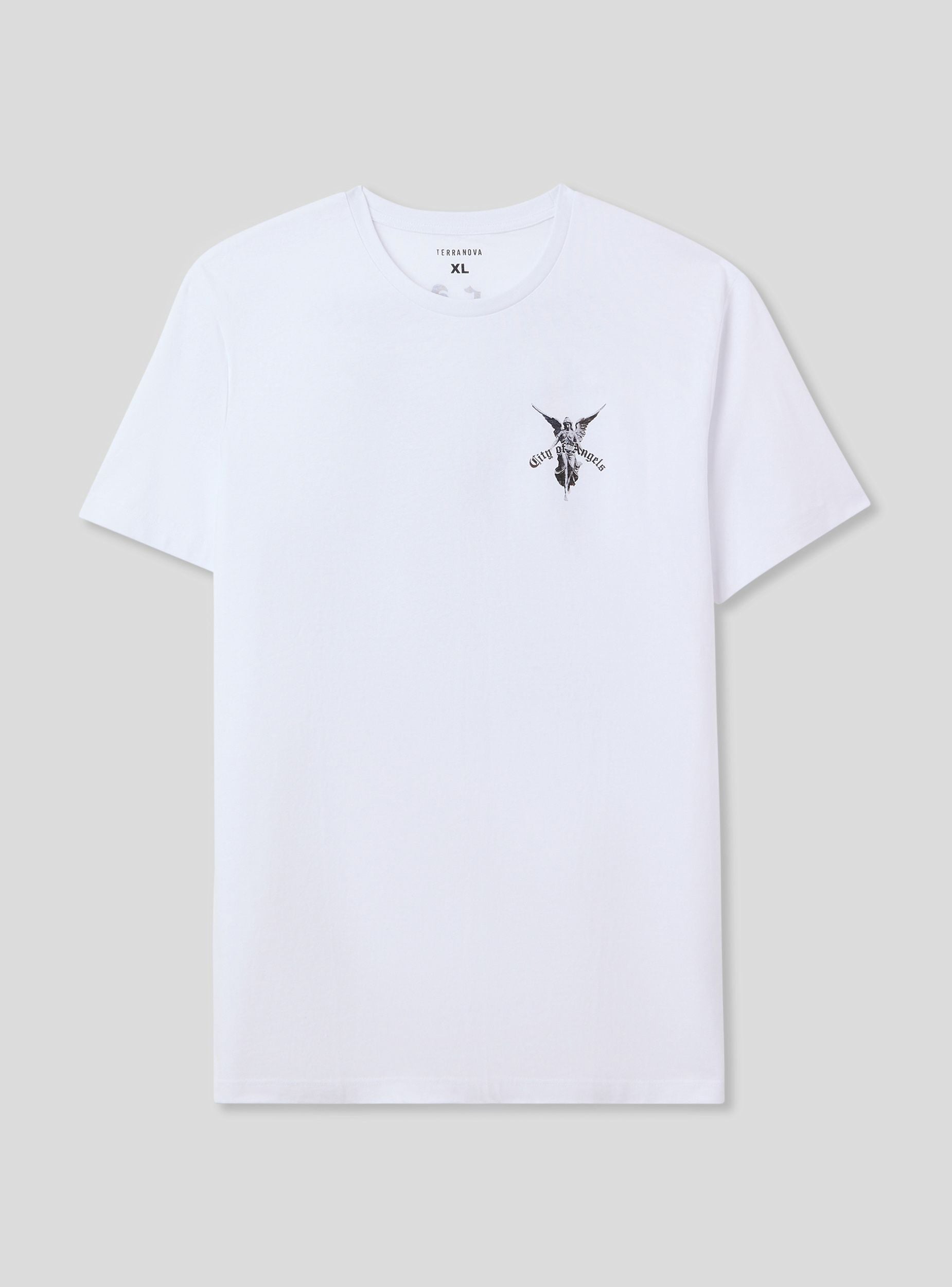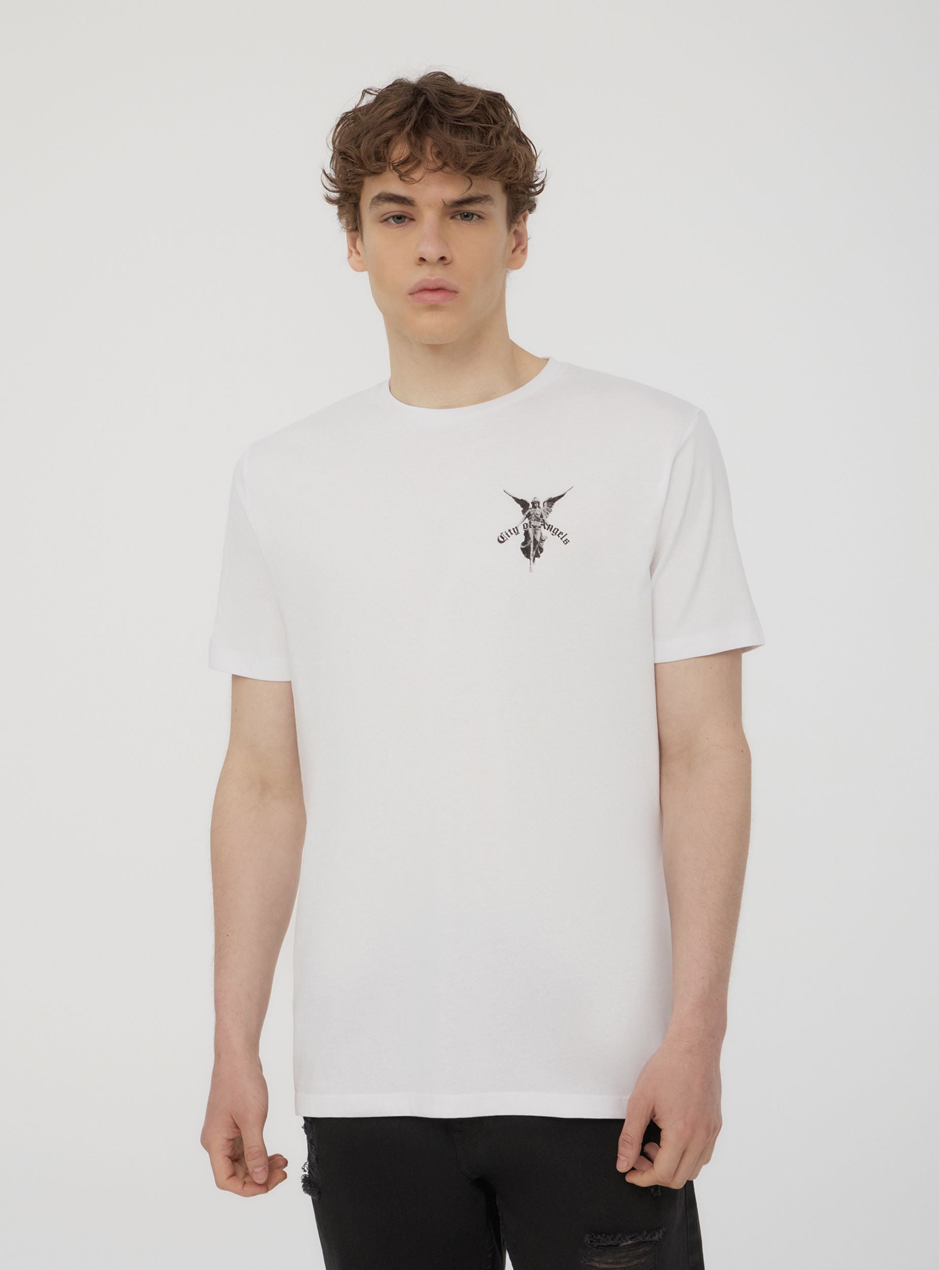 Мъжка тениска с къси ръкави и кръгло деколте. Дизайнът включва малък детайл отпред и голям печат отзад с ангел и текст, идеална за уличен и съвременен вид. Перфектна за свободното време, вечерни излизания или за любителите на градския стил. Лесно се съчетава с дънки, джогъри или шорти за характерно и модно облекло.Детайли