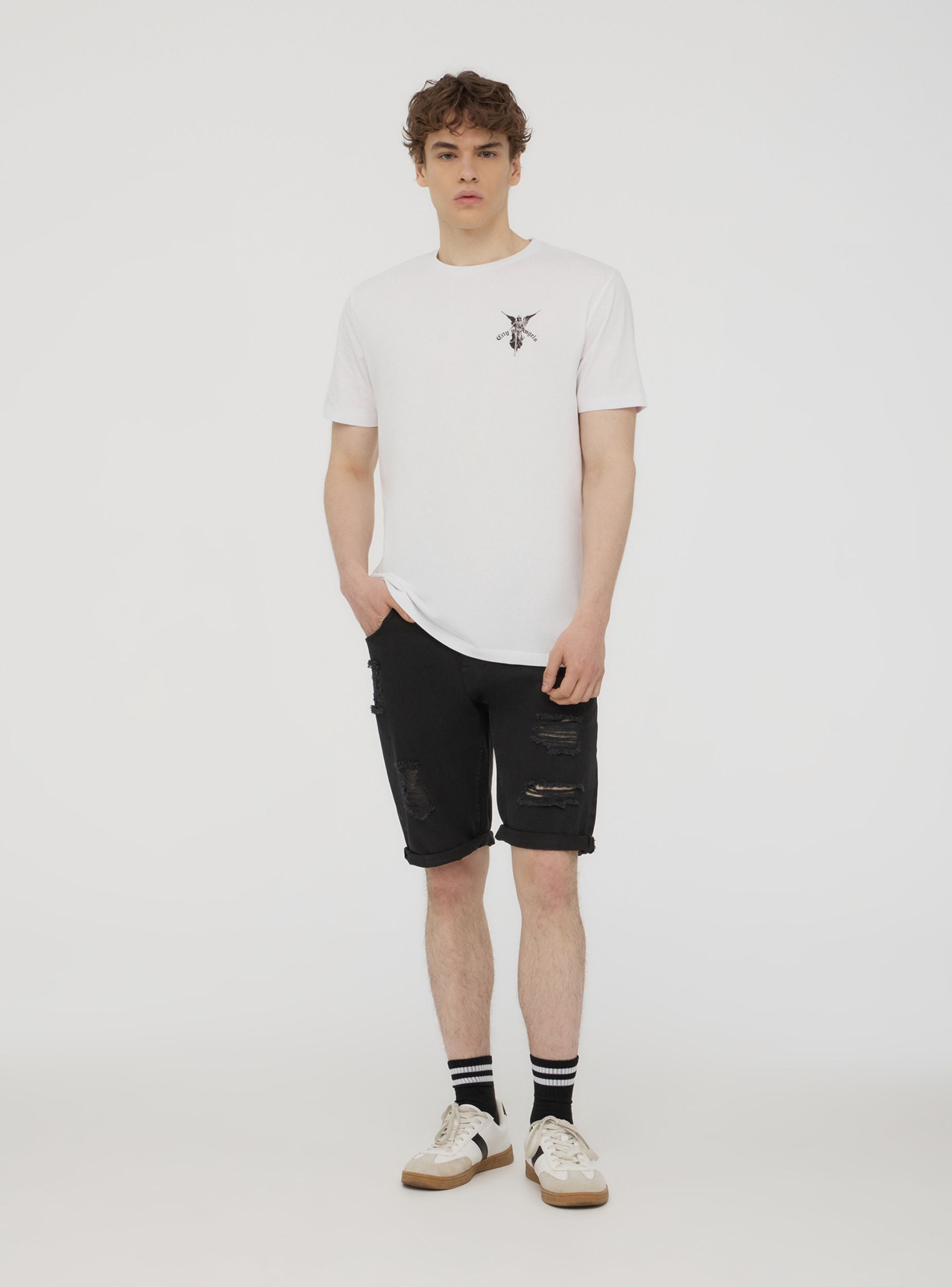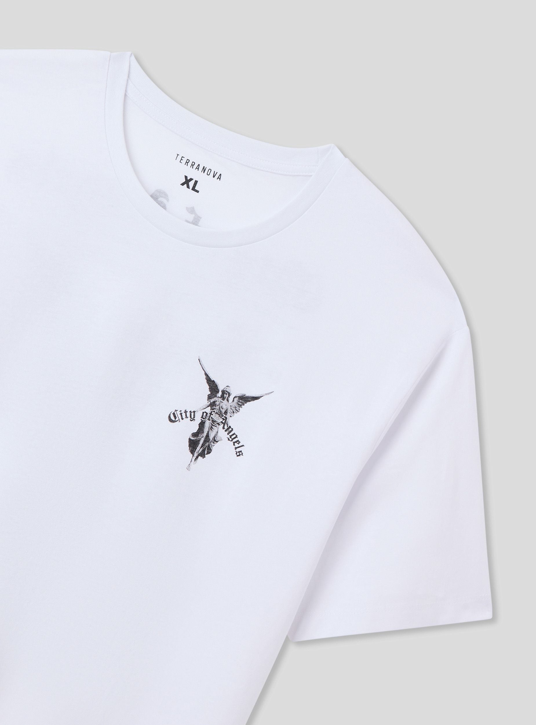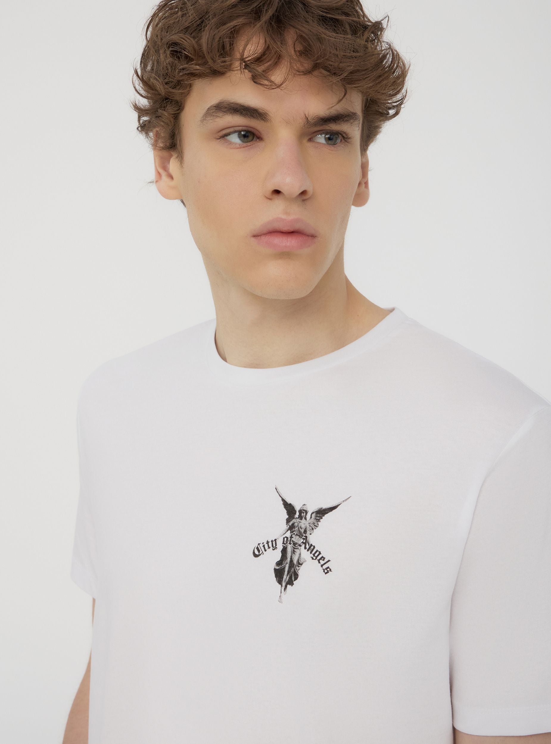 Мъжка тениска с къси ръкави и кръгло деколте. Дизайнът включва малък детайл отпред и голям печат отзад с ангел и текст, идеална за уличен и съвременен вид. Перфектна за свободното време, вечерни излизания или за любителите на градския стил. Лесно се съчетава с дънки, джогъри или шорти за характерно и модно облекло.Детайли