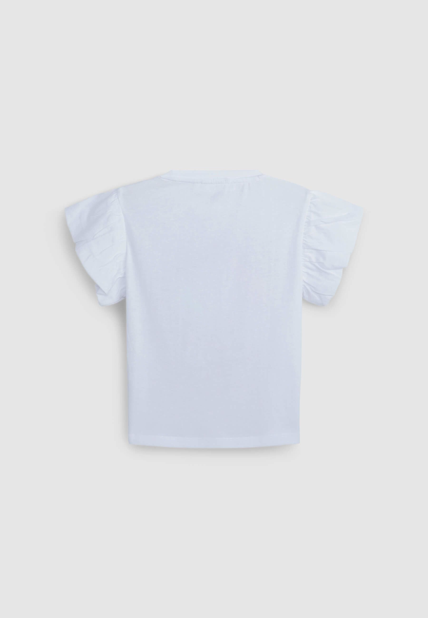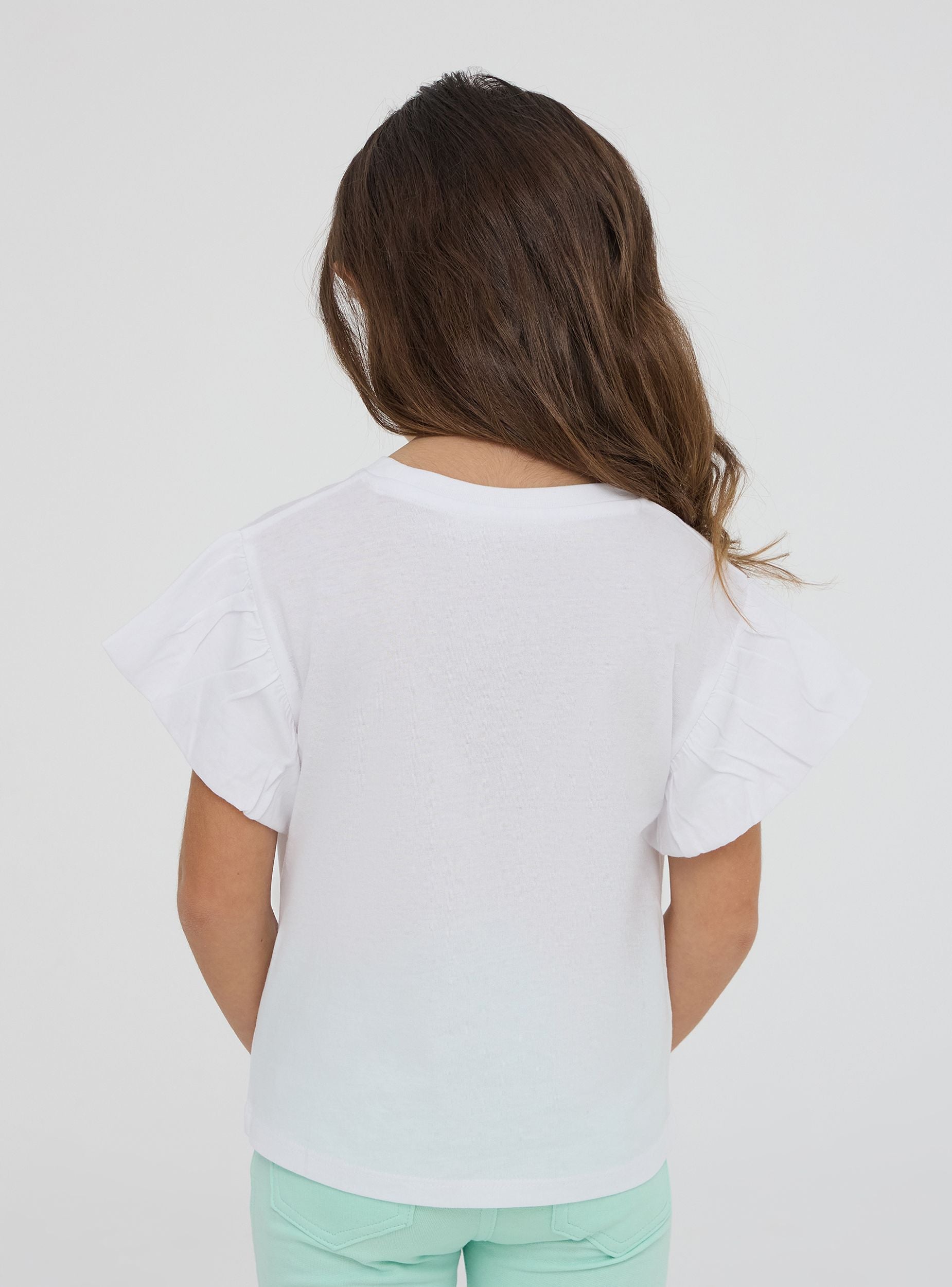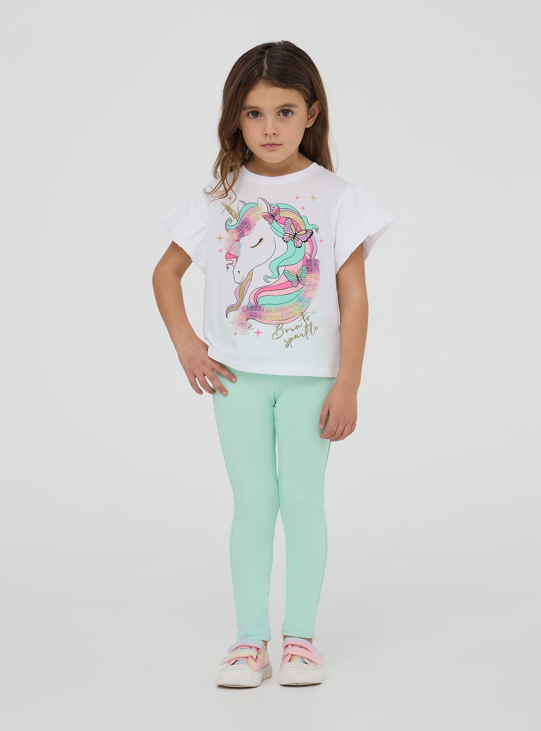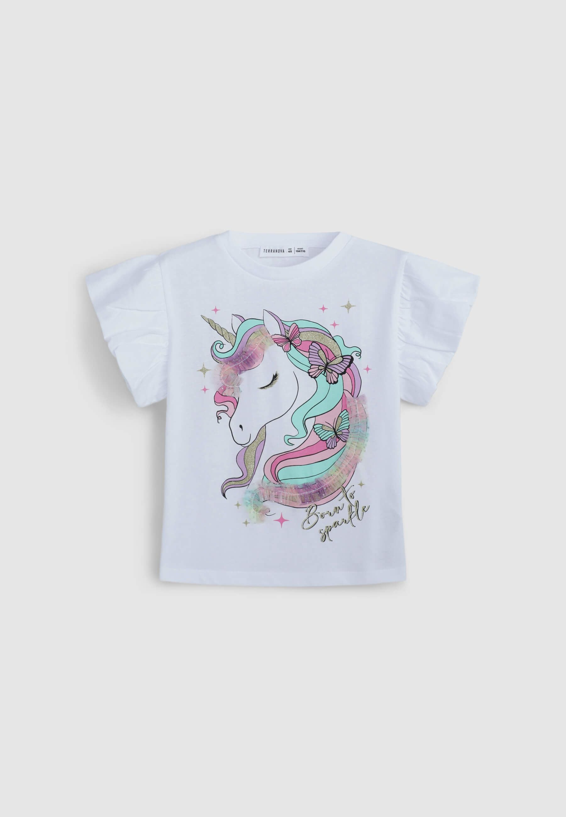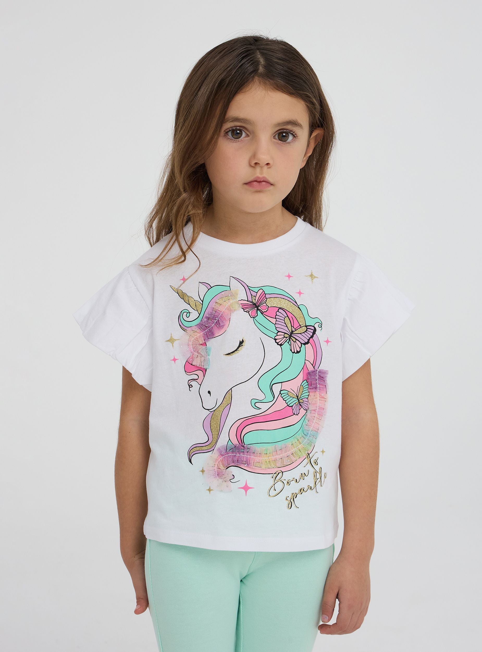 Тениска за момиче с много сладък еднорог, отпечатан отпред, украсен с блестящи детайли и щипка тюл, който придава дълбочина и магия; тази тениска превръща всеки ден в приказно приключение. Късите ръкави с ефект на пеперуда добавят игриво докосване, докато кръглото деколте осигурява максимален комфорт. Идеална за малките мечтателки, които обичат животните и цветовете, тази тениска ще бъде перфектният избор за изразяване на тяхната живописна и креативна личност.Детайли