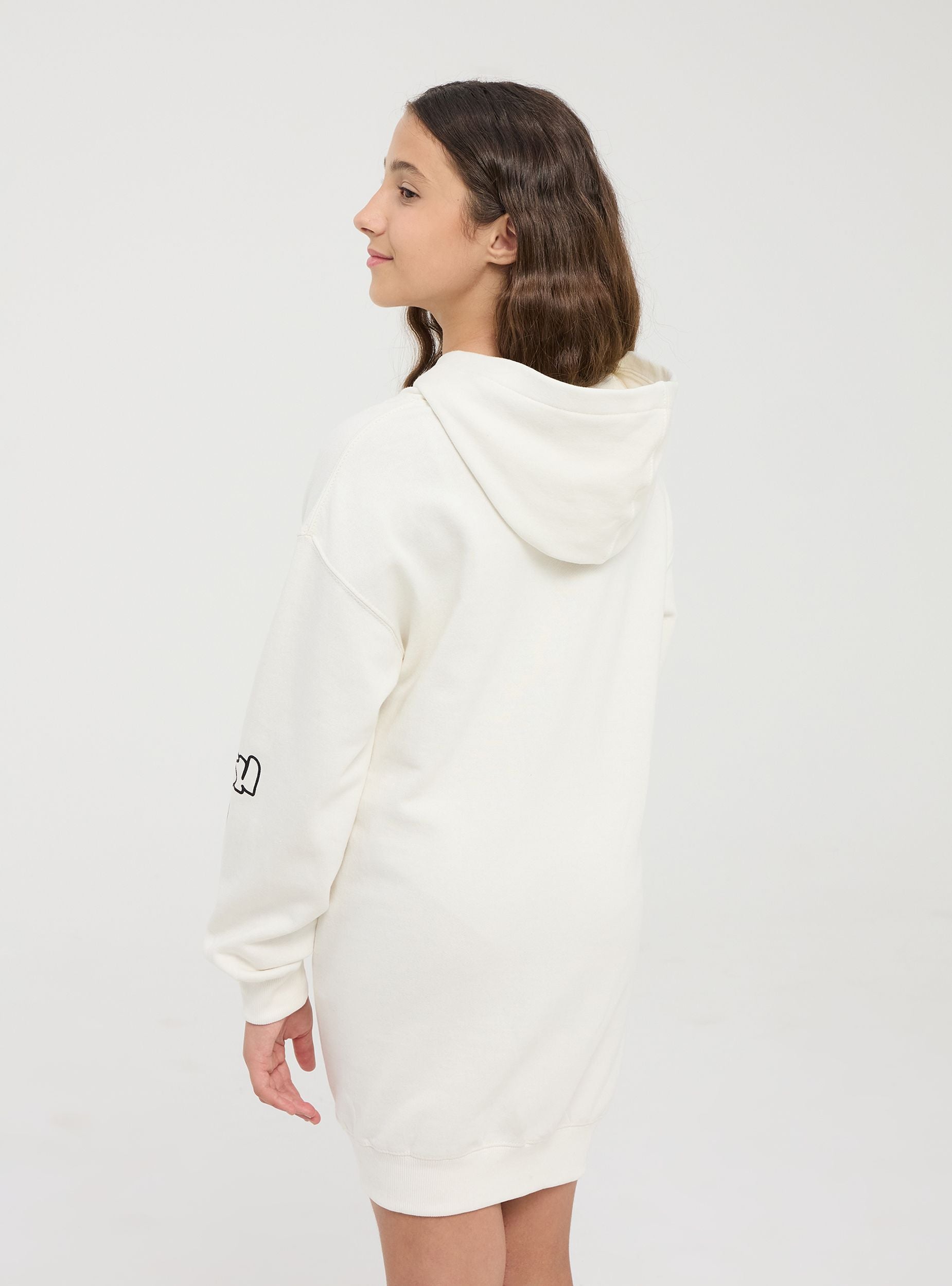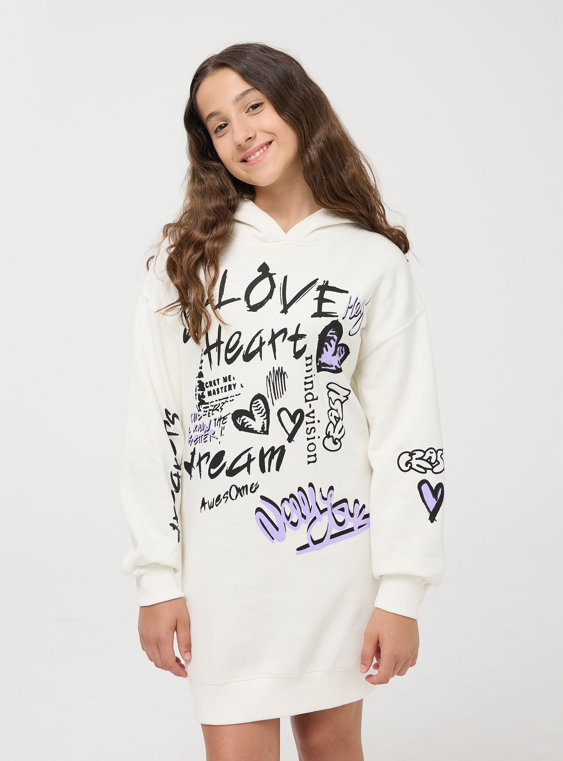 Детска рокля от фланела с качулка, характеризираща се с привлекателен графичен дизайн в стил графити с надписи и рисунки, предлага уникален и модерен вид. Черните и лилавите принтове създават жив контраст. Удобните еластични маншети осигуряват комфортно прилягане. Перфектна за неформални поводи.Детайли