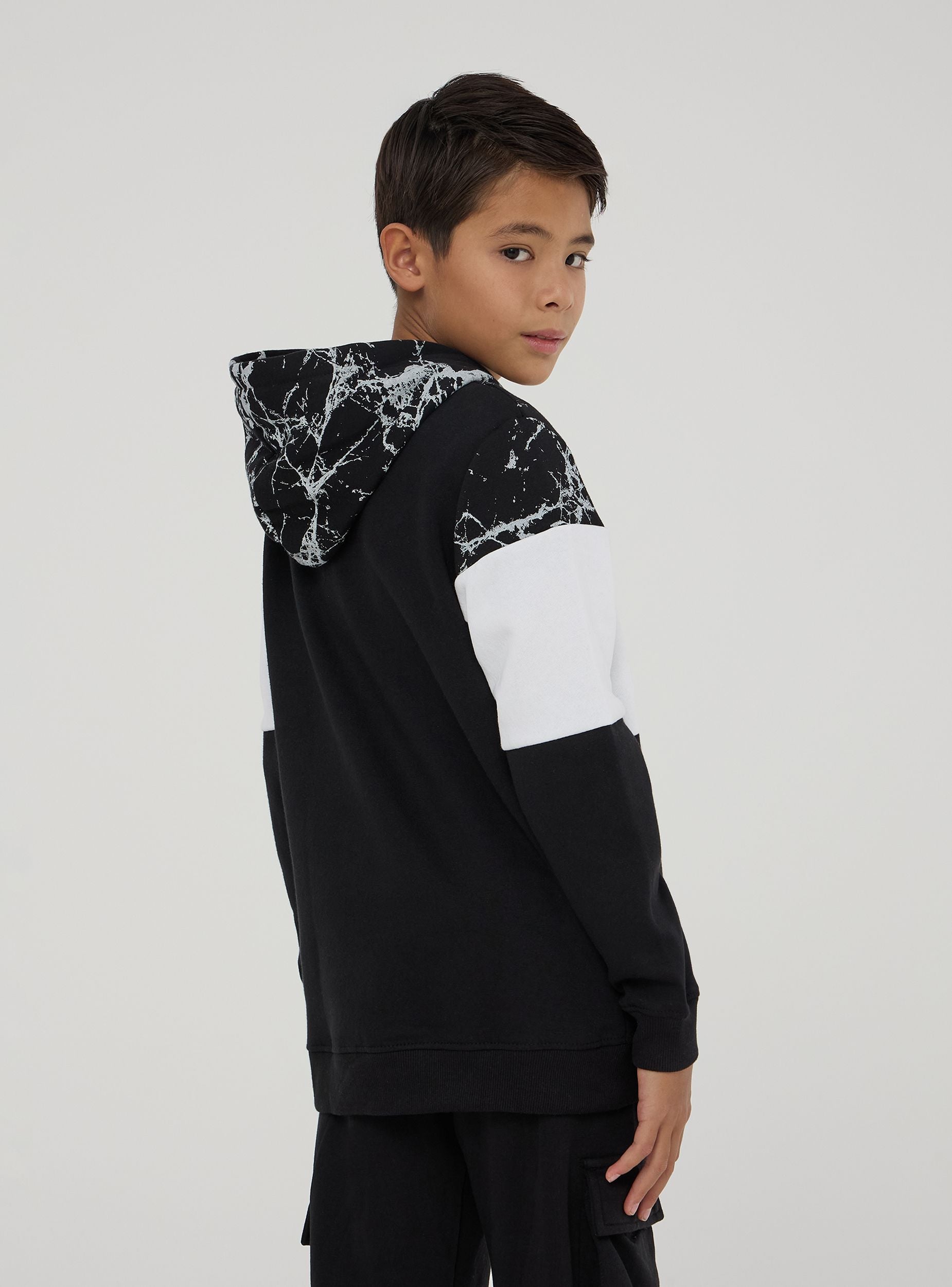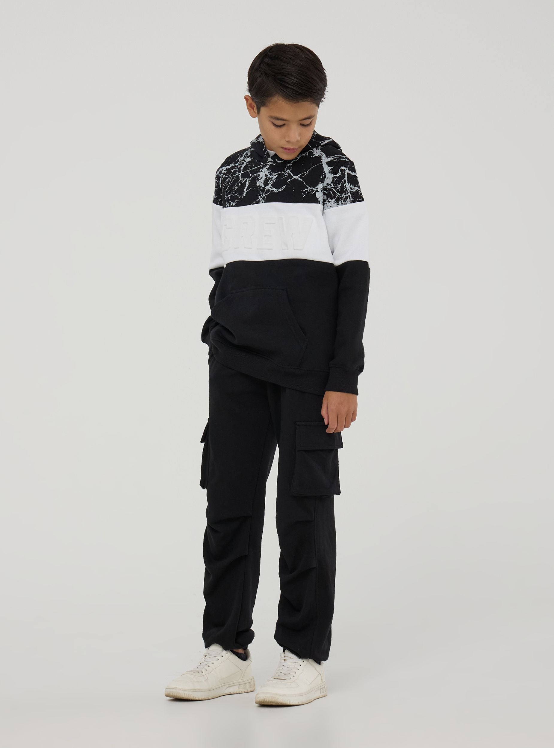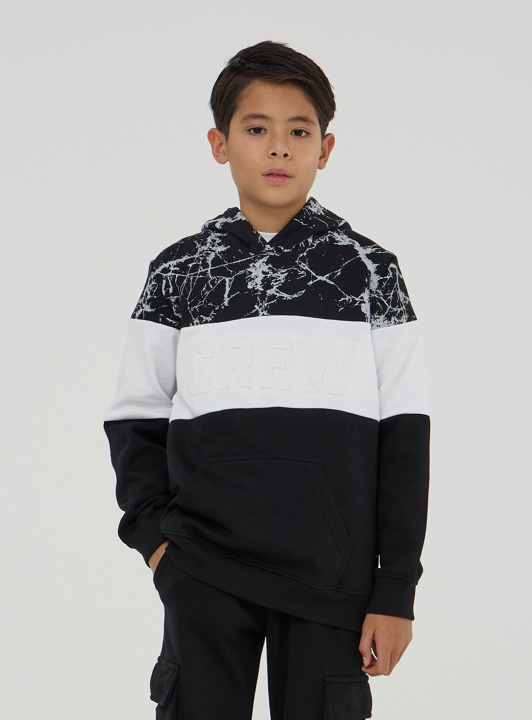 Дебела детска суичър с качулка и дълги ръкави, характеризираща се с блоков цвят. Горната част на суичъра, включително качулката, има мраморен ефект, докато долната част е гладка с релефен надпис "Crew" на гърдите. Суичърът включва преден джоб тип кенгуру за допълнителна практичност и комфорт. Идеален за небрежен и модерен вид, като същевременно поддържа топлината в студените дни.