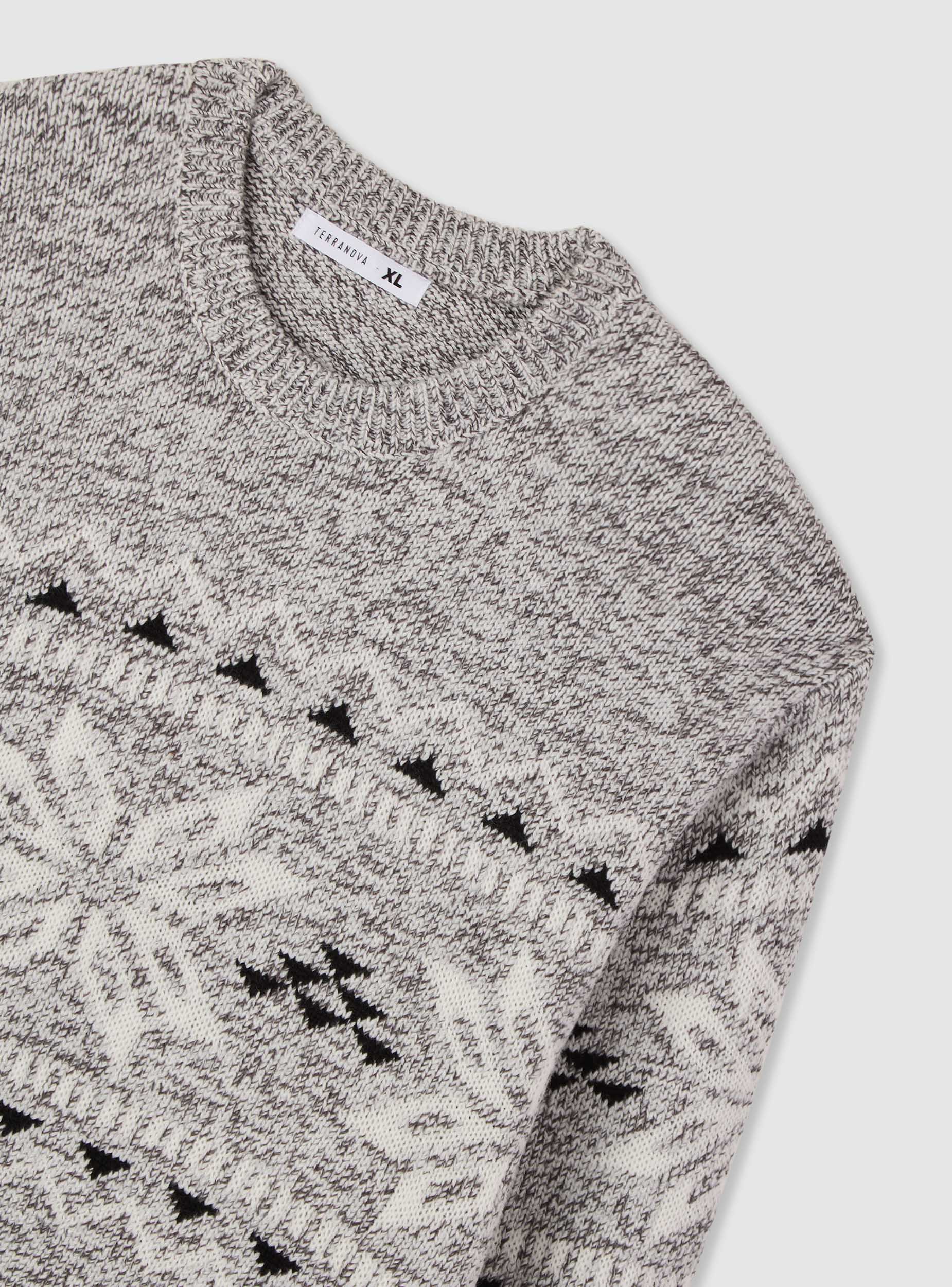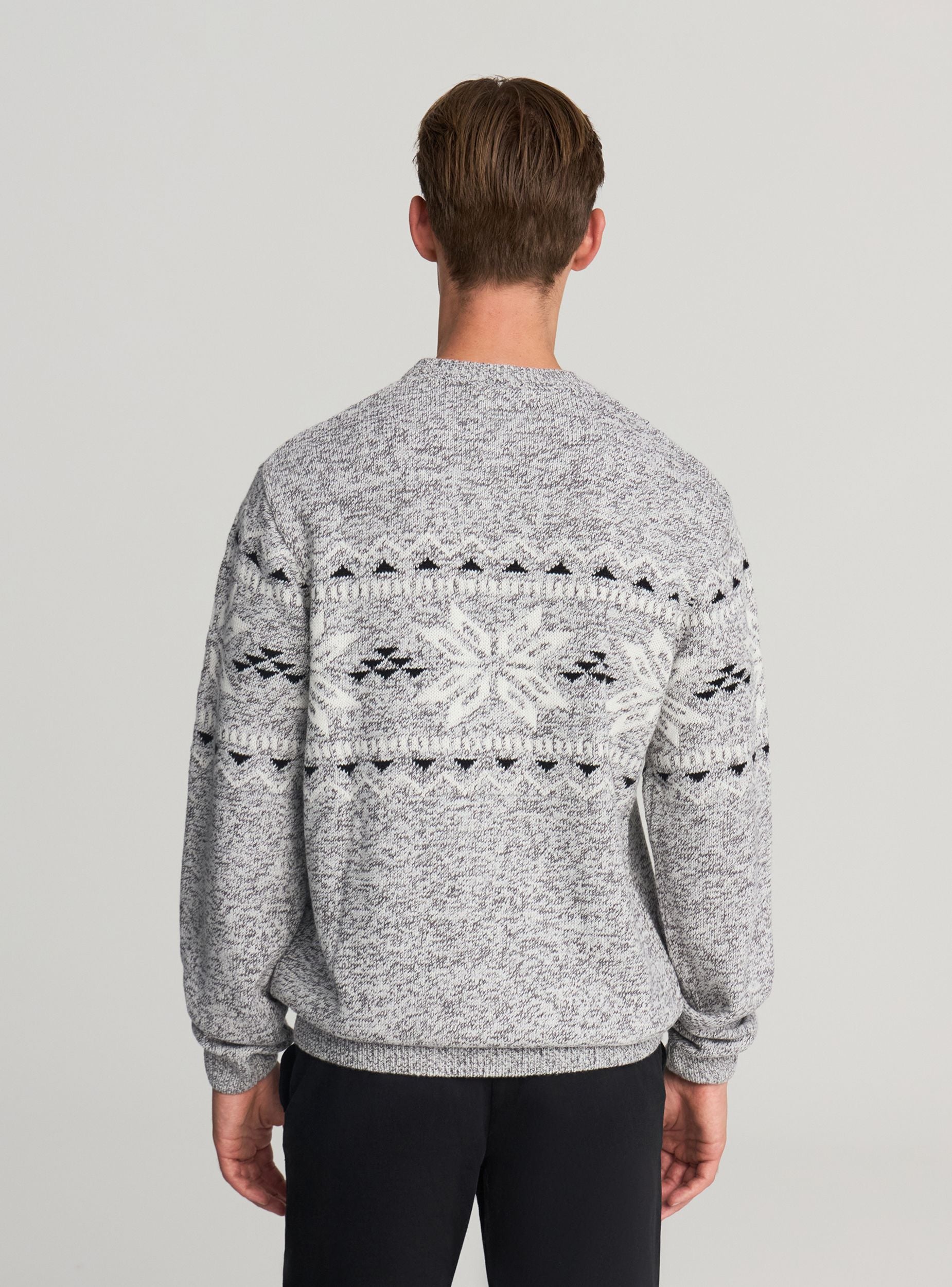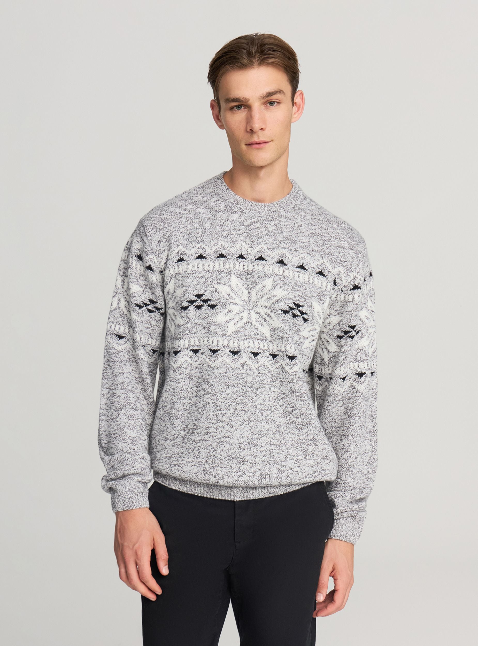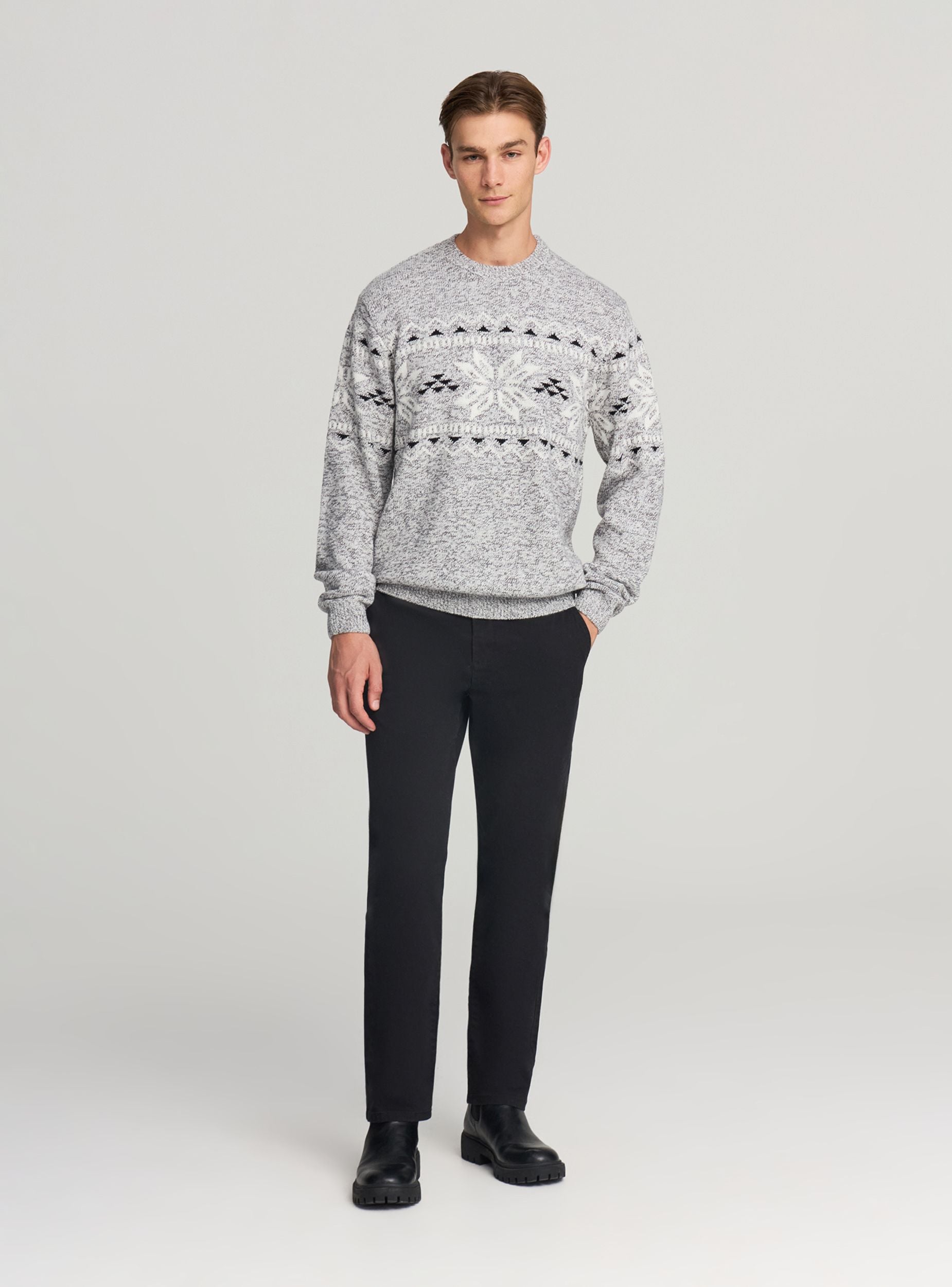 Мъжки пуловер с планински мотив, идеален за зимата и ежедневните дни. Модел с дълги ръкави, с кръгло деколте и рипсени кантове на врата, маншетите и долната част за удобна прилягаща форма. Дизайнът включва централна лента с жакардов мотив и меланжова шарка. Перфектен с дънки и туристически обувки, подходящ за аутдор визия или свободно време.Детайли