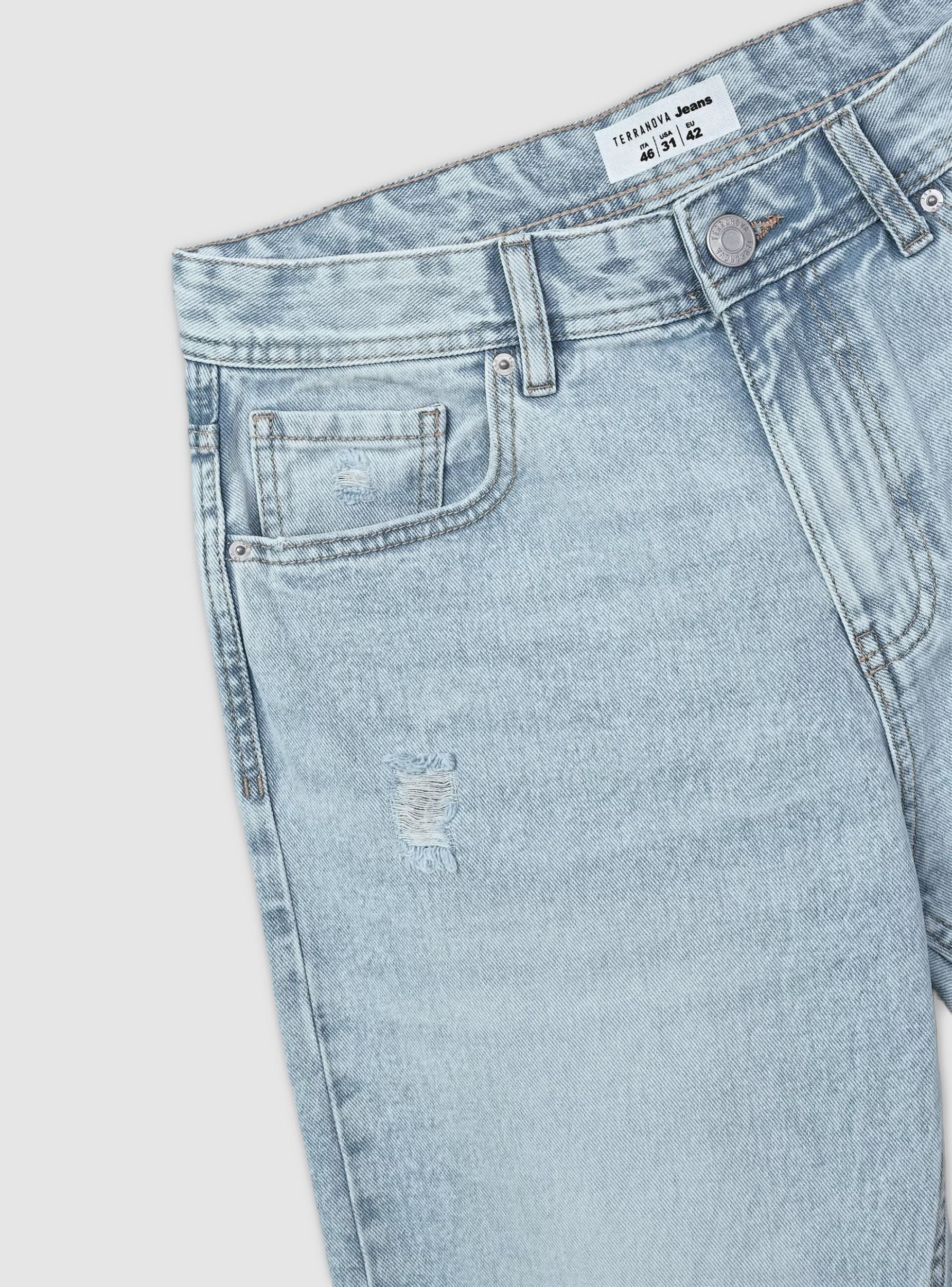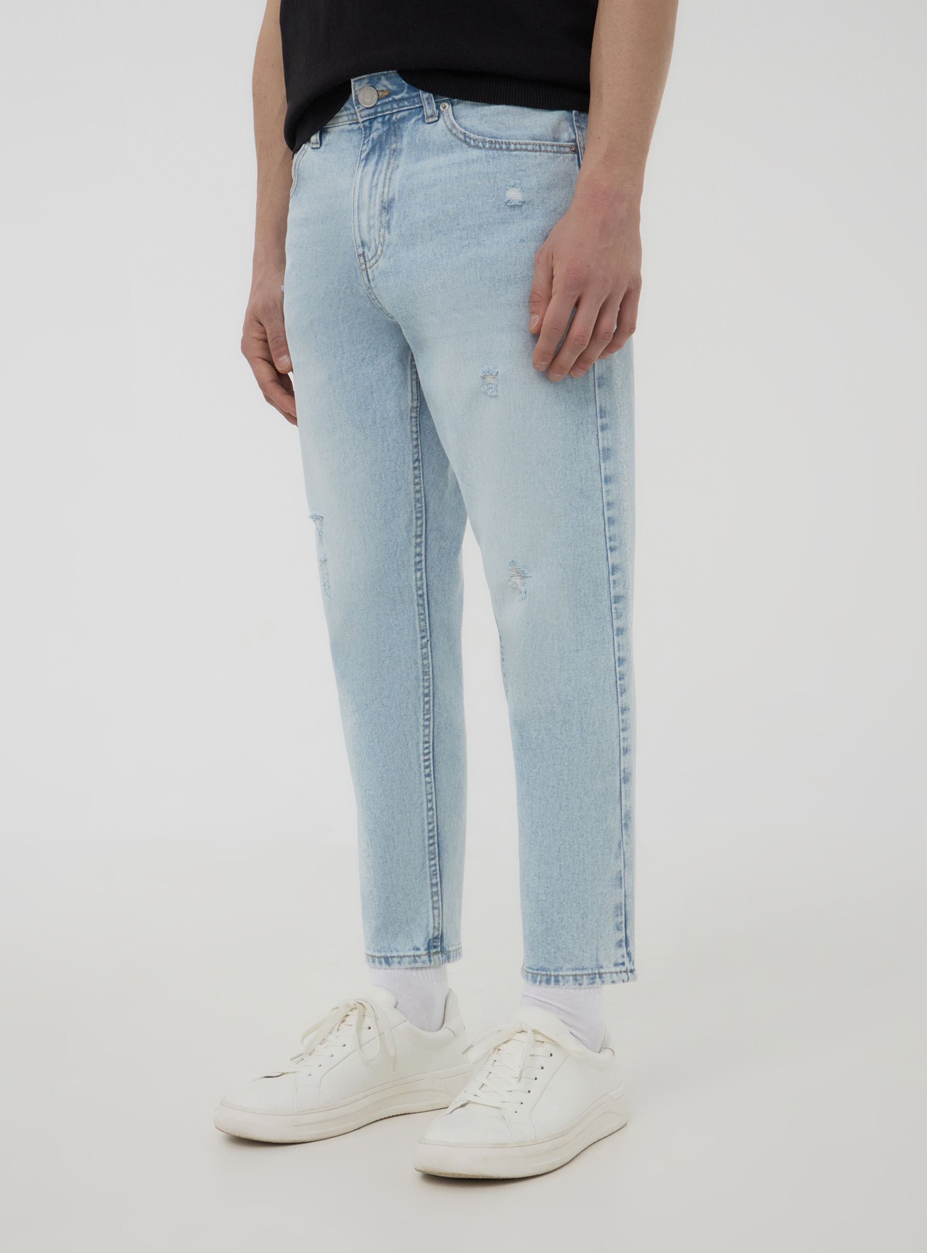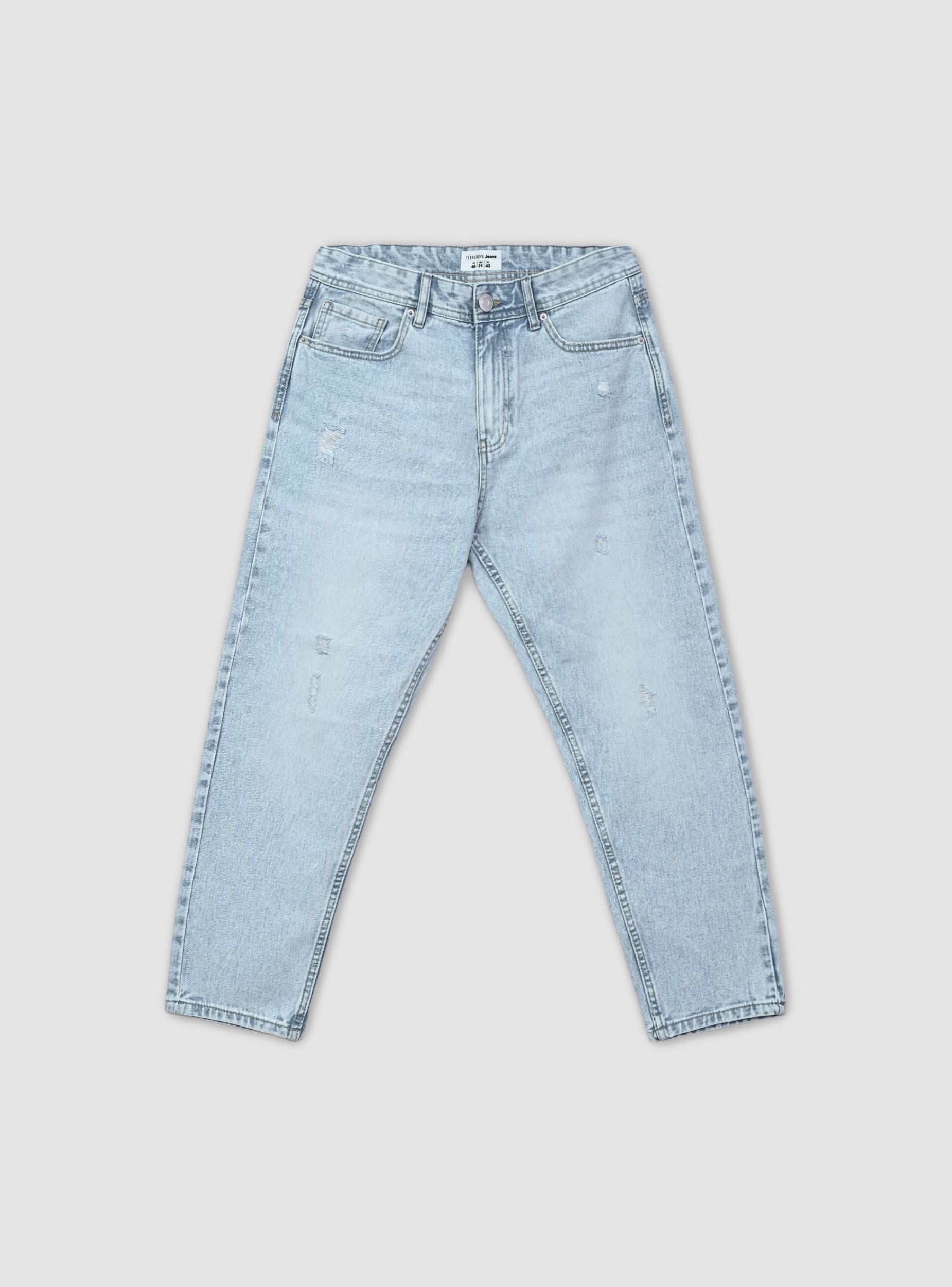 Мъжки дънки с широк крой, идеални за небрежен и релаксиран вид. Характеризирани с колан с ленти, пет практични джоба и закопчаване с копче и цип, те се отличават с светло деним и малки разкъсвания, които добавят модерен щрих. Перфектни за съчетаване с тениски и маратонки за свободното време или с лека риза за градски и универсален аутфит. Подходящи за неофициални и ежедневни поводи.Детайли