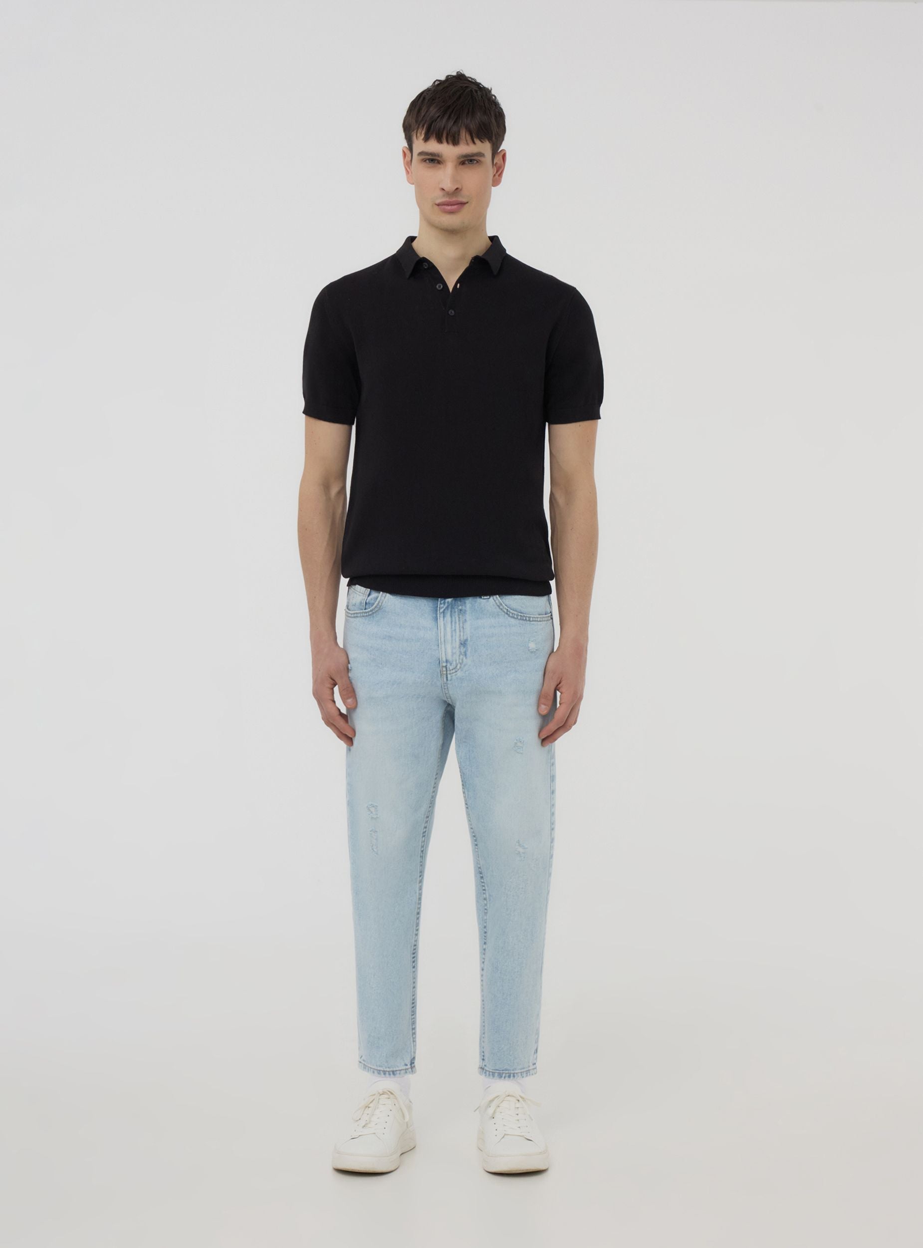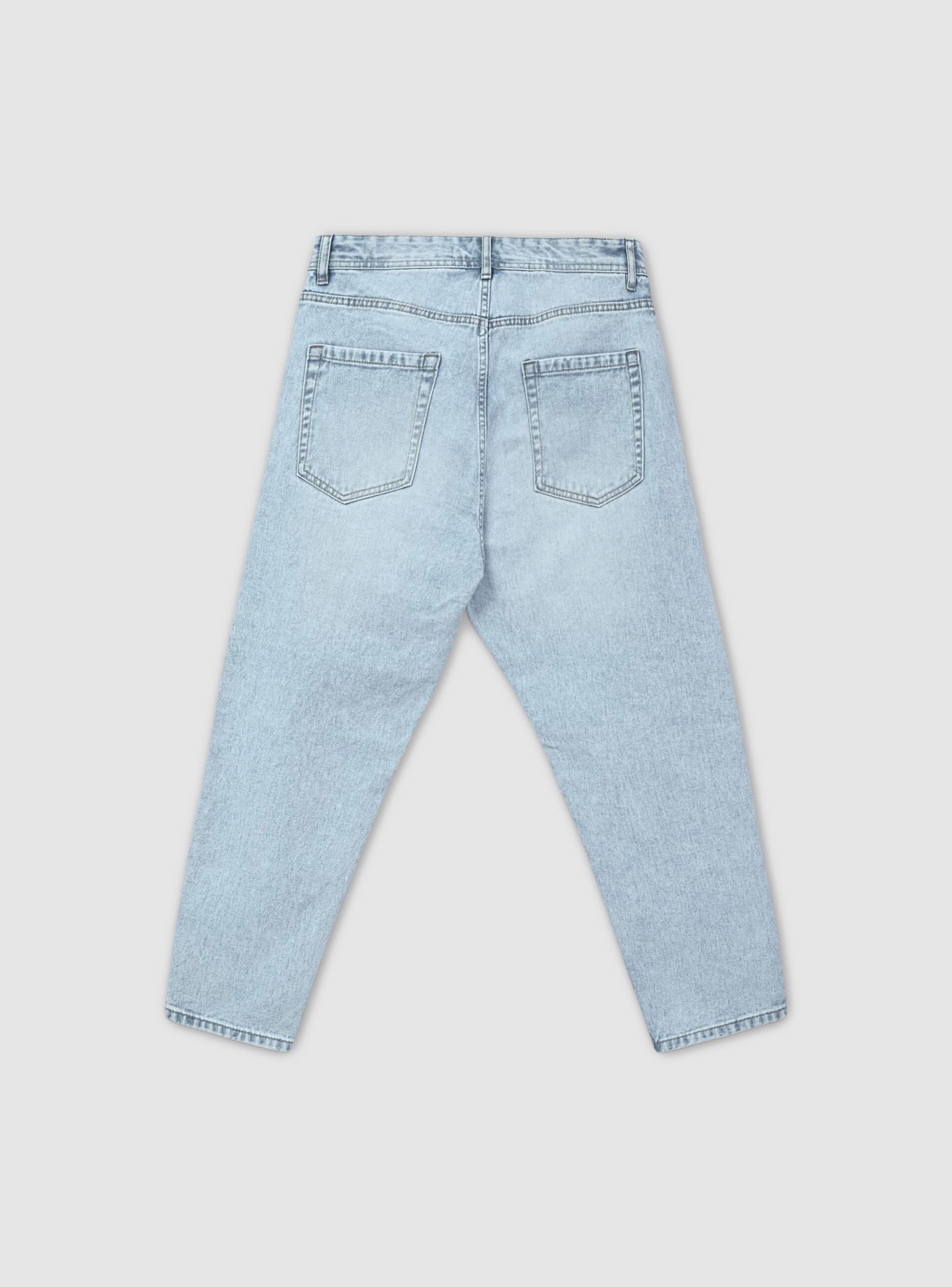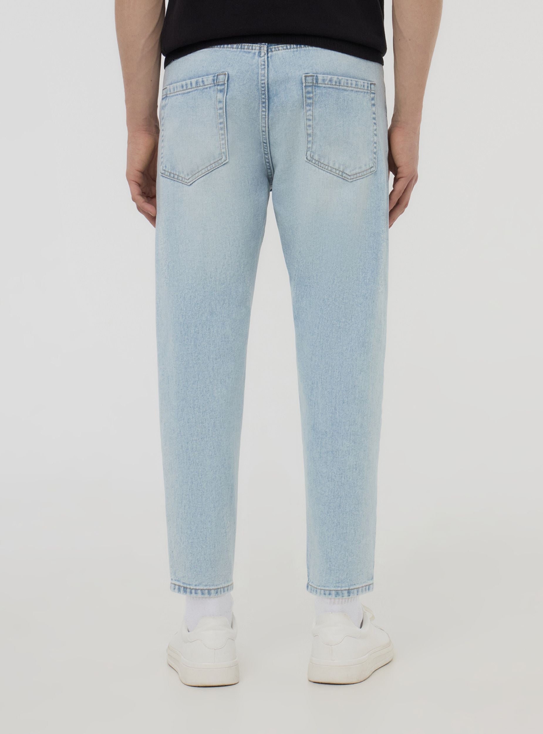 Мъжки дънки с широк крой, идеални за небрежен и релаксиран вид. Характеризирани с колан с ленти, пет практични джоба и закопчаване с копче и цип, те се отличават с светло деним и малки разкъсвания, които добавят модерен щрих. Перфектни за съчетаване с тениски и маратонки за свободното време или с лека риза за градски и универсален аутфит. Подходящи за неофициални и ежедневни поводи.Детайли