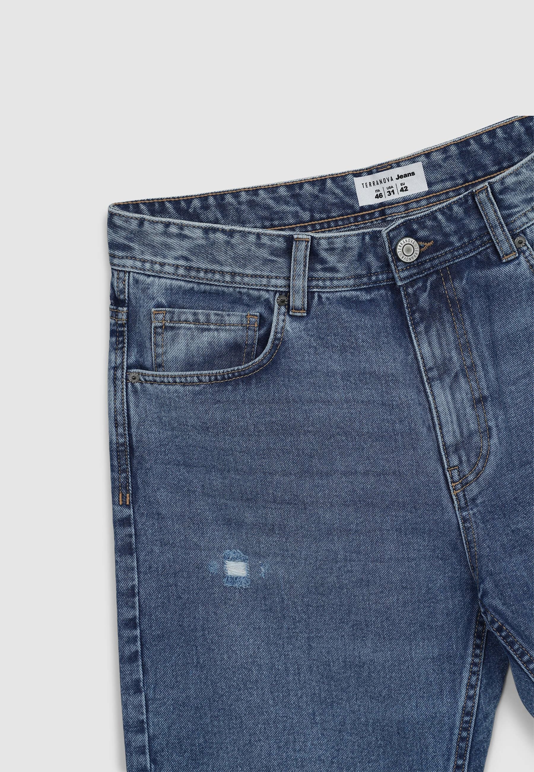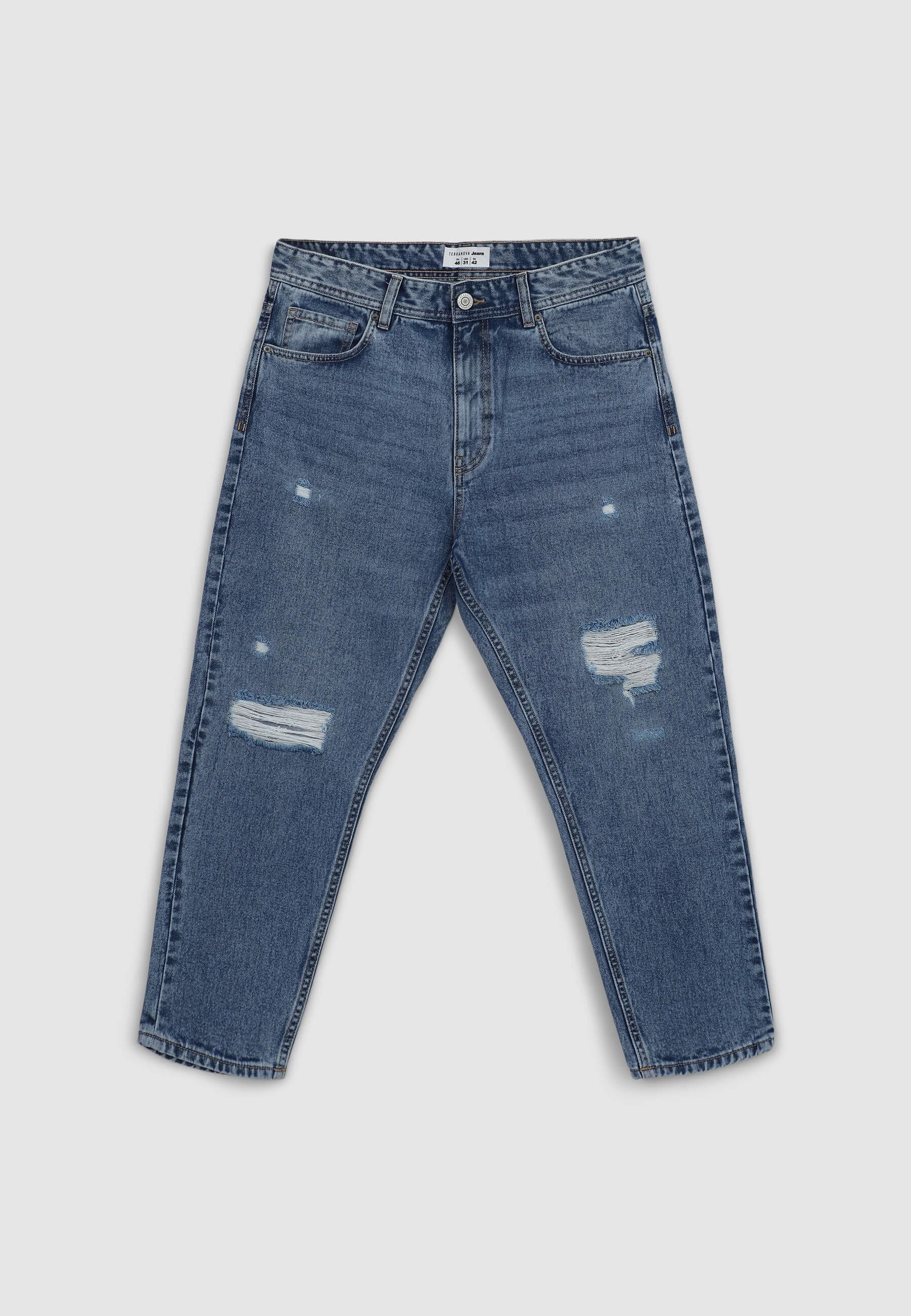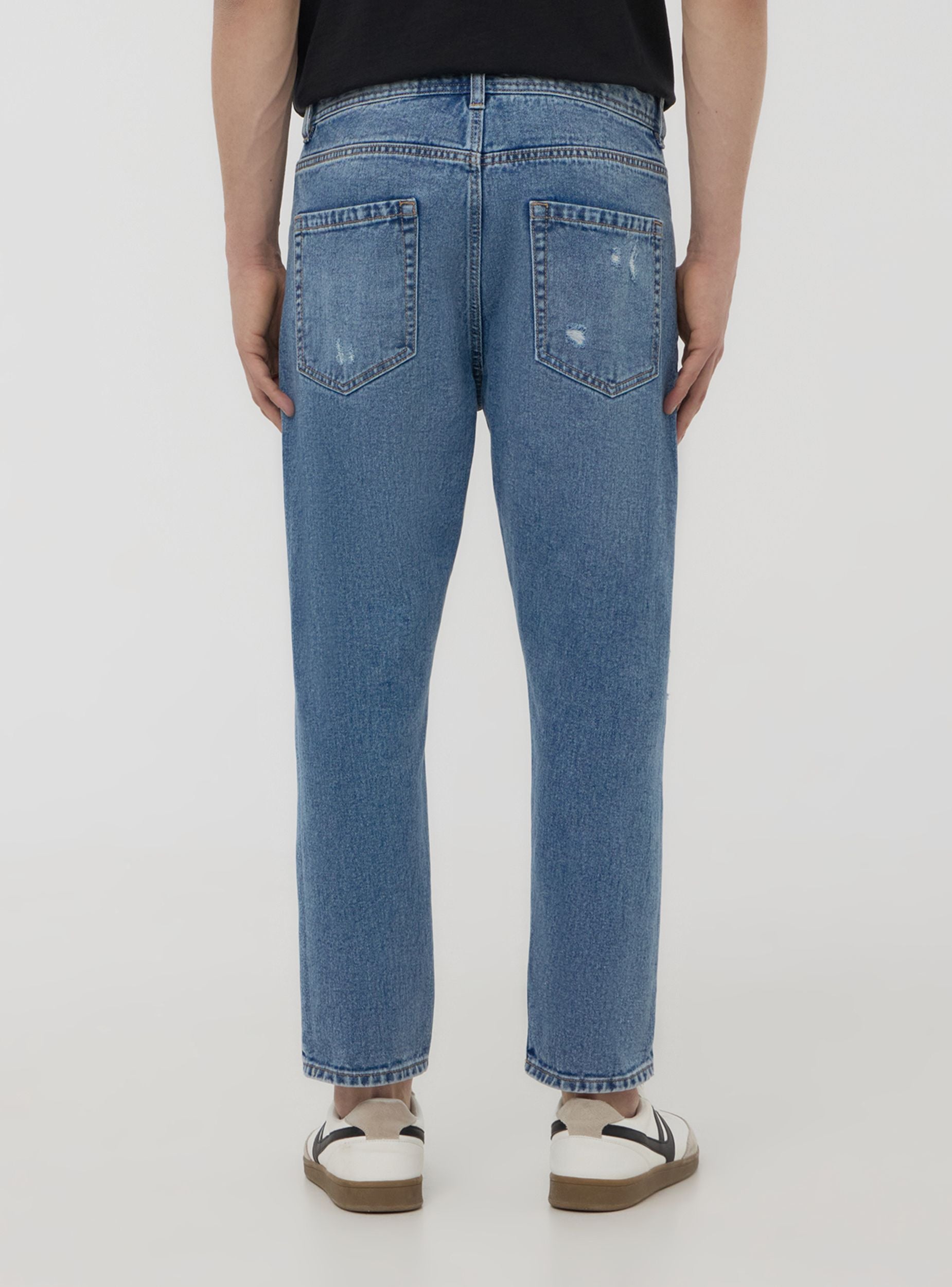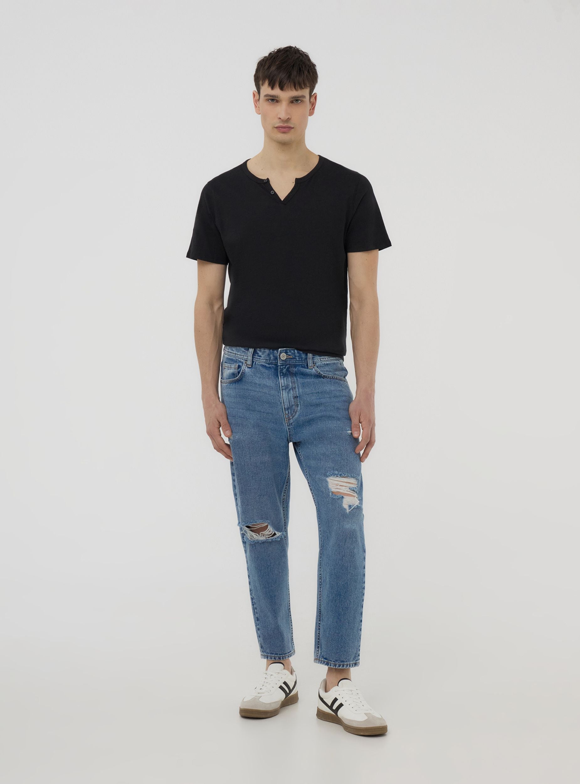 Дънки за мъже с широк кройка, идеални за небрежен и модерен вид. С джобове на талията, пет функционални джоба и закопчаване с копче и цип, те имат детайли с дупки, които добавят характер. Идеални за съчетаване с суитшърти и маратонки за свободното време или с риза и яке за градски и неформален аутфит. Подходящи за различни неофициални поводи.Детайли