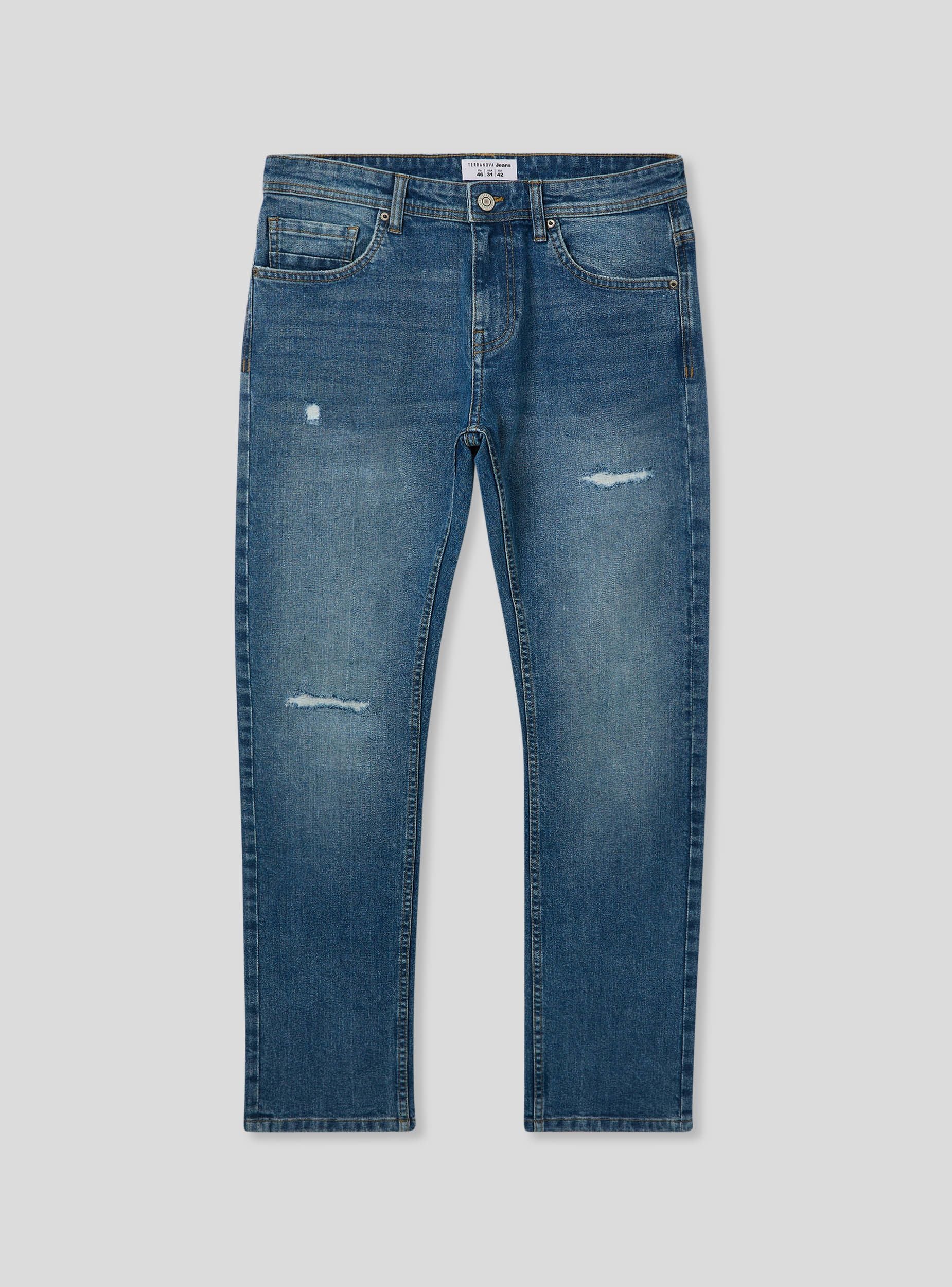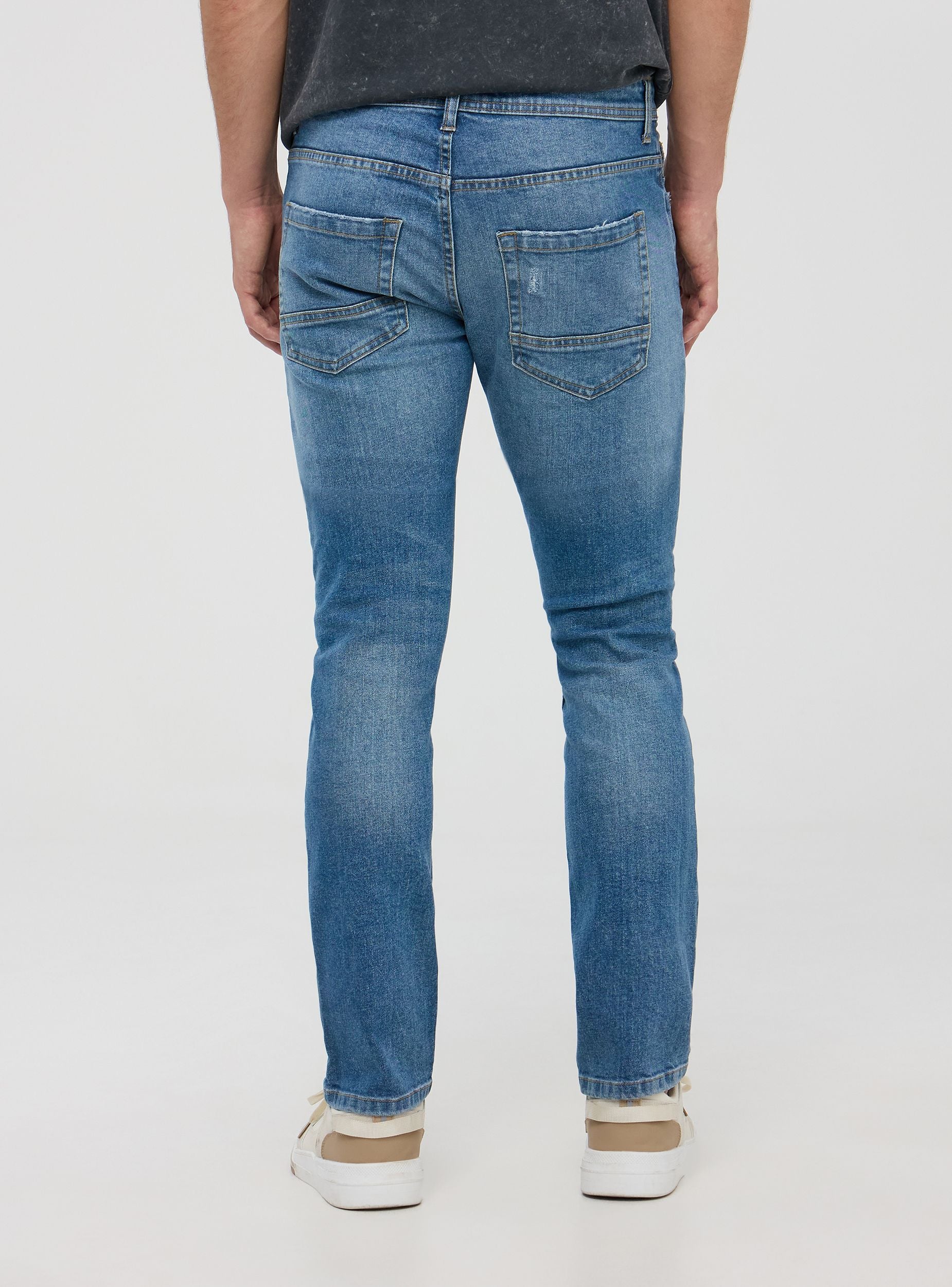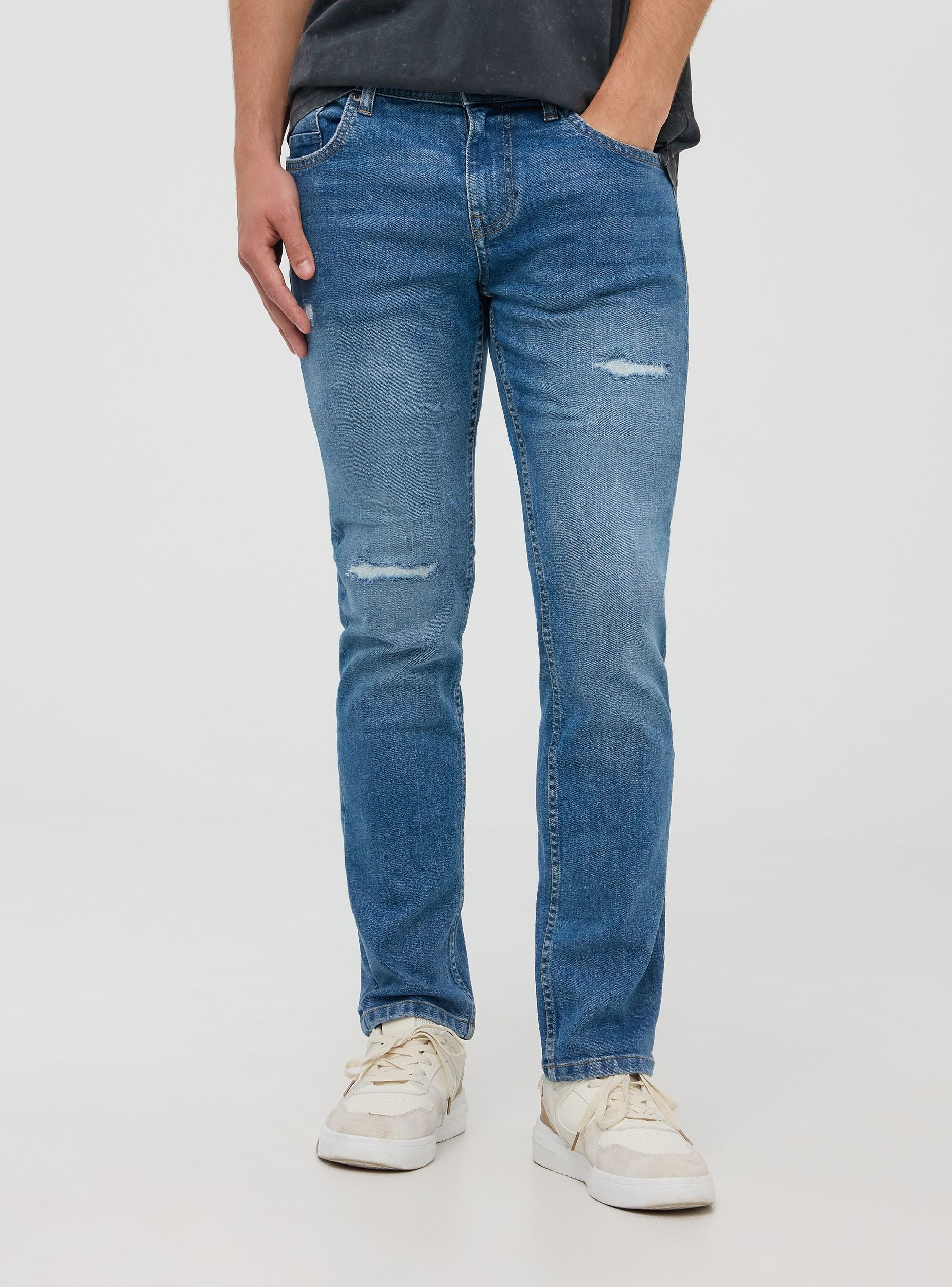 Дънки за мъже, стандартен силует, в средно син деним, изработени от леко еластичен памук. Частта е характеризирана с износен ефект с дискретни цепки на коленете и детайли на избледняване, които придават вид на носено. С пет функционални джоба и закопчаване с цип и копче. Контрастните шевове добавят нотка стил. Перфектни за неформален и градски вид.Детайли