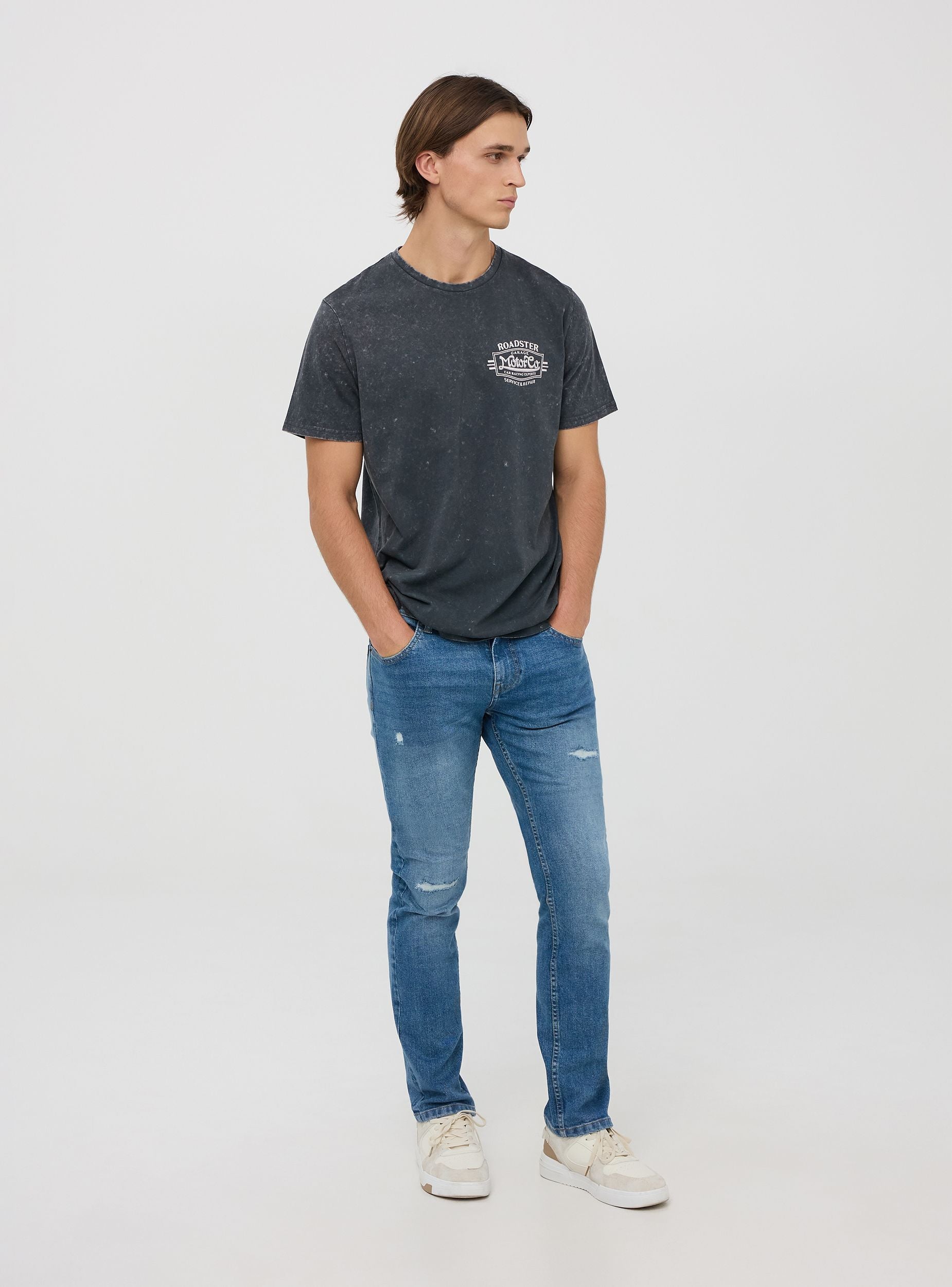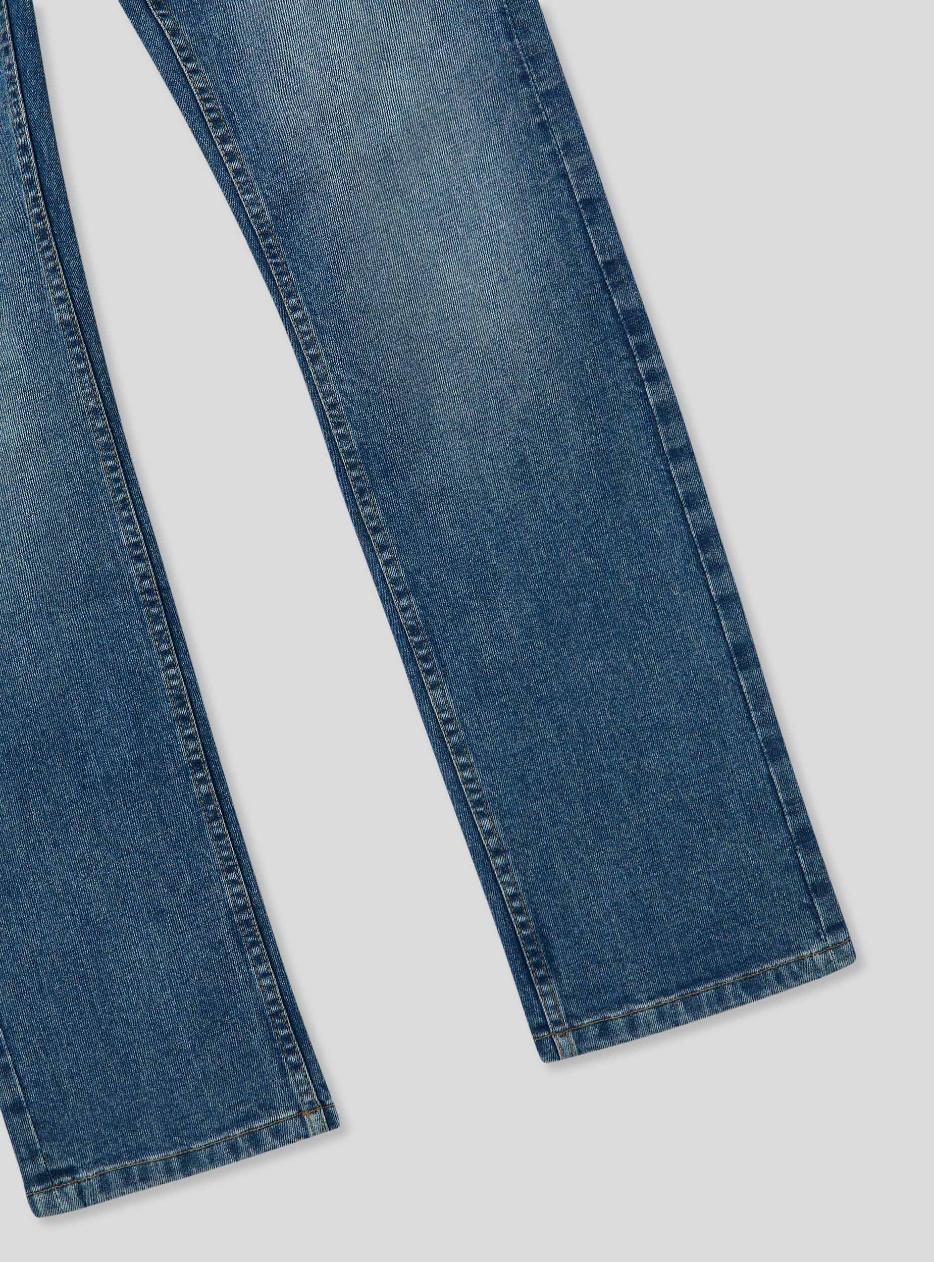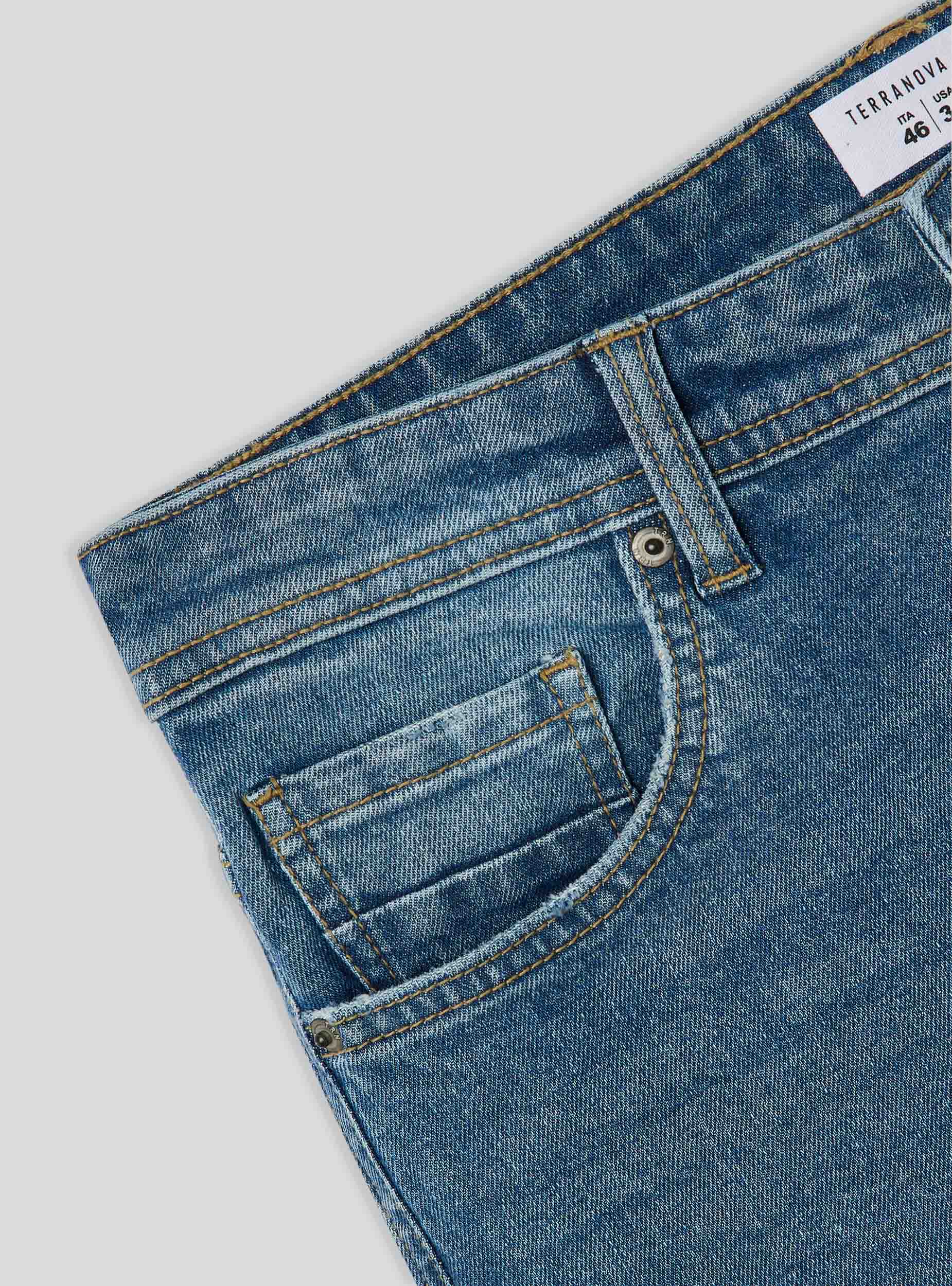 Дънки за мъже, стандартен силует, в средно син деним, изработени от леко еластичен памук. Частта е характеризирана с износен ефект с дискретни цепки на коленете и детайли на избледняване, които придават вид на носено. С пет функционални джоба и закопчаване с цип и копче. Контрастните шевове добавят нотка стил. Перфектни за неформален и градски вид.Детайли