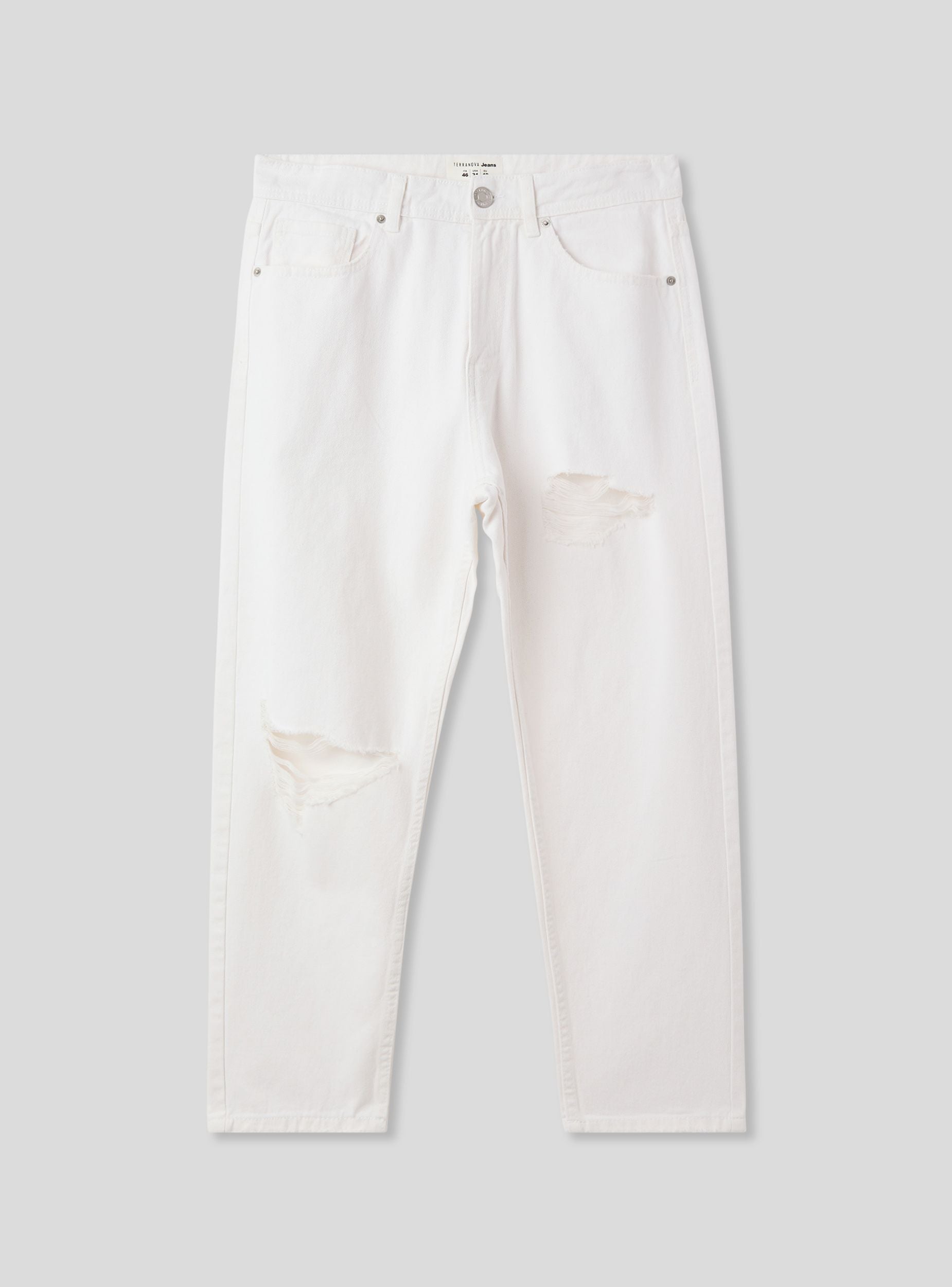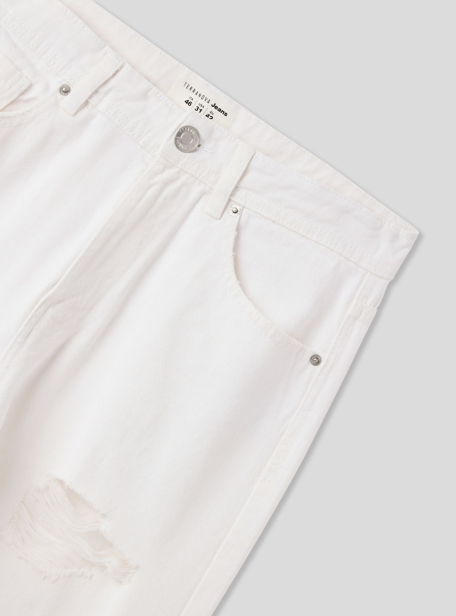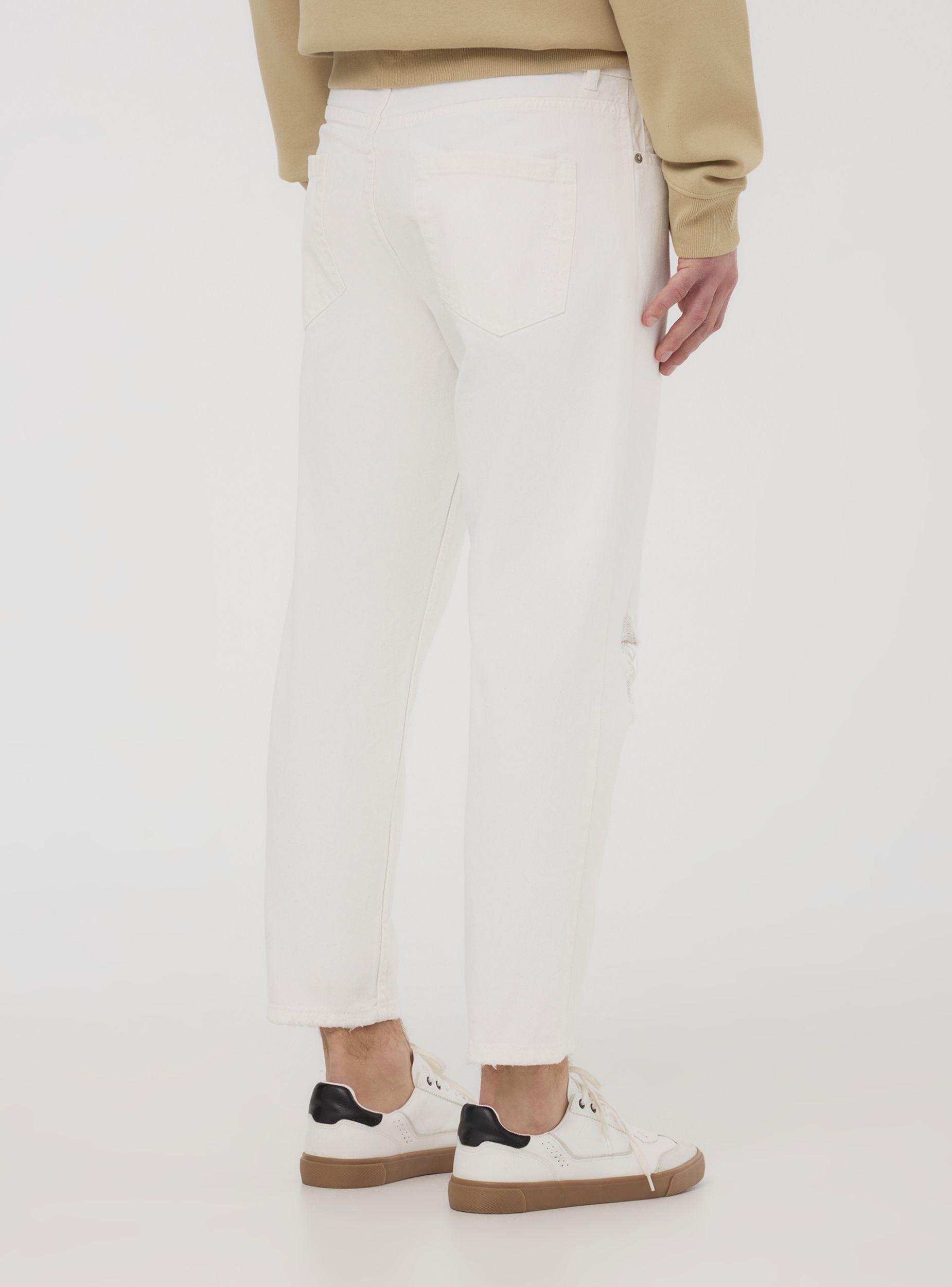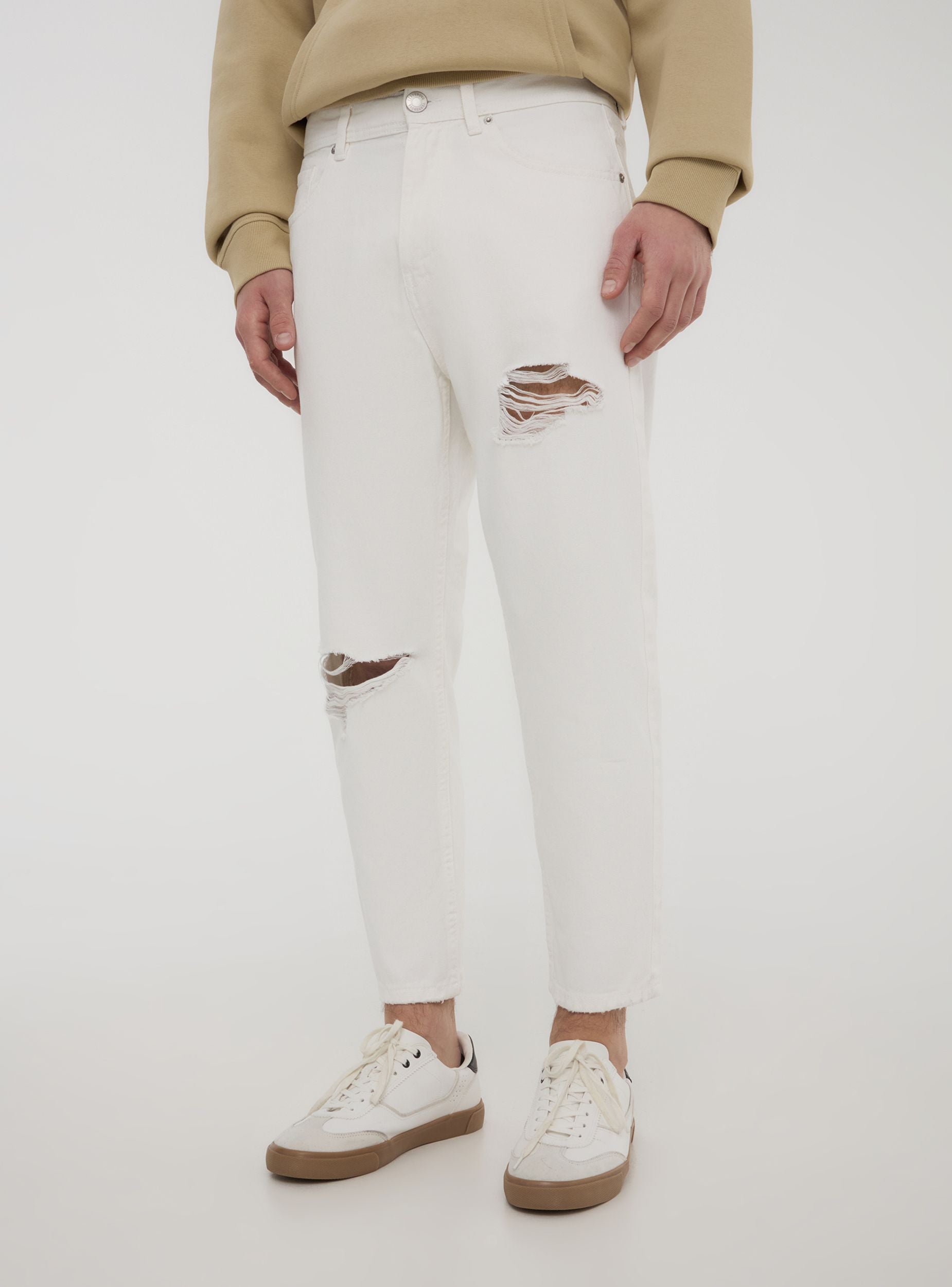 Мъжки дънки с широк силует, идеални за ежедневен и съвременен стил. Разполагат с колани на талията, пет функционални джоба и закопчаване с копче и цип, отличават се с детайли на скъсвания, които добавят смел акцент. Перфектни за комбиниране с големи суитшърти и маратонки за свободното време или с тениска и яке за градски аутфит. Подходящи за различни неформални поводи.Детайли