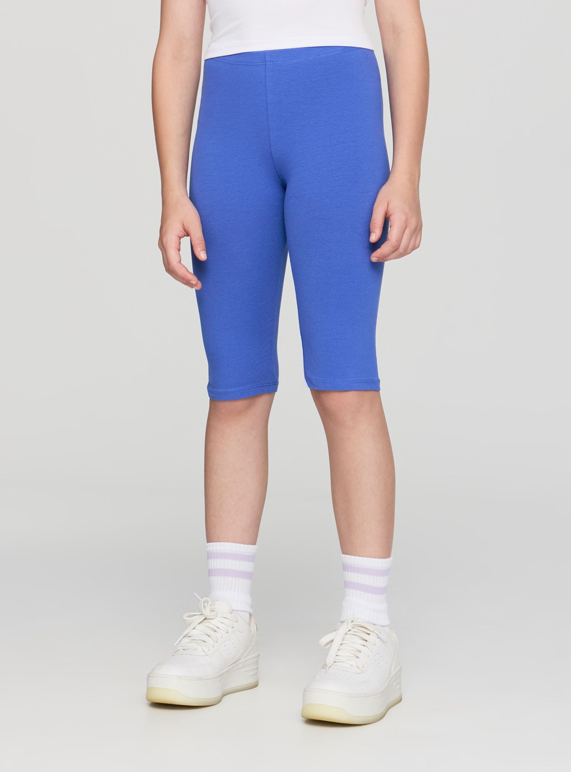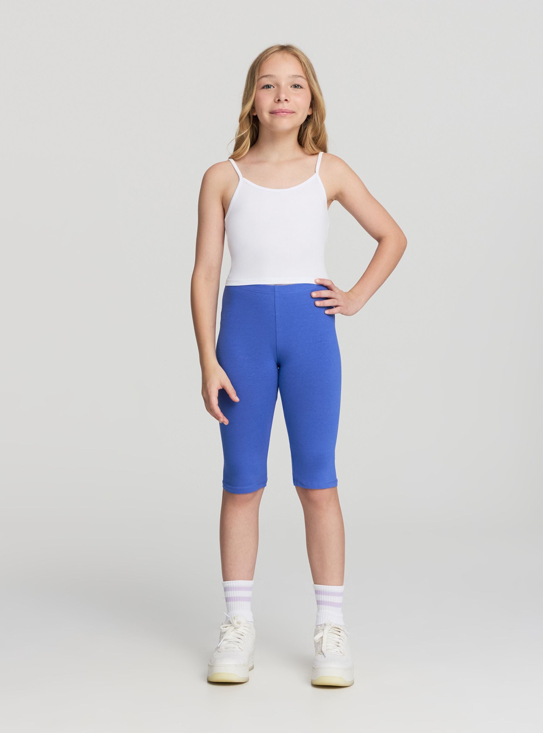 Легинси за момичета, идеални за летните дни или за спортни активности. Моделът с еластичен плат предлага плътно и удобно прилягане, перфектно за свободно движение. Едноцветният дизайн ги прави универсални и лесни за комбиниране с тениски или топове, за да създадете практични и модерни визии.