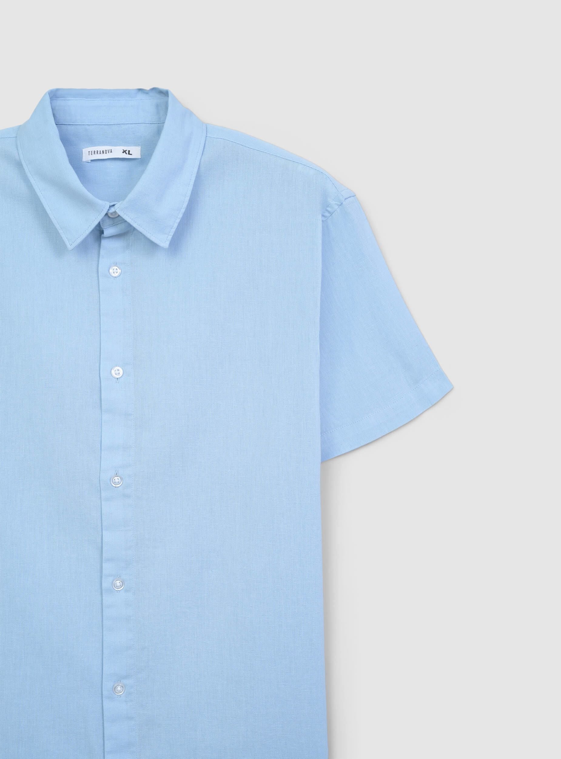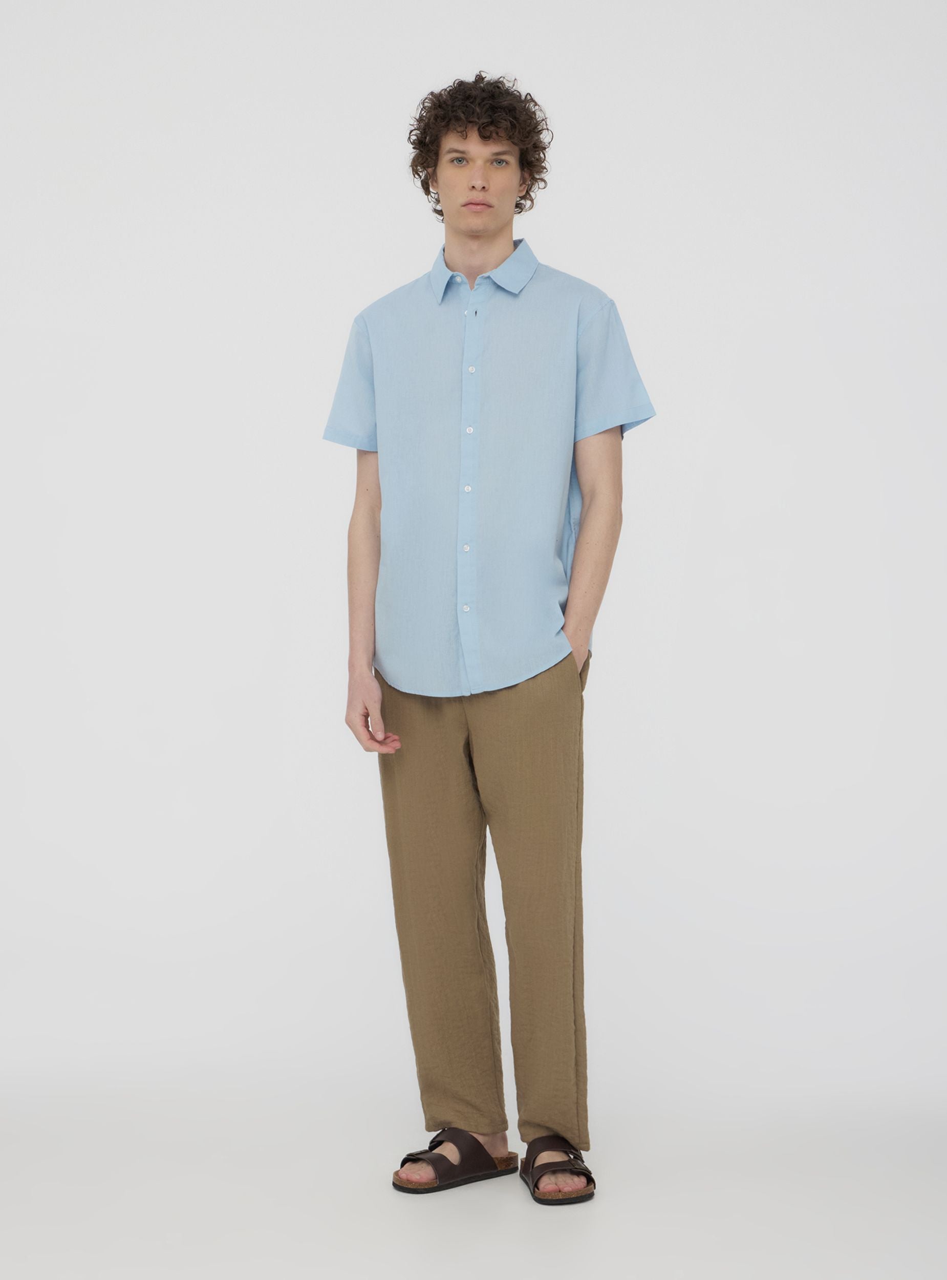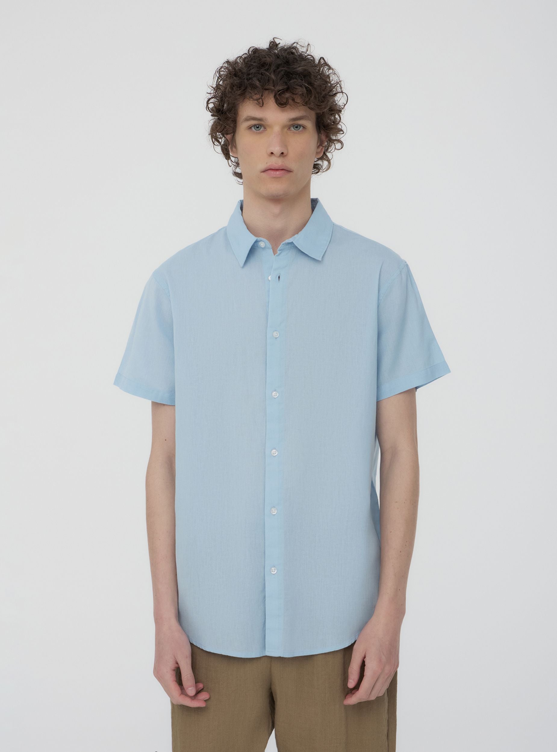 Мъжка риза от памук с едноцветен дизайн, къси ръкави, класически яка и закопчаване с копчета. Перфектна за неформален или полуформален вид, лесно се съчетава с дънки, чино или елегантни панталони, подходяща за различни поводи, от работа до свободно време. Минималистичният и внимателно проектиран дизайн осигурява стил, който винаги е актуален, идеален за тези, които искат универсален и изтънчен аутфит.Детайли