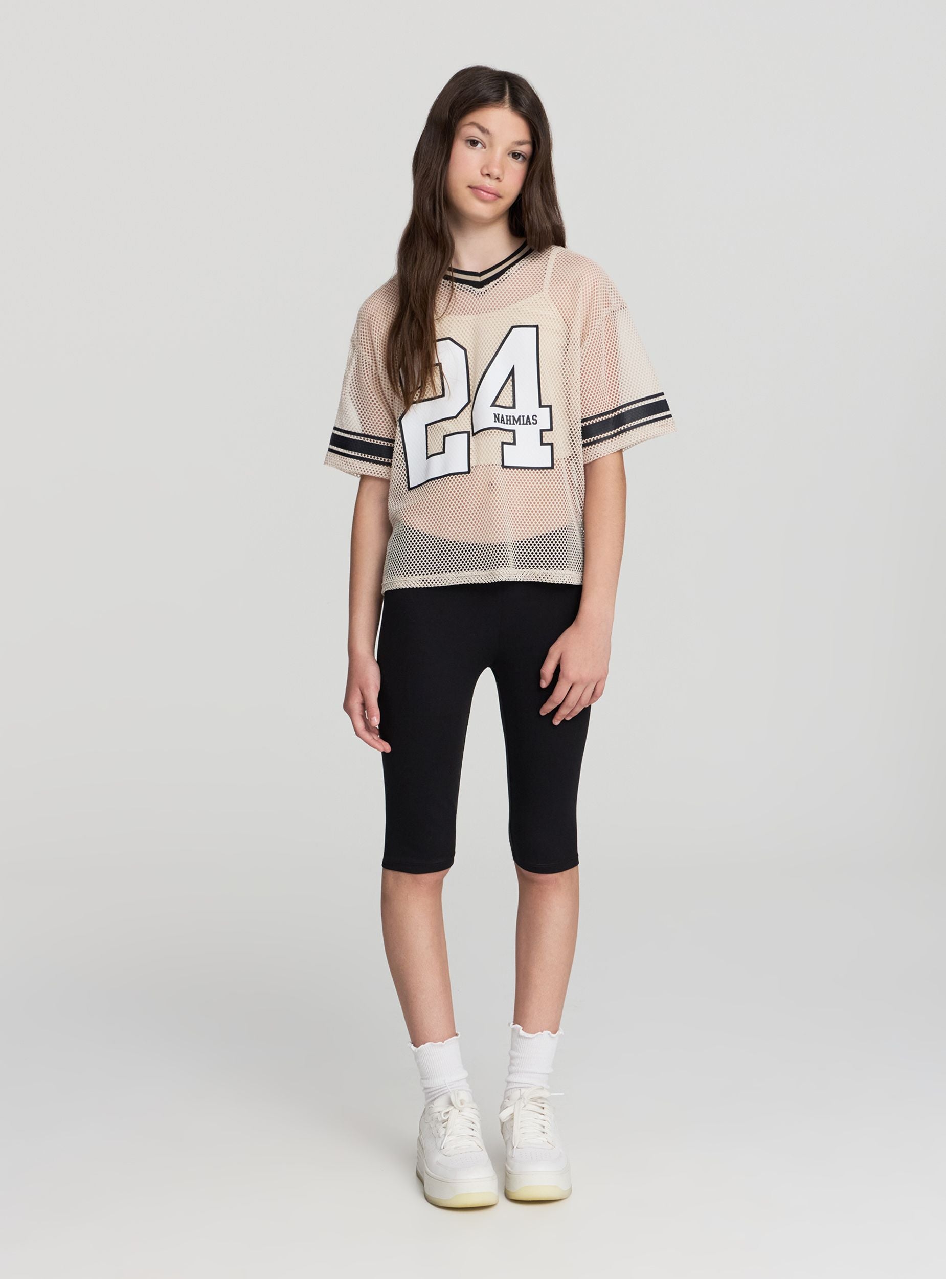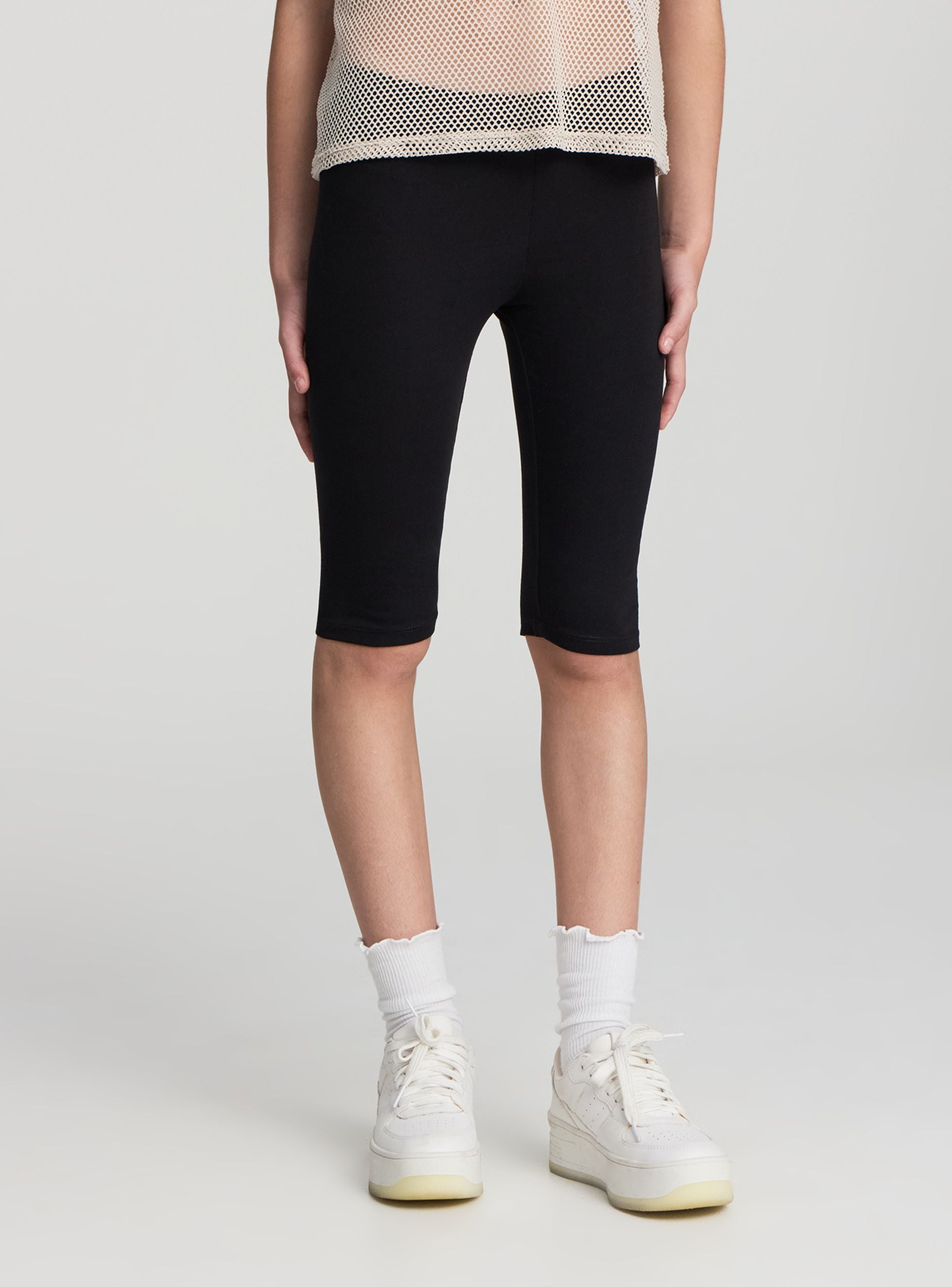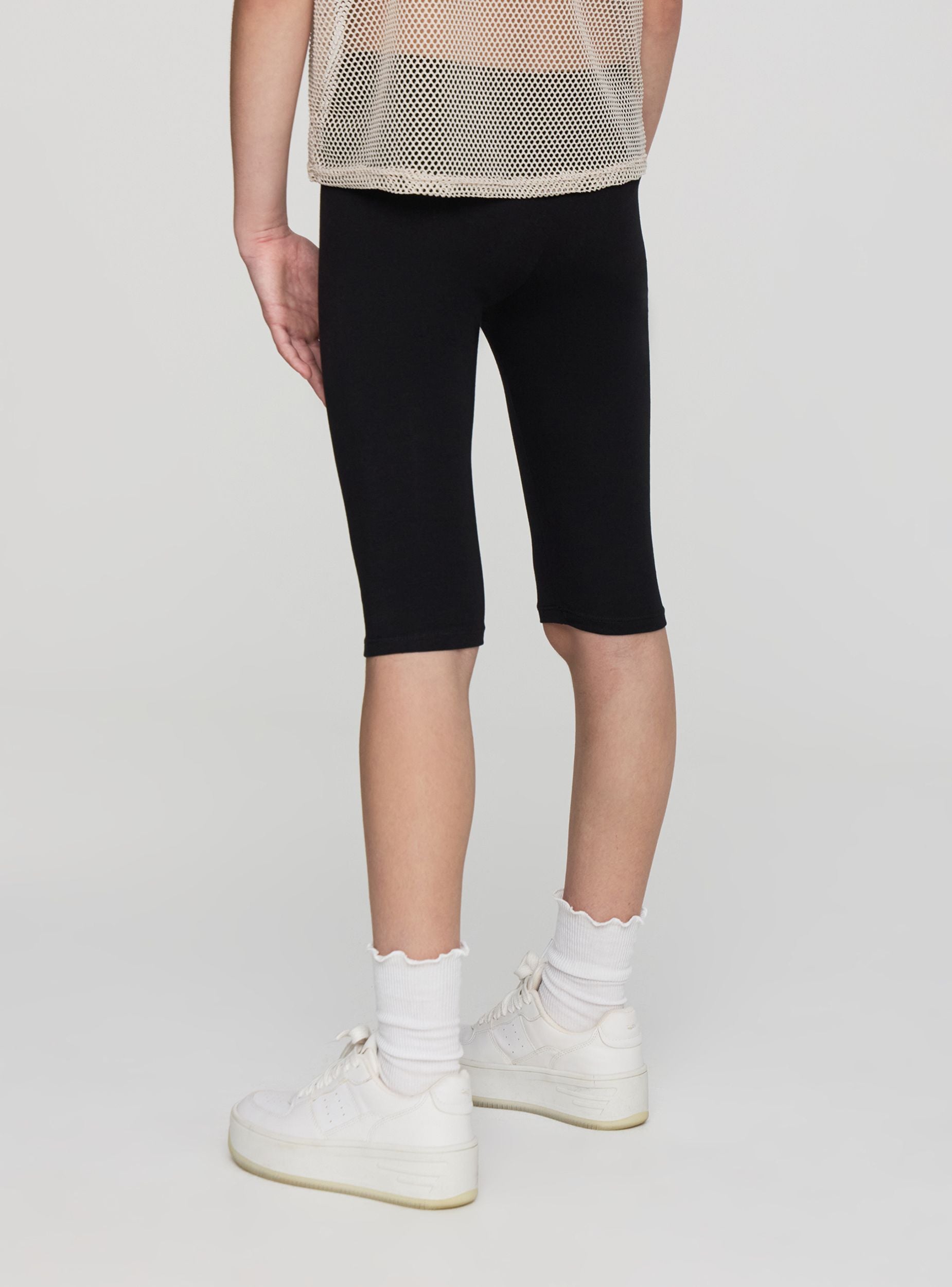 Легинси за момичета, идеални за летните дни или за спортни активности. Моделът с еластична материя предлага плътно и удобно прилягане, перфектно за свободно движение. Едноцветният дизайн ги прави универсални и лесни за комбиниране с тениски или топове, за да се създадат практични и модерни визии.