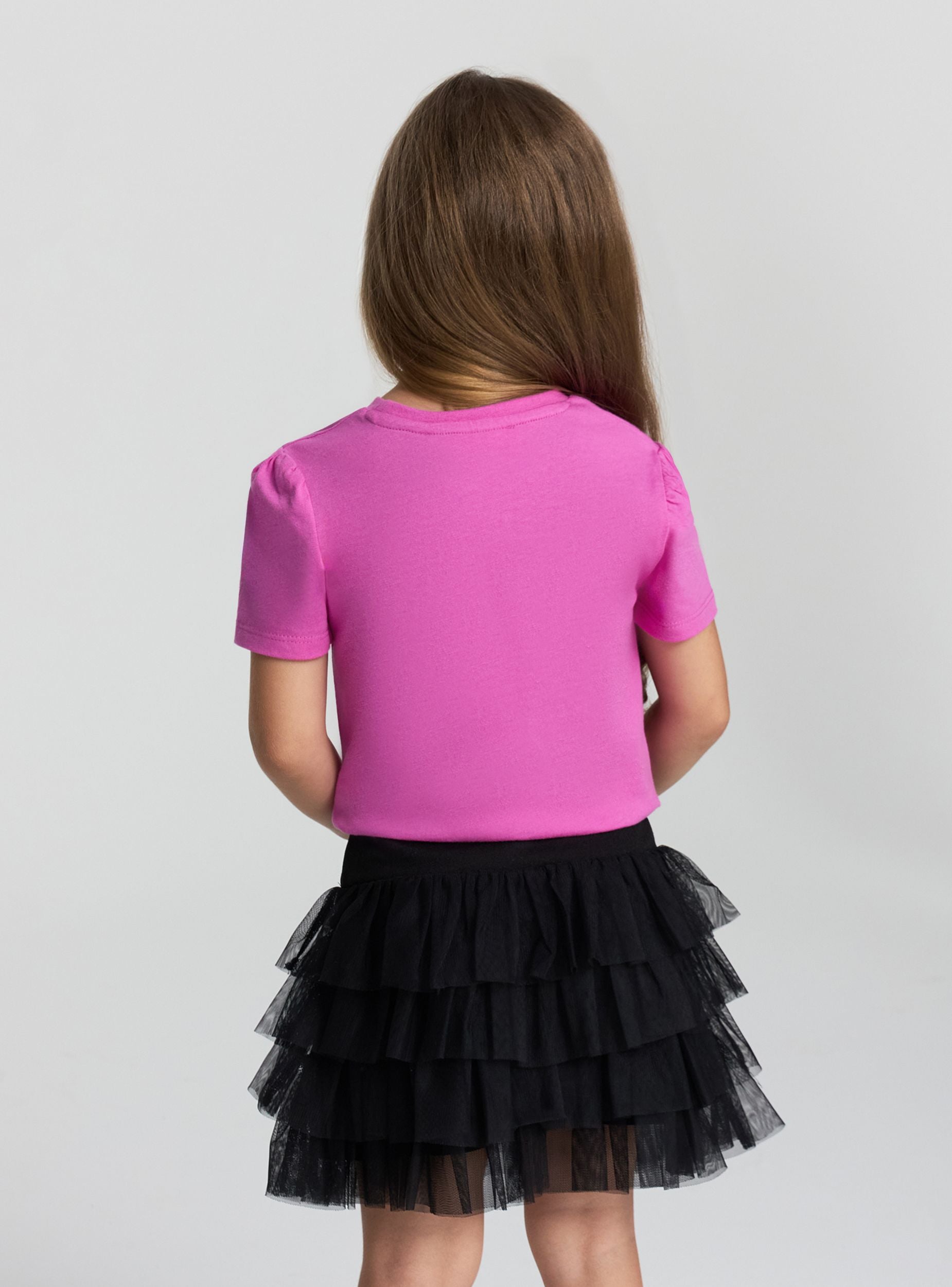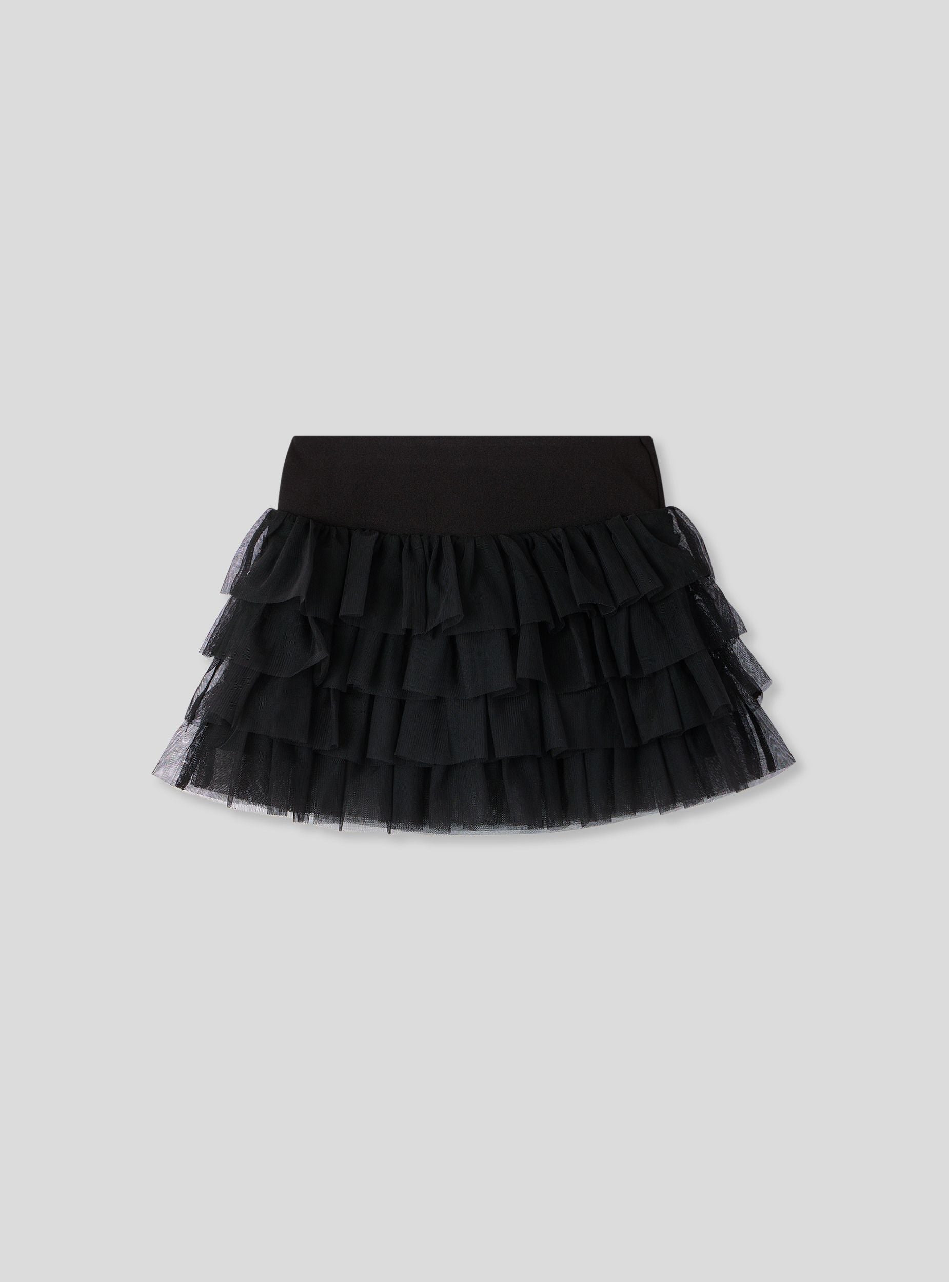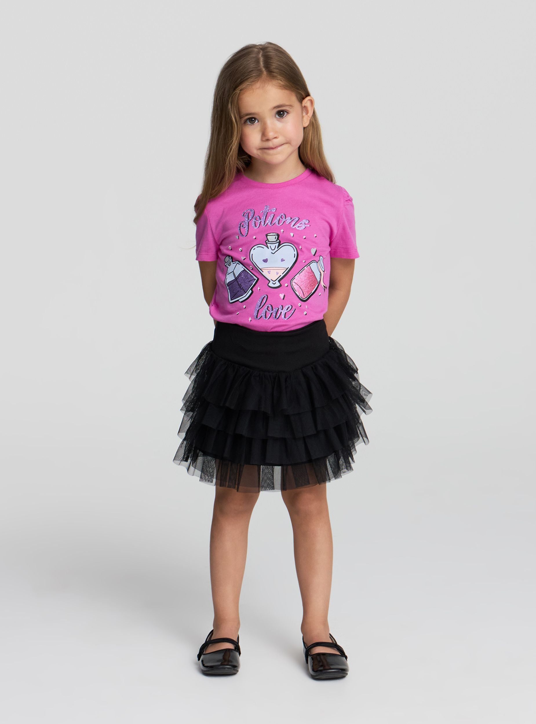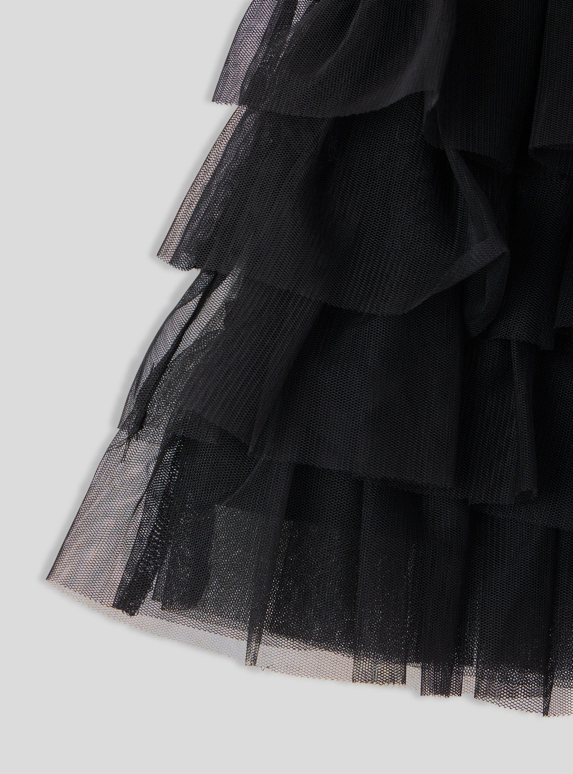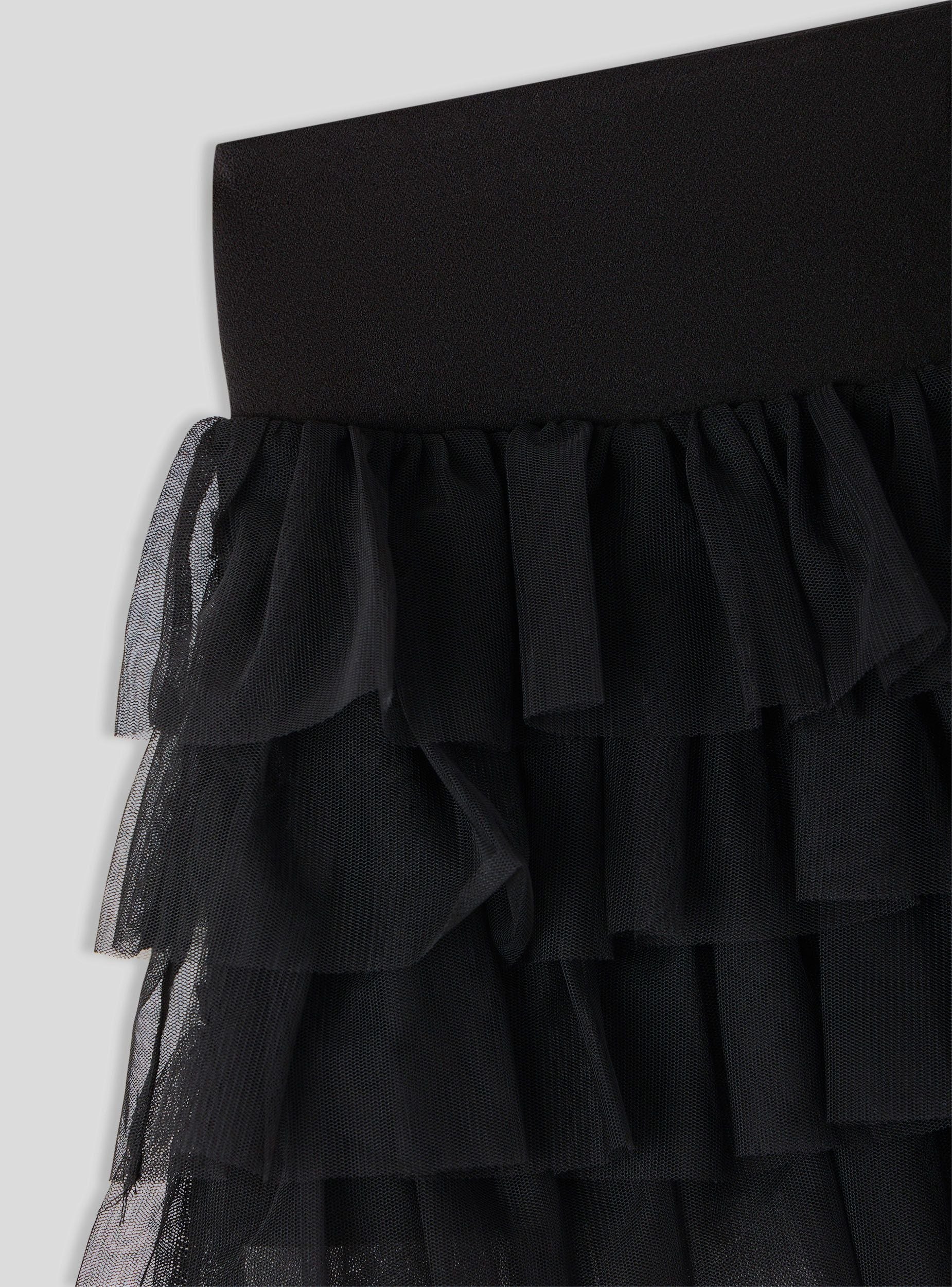 Детска пола с волани от тюл, идеална за специални поводи или елегантни събития. Дизайнът с волани придава нотка движение и оригиналност, перфектна за съчетаване с изискани топове или ежедневни тениски. Осигурява удобно прилягане. Универсален елемент, който се адаптира към различни случаи, от деня до вечерта.Детайли