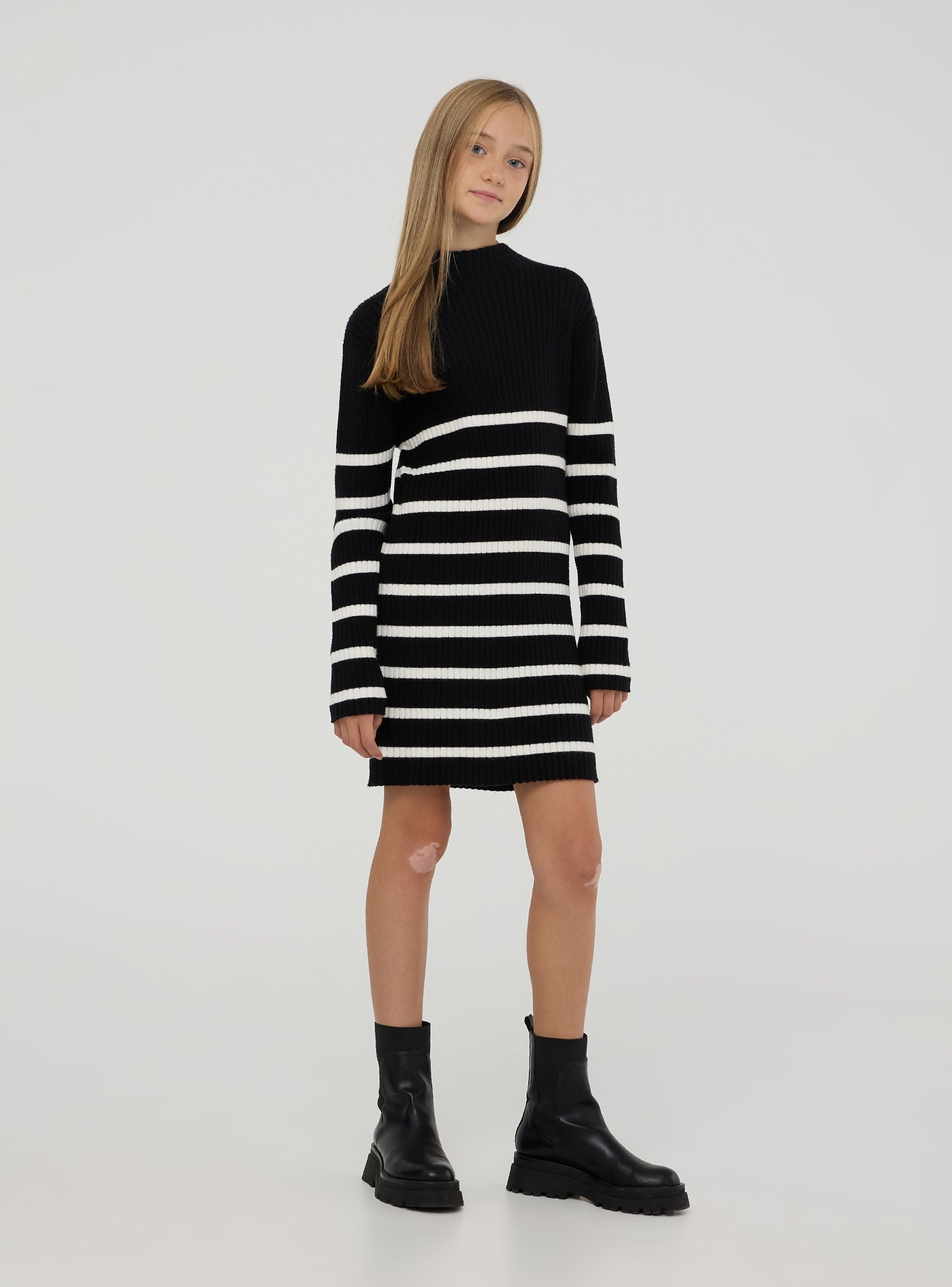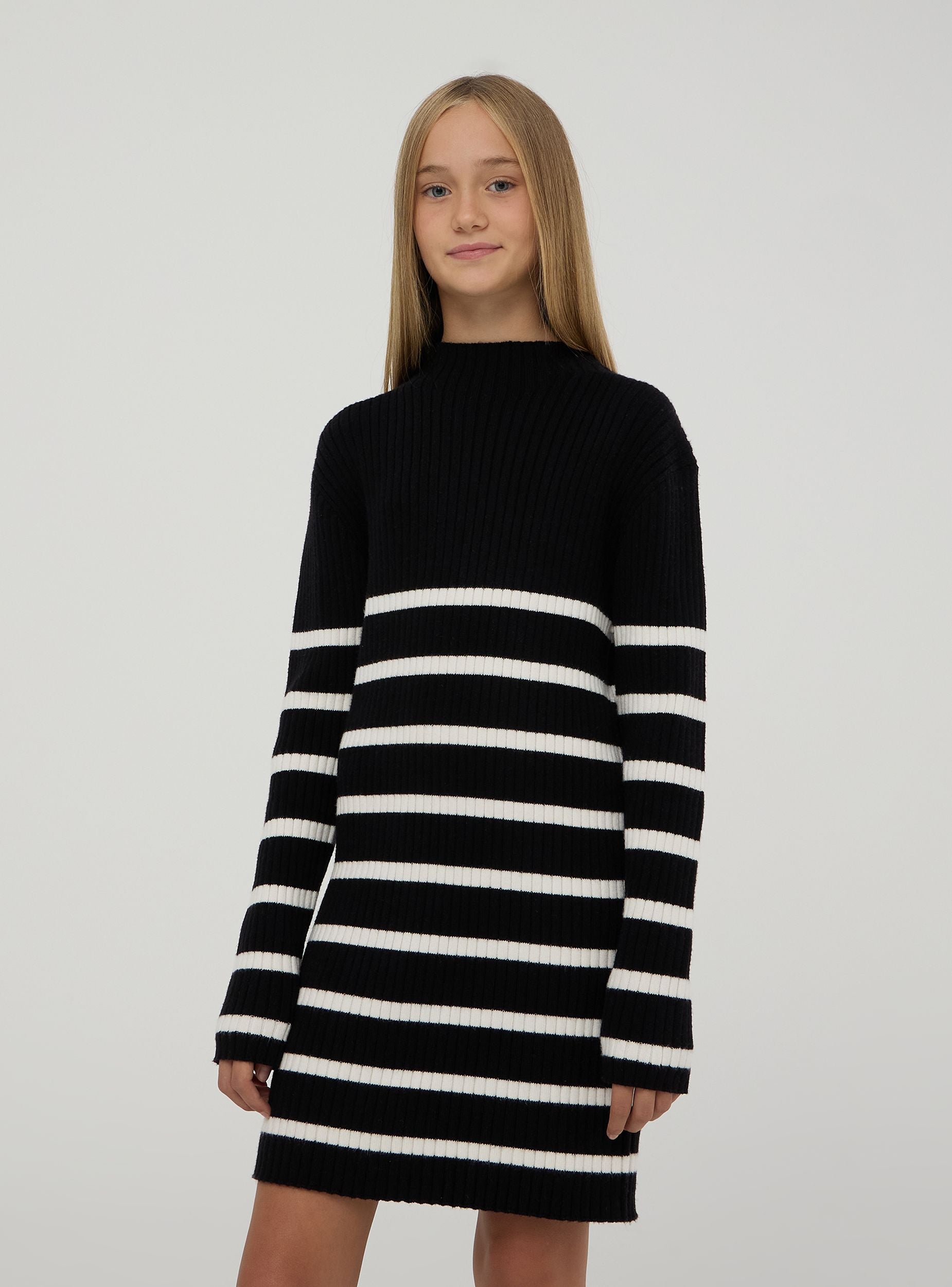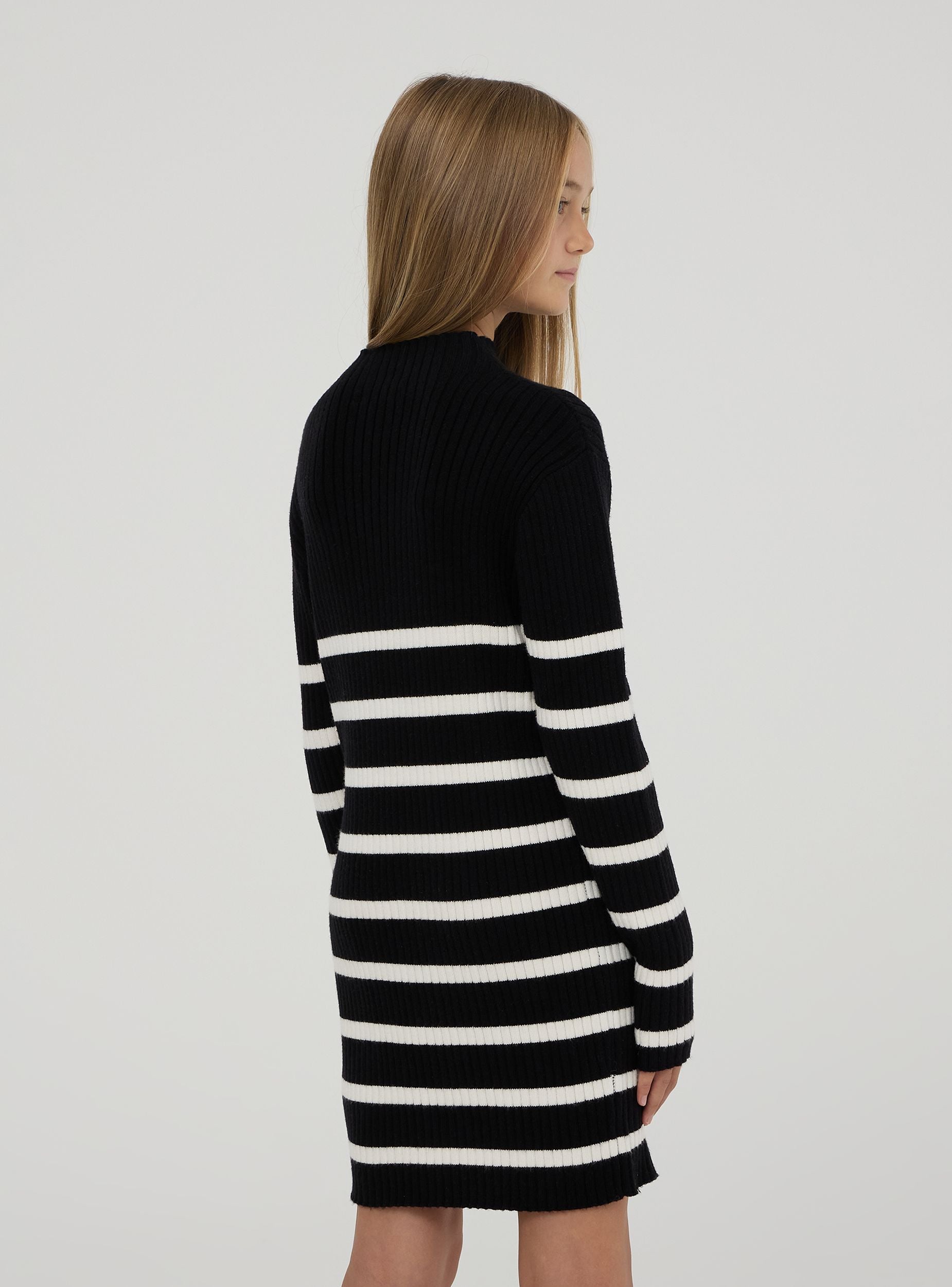 Детска плетена рокля с хоризонтални райета. Дизайнът с дълги ръкави предлага прилепнала кройка с дължина до средата на бедрото. Както предната, така и задната част са украсени със същия райета, създавайки модерен вид. Този артикул е идеален за небрежен и удобен вид.