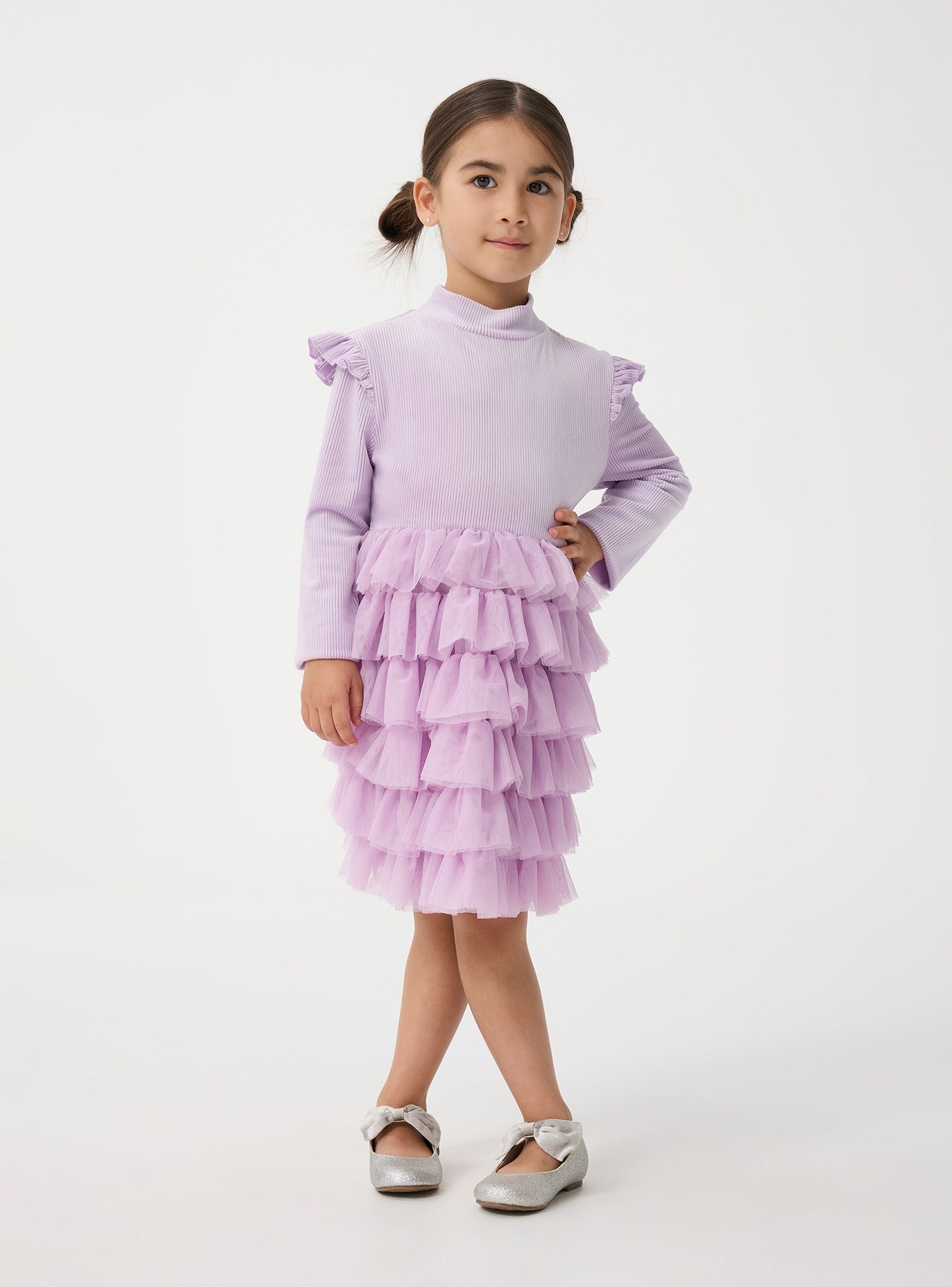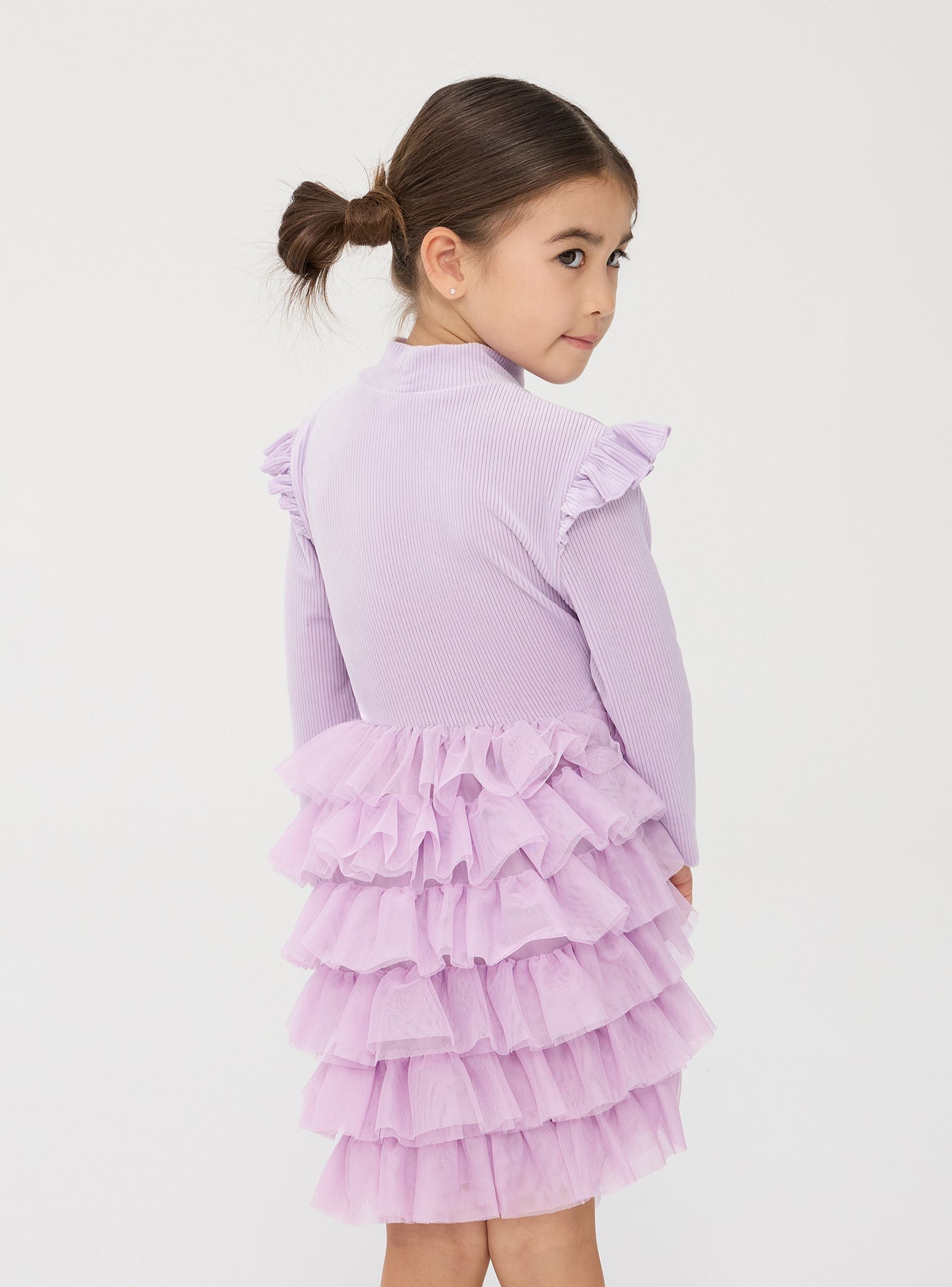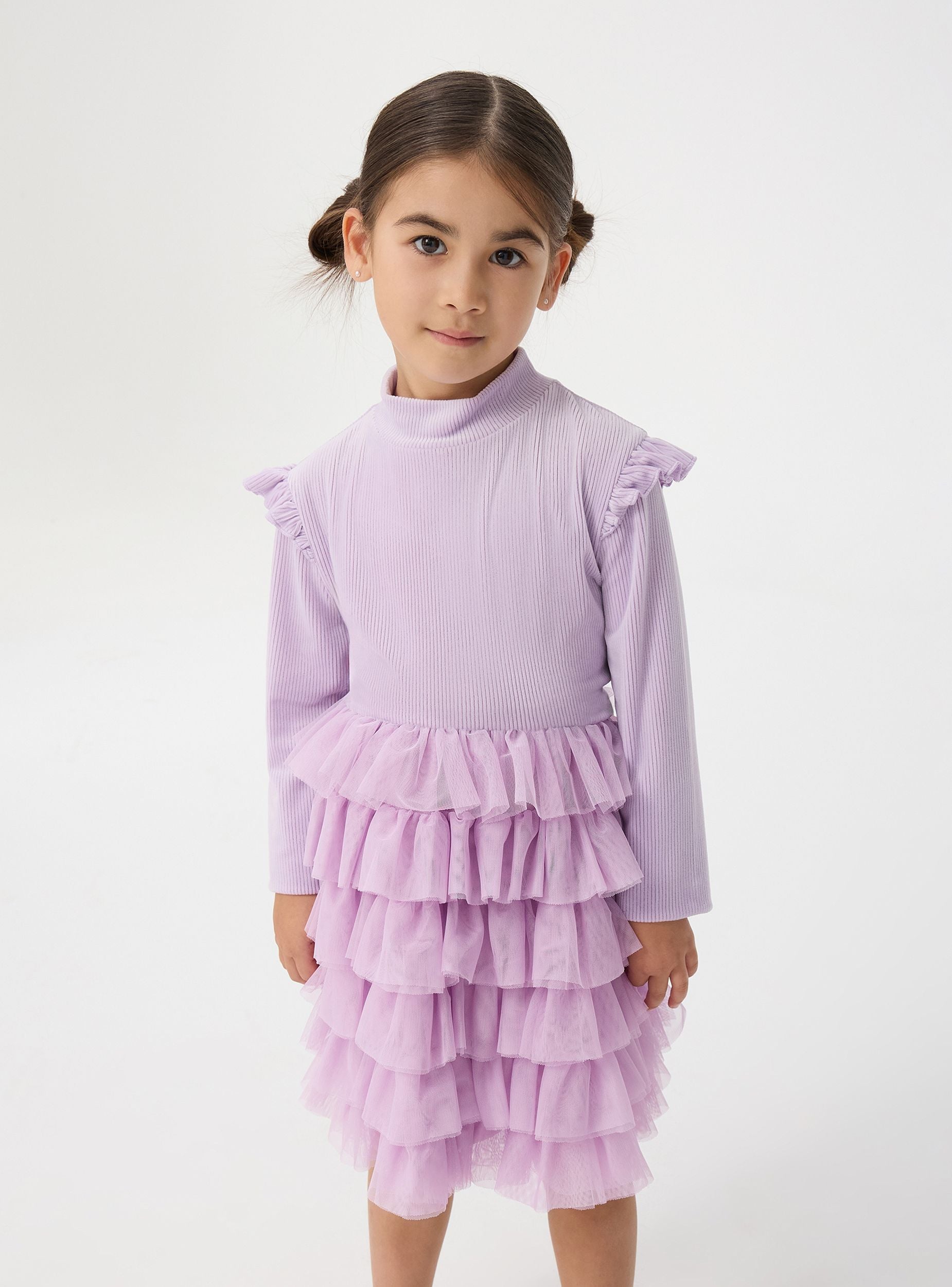 Вкусна рокля за момиче с райета в едноцветен цвят. Дългите ръкави и високият яка придават елегантност и топлина, идеална за по-хладните сезони. Детайлът с тюлените волани в долната част добавя игриво и женствено докосване. Удобна кройка, идеална за специални поводи или празници.Детайли
