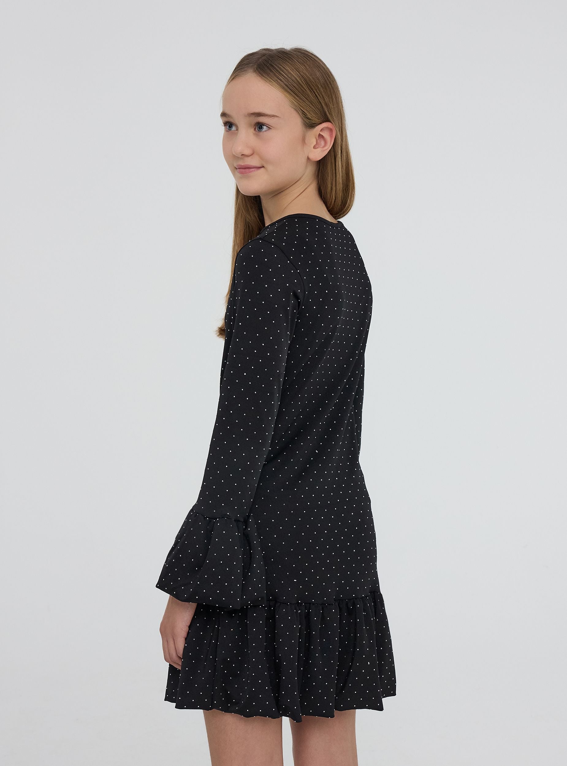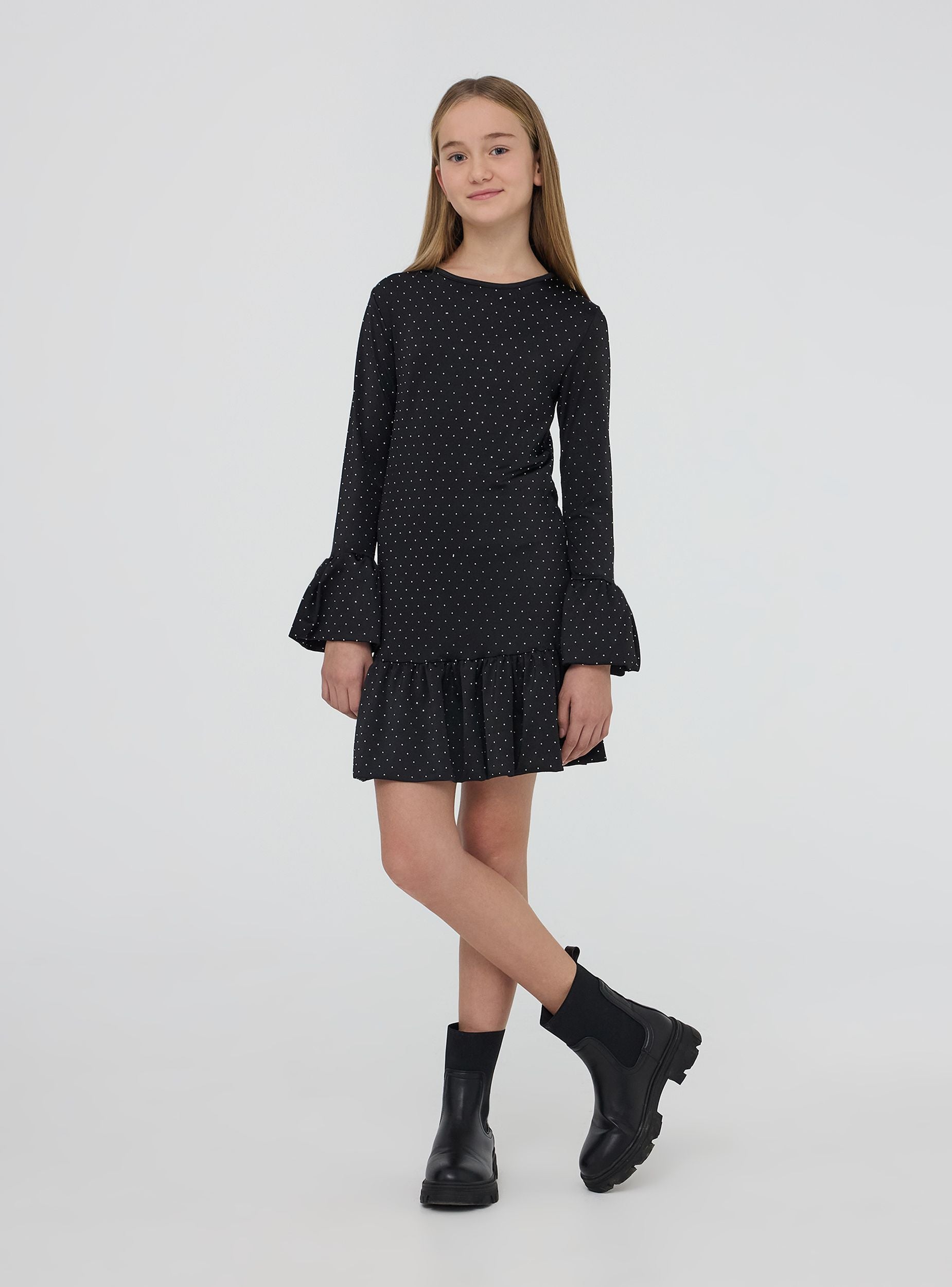 Детска рокля от едноцветен плат с капси. Модел с дълги ръкави с маншети и пола с волани. Идеални за шикозни зимни аутфити.Детайли